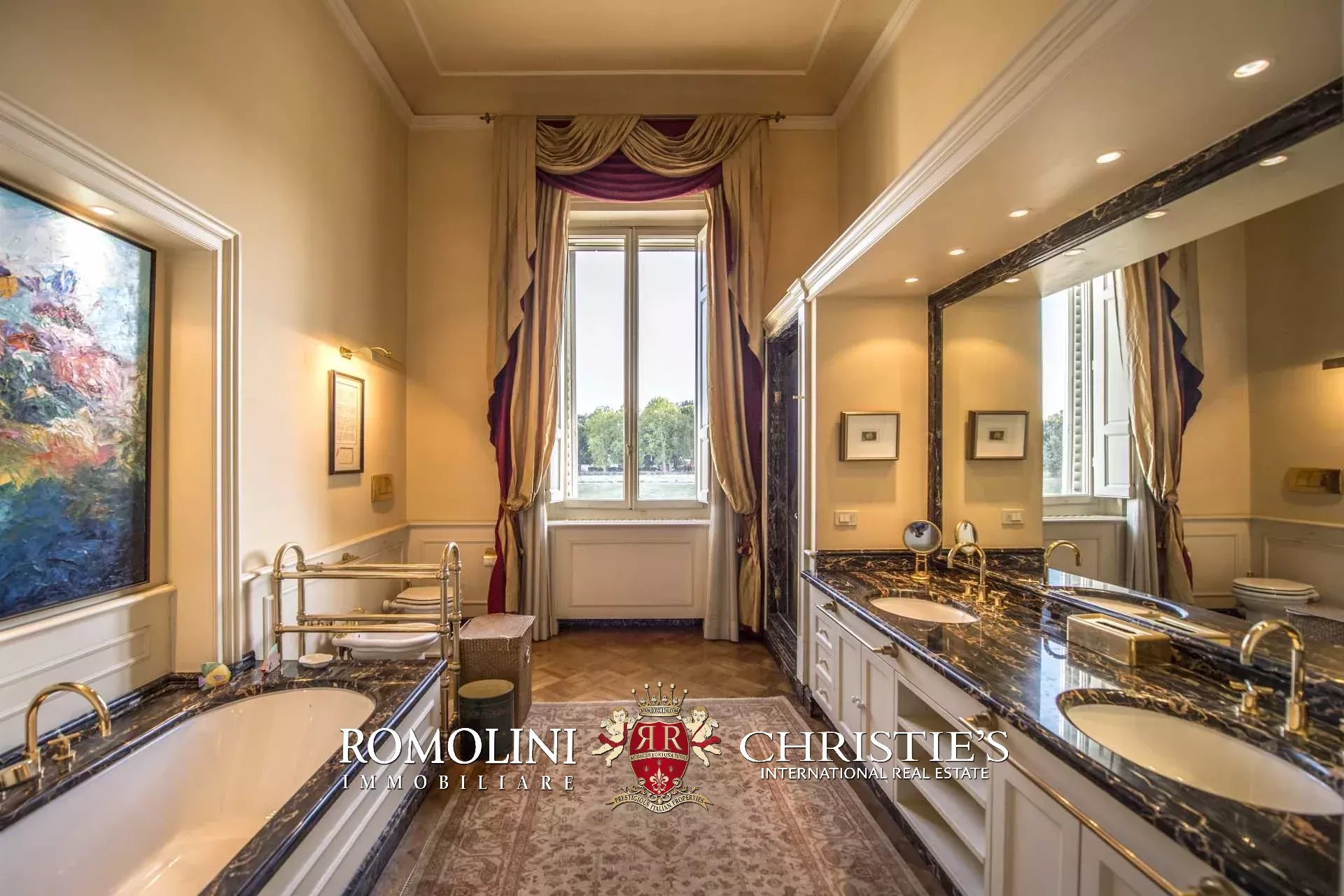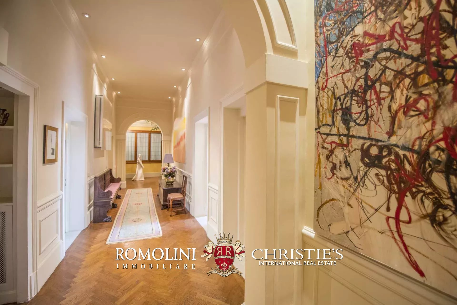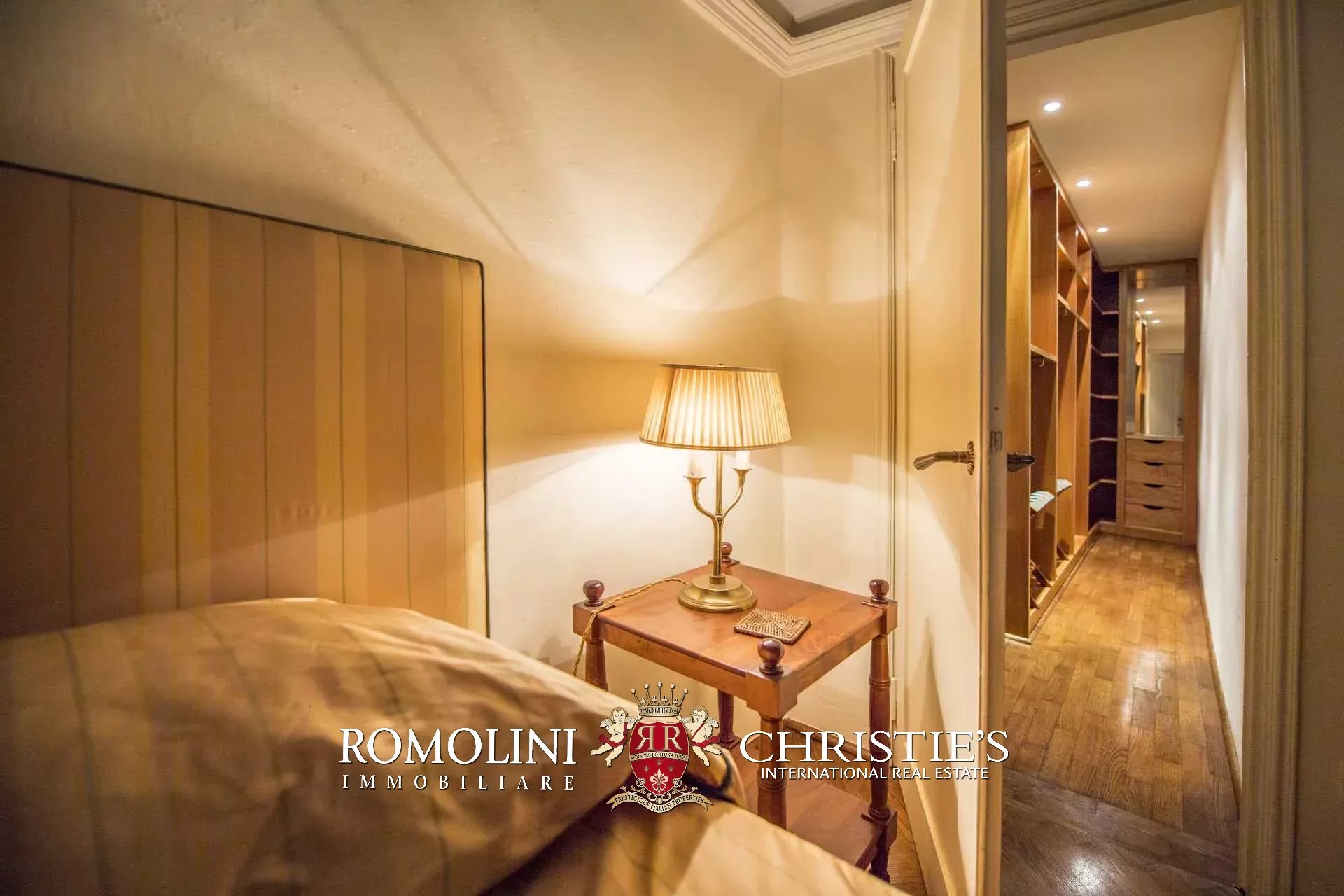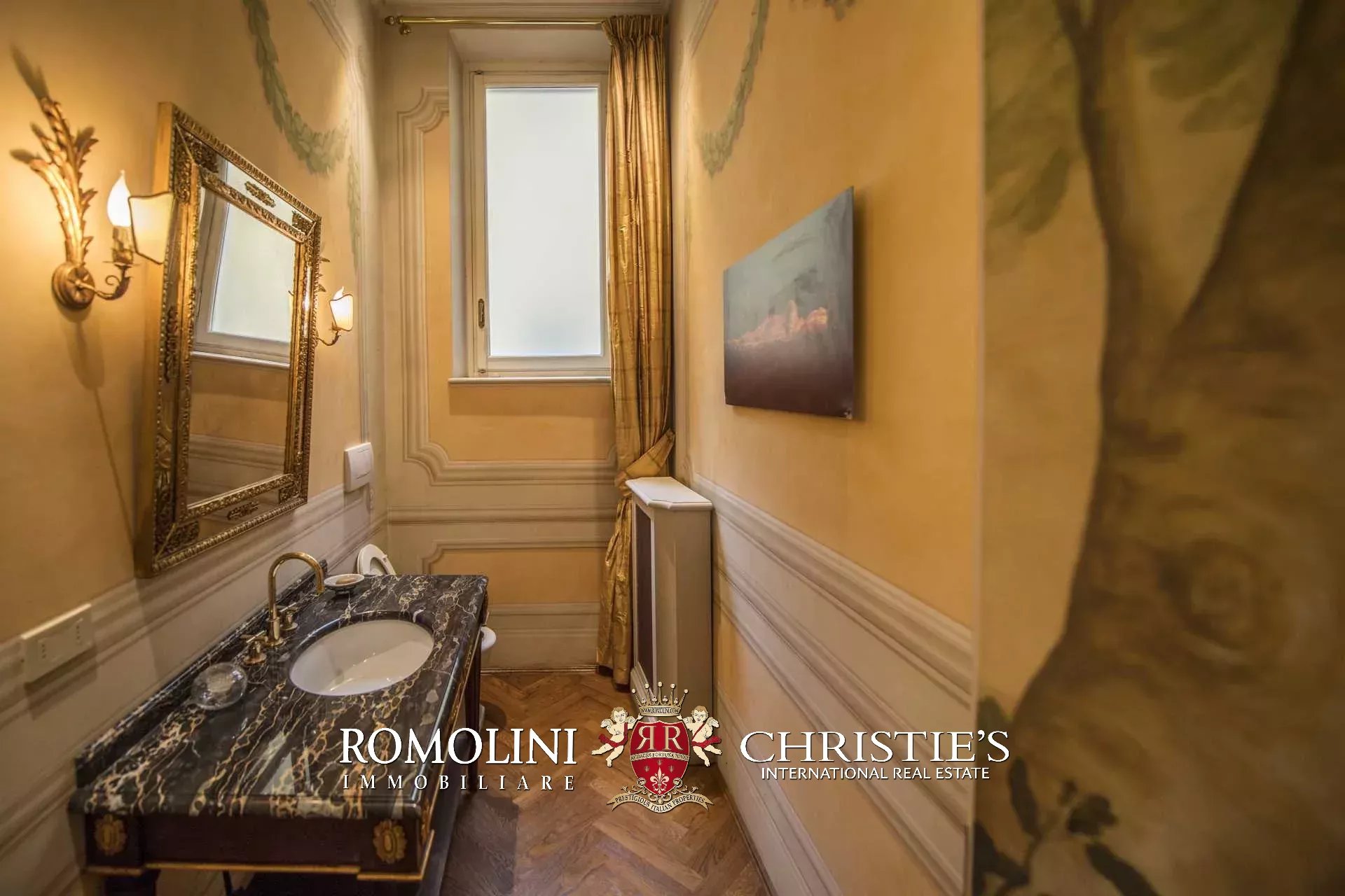 Auf der gegenüberliegenden Seite des Korridors befinden sich ein großes Esszimmer und ein zweiter Korridor, der zur Küche der Wohnung führt, wo sich auch eine zweite Zugangstür befindet. Am Ende des Hauptkorridors, der von einem Fenster beleuchtet wird, erreichen Sie einen Vorraum, dessen Fresken mit Trompe-l'œil-Motiven verziert sind. Von hier führen zwei Schiebentüren zu einem Badezimmer und einem dritten Korridor. Weiter in diesem Korridor finden Sie links ein Schlafzimmer (verbunden mit einem Badezimmer) und dann einen Raum, der derzeit als Sportraum mit einem Badezimmer im Zwischengeschoss genutzt wird (der jedoch in ein weiteres Schlafzimmer umgewandelt werden kann). Wenn Sie die Treppe hinaufsteigen, gelangen Sie zum letzten Schlafzimmer mit Bad und einem prächtigen begehbaren Kleiderschrank, der dem Verlauf des darunter liegenden dritten Korridors folgt.