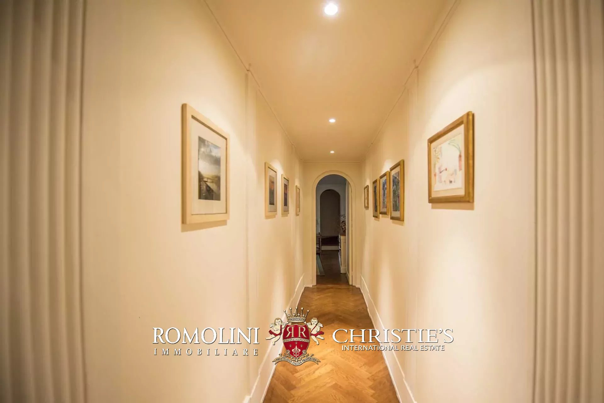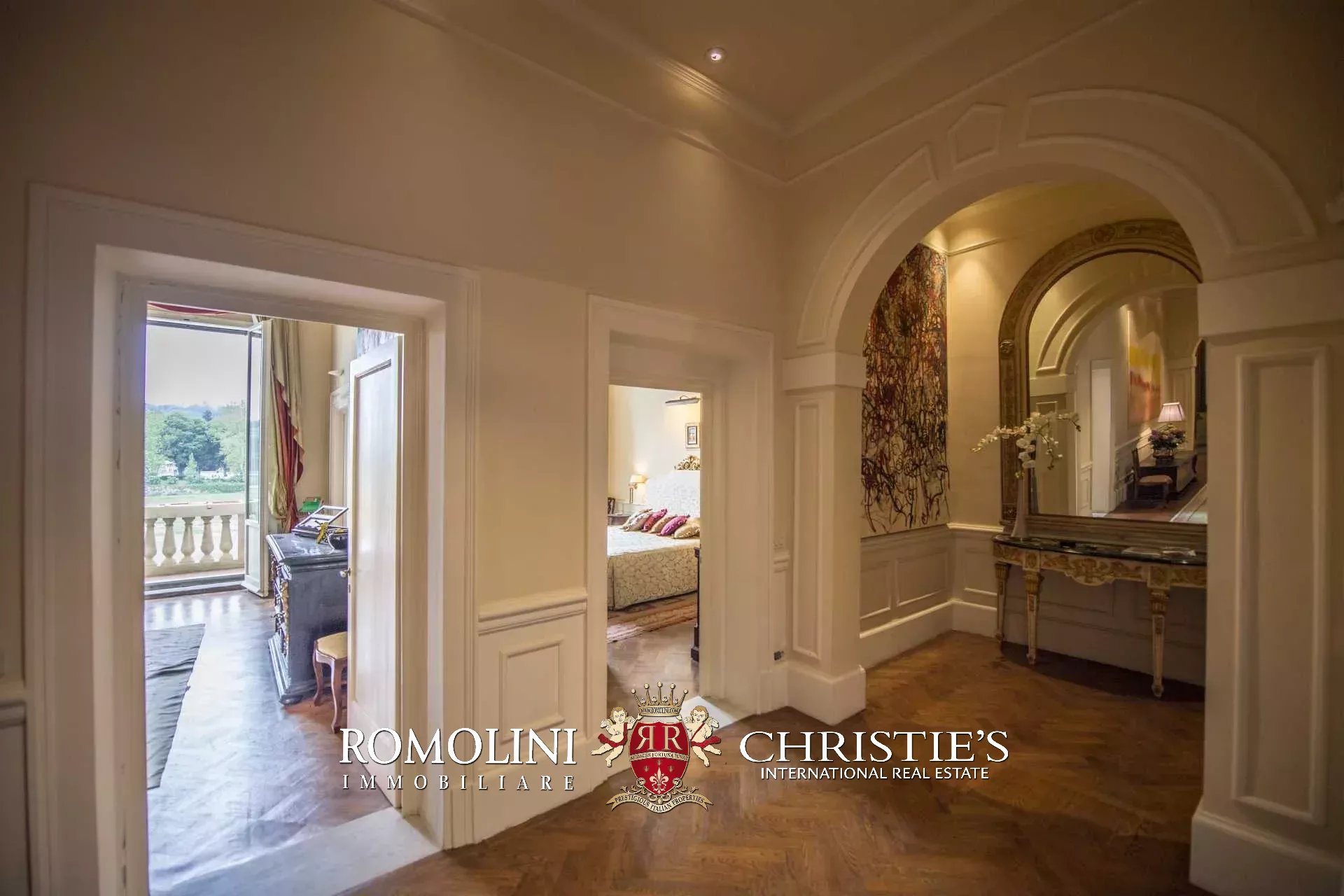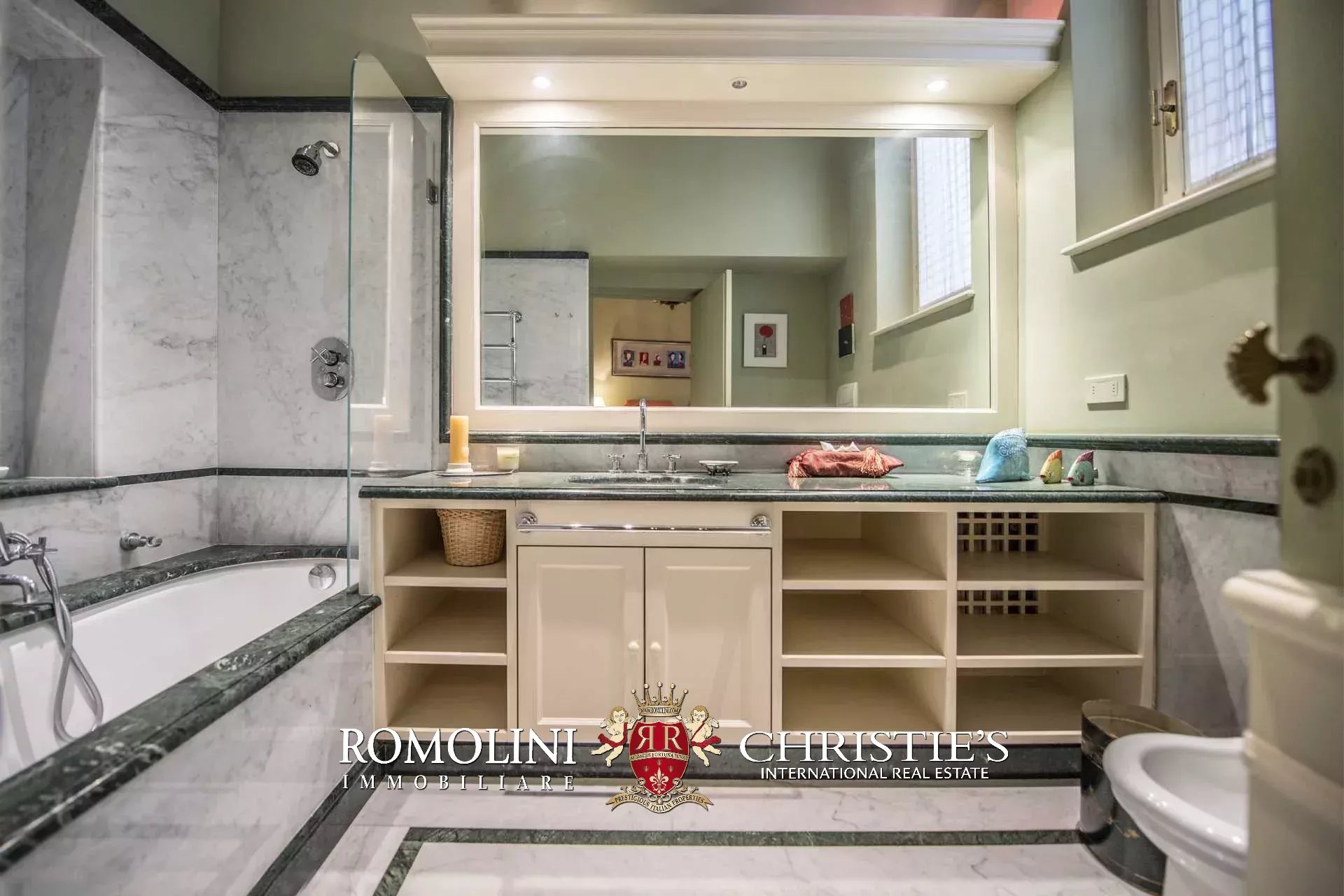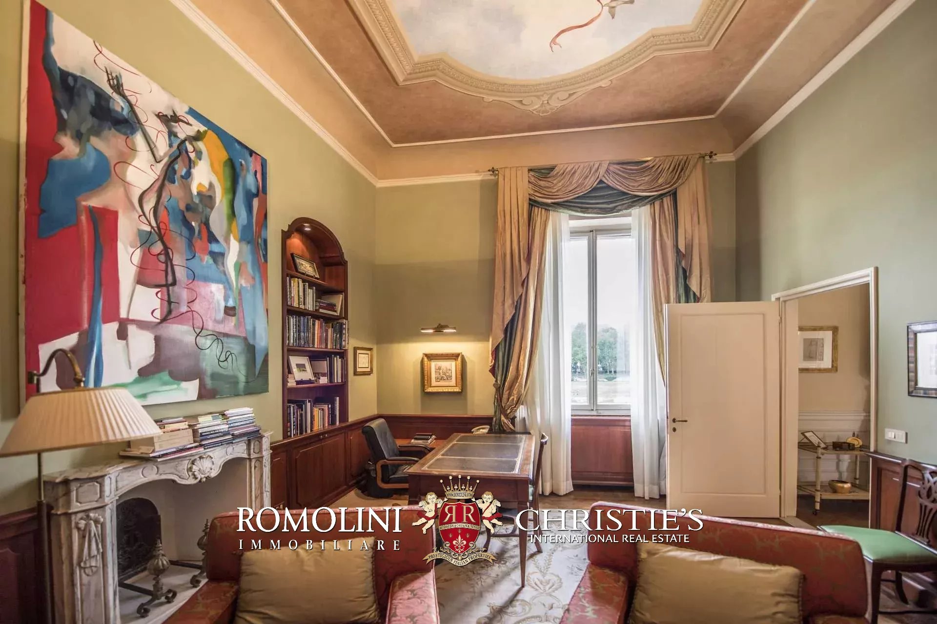 Auf der gegenüberliegenden Seite des Korridors befinden sich ein großes Esszimmer und ein zweiter Korridor, der zur Küche der Wohnung führt, wo sich auch eine zweite Zugangstür befindet. Am Ende des Hauptkorridors, der von einem Fenster beleuchtet wird, erreichen Sie einen Vorraum, dessen Fresken mit Trompe-l'œil-Motiven verziert sind. Von hier führen zwei Schiebentüren zu einem Badezimmer und einem dritten Korridor. Weiter in diesem Korridor finden Sie links ein Schlafzimmer (verbunden mit einem Badezimmer) und dann einen Raum, der derzeit als Sportraum mit einem Badezimmer im Zwischengeschoss genutzt wird (der jedoch in ein weiteres Schlafzimmer umgewandelt werden kann). Wenn Sie die Treppe hinaufsteigen, gelangen Sie zum letzten Schlafzimmer mit Bad und einem prächtigen begehbaren Kleiderschrank, der dem Verlauf des darunter liegenden dritten Korridors folgt.