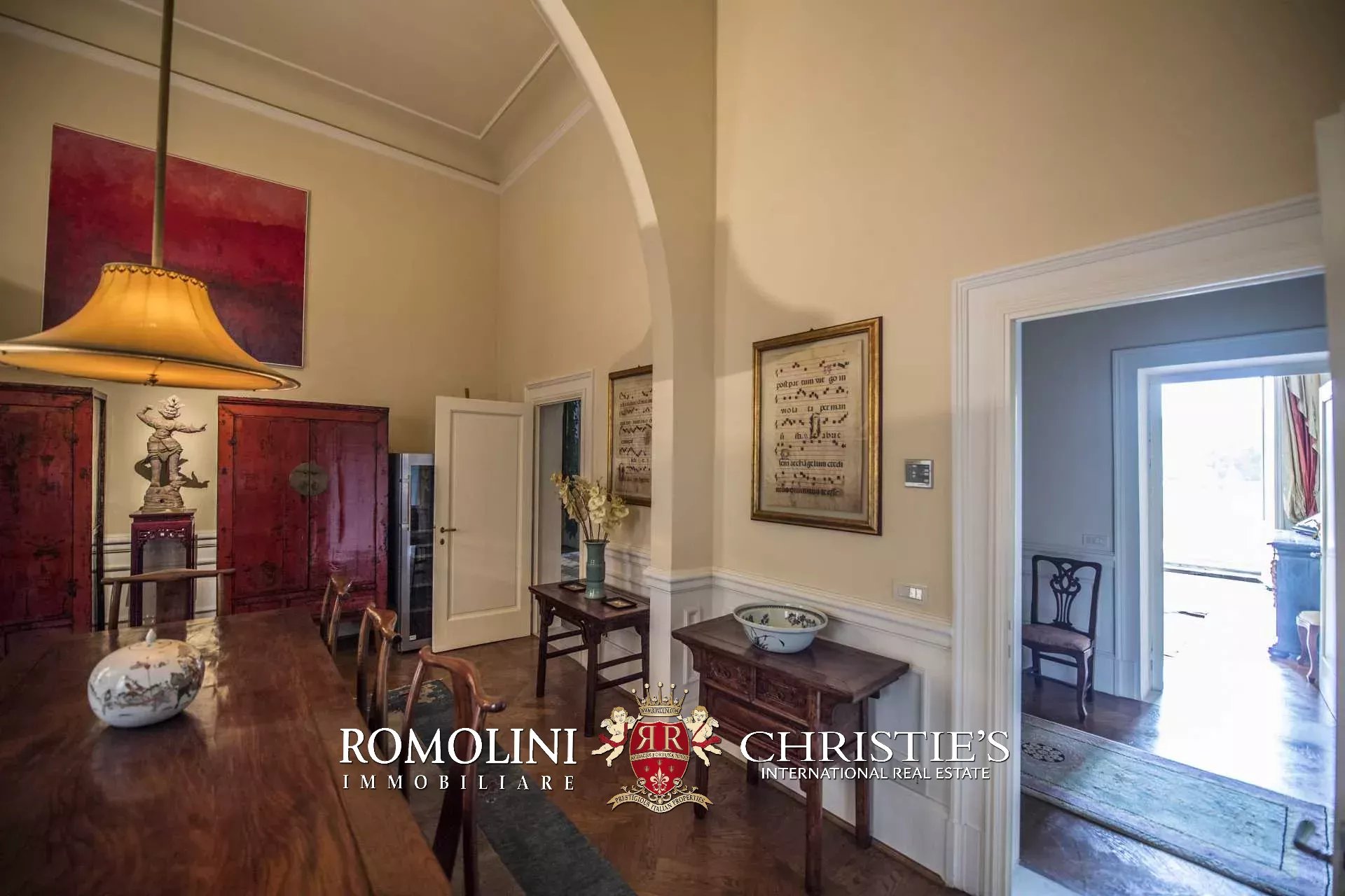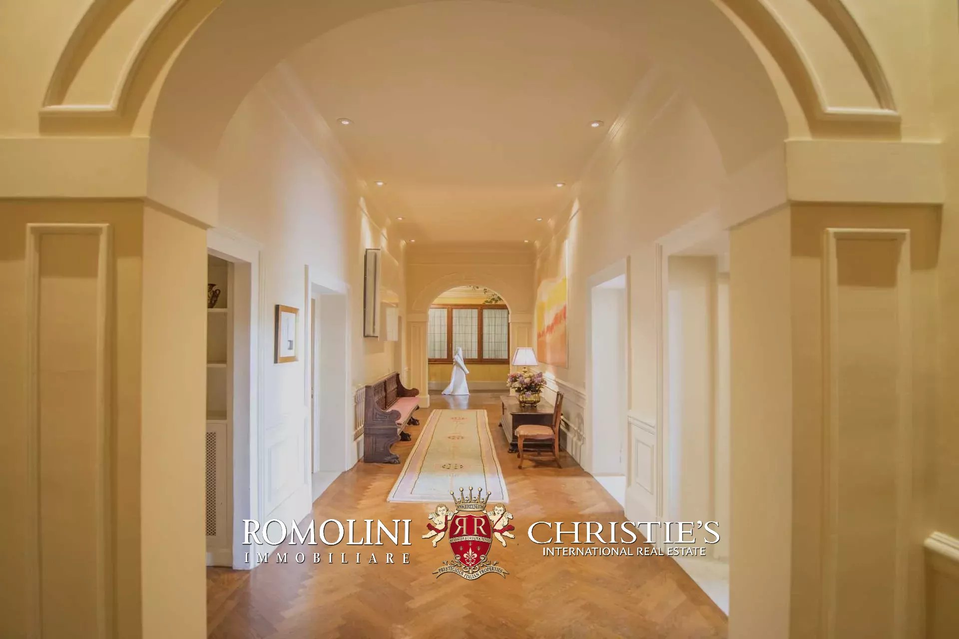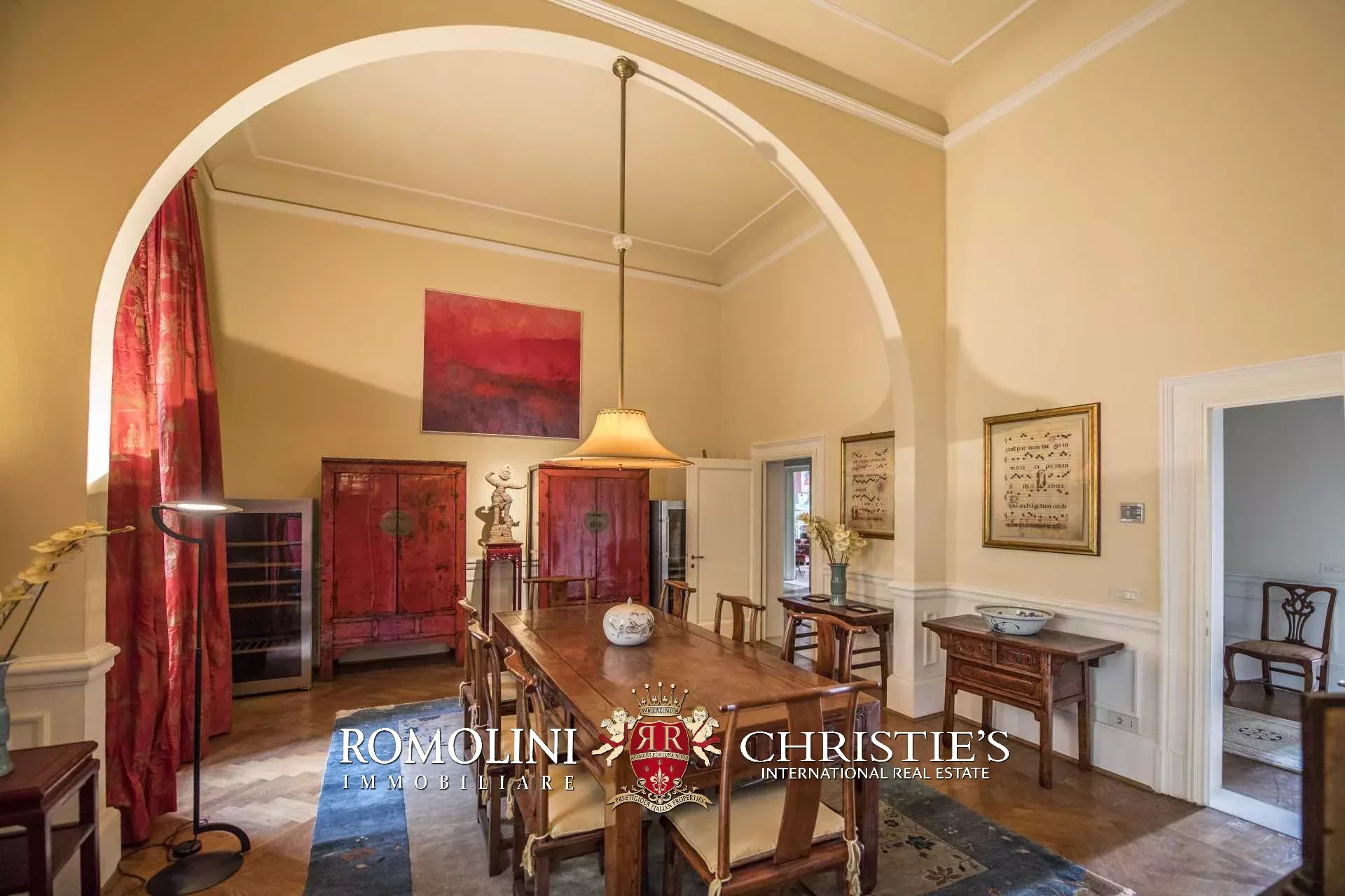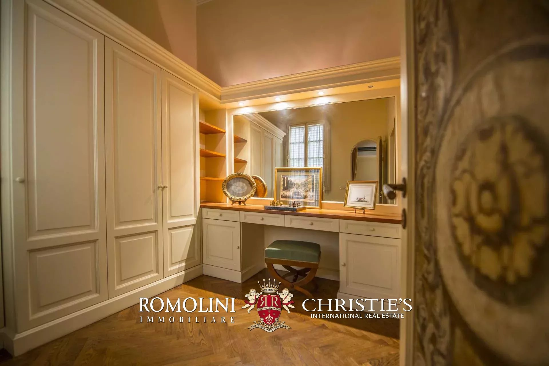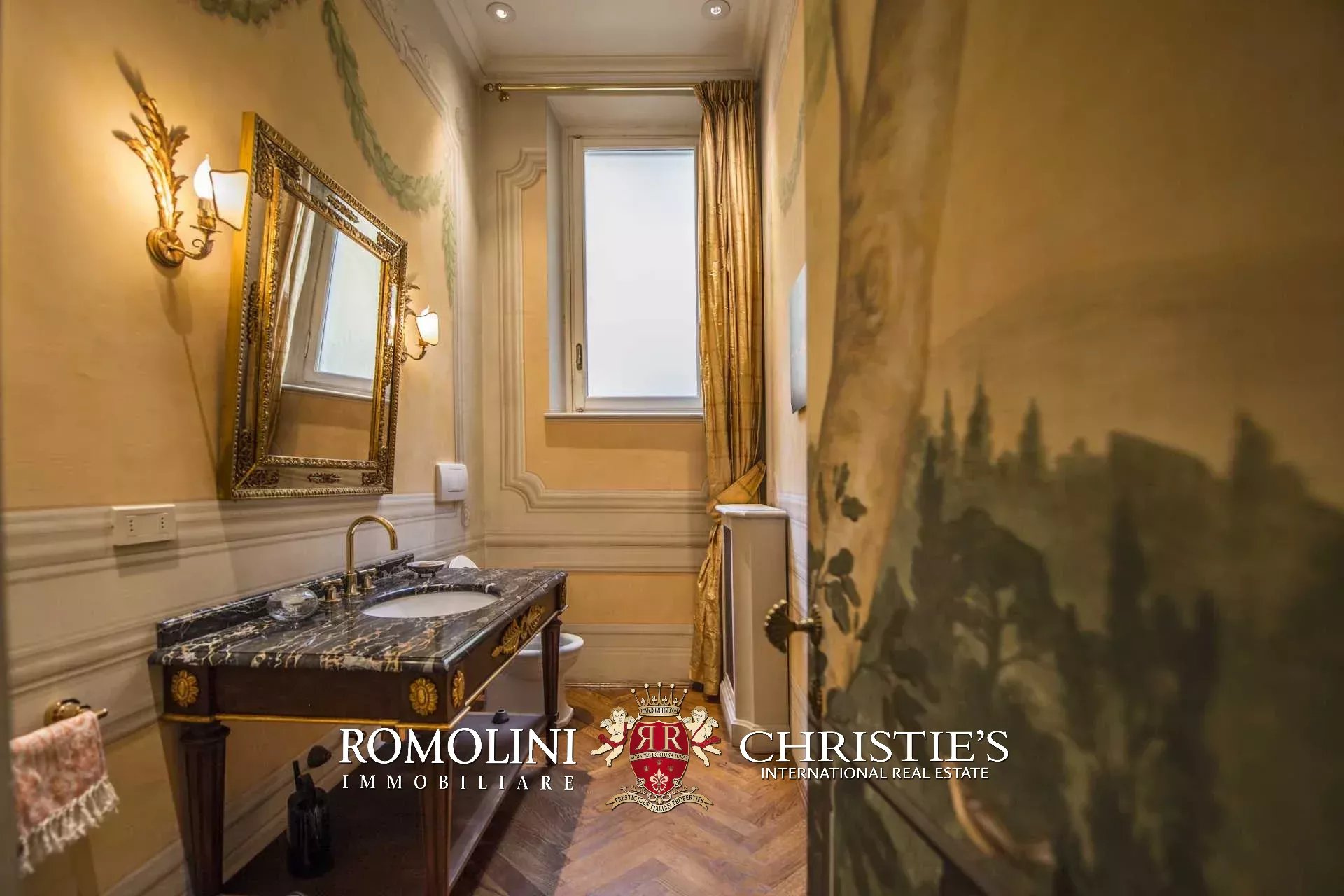 Auf der gegenüberliegenden Seite des Korridors befinden sich ein großes Esszimmer und ein zweiter Korridor, der zur Küche der Wohnung führt, wo sich auch eine zweite Zugangstür befindet. Am Ende des Hauptkorridors, der von einem Fenster beleuchtet wird, erreichen Sie einen Vorraum, dessen Fresken mit Trompe-l'œil-Motiven verziert sind. Von hier führen zwei Schiebentüren zu einem Badezimmer und einem dritten Korridor. Weiter in diesem Korridor finden Sie links ein Schlafzimmer (verbunden mit einem Badezimmer) und dann einen Raum, der derzeit als Sportraum mit einem Badezimmer im Zwischengeschoss genutzt wird (der jedoch in ein weiteres Schlafzimmer umgewandelt werden kann). Wenn Sie die Treppe hinaufsteigen, gelangen Sie zum letzten Schlafzimmer mit Bad und einem prächtigen begehbaren Kleiderschrank, der dem Verlauf des darunter liegenden dritten Korridors folgt.