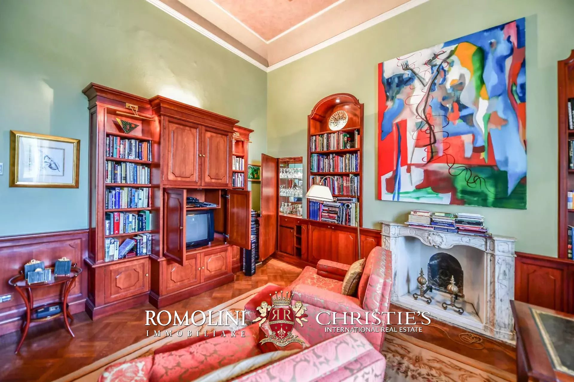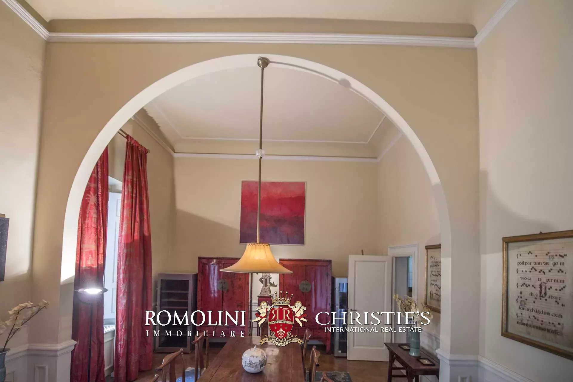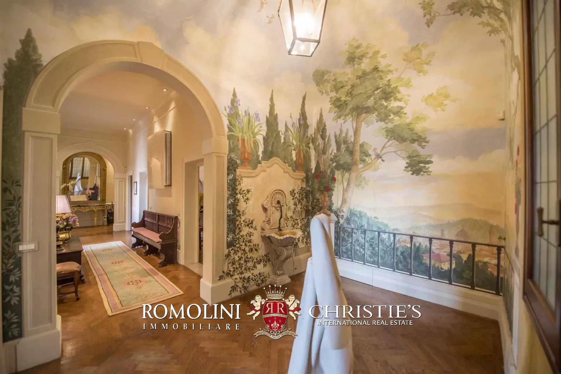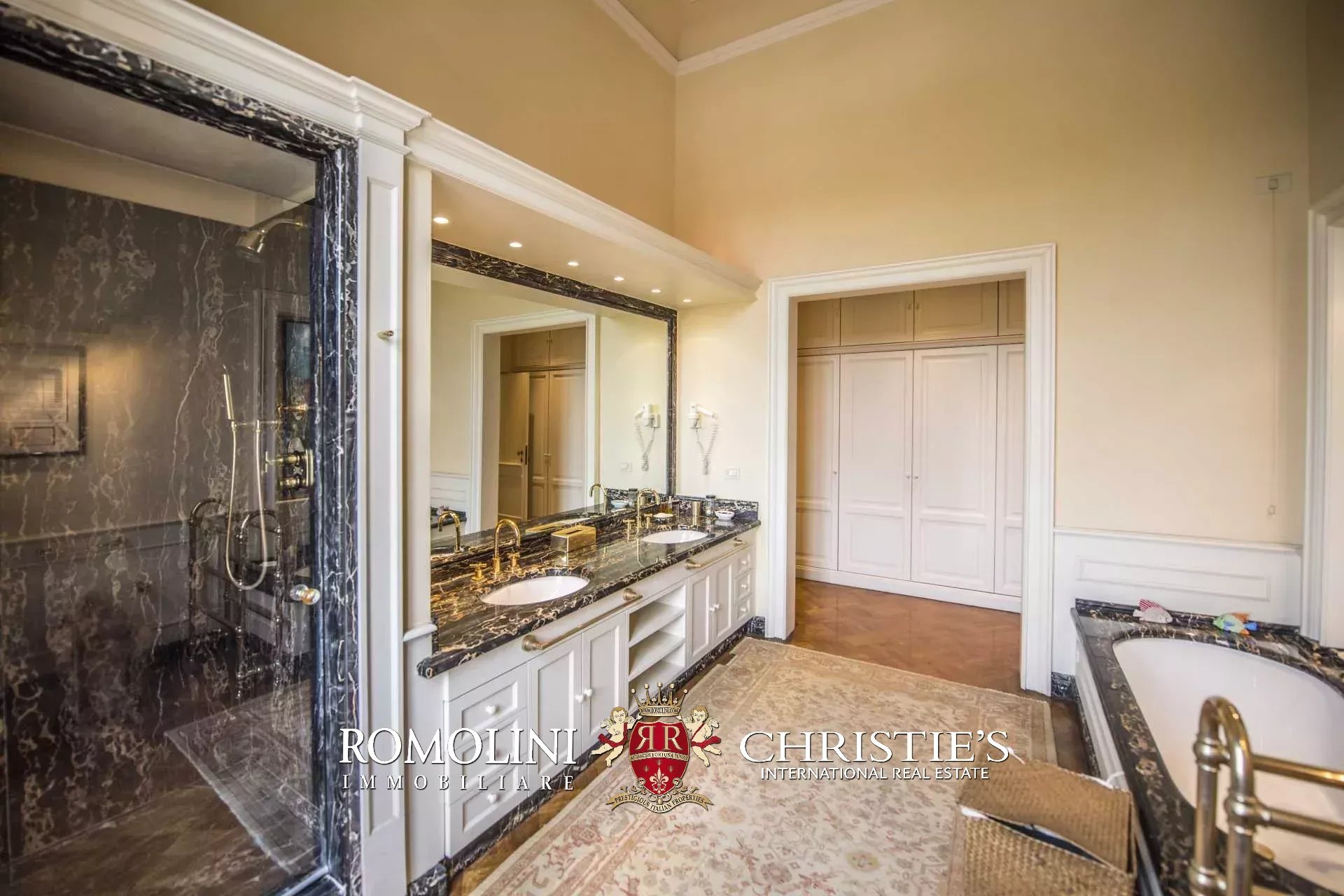 Auf der gegenüberliegenden Seite des Korridors befinden sich ein großes Esszimmer und ein zweiter Korridor, der zur Küche der Wohnung führt, wo sich auch eine zweite Zugangstür befindet. Am Ende des Hauptkorridors, der von einem Fenster beleuchtet wird, erreichen Sie einen Vorraum, dessen Fresken mit Trompe-l'œil-Motiven verziert sind. Von hier führen zwei Schiebentüren zu einem Badezimmer und einem dritten Korridor. Weiter in diesem Korridor finden Sie links ein Schlafzimmer (verbunden mit einem Badezimmer) und dann einen Raum, der derzeit als Sportraum mit einem Badezimmer im Zwischengeschoss genutzt wird (der jedoch in ein weiteres Schlafzimmer umgewandelt werden kann). Wenn Sie die Treppe hinaufsteigen, gelangen Sie zum letzten Schlafzimmer mit Bad und einem prächtigen begehbaren Kleiderschrank, der dem Verlauf des darunter liegenden dritten Korridors folgt.