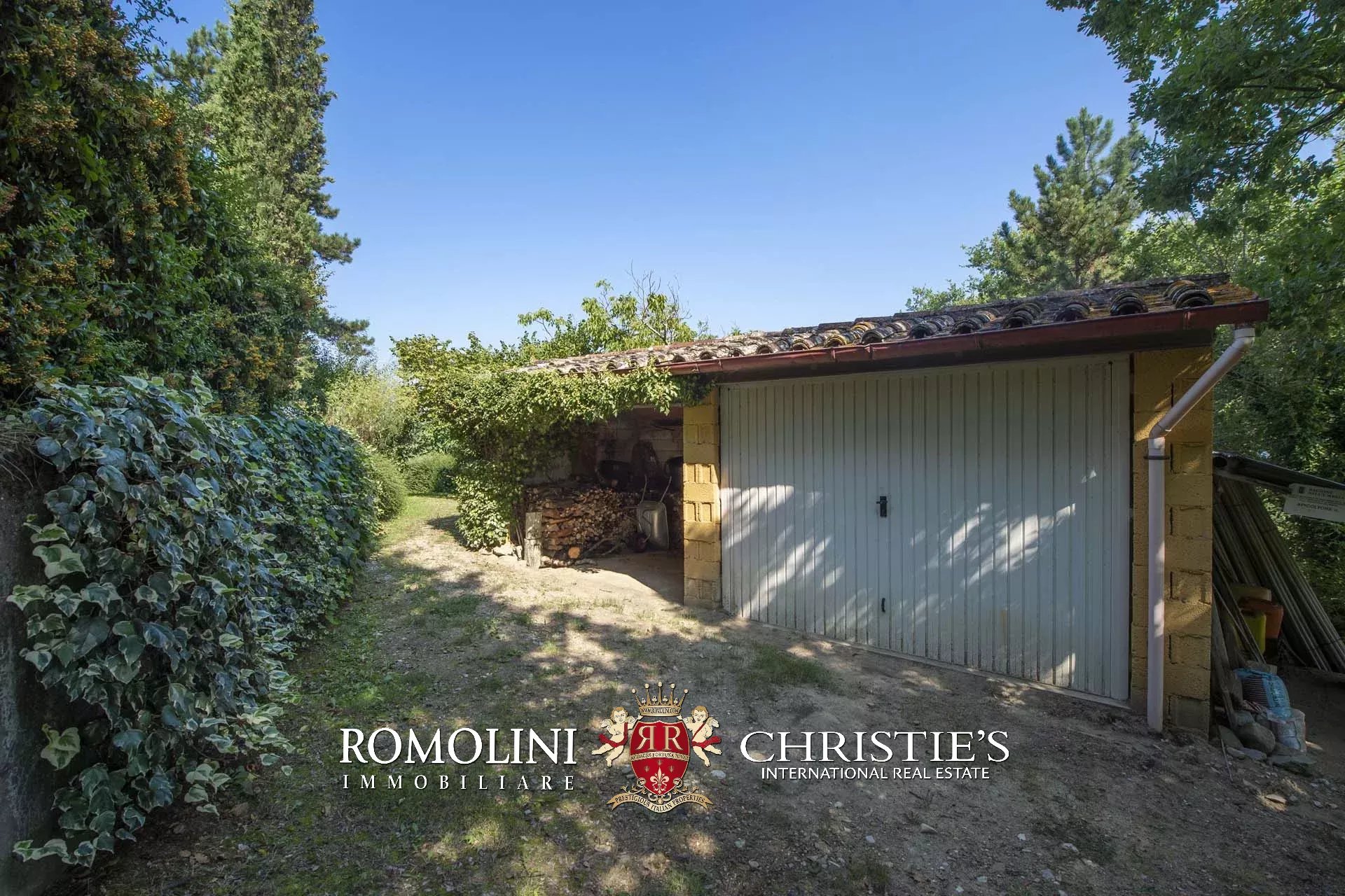 Zum Anwesen gehören ein Lager (30 m²) mit Holzschuppen, Garage und zwei Lagerräumen.