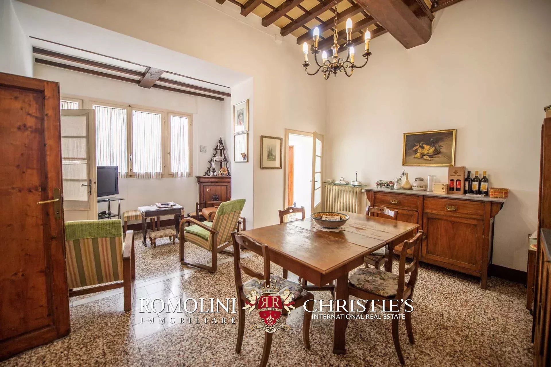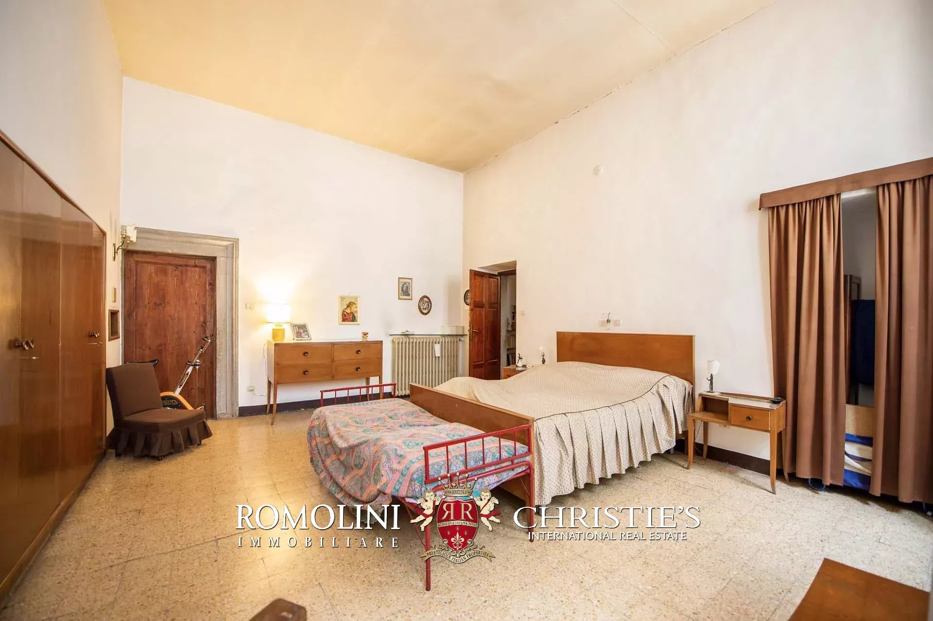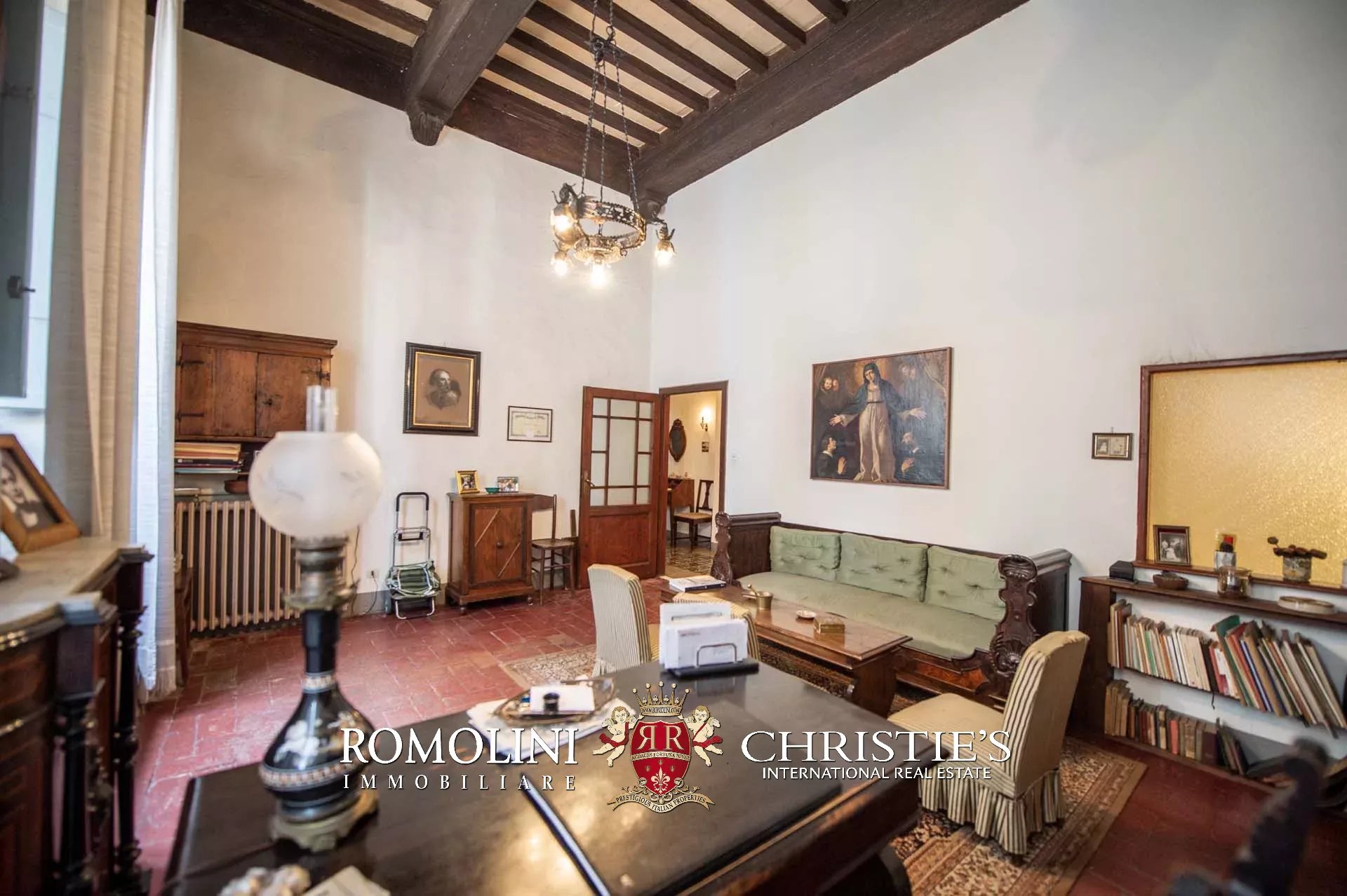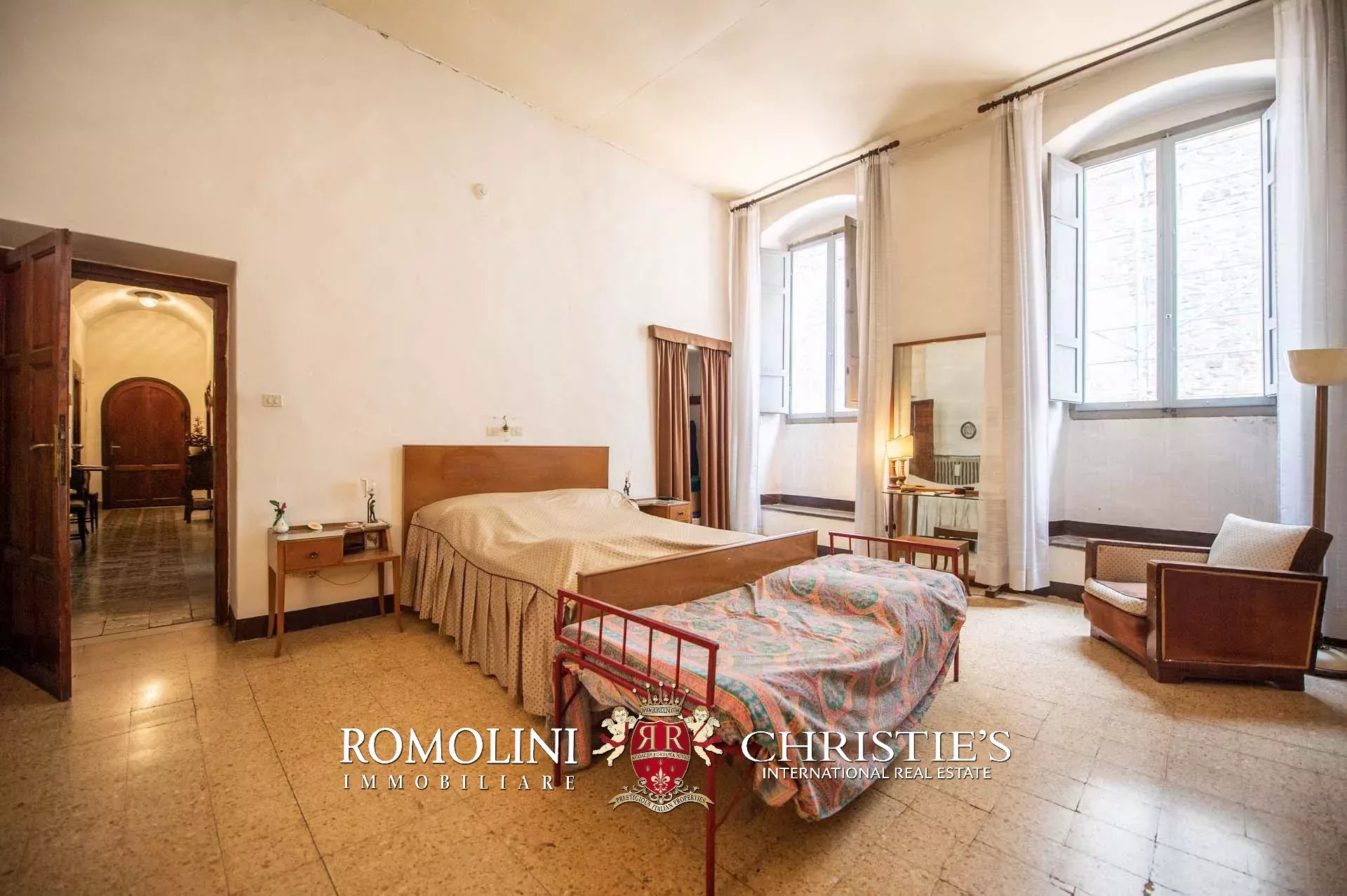 The historic building underwent conservation in 2018 and the roof has been fully remade to make it totally waterproof. Inside, the house is in excellent condition and boasts the typical features of the historic palazzi in Sansepolcro, with high ceilings, ample windows, terracotta and graniglia floors and wooden beams. Particularly interesting is the red-and-white checkered pattern in the original tiles of the bedrooms. The lofts, with their very high ceilings, are currently in builder’s finish but could easily be completed and used to expand livable surface of the apartment.