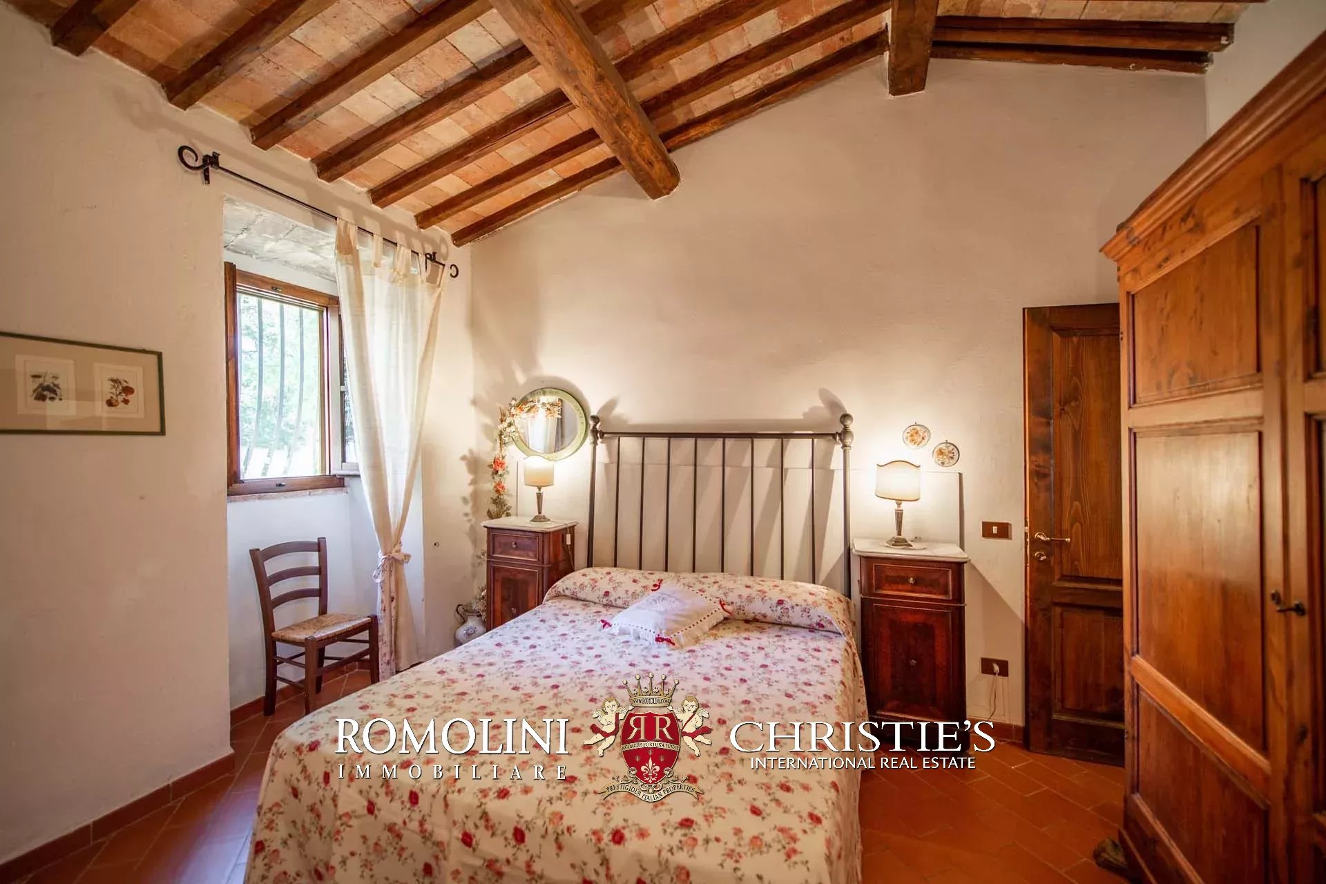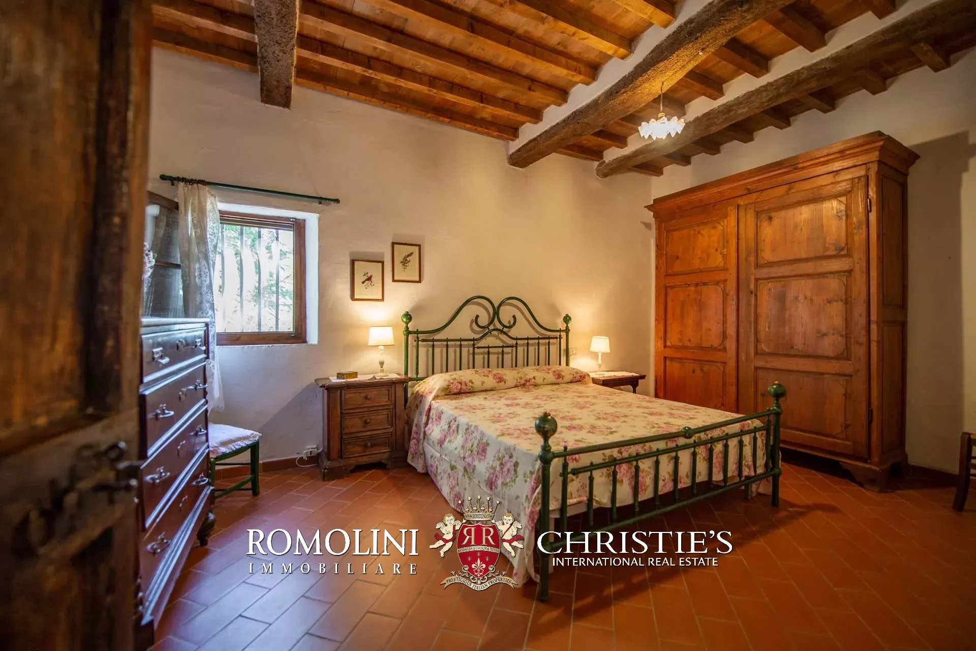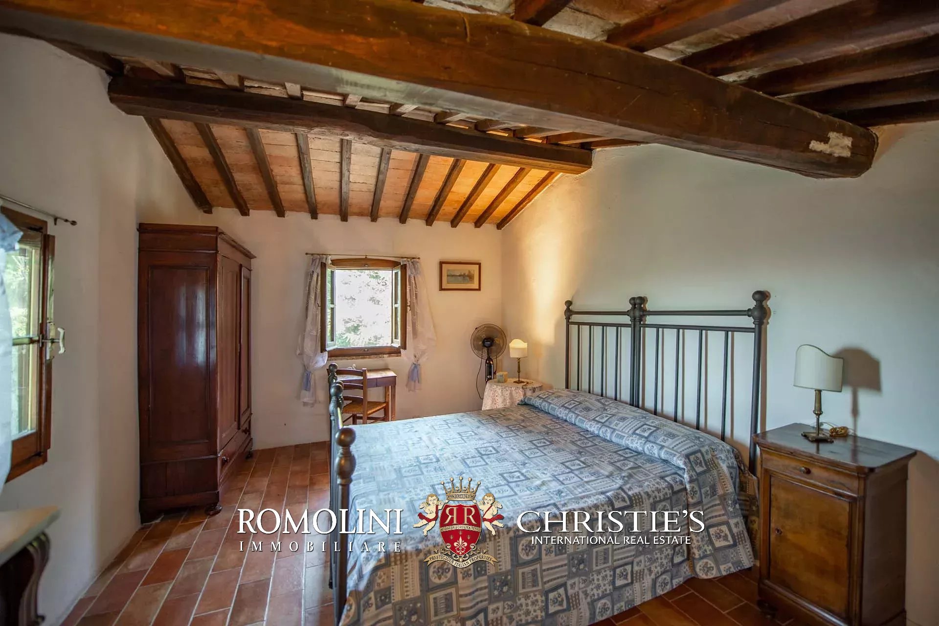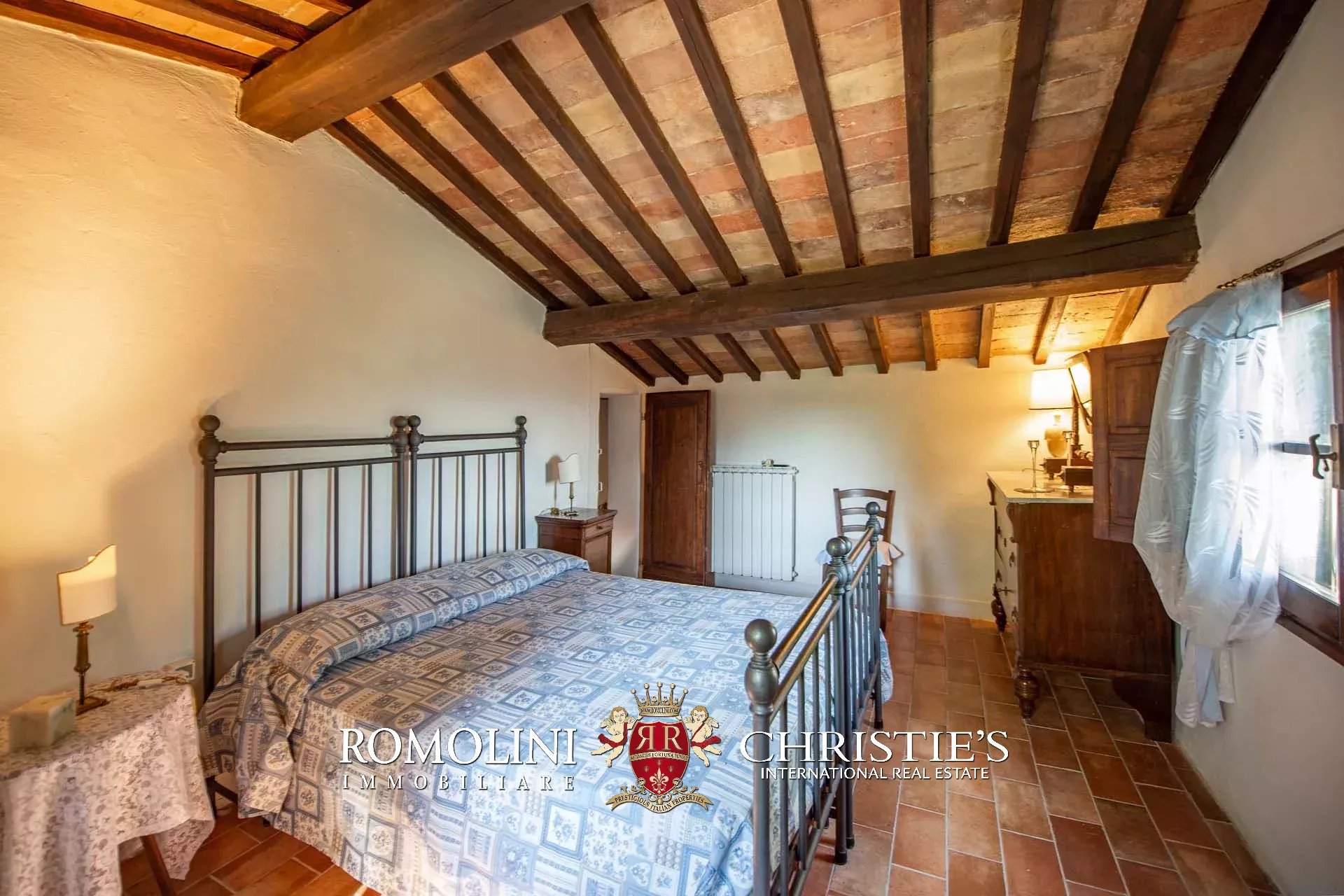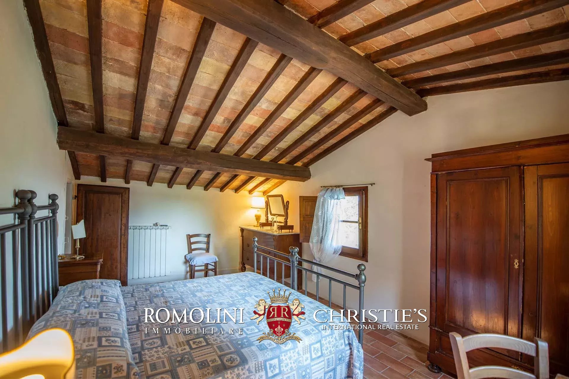 The farmhouse is completed by 3.4 hectares (8.4 acres) of land, arranged on the slope that descends north from the building. A large wooded garden (2,800 m²) with a panoramic terrace overlooking the Tuscan countryside has been created around the building.