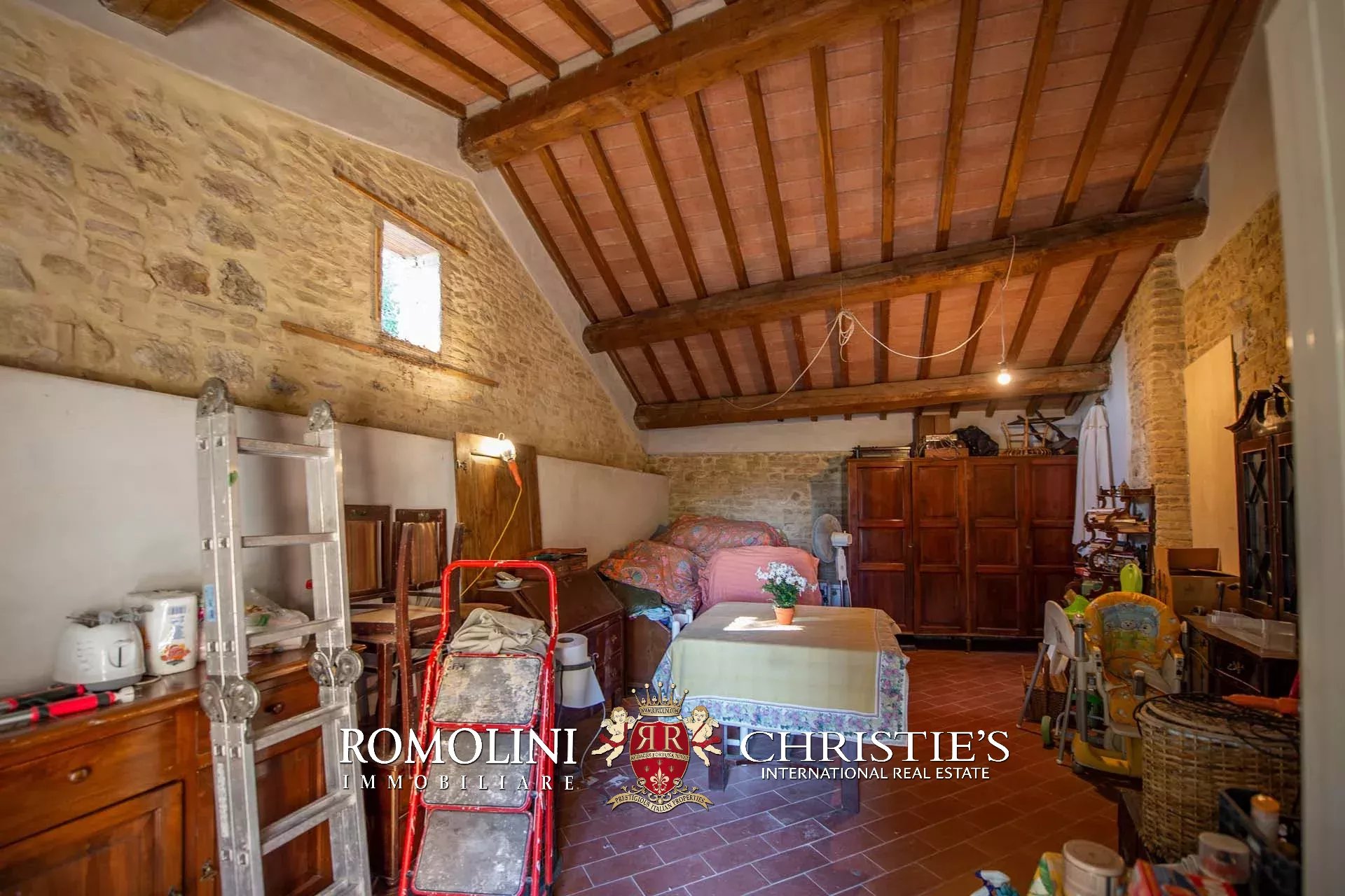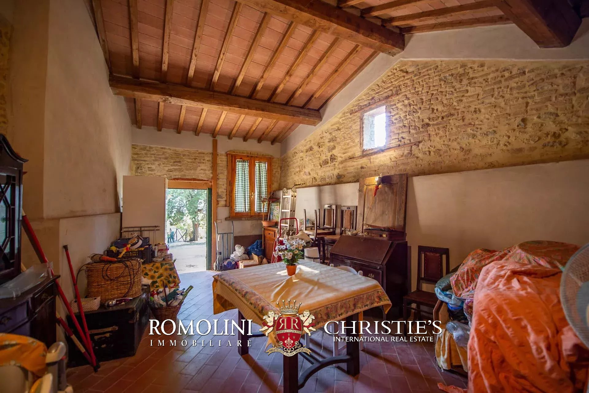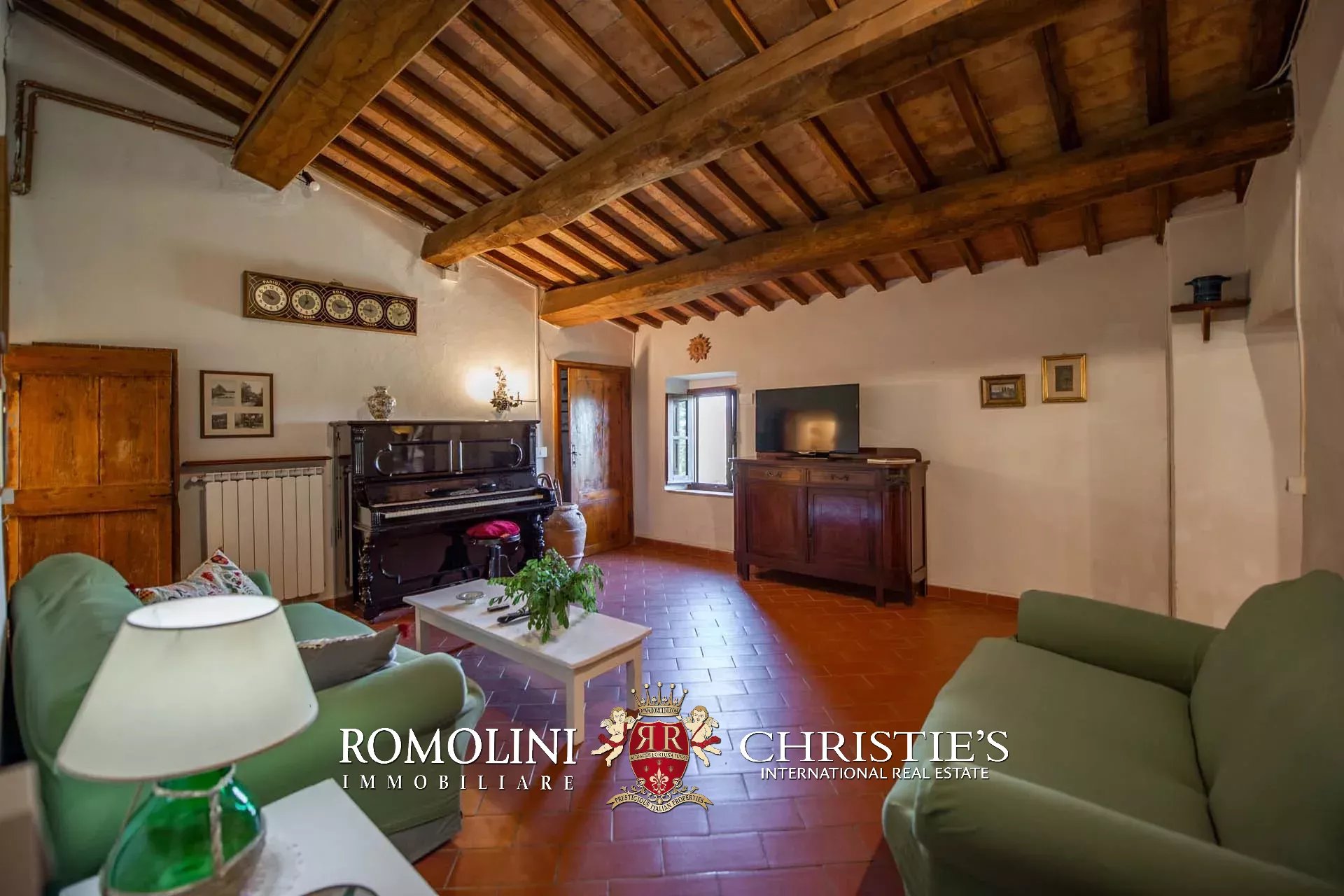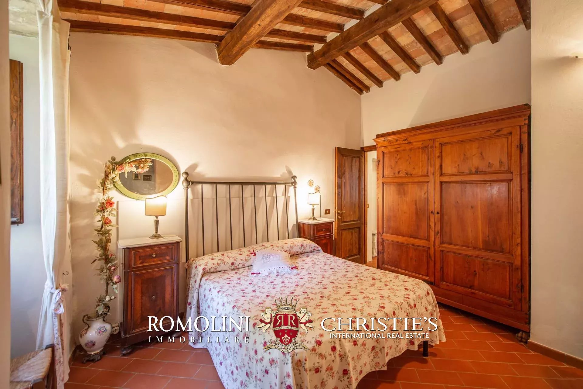 The farmhouse is completed by 3.4 hectares (8.4 acres) of land, arranged on the slope that descends north from the building. A large wooded garden (2,800 m²) with a panoramic terrace overlooking the Tuscan countryside has been created around the building.