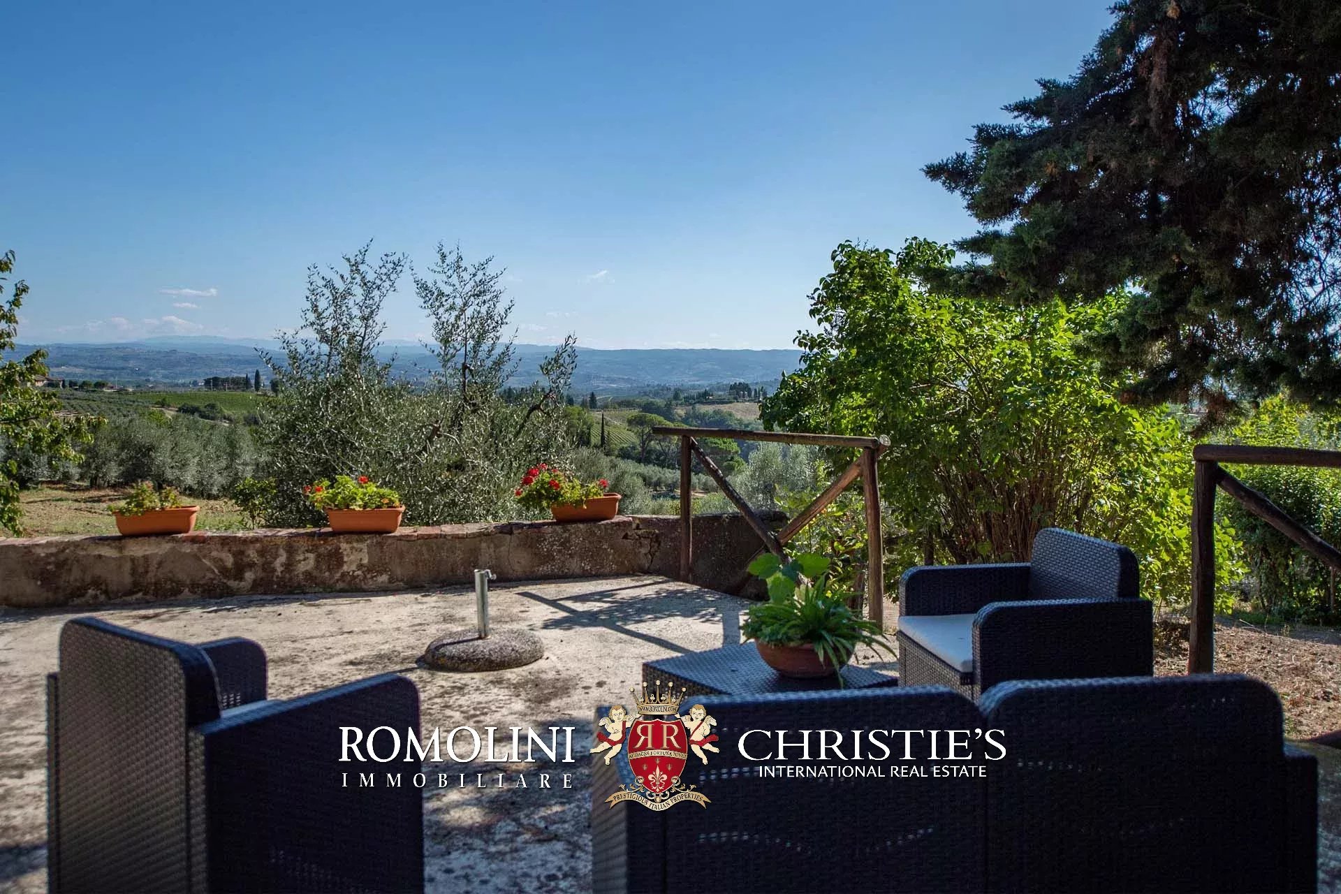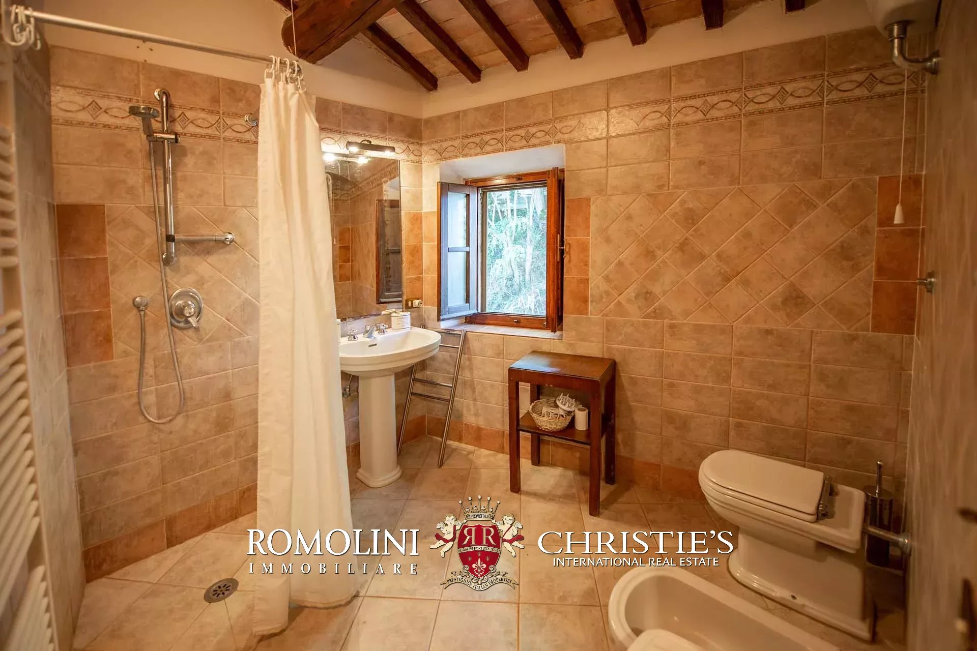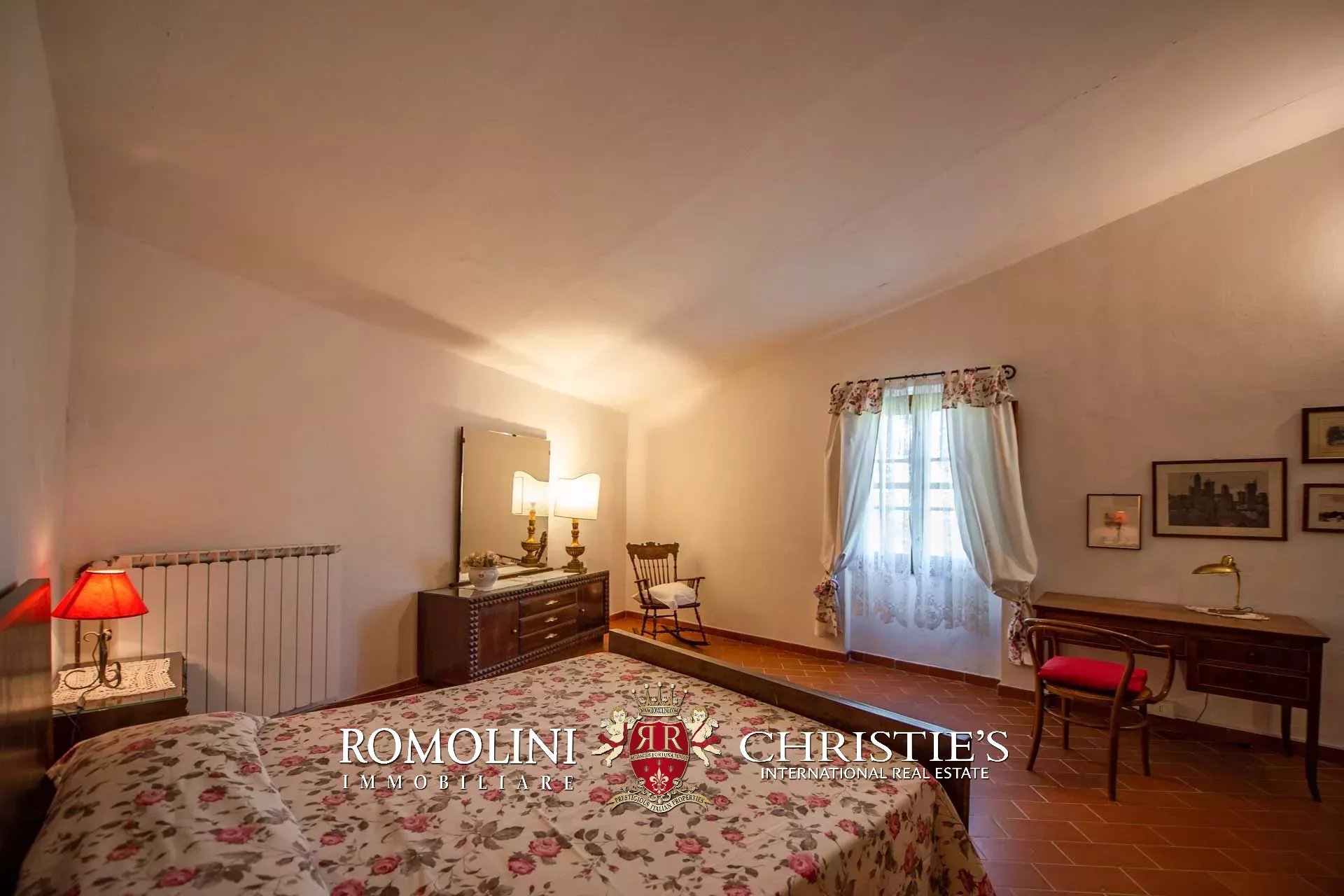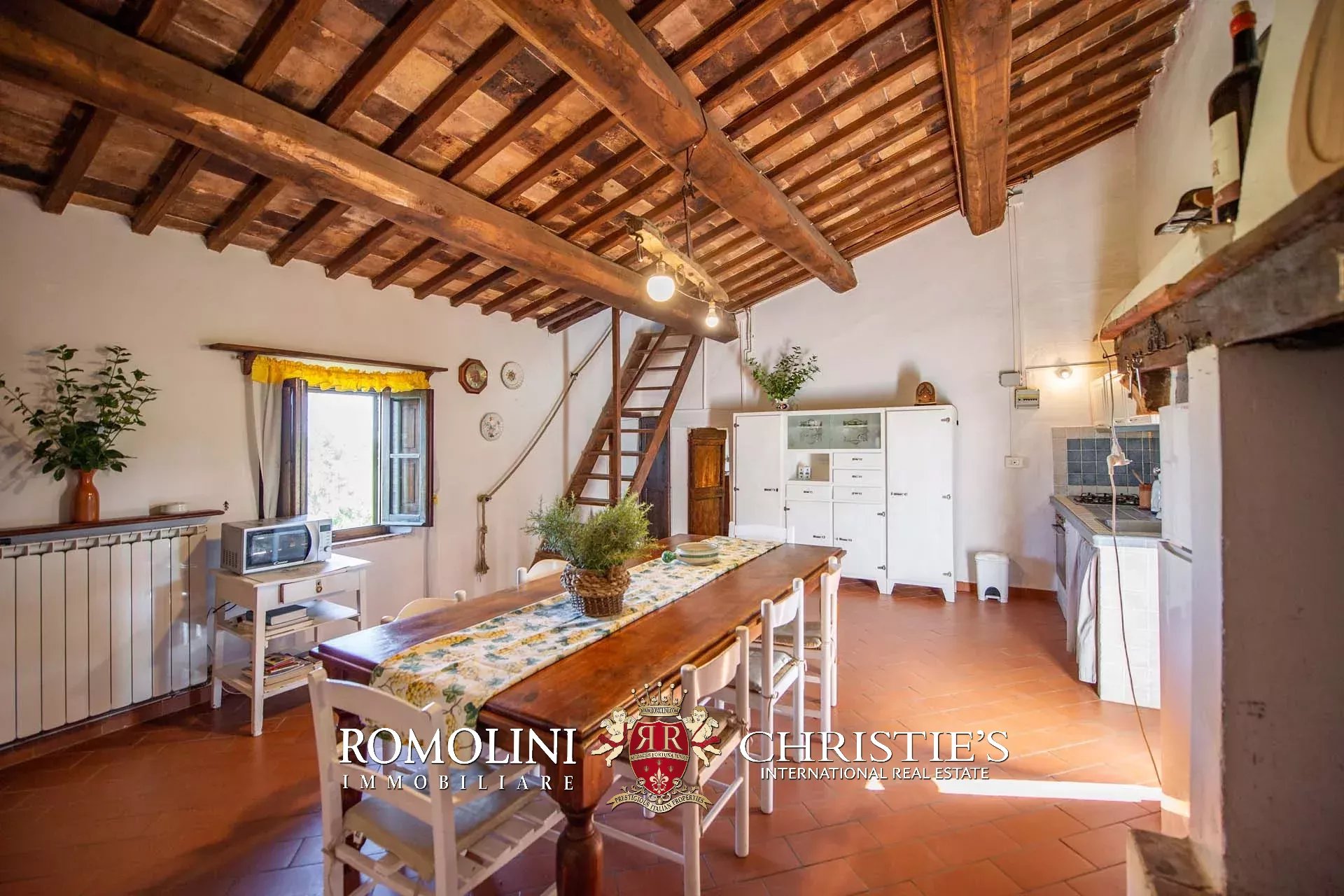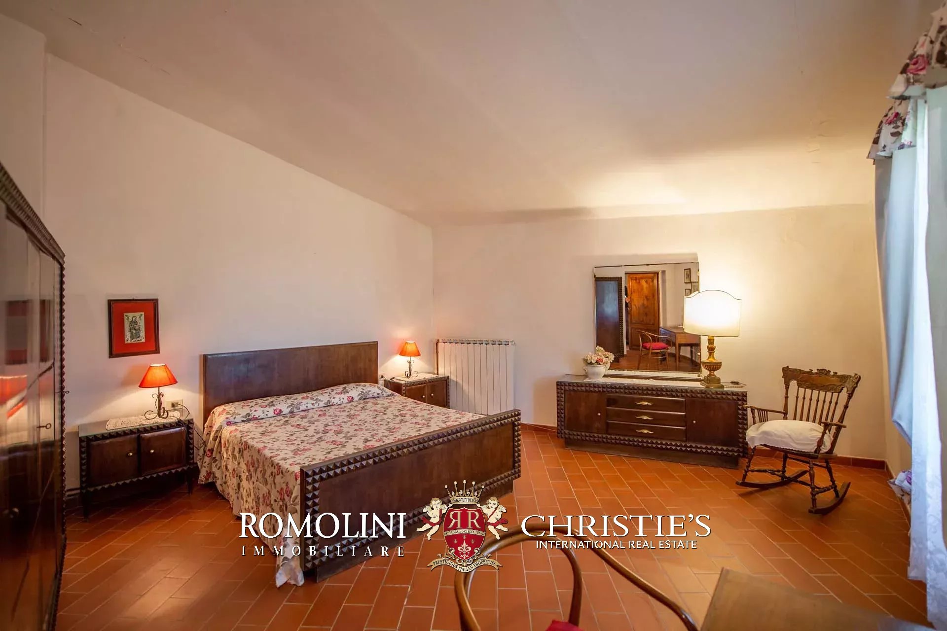 The farmhouse is completed by 3.4 hectares (8.4 acres) of land, arranged on the slope that descends north from the building. A large wooded garden (2,800 m²) with a panoramic terrace overlooking the Tuscan countryside has been created around the building.