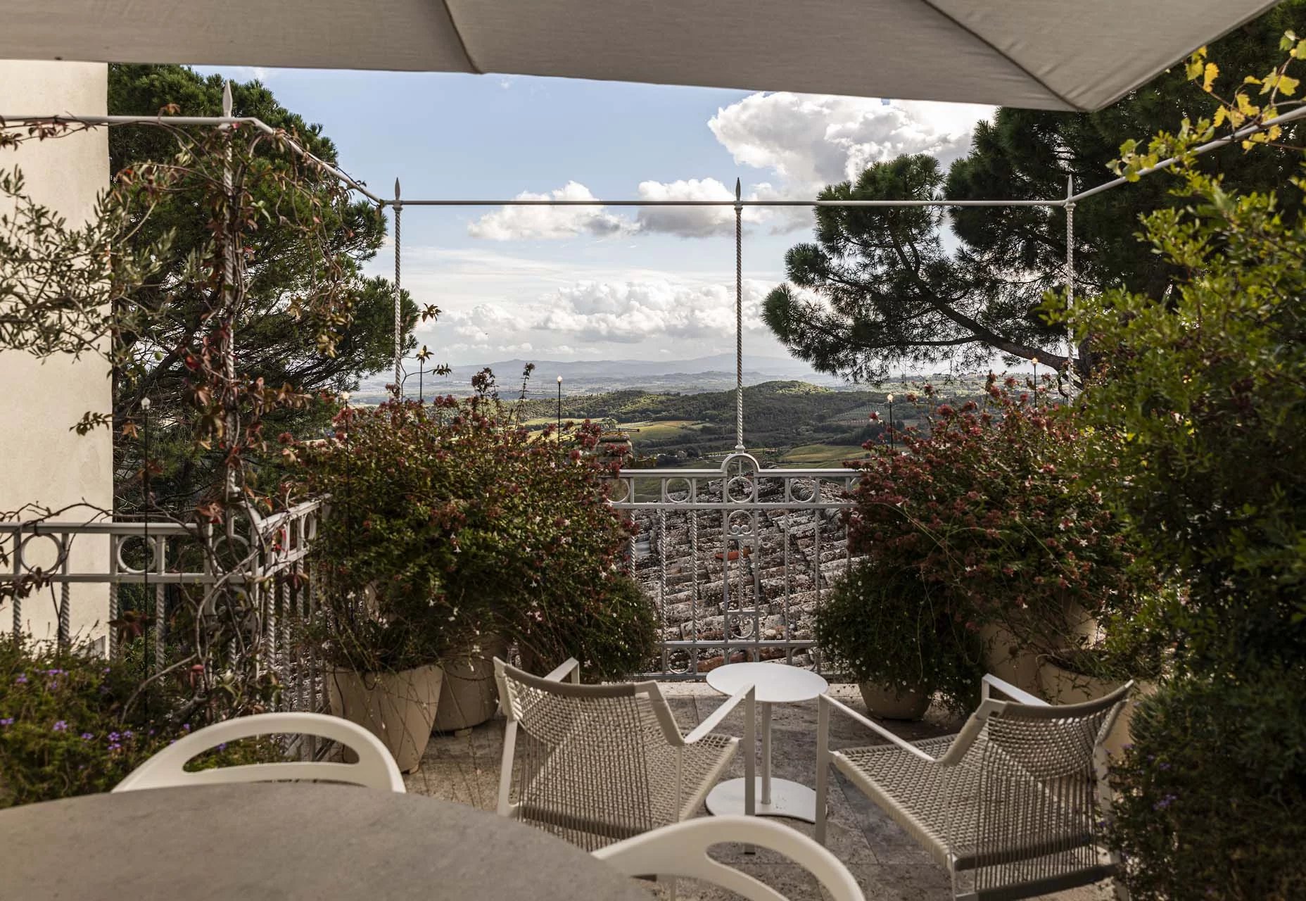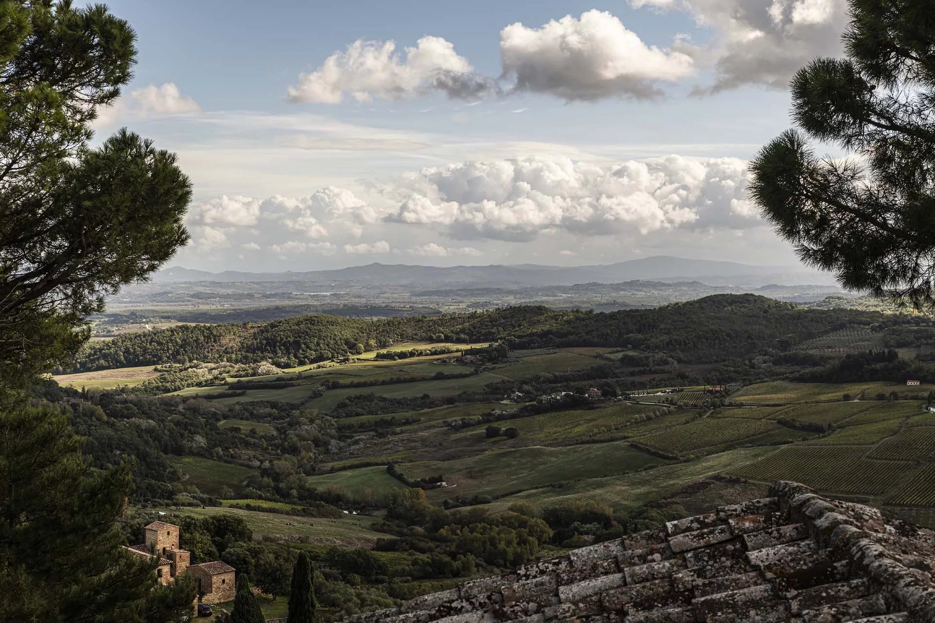 The house faces southeast with views of the hills covered in Vino Nobile vineyards, the lakes of Montepulciano and Trasimeno and beyond to the peaks of the Apennines, while to the northwest it faces the main avenue of the historic center of Montepulciano, from which it has access to and attends the processions and celebrations of the Bravio delle Botti di Montepulciano, right within the contrada of Cagnano.
