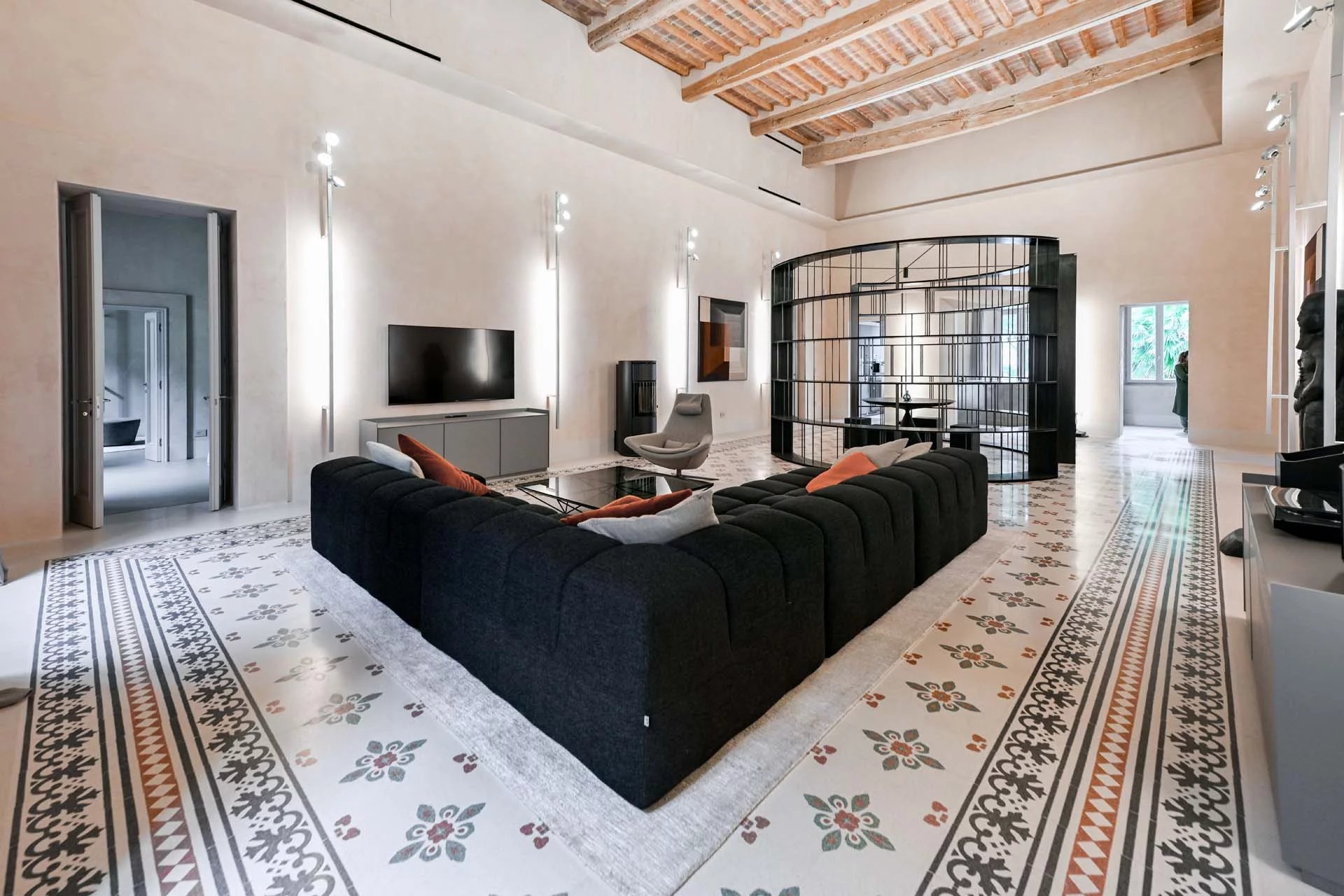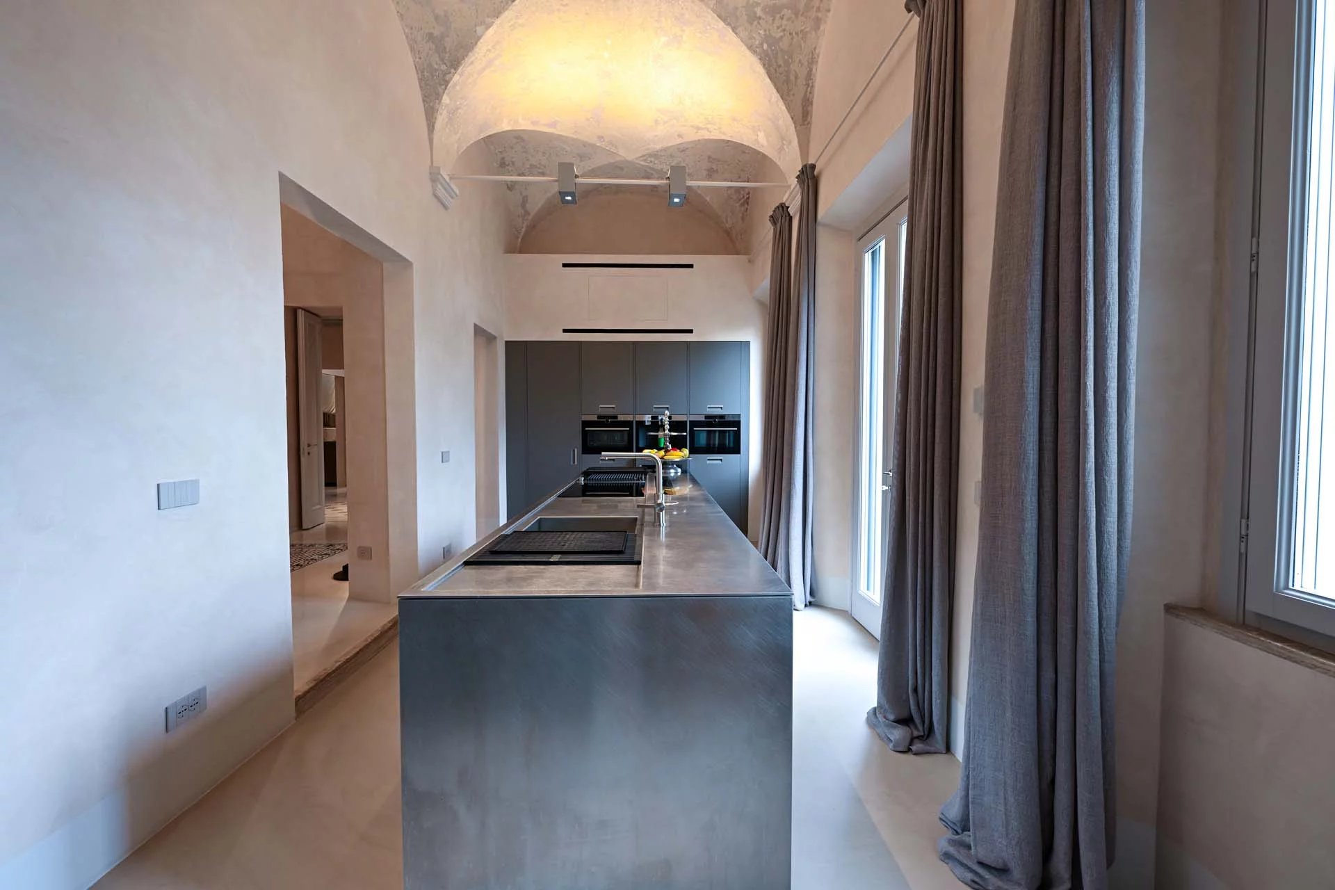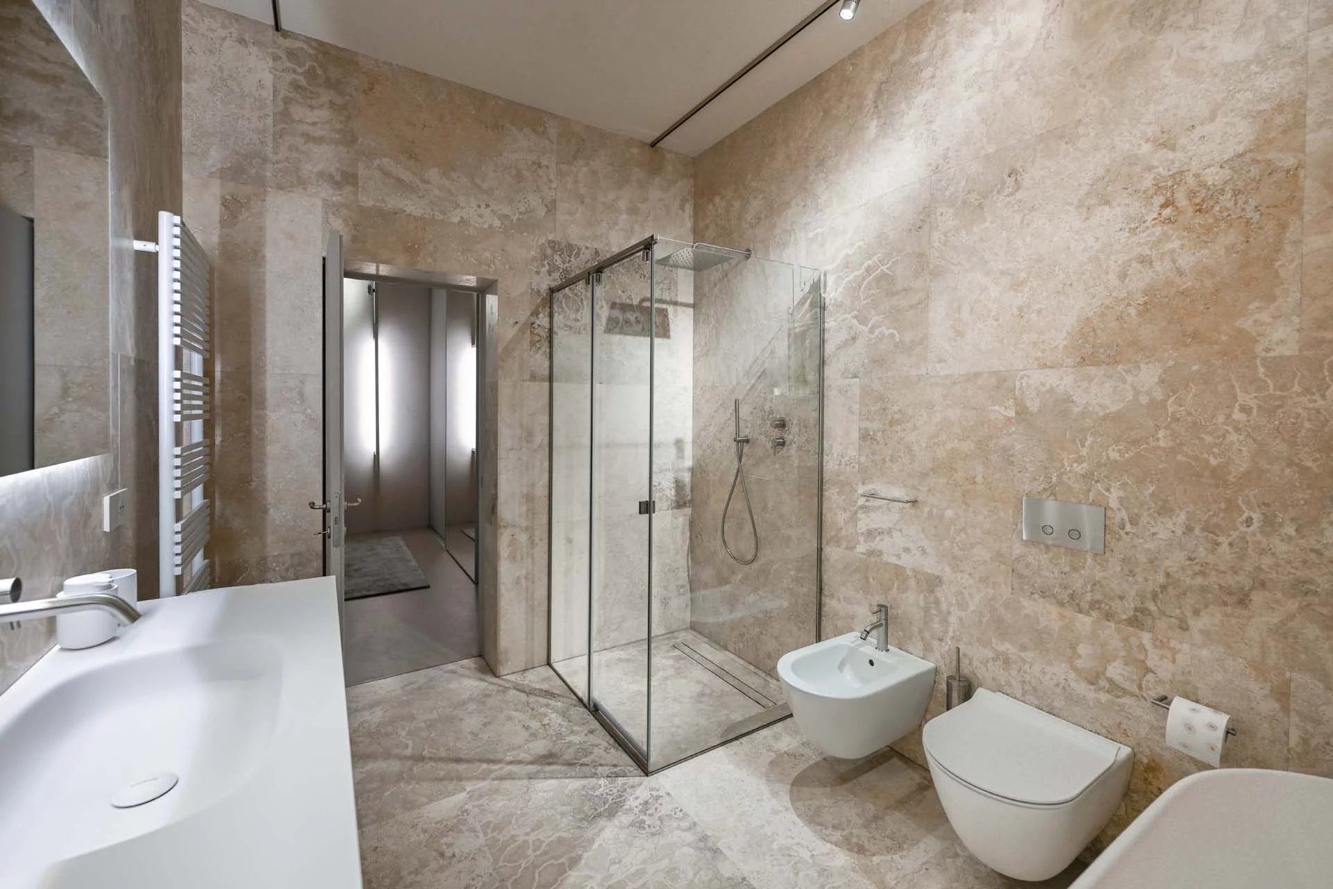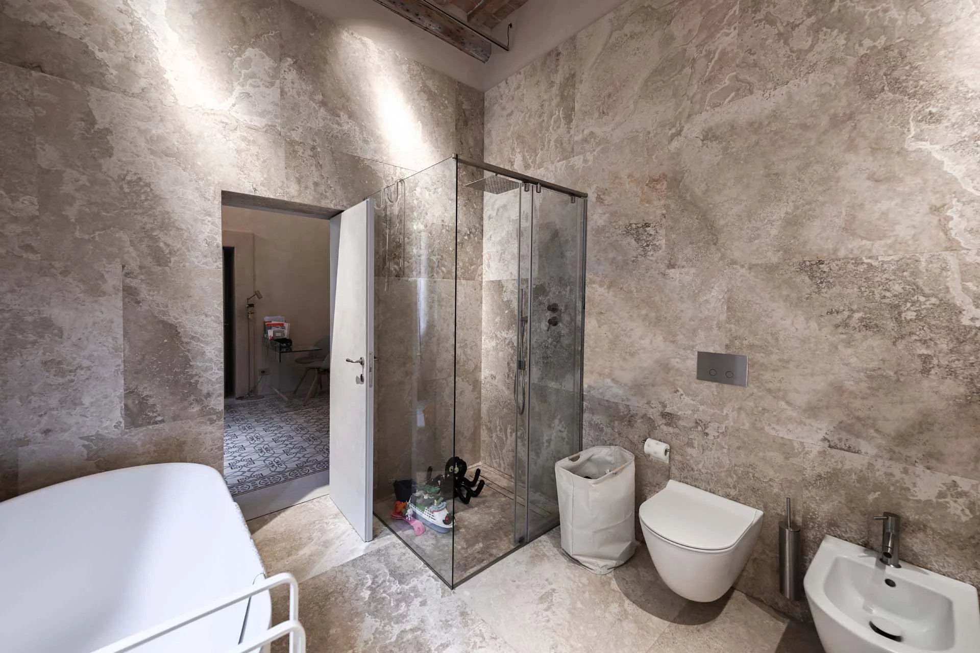 The floors of the dwelling are largely made of antique hand-crafted grits of white Carrara marble with elaborate and elegant designs in celebration of the palazzo’s glorious past, and partly in resin with a cloudy effect, characterized by chiaroscuro effects that evoke the intensity of concrete with a minimal style. The bathrooms are entirely covered with travertine slabs, obtained from blocks specially selected by the property at the quarry. The technical rooms, laundry room, balcony and terrace are also covered in travertine.