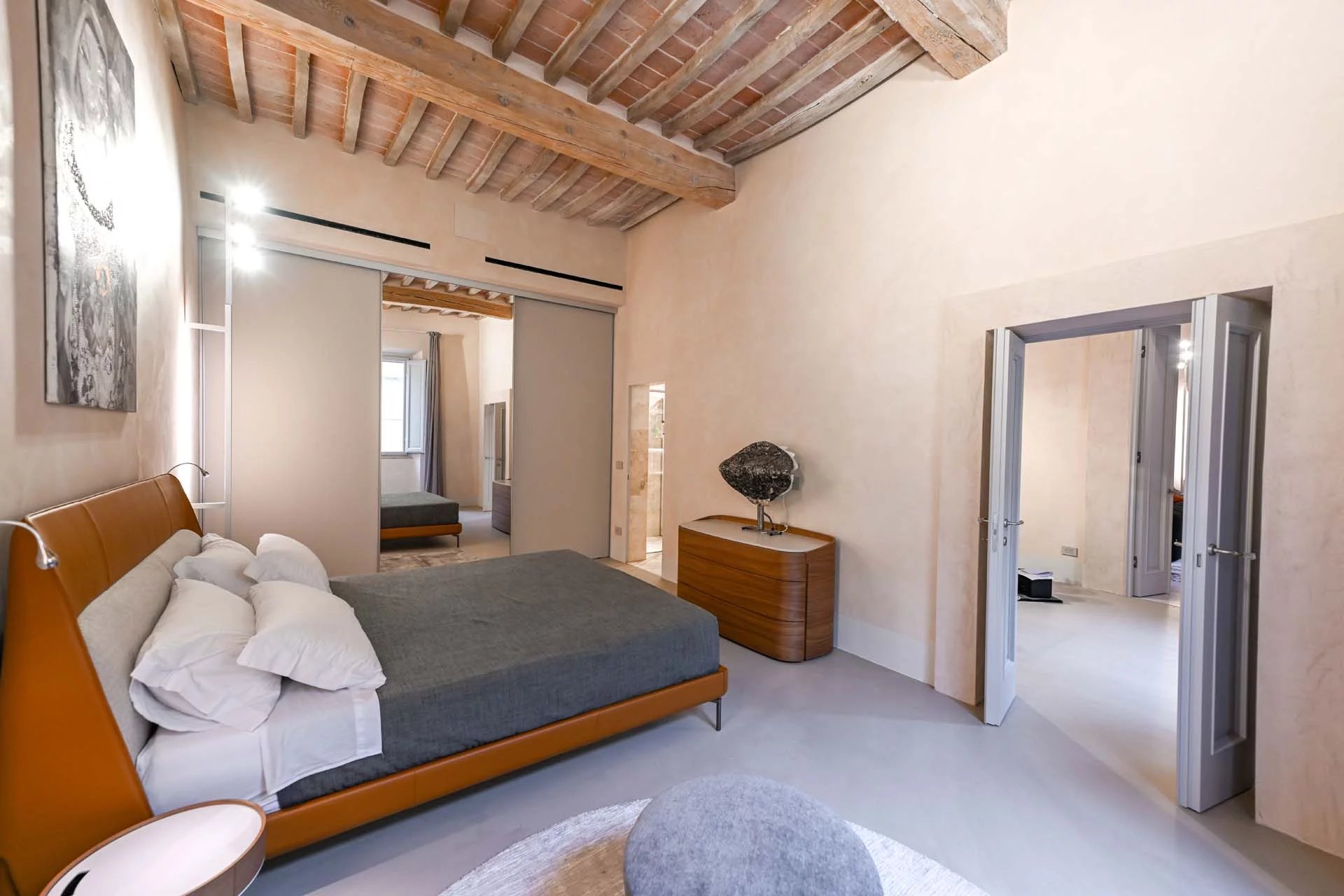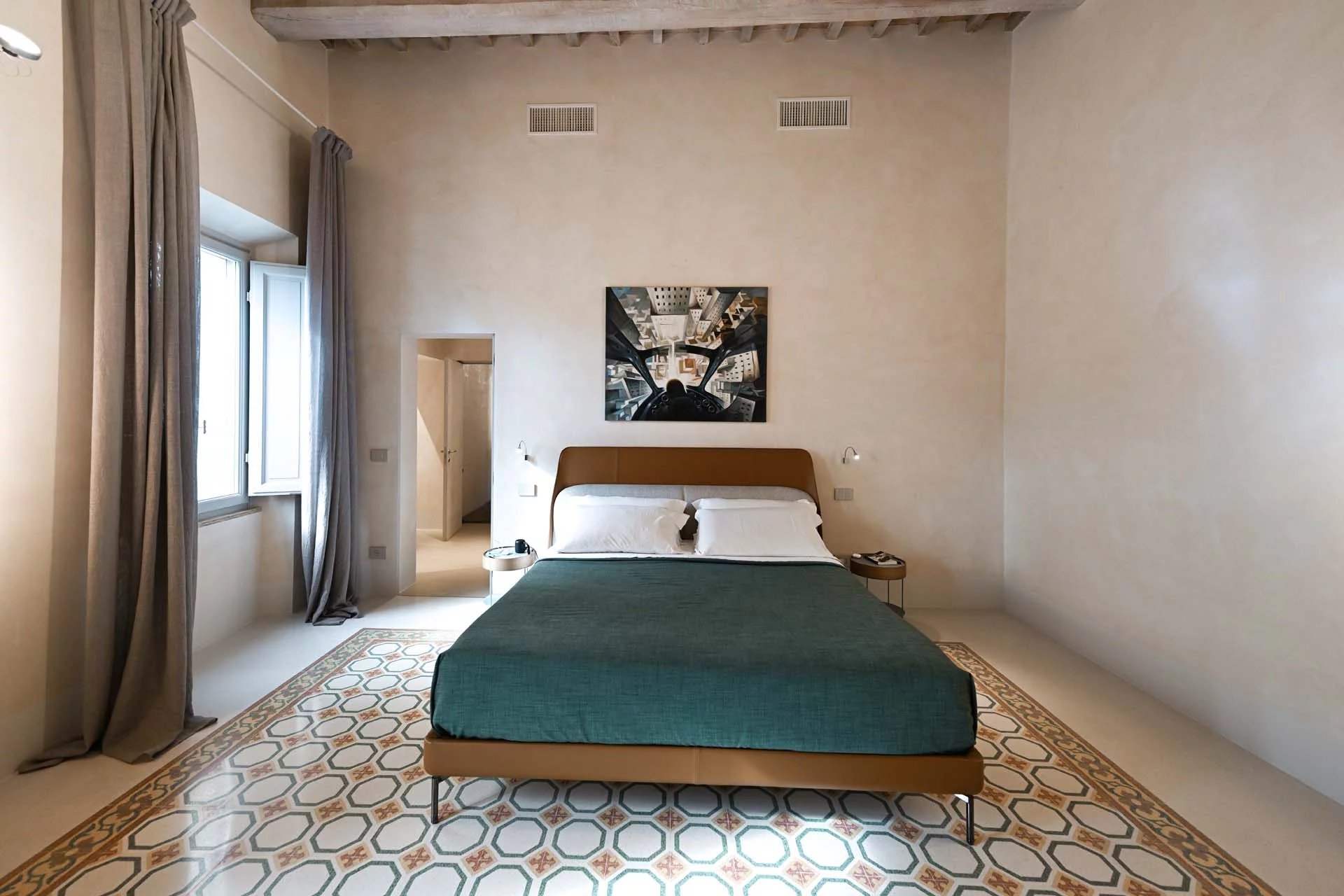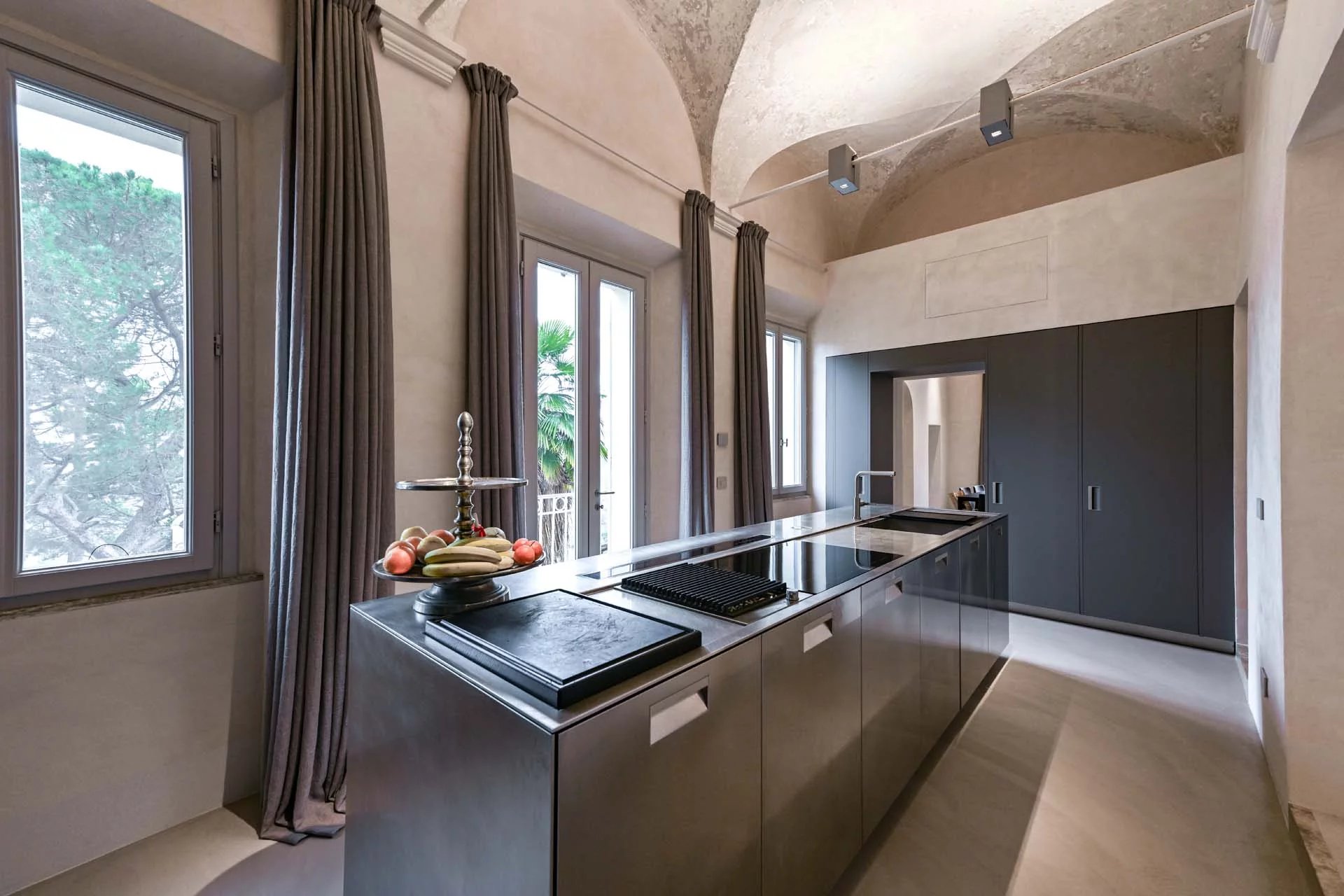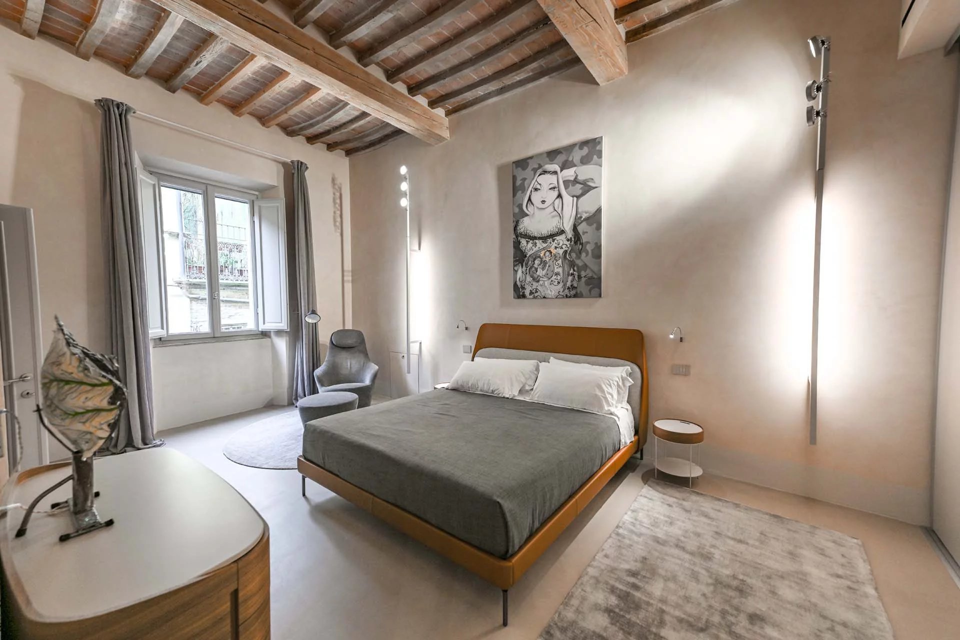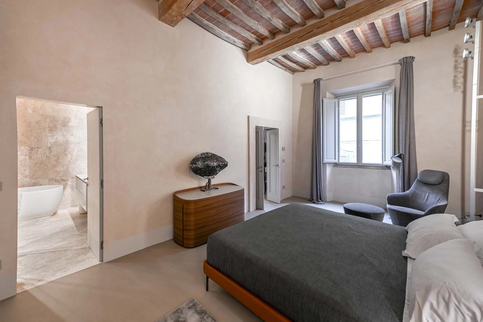 The floors of the dwelling are largely made of antique hand-crafted grits of white Carrara marble with elaborate and elegant designs in celebration of the palazzo’s glorious past, and partly in resin with a cloudy effect, characterized by chiaroscuro effects that evoke the intensity of concrete with a minimal style. The bathrooms are entirely covered with travertine slabs, obtained from blocks specially selected by the property at the quarry. The technical rooms, laundry room, balcony and terrace are also covered in travertine.