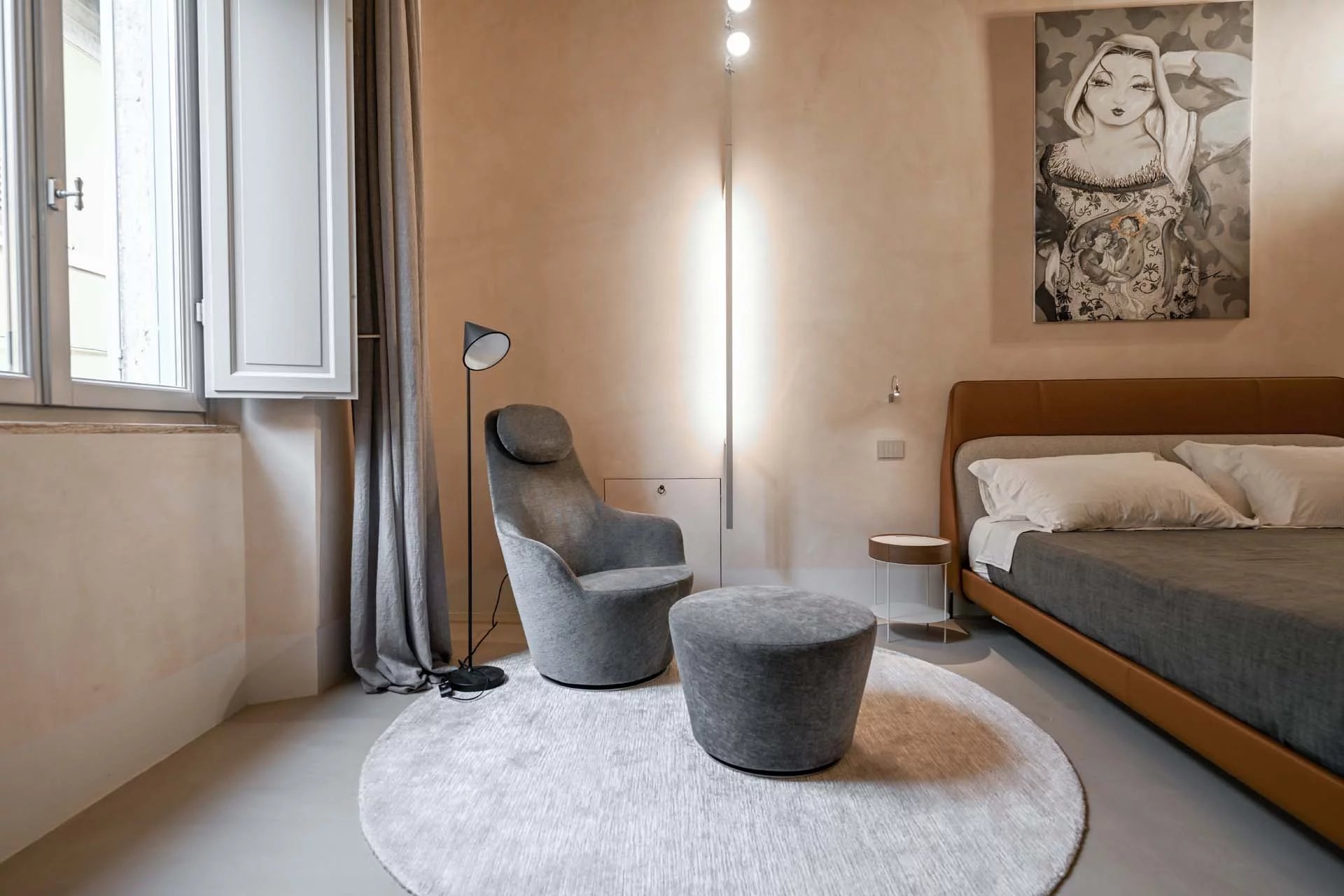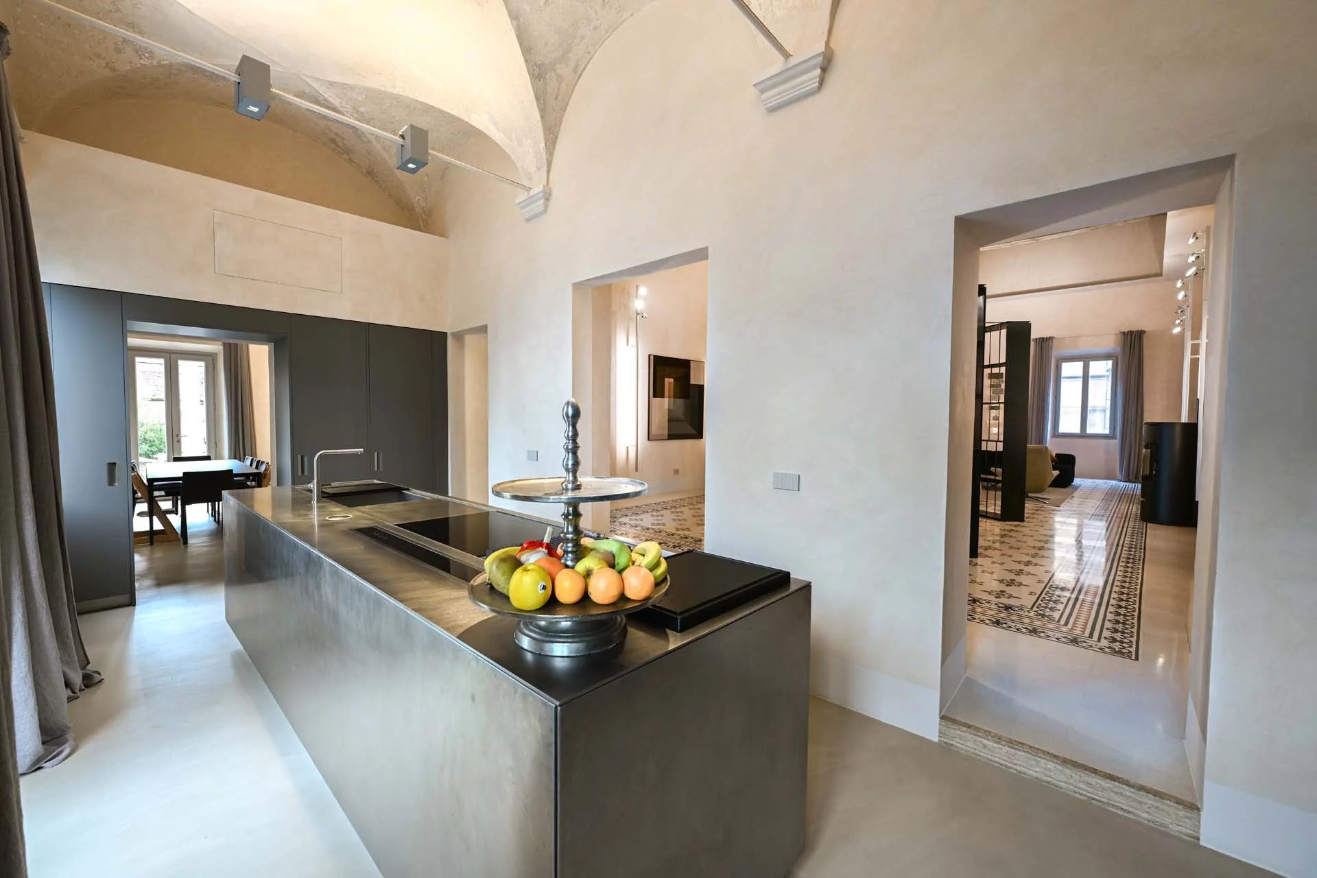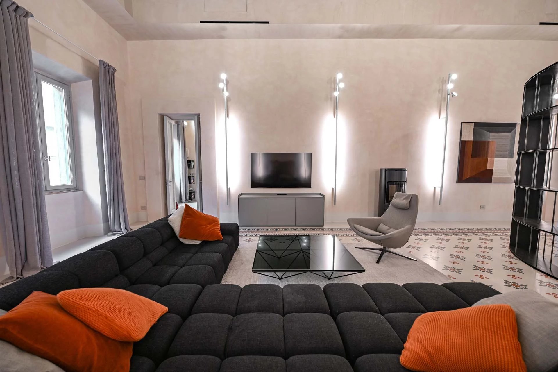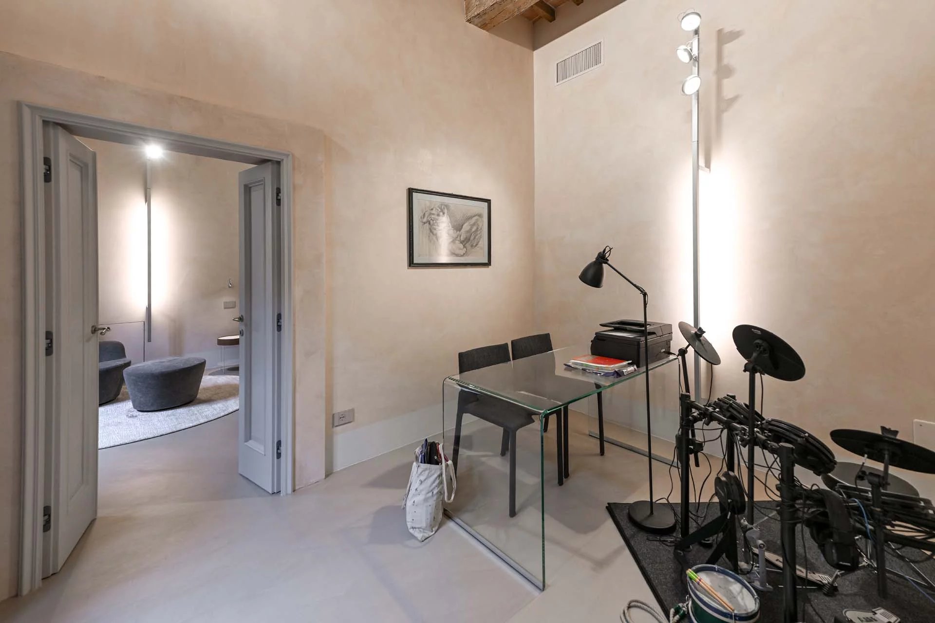 The floors of the dwelling are largely made of antique hand-crafted grits of white Carrara marble with elaborate and elegant designs in celebration of the palazzo’s glorious past, and partly in resin with a cloudy effect, characterized by chiaroscuro effects that evoke the intensity of concrete with a minimal style. The bathrooms are entirely covered with travertine slabs, obtained from blocks specially selected by the property at the quarry. The technical rooms, laundry room, balcony and terrace are also covered in travertine.
