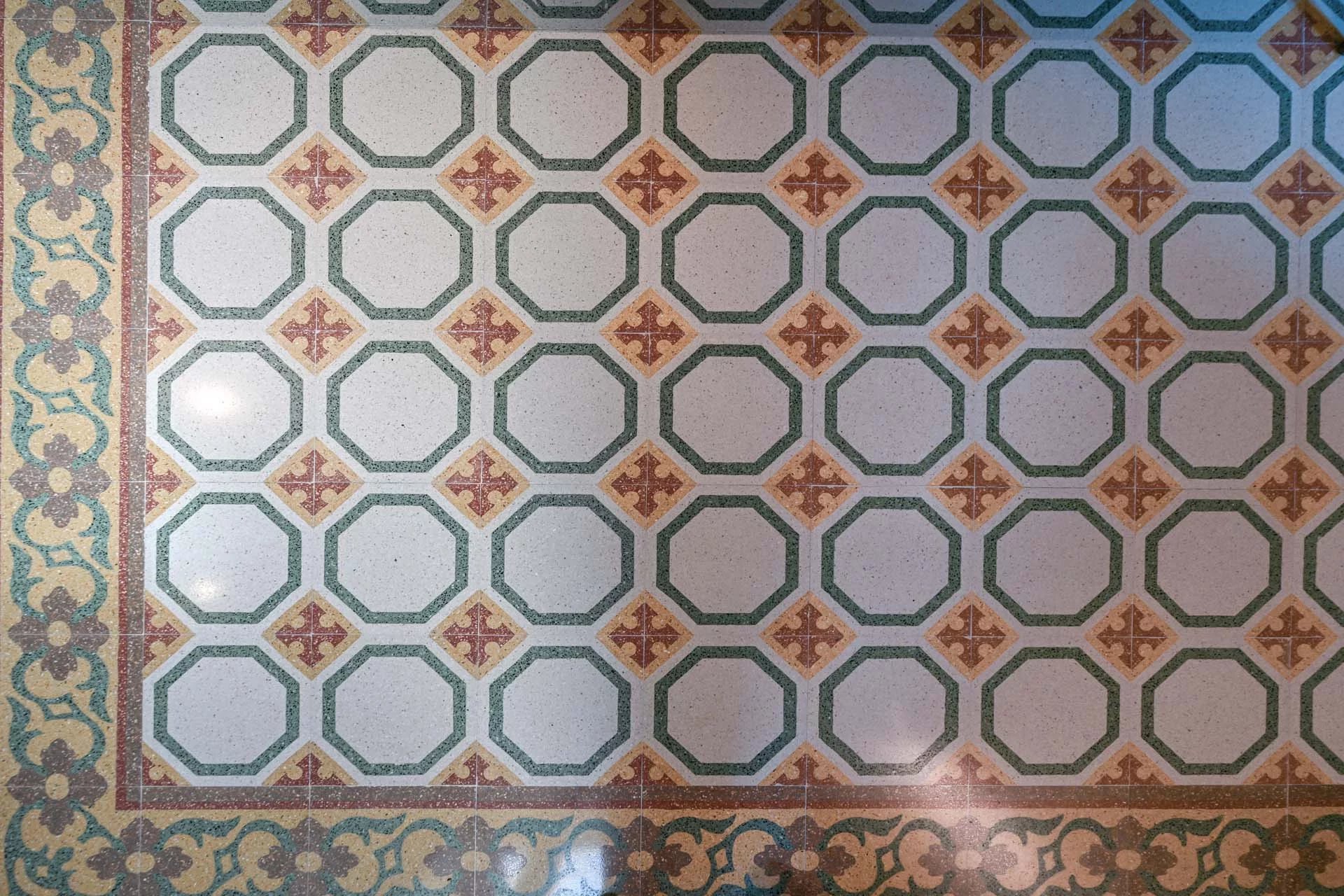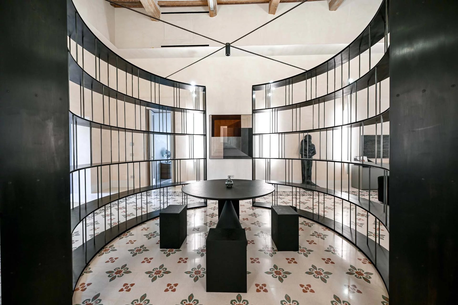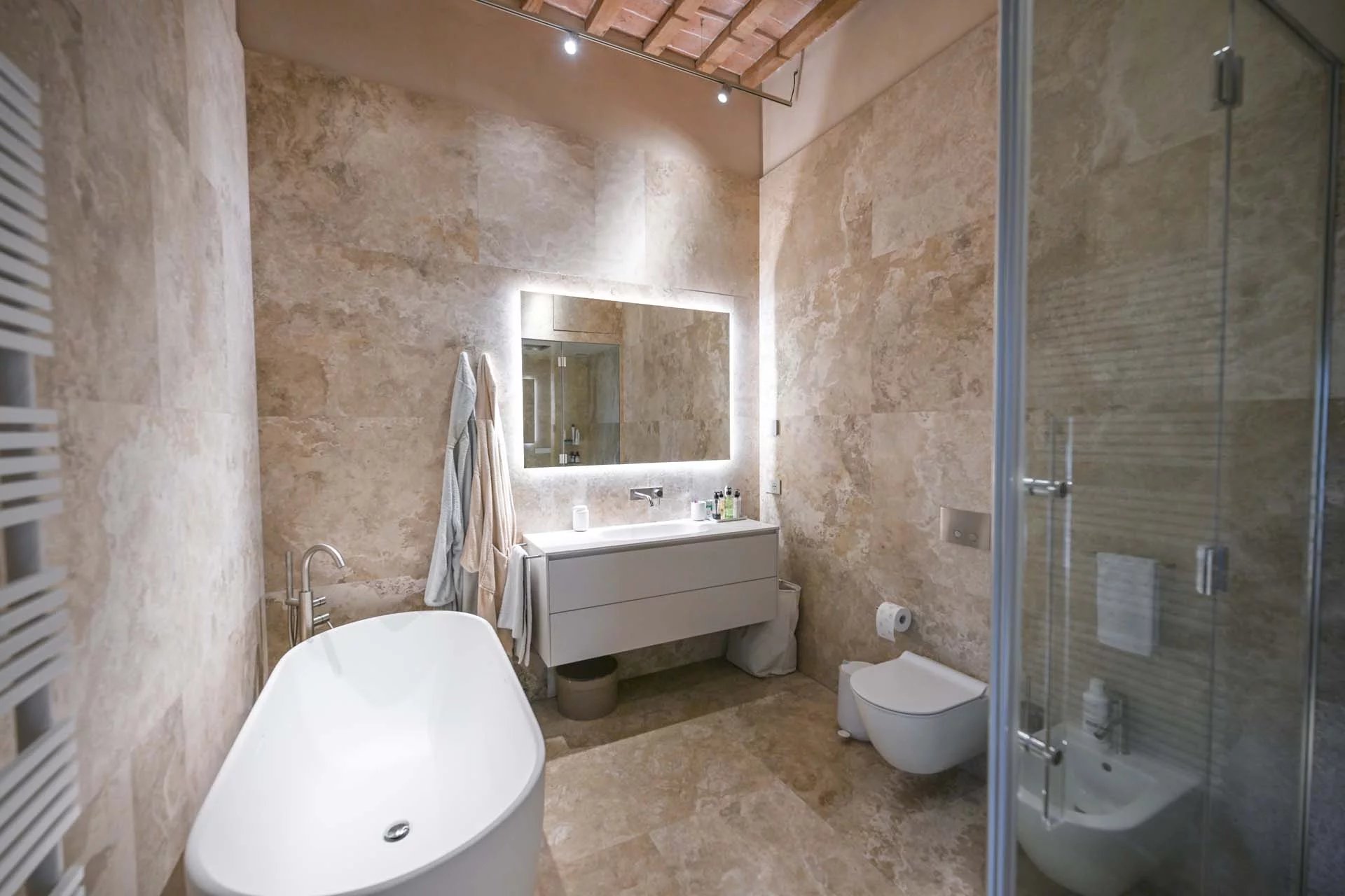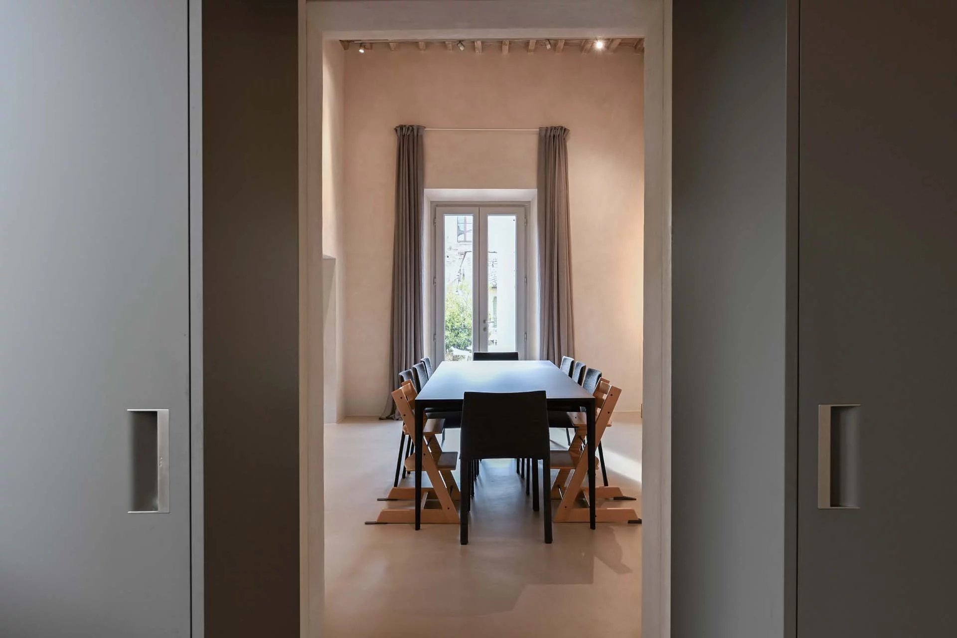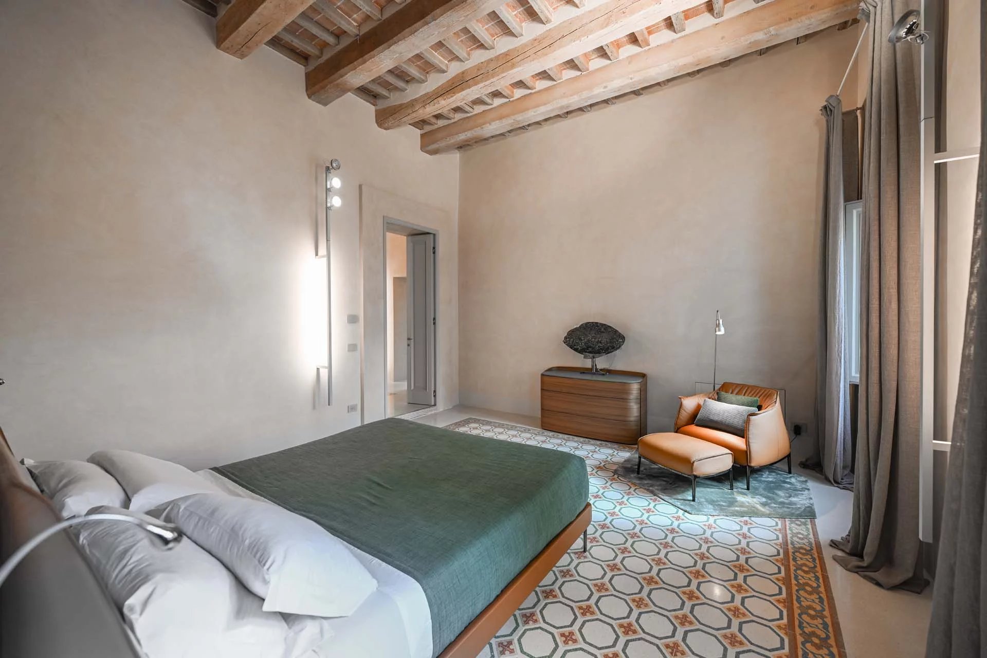 The floors of the dwelling are largely made of antique hand-crafted grits of white Carrara marble with elaborate and elegant designs in celebration of the palazzo’s glorious past, and partly in resin with a cloudy effect, characterized by chiaroscuro effects that evoke the intensity of concrete with a minimal style. The bathrooms are entirely covered with travertine slabs, obtained from blocks specially selected by the property at the quarry. The technical rooms, laundry room, balcony and terrace are also covered in travertine.