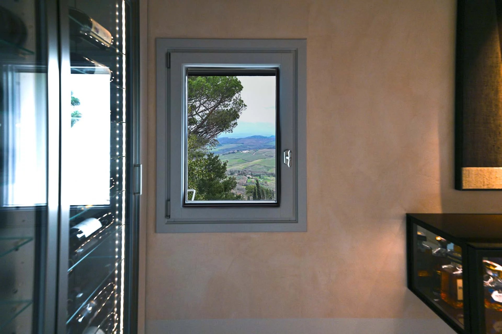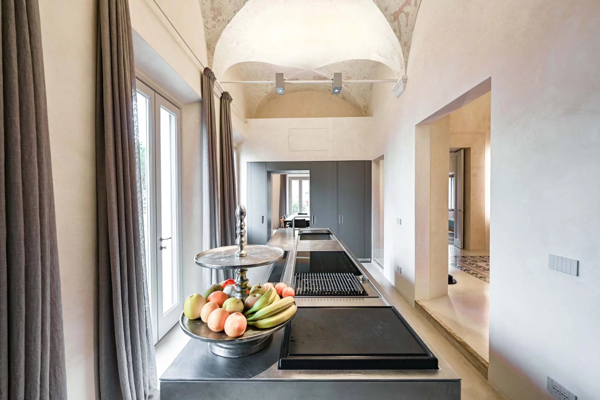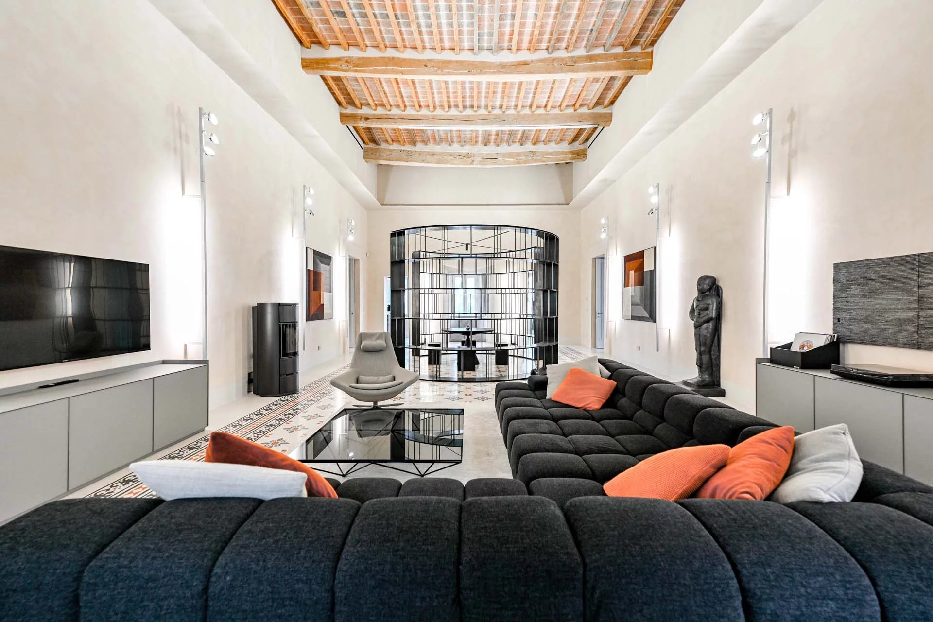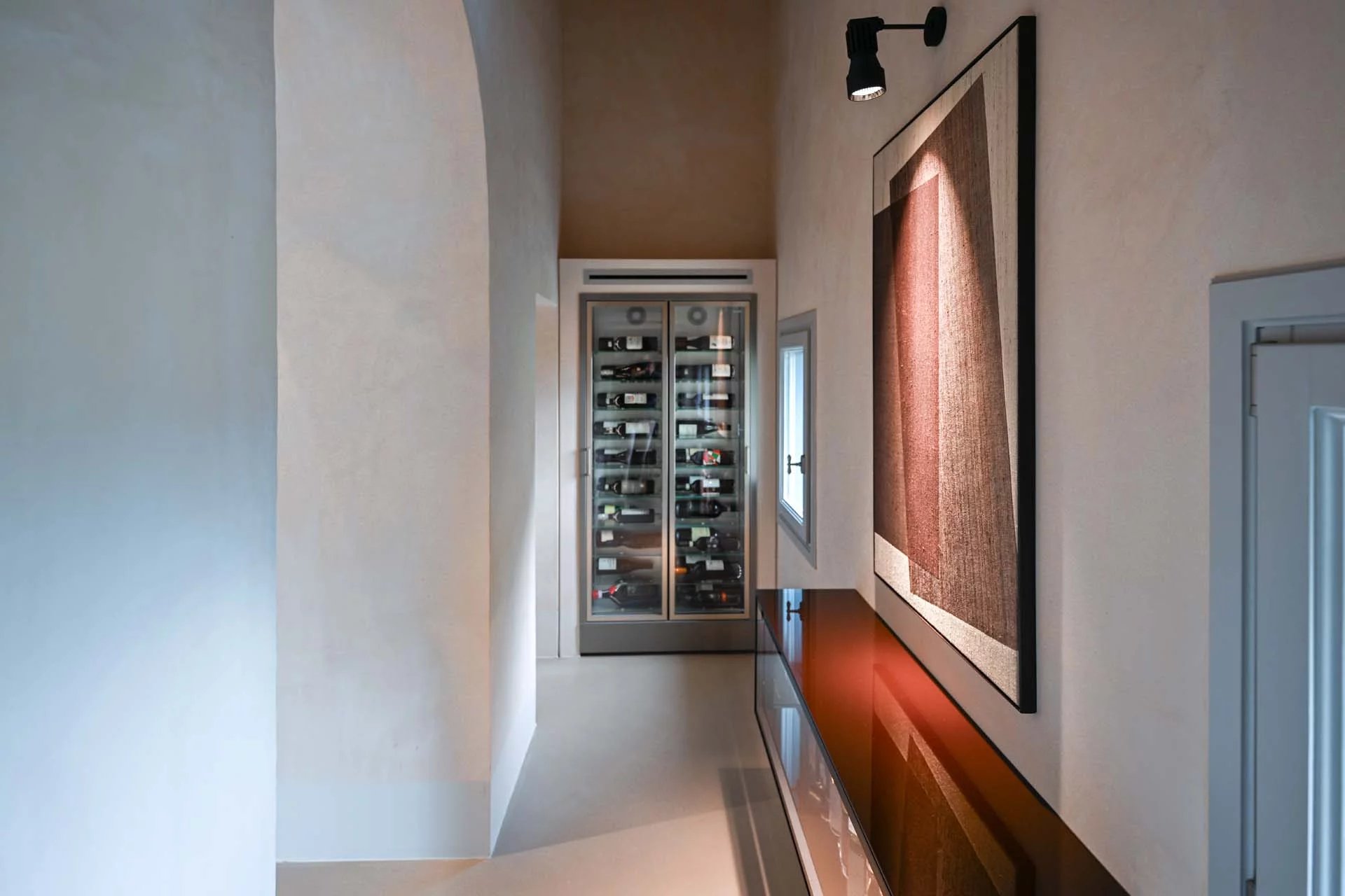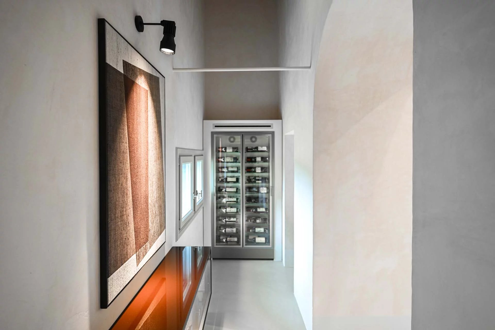 The lighting system, entirely made of dimmable LEDs, is the work of one of Italy’s most renowned lighting designers. The entire furniture is included in the sale price, as an integral part of the home, and is sourced from iconic Italian designers and artisans specializing in crystal, burnished and brushed metals, leather, and natural fabrics. Soft draperies at the large windows resemble curtains and evoke the theatricality of the spaces. At the center of a prime breeding and wine-growing area, a rib-roasting machine and thermoregulated wine cellars could not to be missing among the amenities. The renovation, as a whole, reveals extreme attention to quality and construction detail, with a result of absolute excellence.