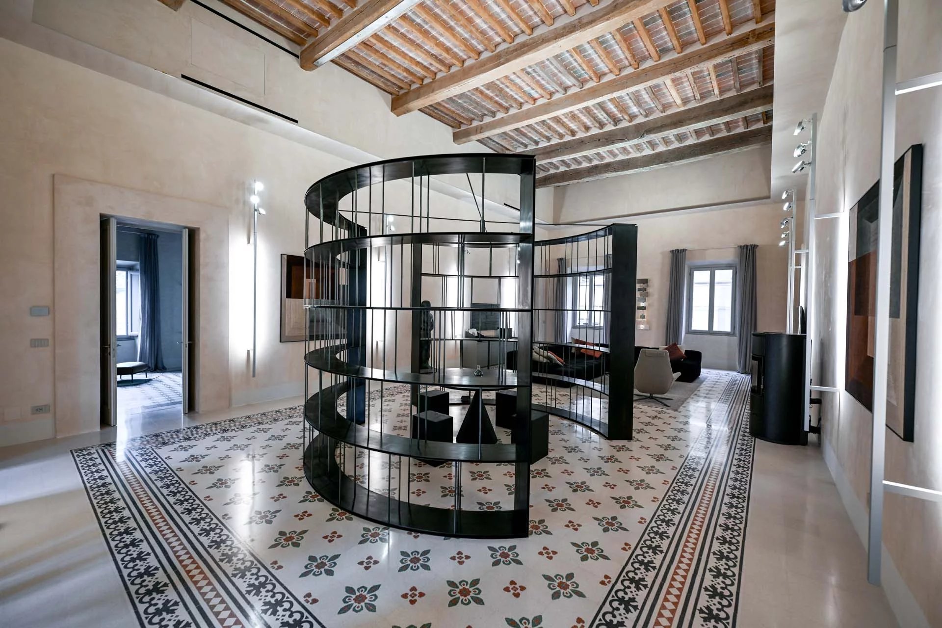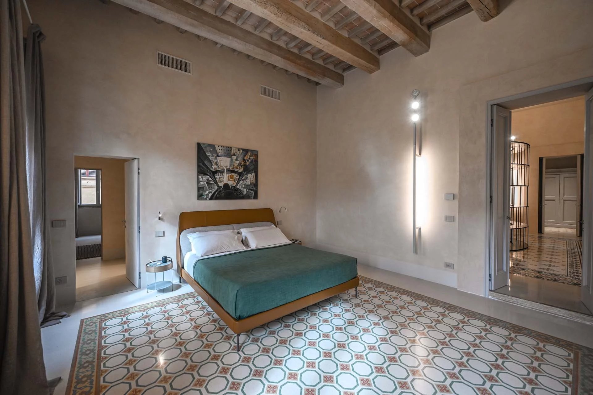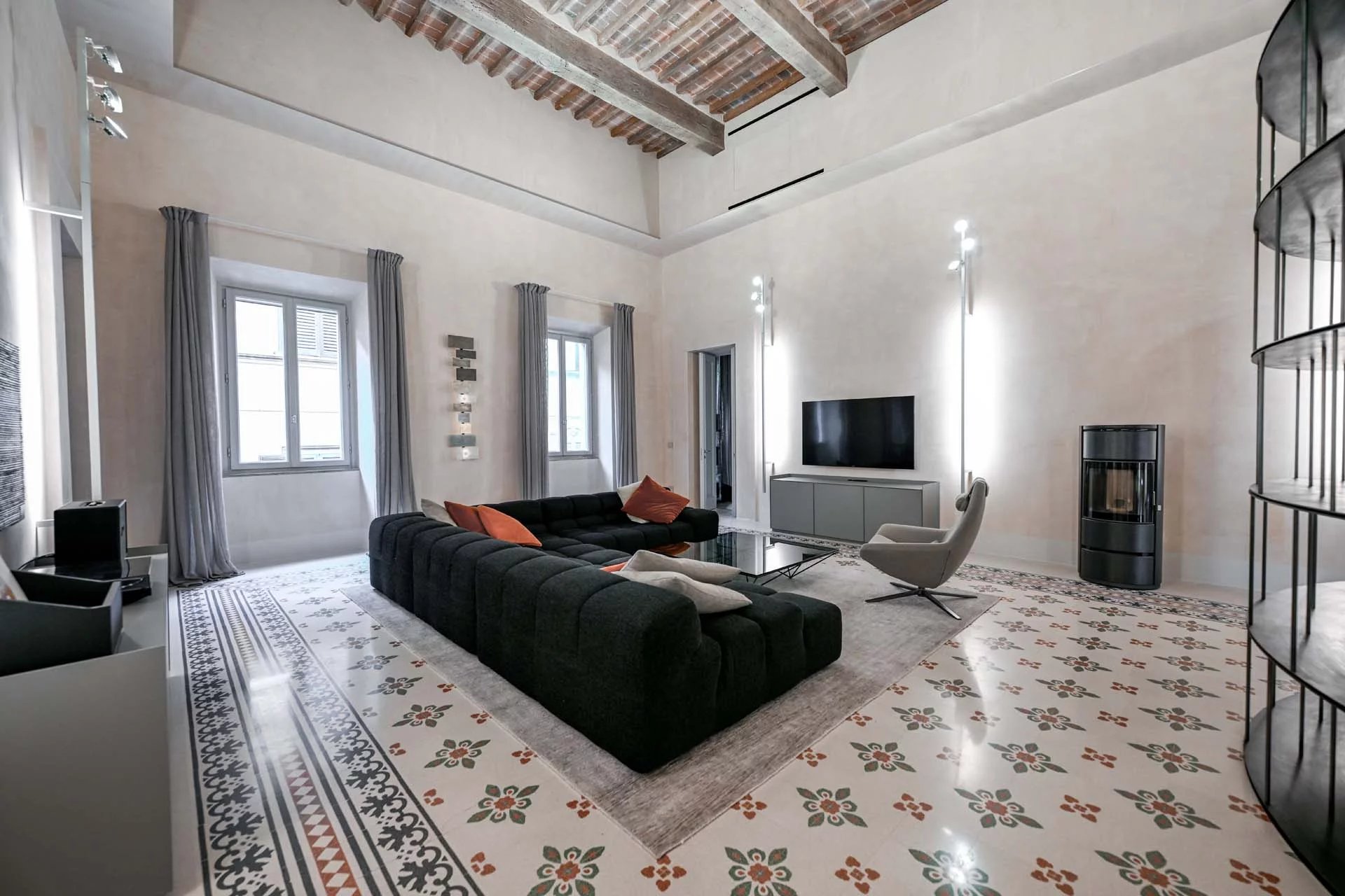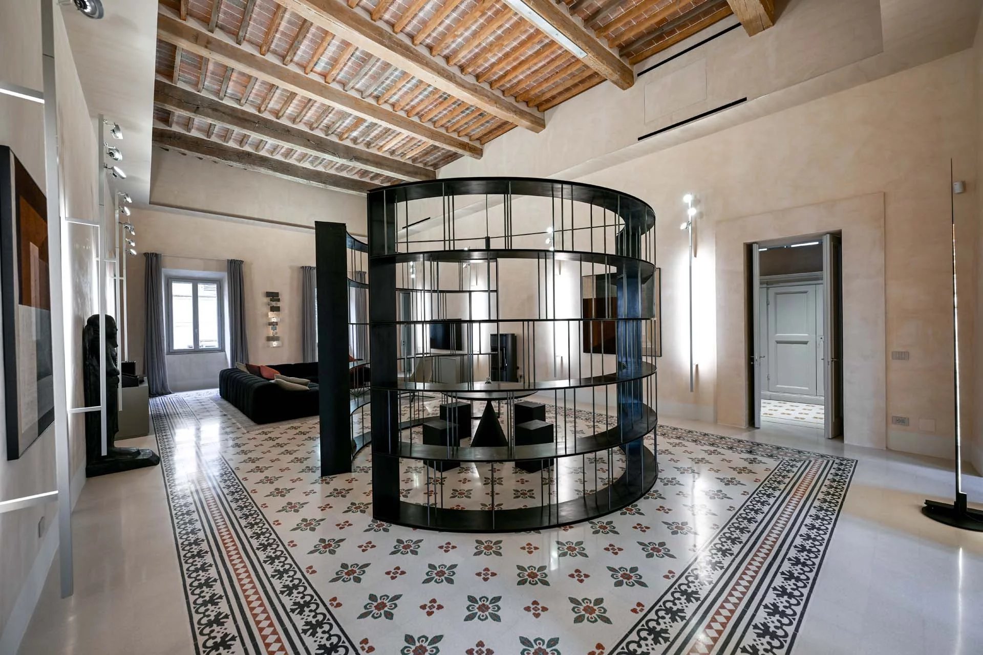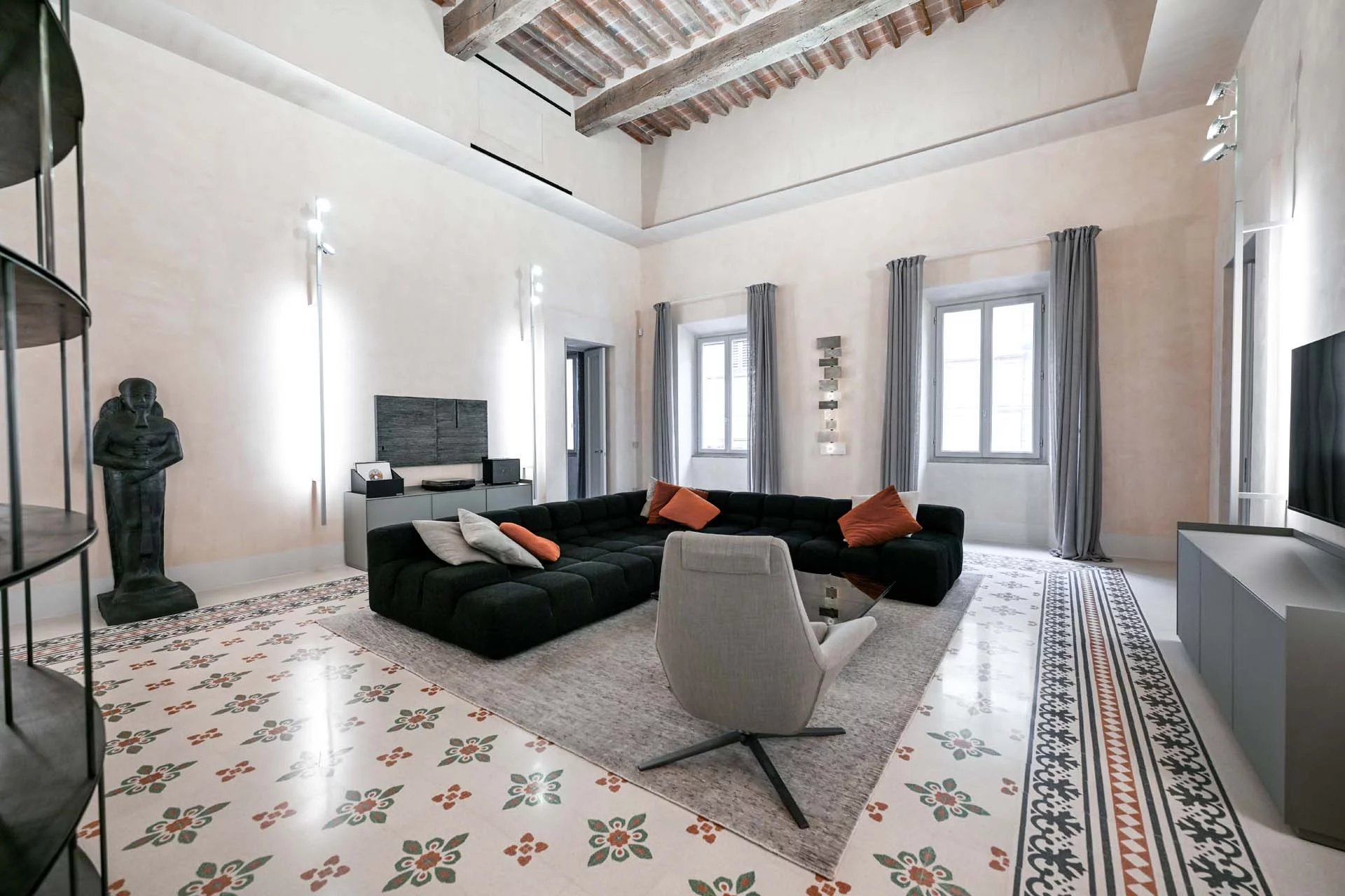 This stunning apartment spans the entire first floor of Palazzo Batignani, what had formerly been the building’s noble apartment. The construction of the building, or rather the complete renovation resulting in the amalgamation of the original medieval structures that gave rise to the palazzo, dates back to the 16th century. The house is part of a condominium (recently established) with five units in total.