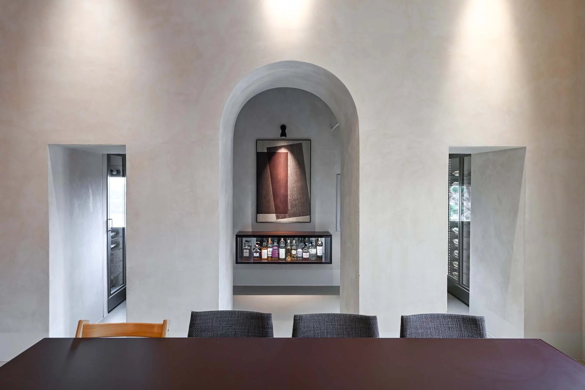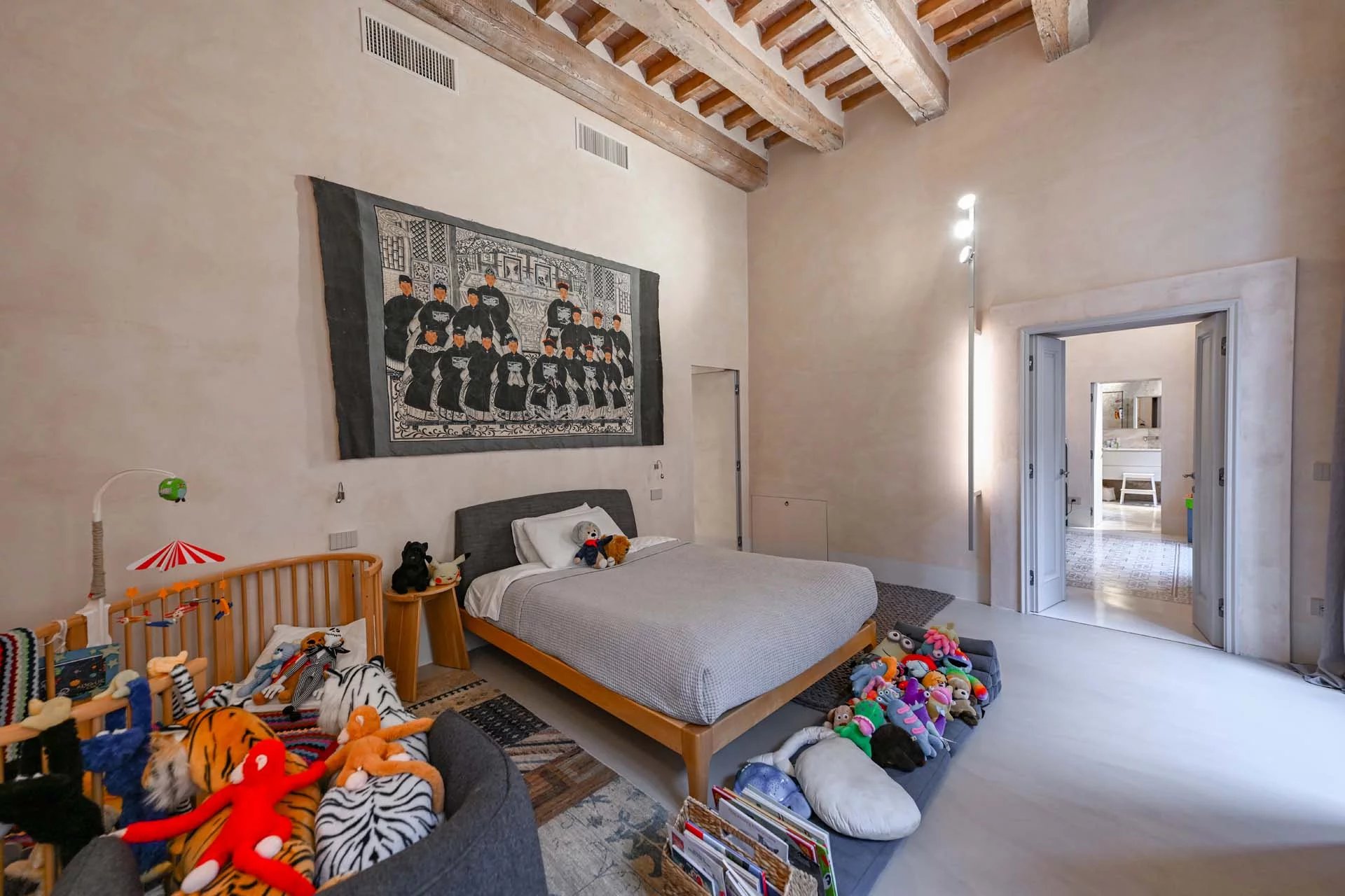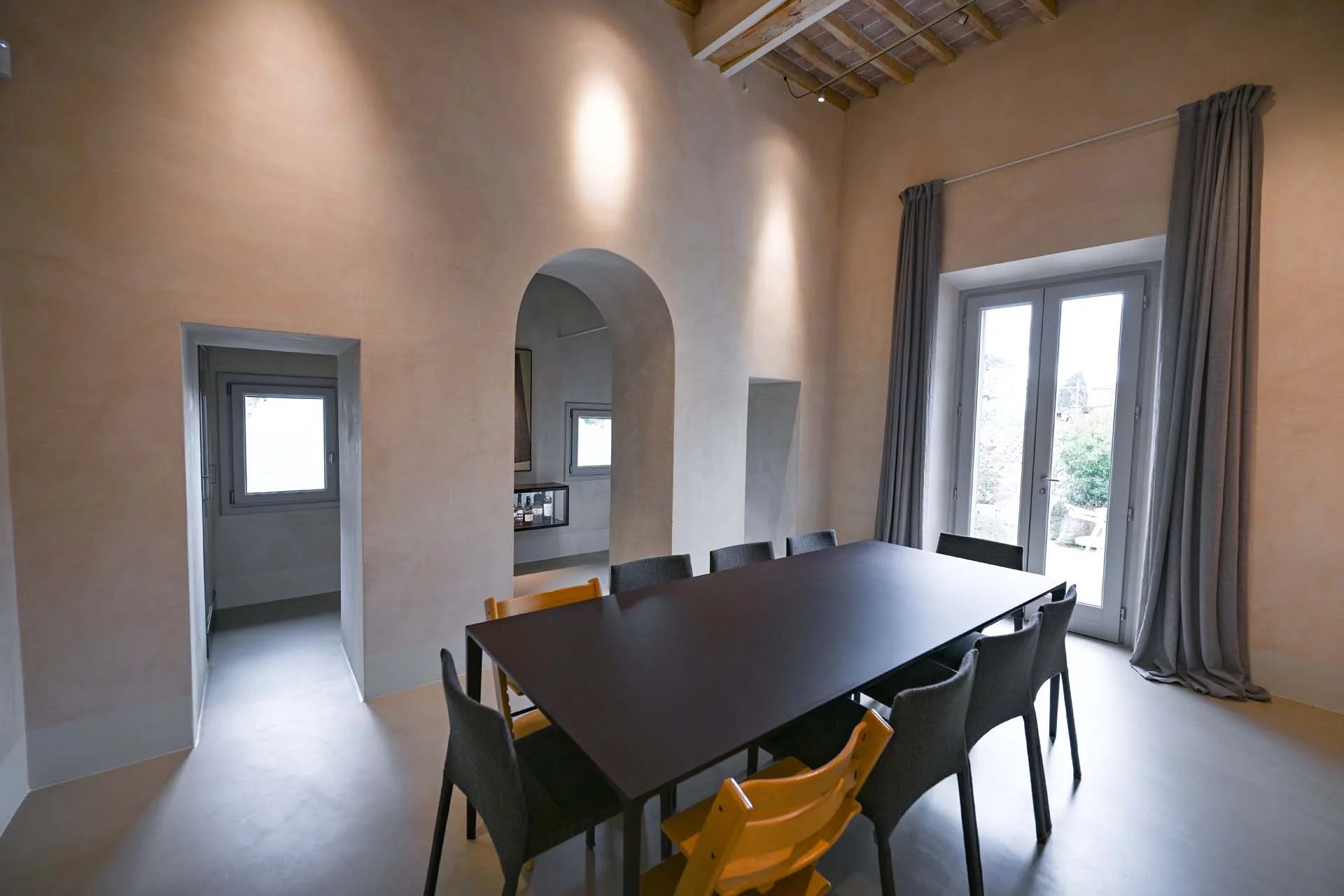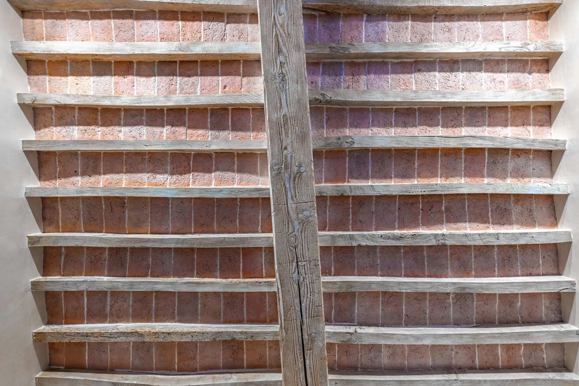 There are no paints of any kind on the walls: plaster and wall surfaces are made of natural lime, thus ensuring a healthy and hypoallergenic environment, thanks to its breathable, bacteriostatic and dust antistatic capacity.