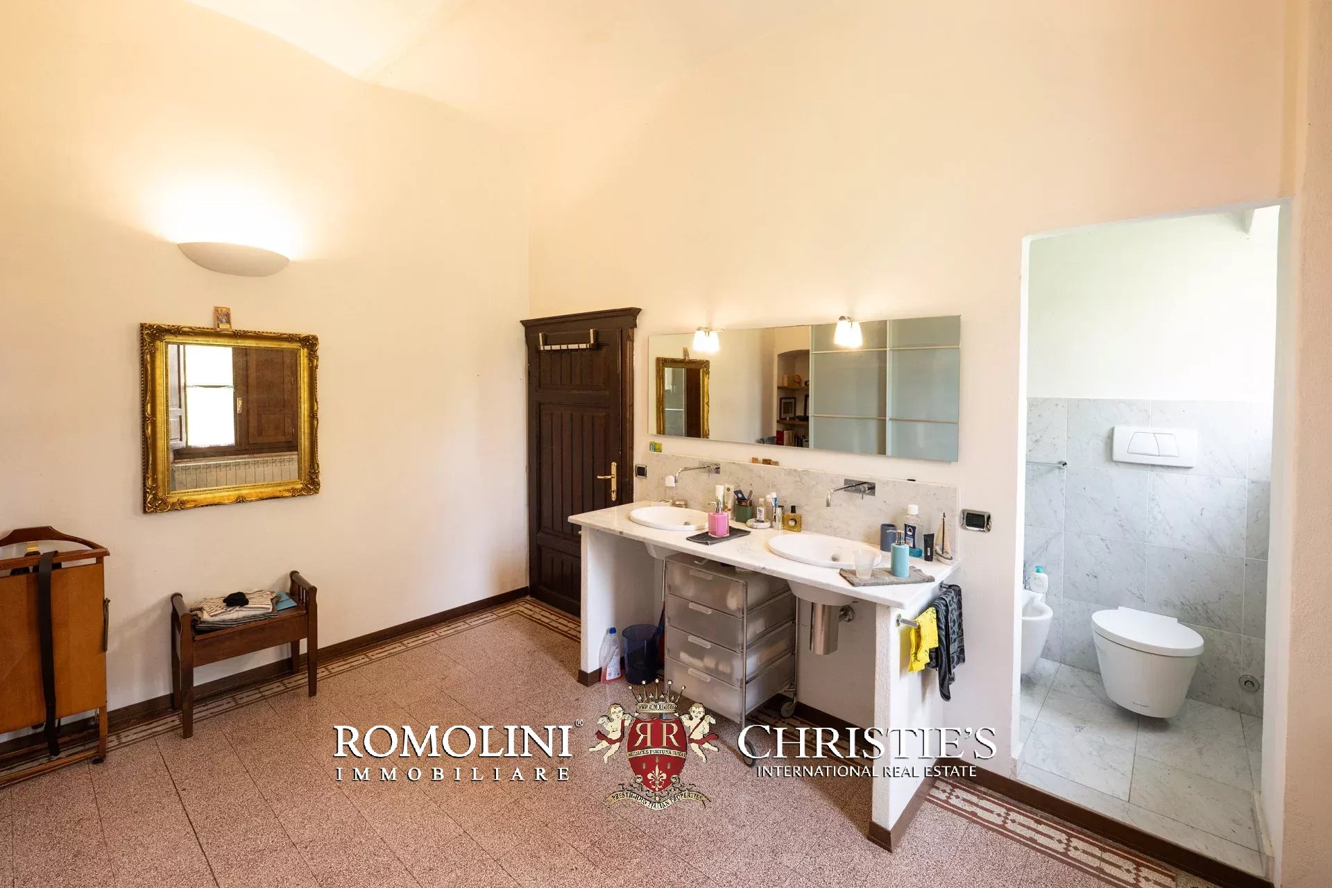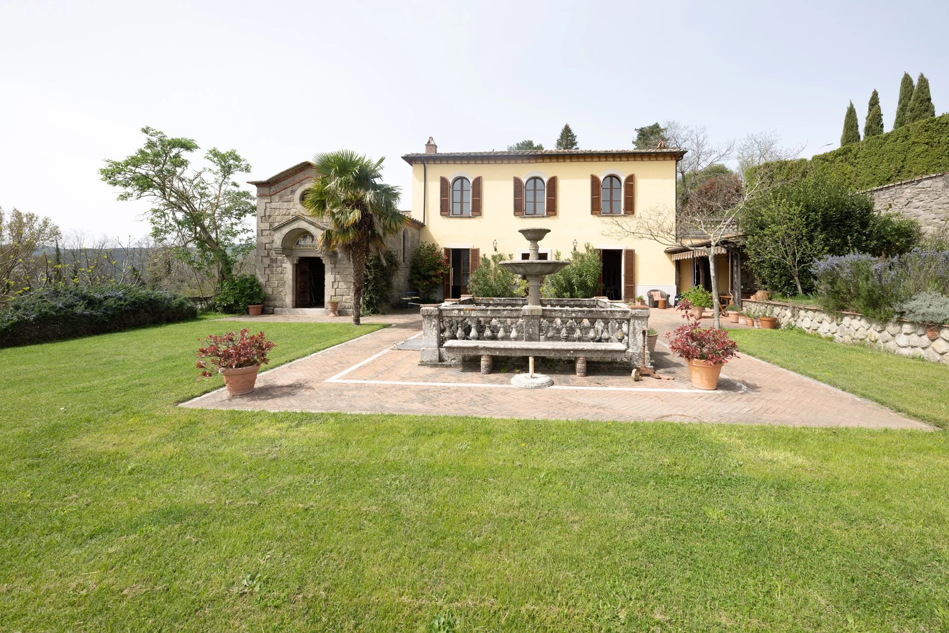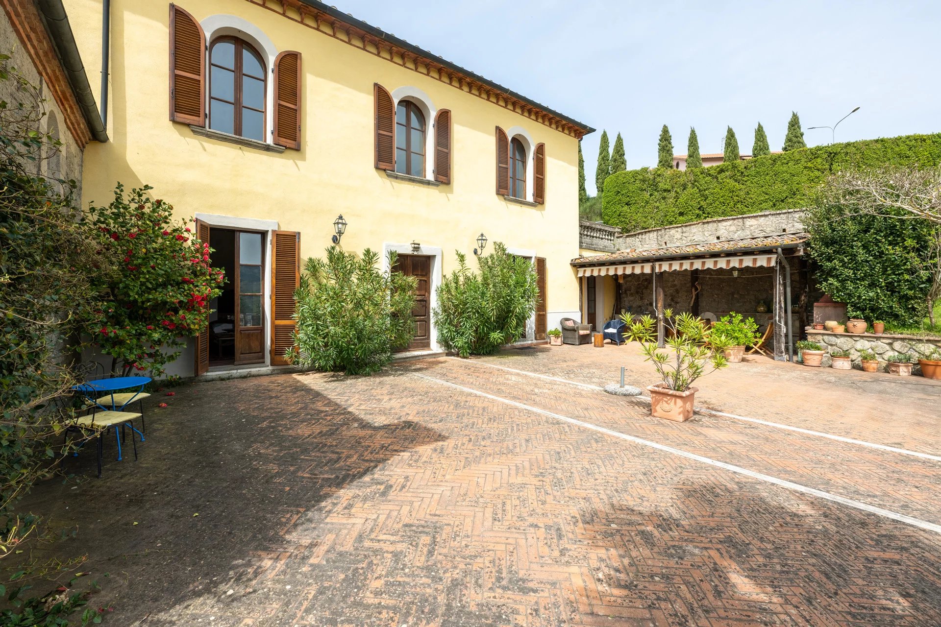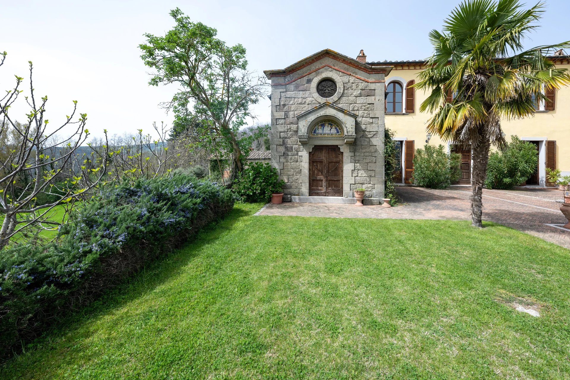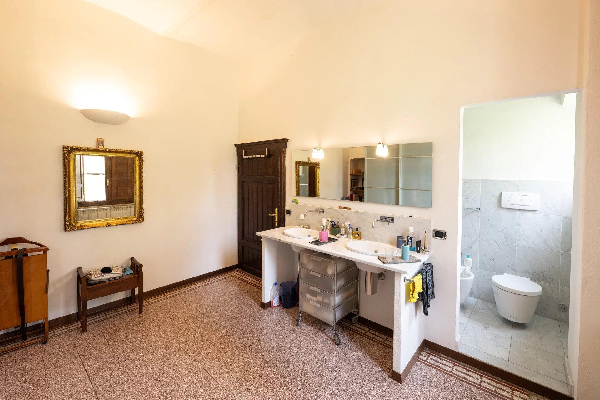 The main villa (450 m² – 4,842 ft², 6 bedrooms and 7 bathrooms), built on the site of an early medieval parish church, is on two levels. On the ground floor there is a large kitchen, living room, office space with courtyard, bathroom, storage room, laundry room and cellar. On the first floor, on the other hand, is the sleeping area with three spacious bedrooms, two of which have terraces, three bathrooms and a private office. The second floor is connected to the ground floor by an internal staircase but also has convenient direct access from the area designated for parking and located on the north side of the building.