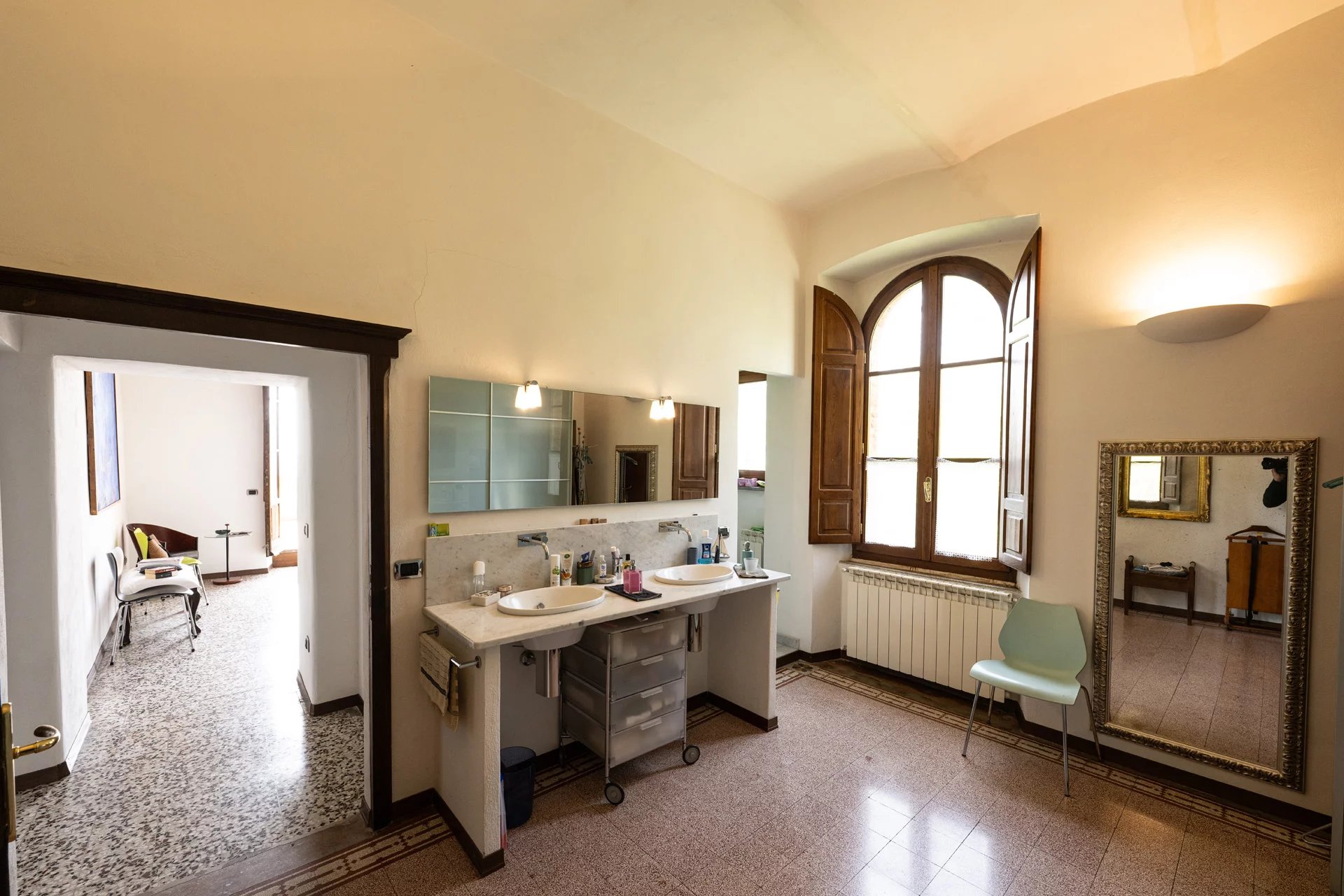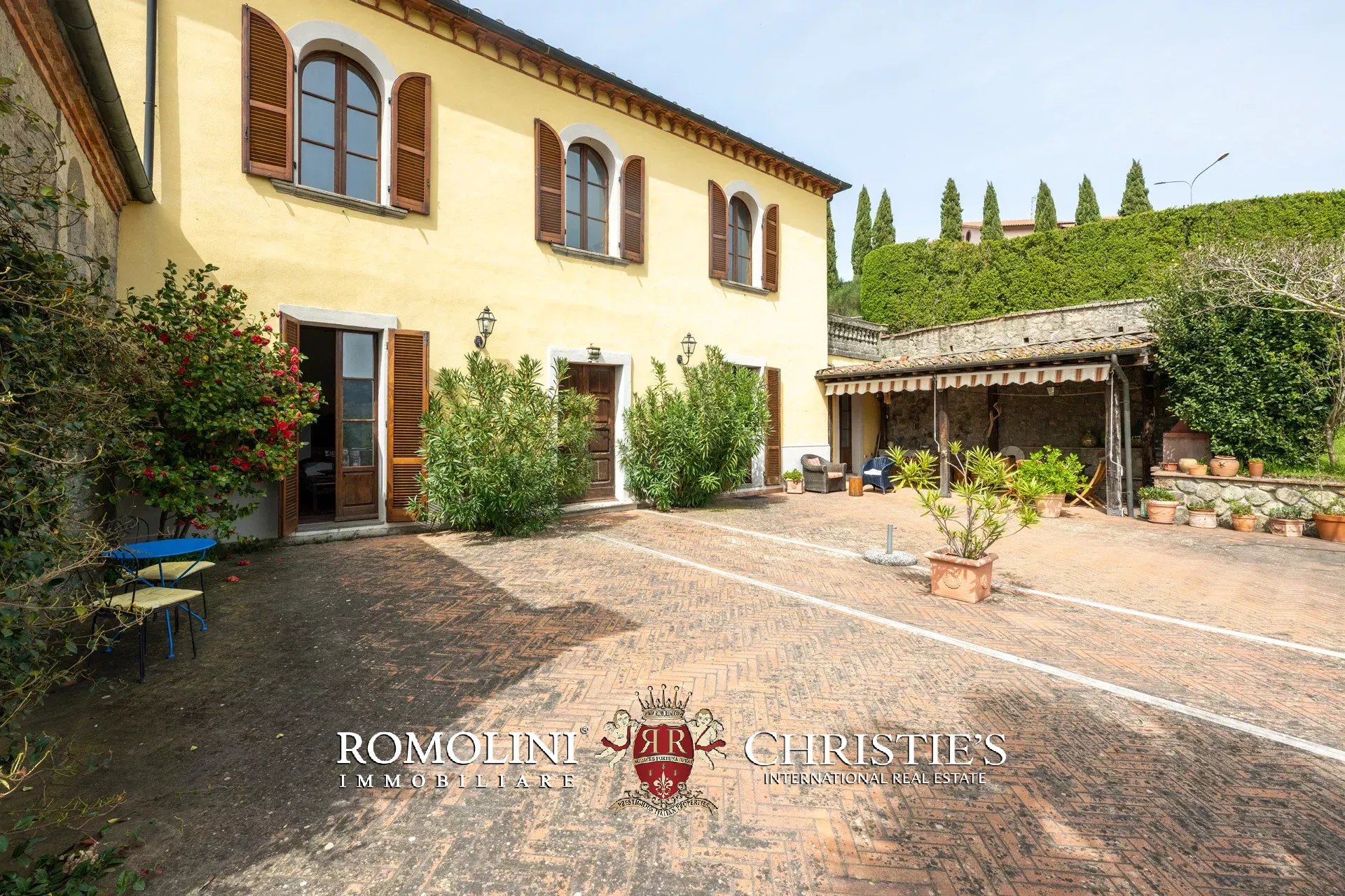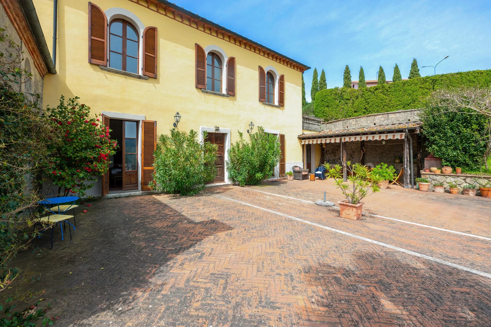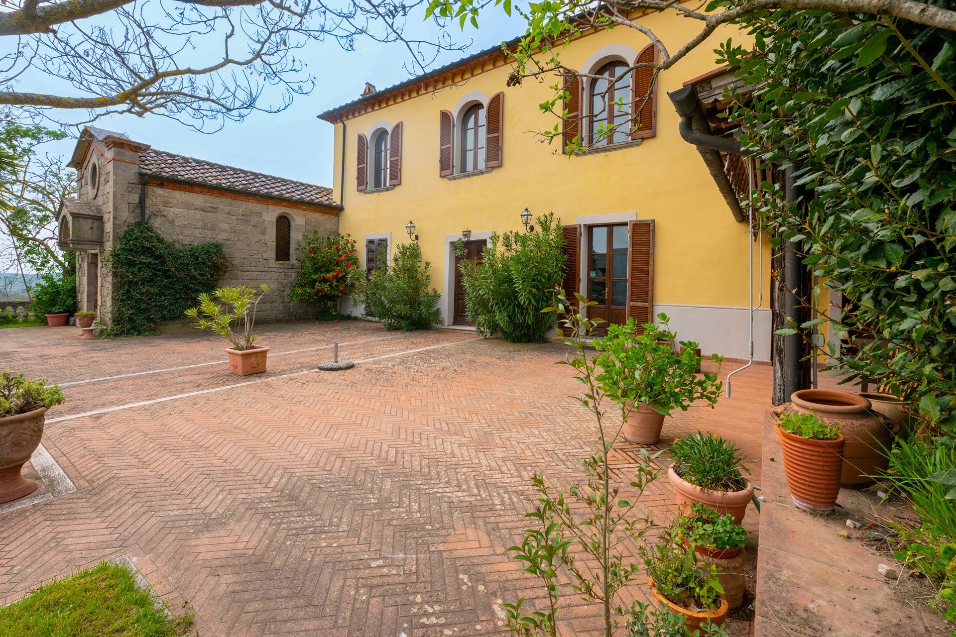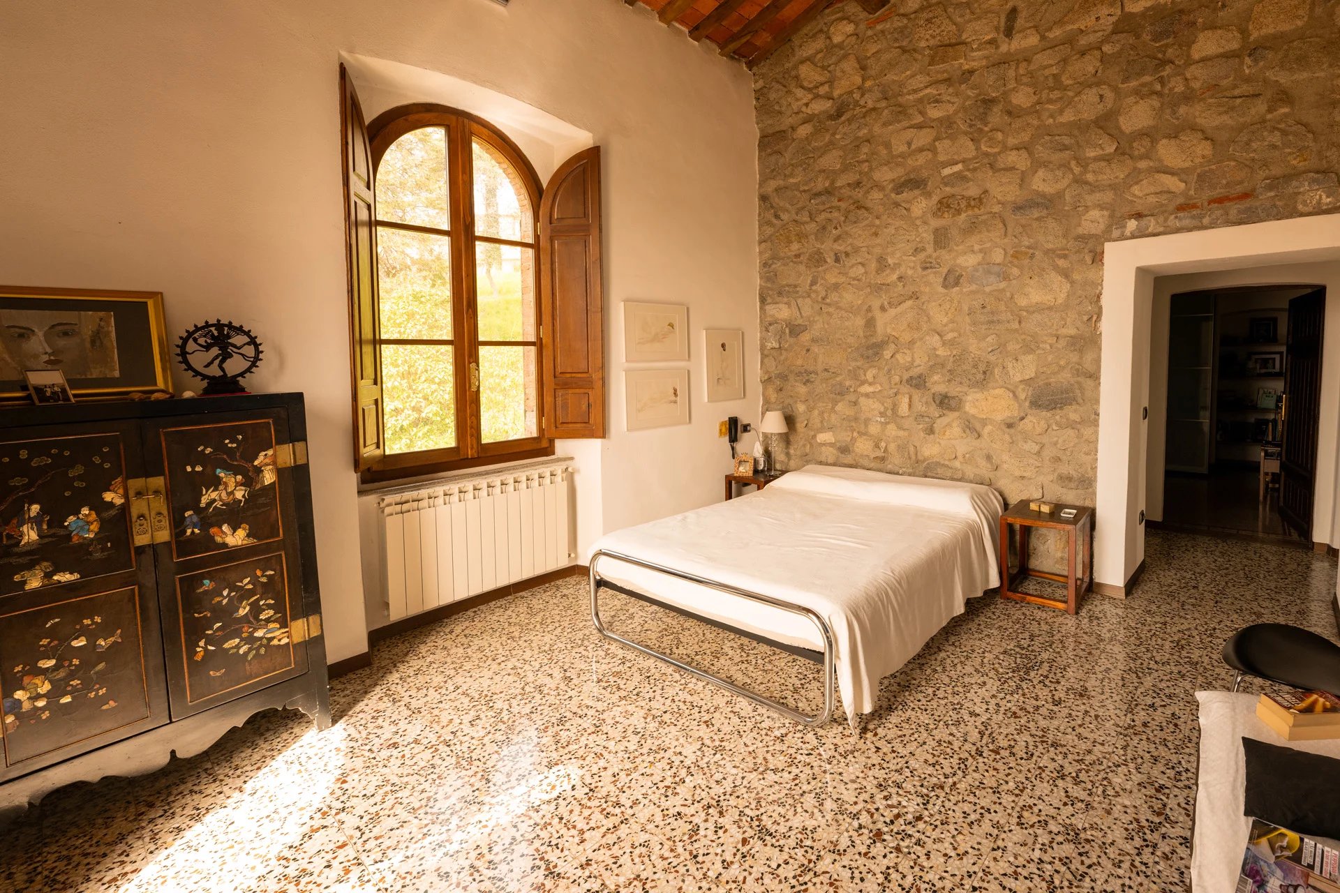 The main villa (450 m² – 4,842 ft², 6 bedrooms and 7 bathrooms), built on the site of an early medieval parish church, is on two levels. On the ground floor there is a large kitchen, living room, office space with courtyard, bathroom, storage room, laundry room and cellar. On the first floor, on the other hand, is the sleeping area with three spacious bedrooms, two of which have terraces, three bathrooms and a private office. The second floor is connected to the ground floor by an internal staircase but also has convenient direct access from the area designated for parking and located on the north side of the building.