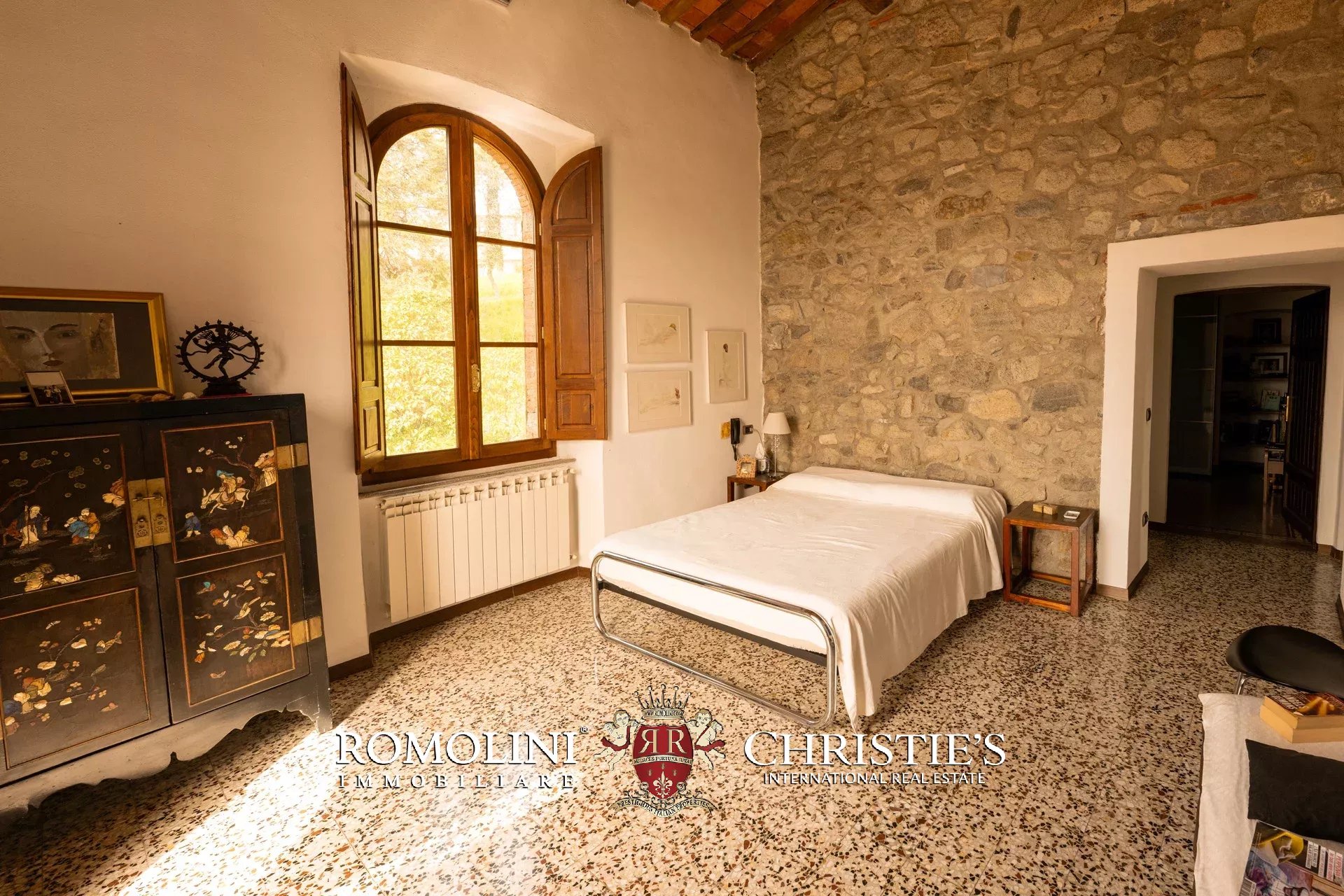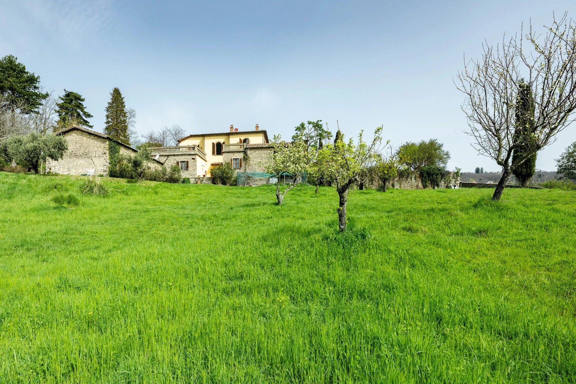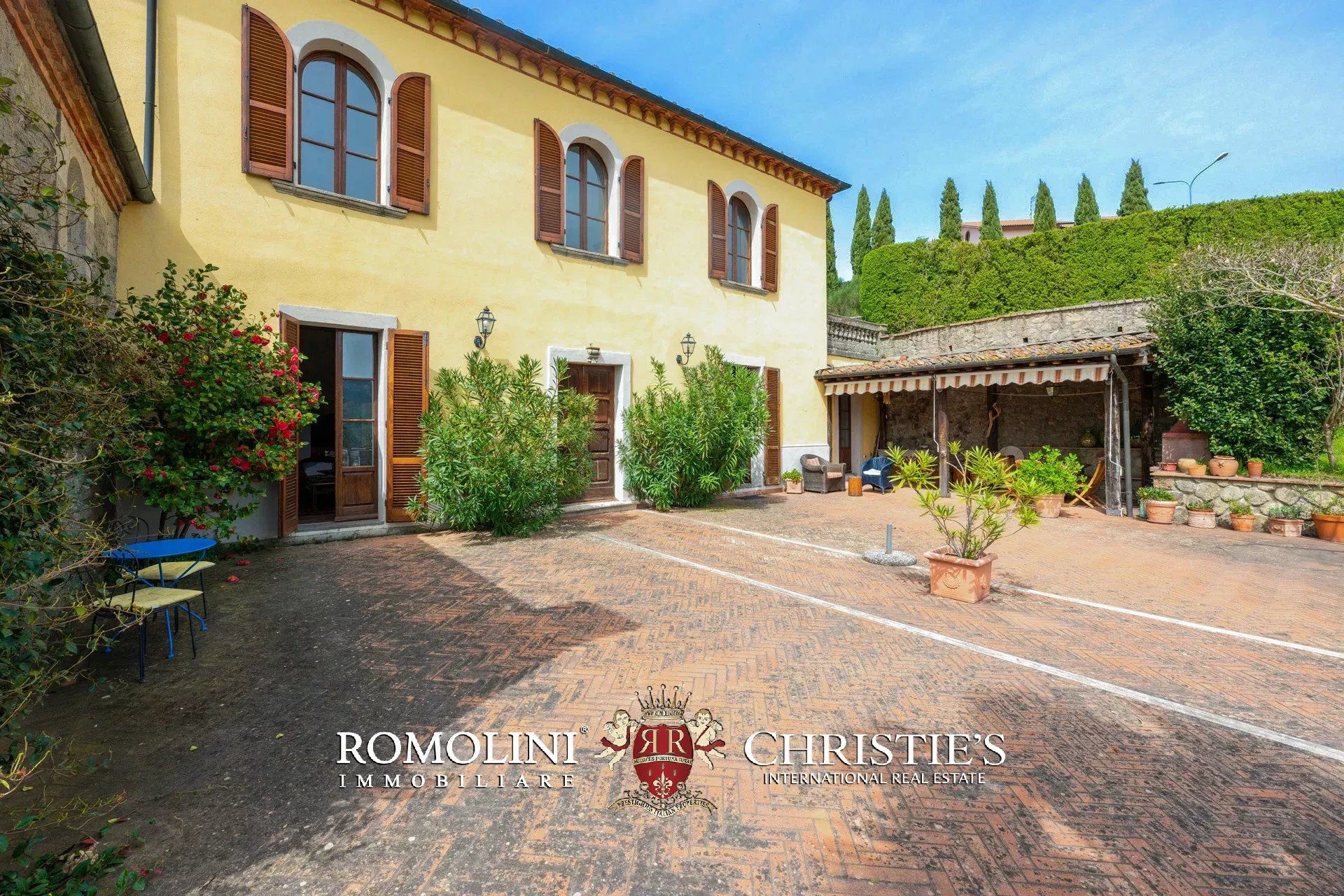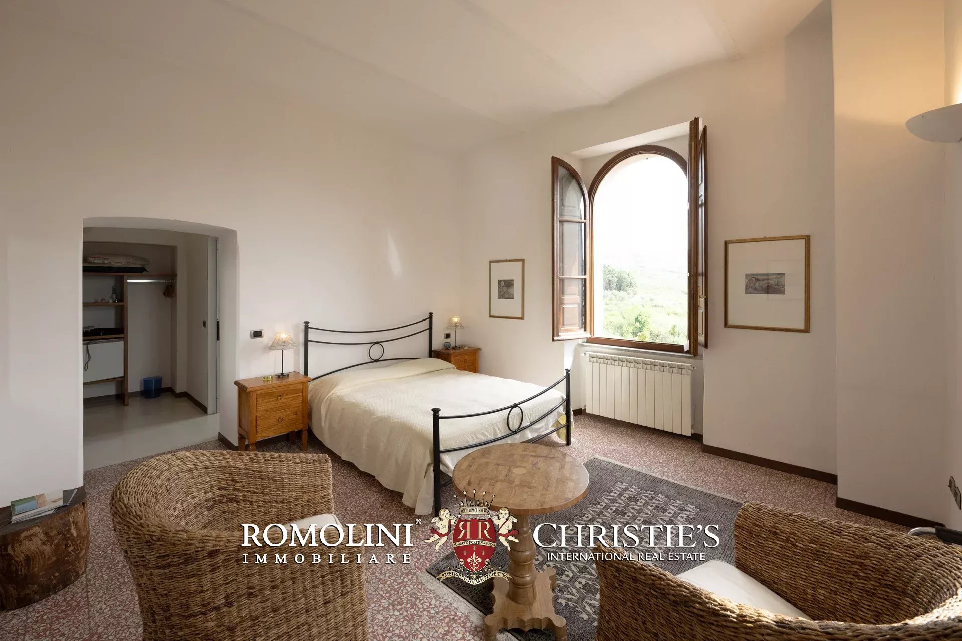 The main villa (450 m² – 4,842 ft², 6 bedrooms and 7 bathrooms), built on the site of an early medieval parish church, is on two levels. On the ground floor there is a large kitchen, living room, office space with courtyard, bathroom, storage room, laundry room and cellar. On the first floor, on the other hand, is the sleeping area with three spacious bedrooms, two of which have terraces, three bathrooms and a private office. The second floor is connected to the ground floor by an internal staircase but also has convenient direct access from the area designated for parking and located on the north side of the building.