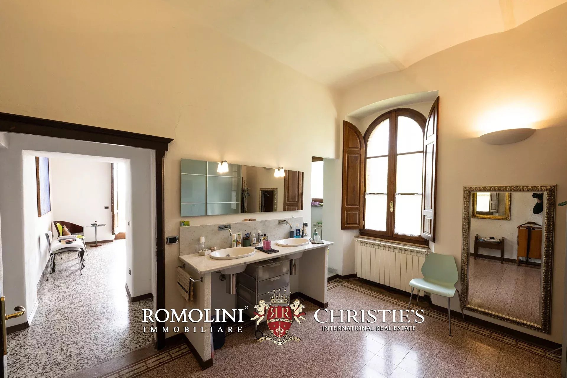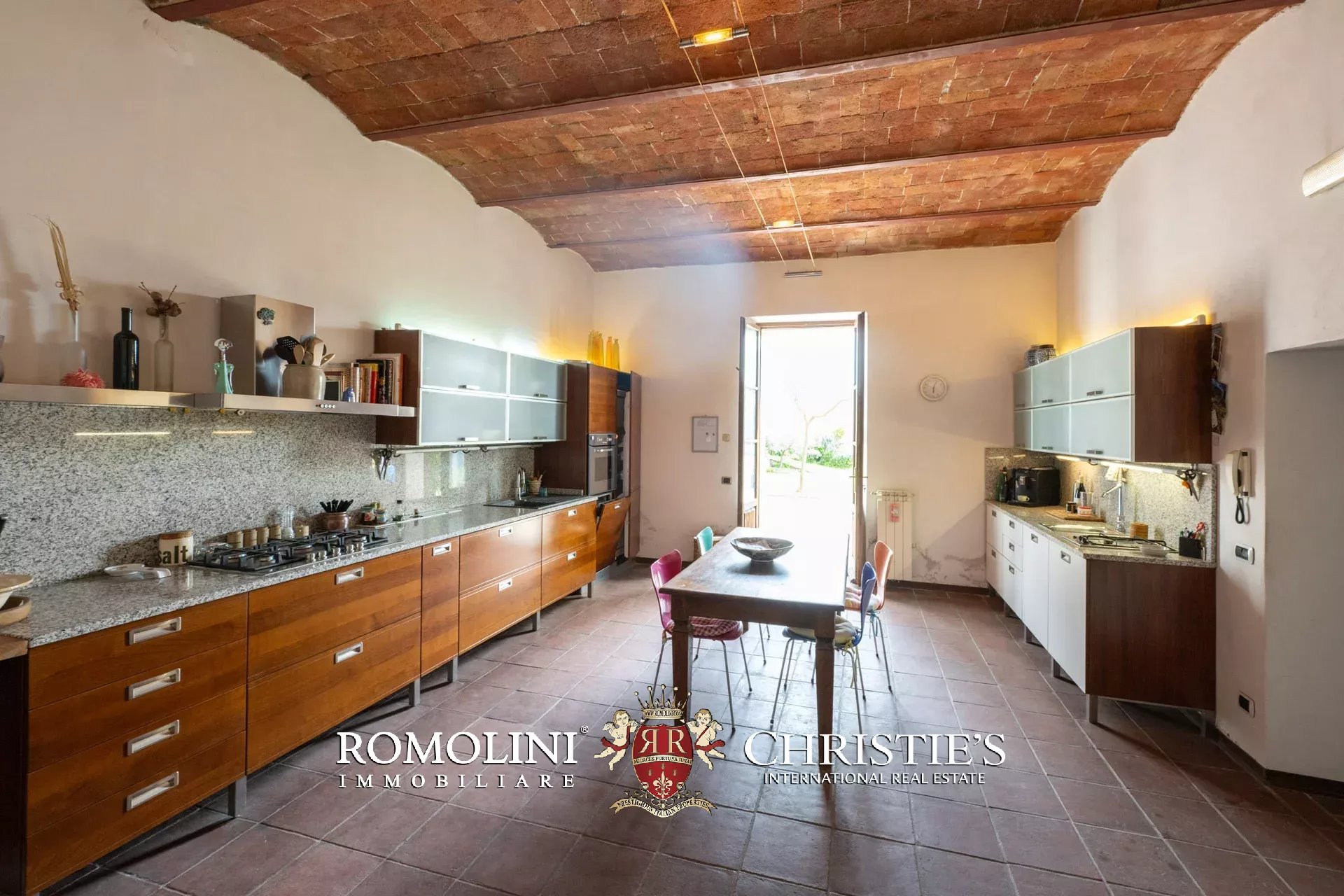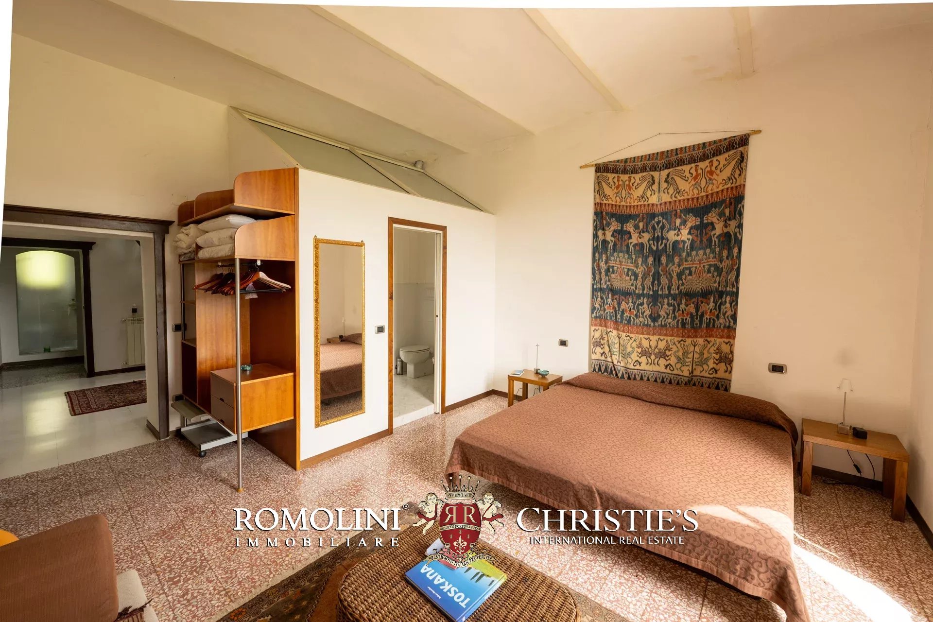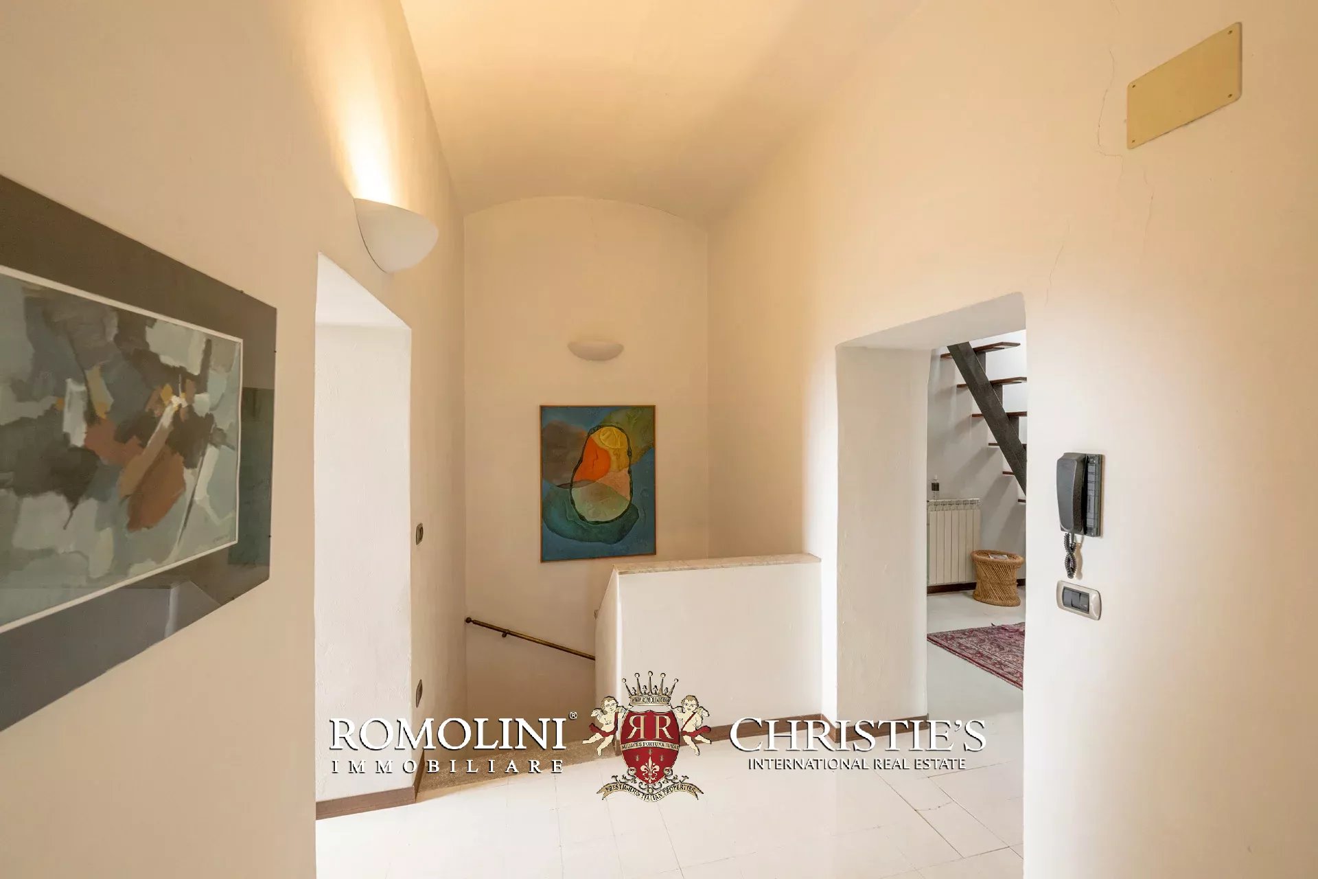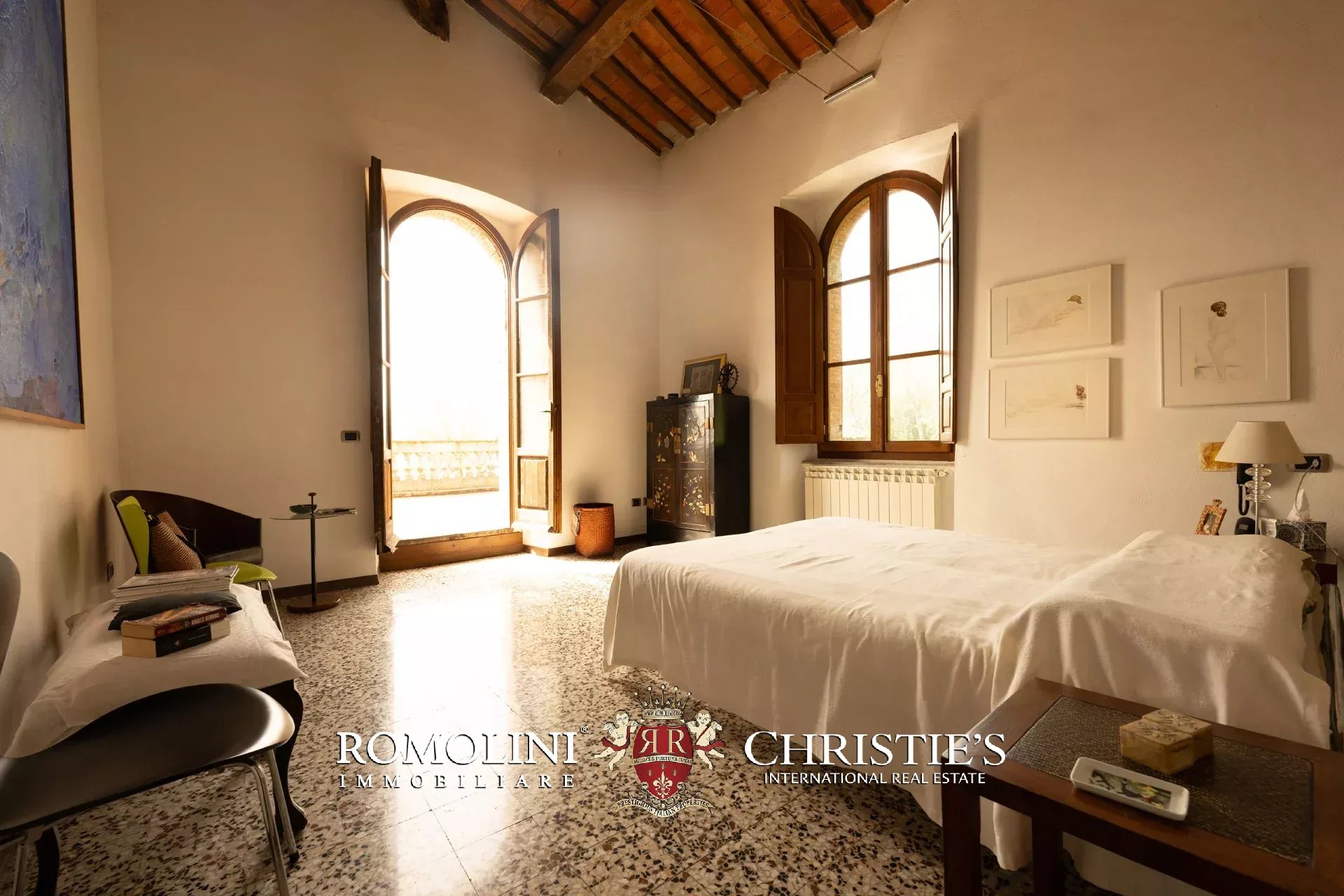 The main villa (450 m² – 4,842 ft², 6 bedrooms and 7 bathrooms), built on the site of an early medieval parish church, is on two levels. On the ground floor there is a large kitchen, living room, office space with courtyard, bathroom, storage room, laundry room and cellar. On the first floor, on the other hand, is the sleeping area with three spacious bedrooms, two of which have terraces, three bathrooms and a private office. The second floor is connected to the ground floor by an internal staircase but also has convenient direct access from the area designated for parking and located on the north side of the building.