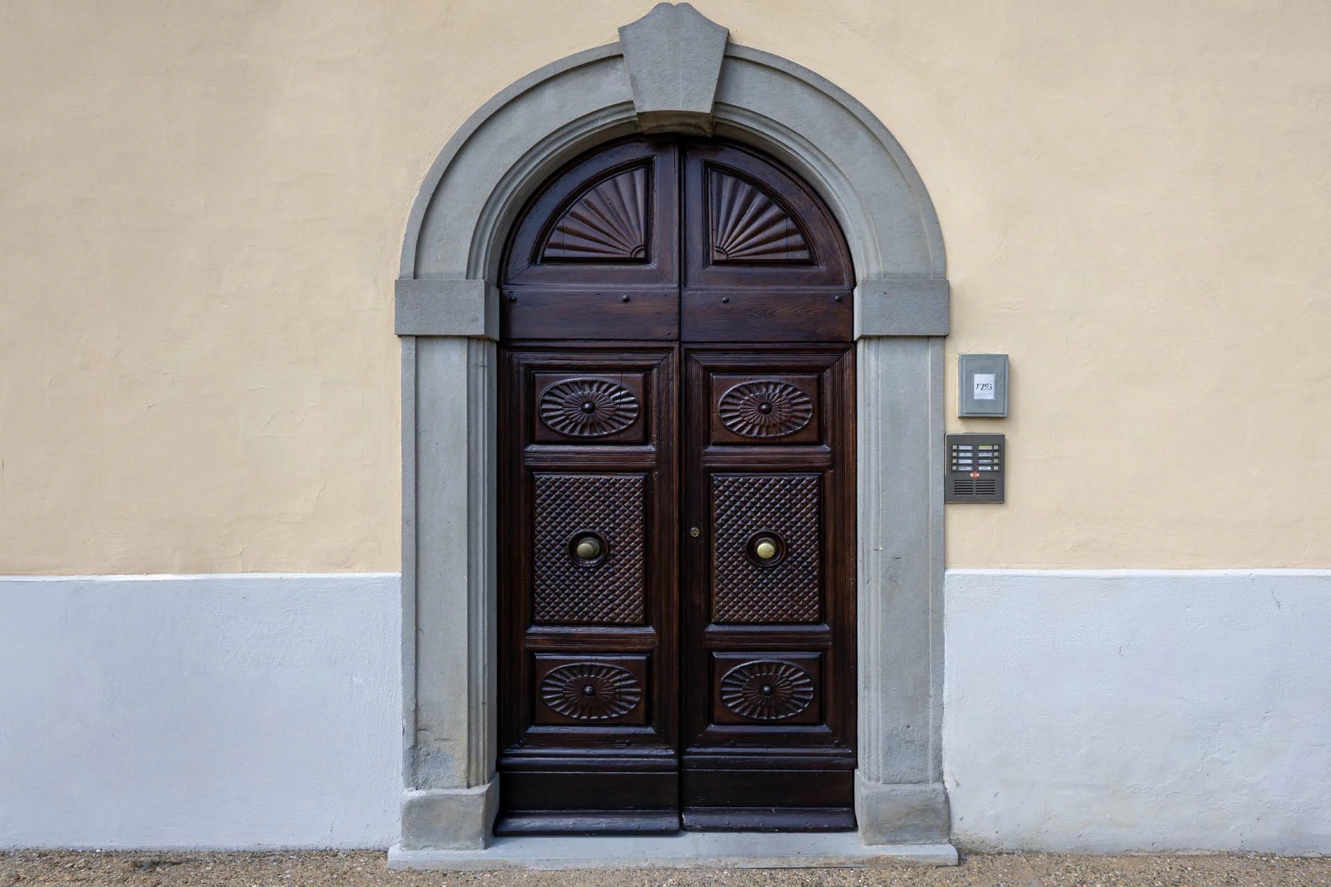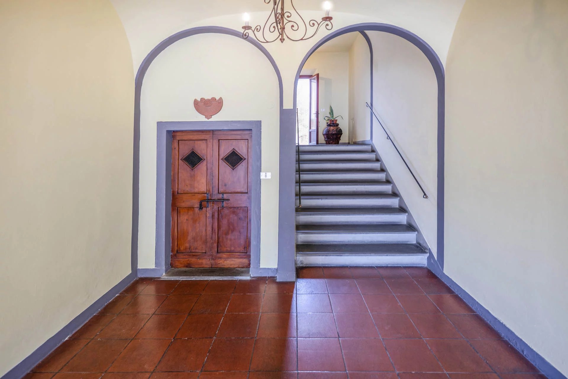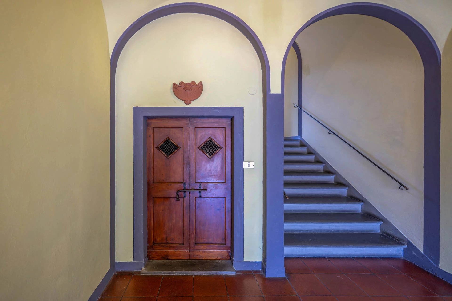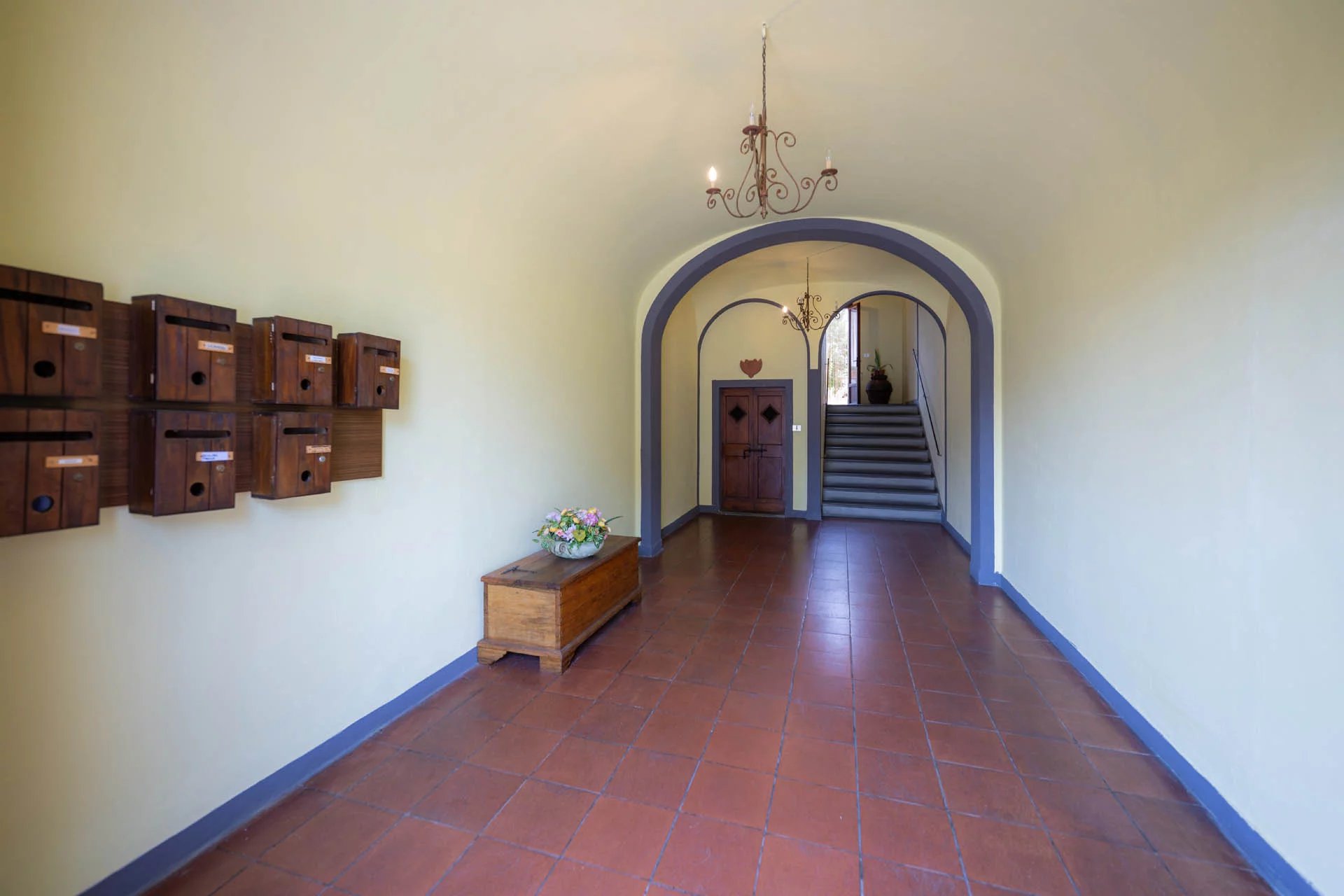 Durch die verzierte Holztür gelangen Sie in den gemeinsamen Eingangsbereich, wo sich im Erdgeschoss der eigene Keller (5 m²) befindet, der sich ideal als praktischer Abstellraum eignet. Über eine breite Steintreppe gelangen Sie zum Eingang der Wohnung.