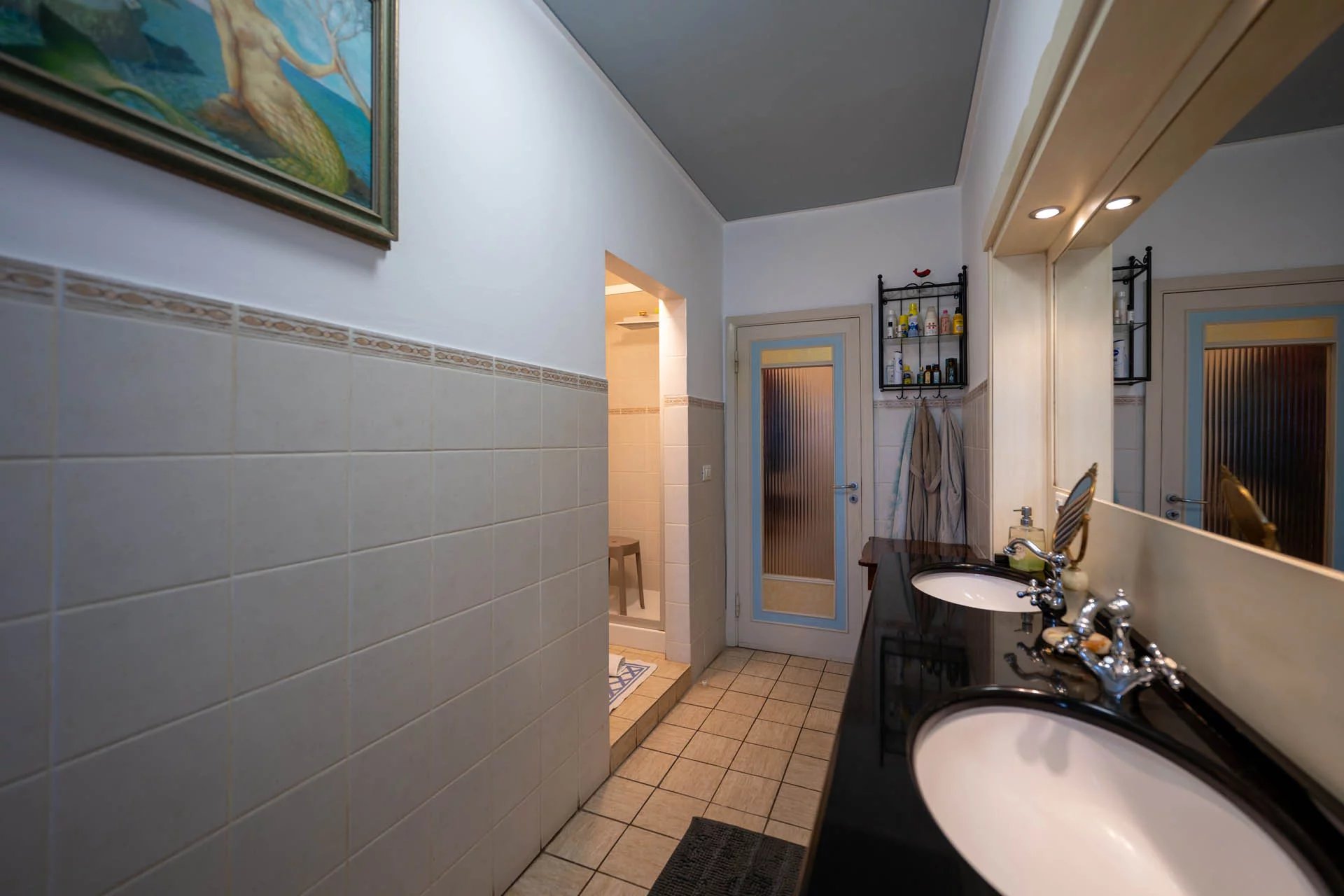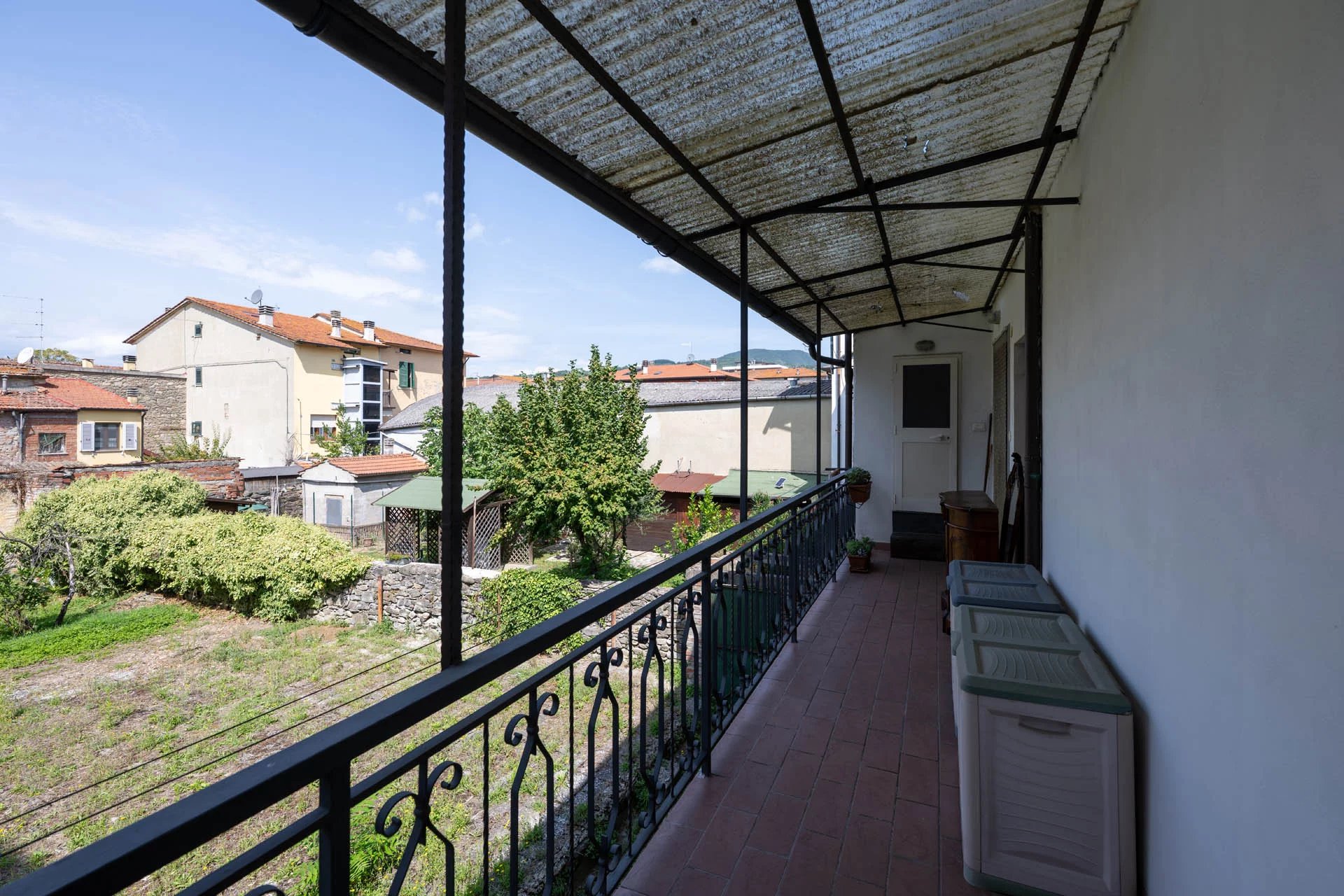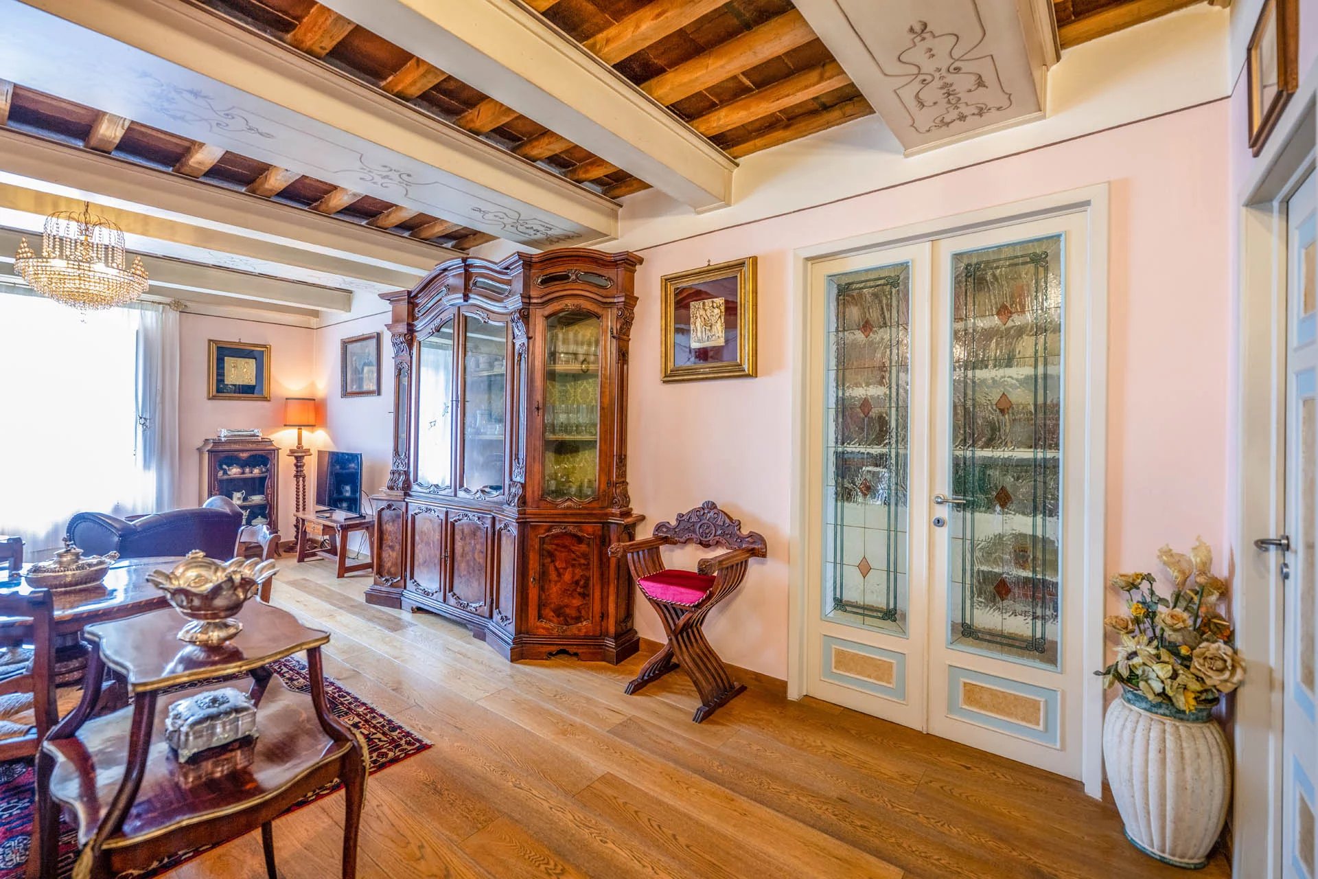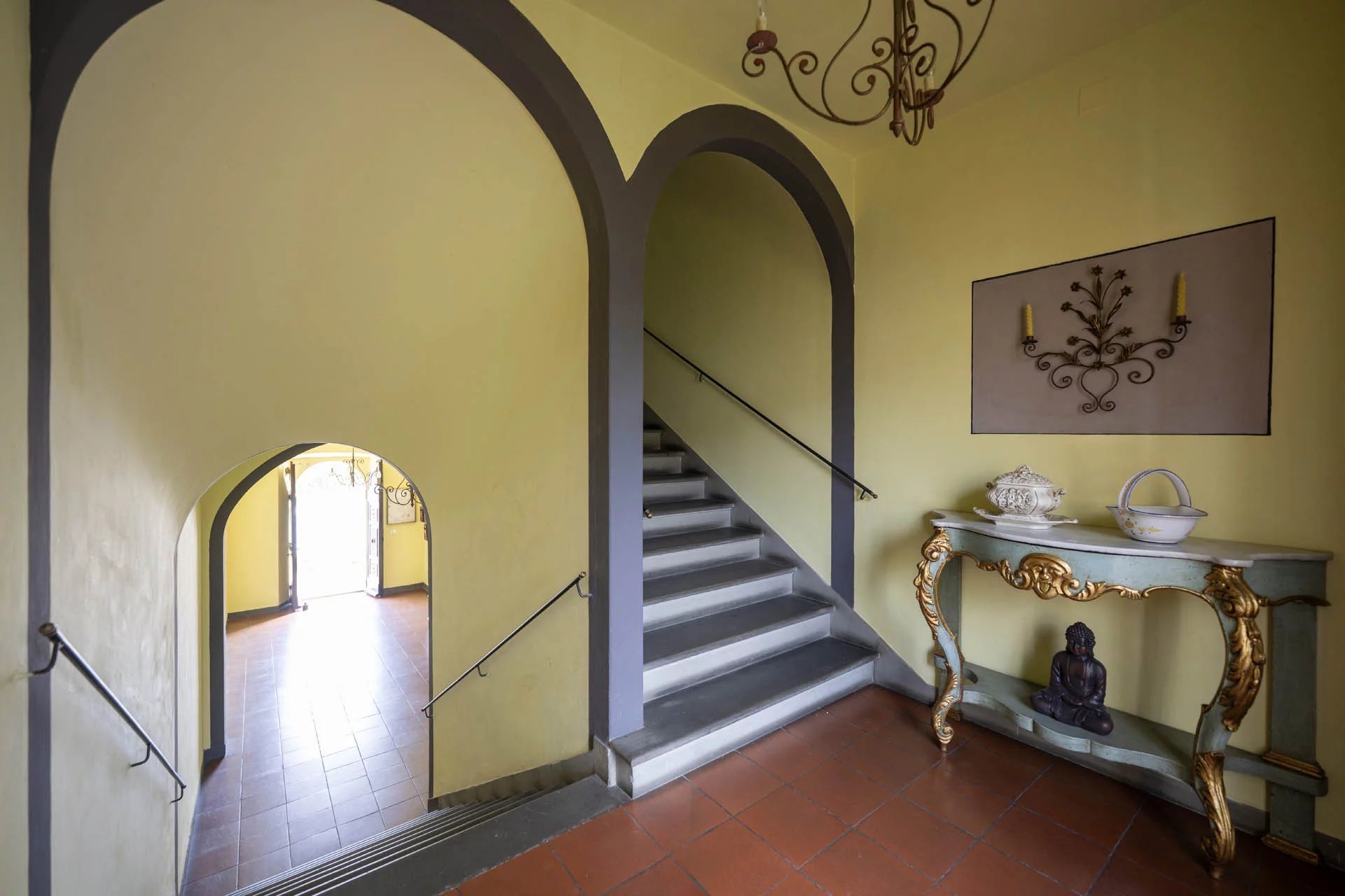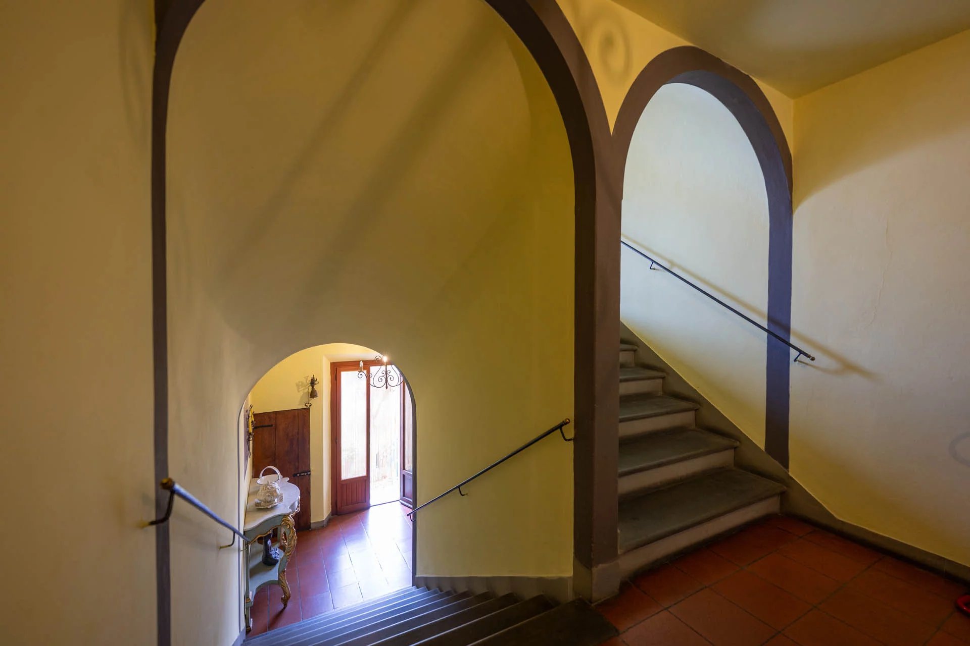 Durch die verzierte Holztür gelangen Sie in den gemeinsamen Eingangsbereich, wo sich im Erdgeschoss der eigene Keller (5 m²) befindet, der sich ideal als praktischer Abstellraum eignet. Über eine breite Steintreppe gelangen Sie zum Eingang der Wohnung.