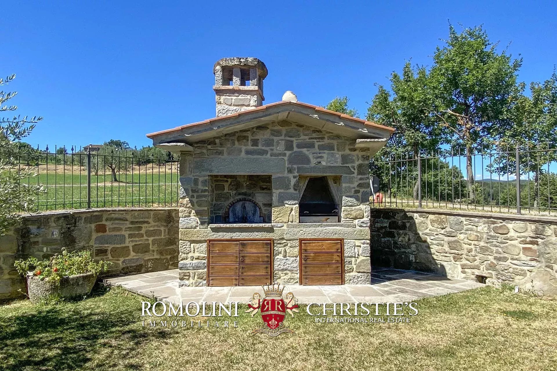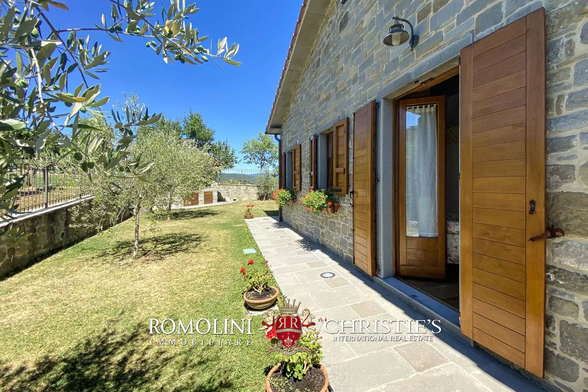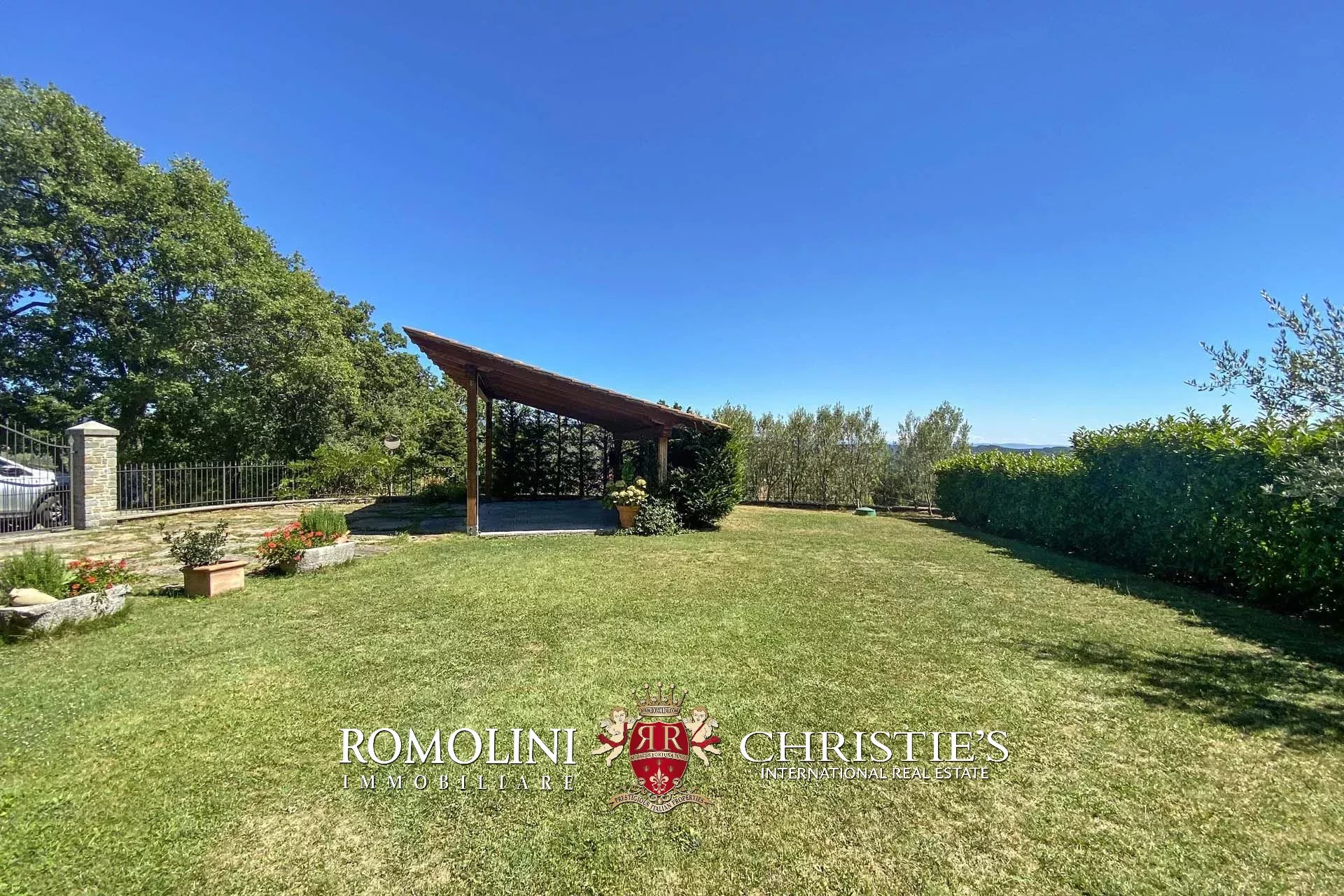Das Anwesen ist von einem eingezäunten Garten mit Steinmauer und automatischem Tor umgeben.