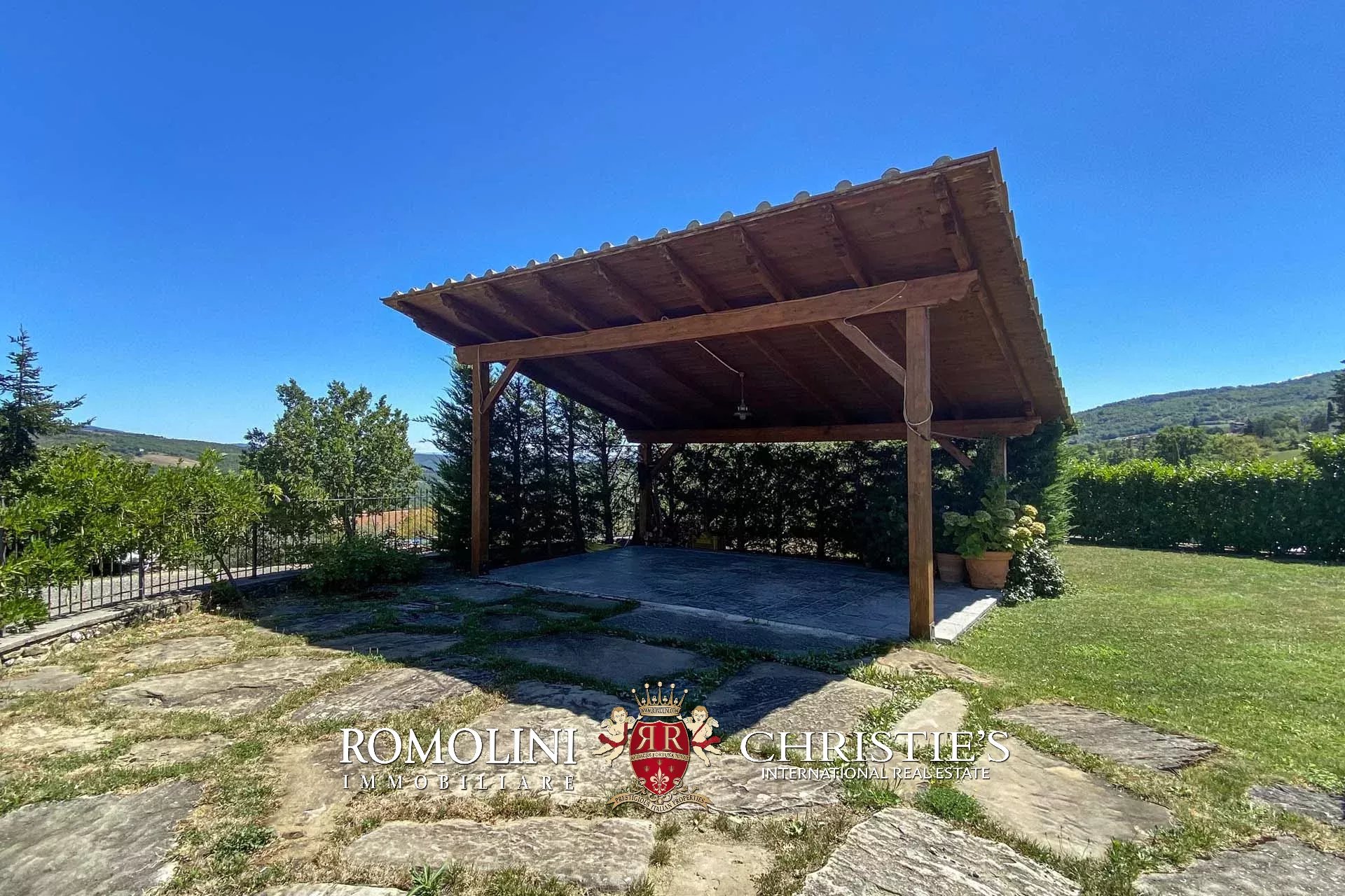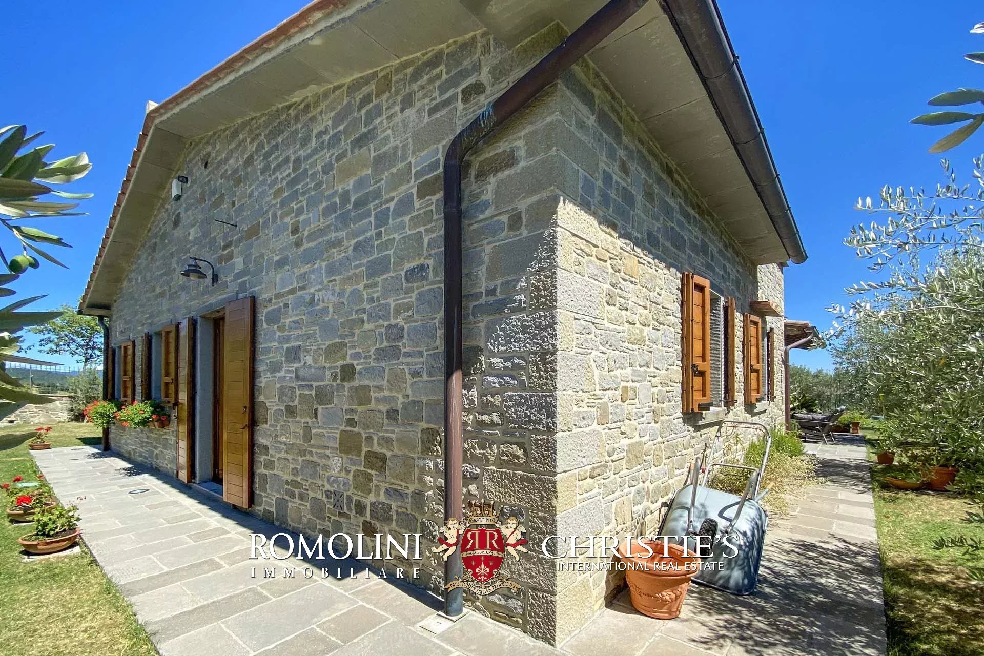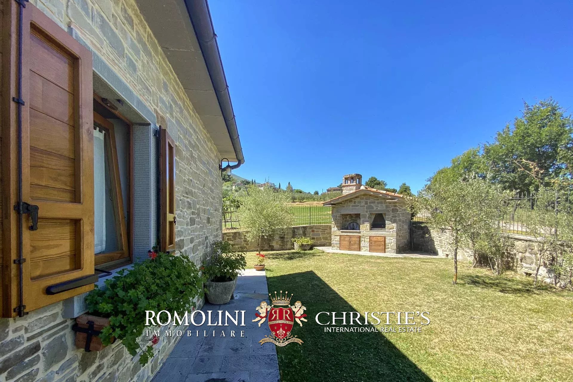 Das Anwesen ist von einem eingezäunten Garten mit Steinmauer und automatischem Tor umgeben.