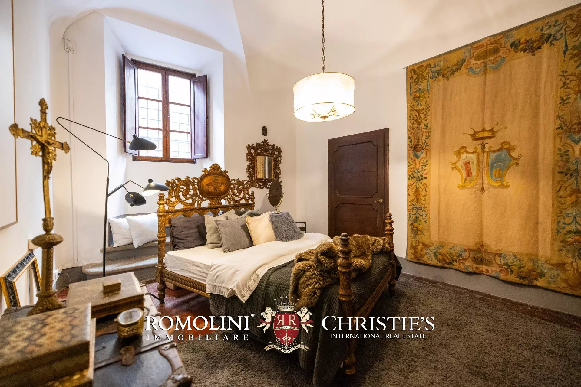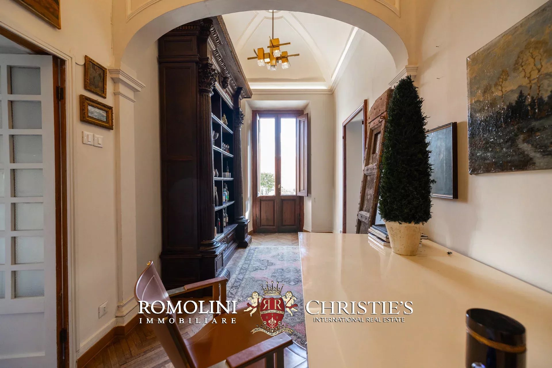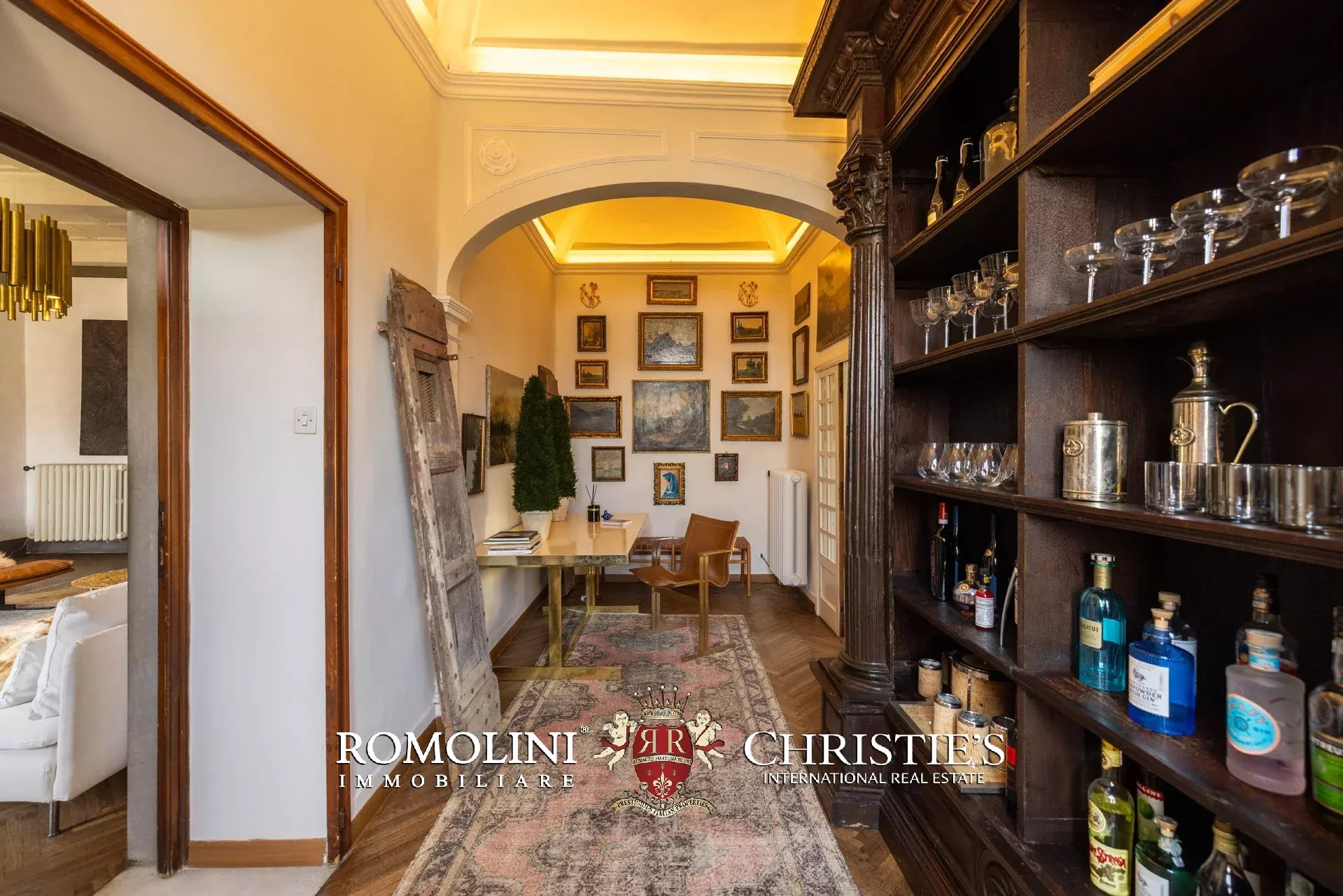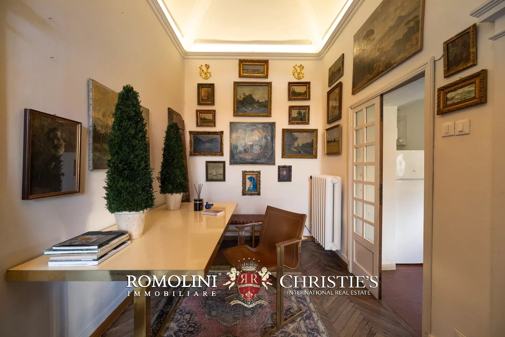 Angrenzend an das Wohnzimmer befindet sich ein privates Arbeitszimmer, ursprünglich eine kleine Kapelle, das heute in einen eleganten Arbeitsbereich umgewandelt wurde und auch über eine komfortable Küche verfügt.