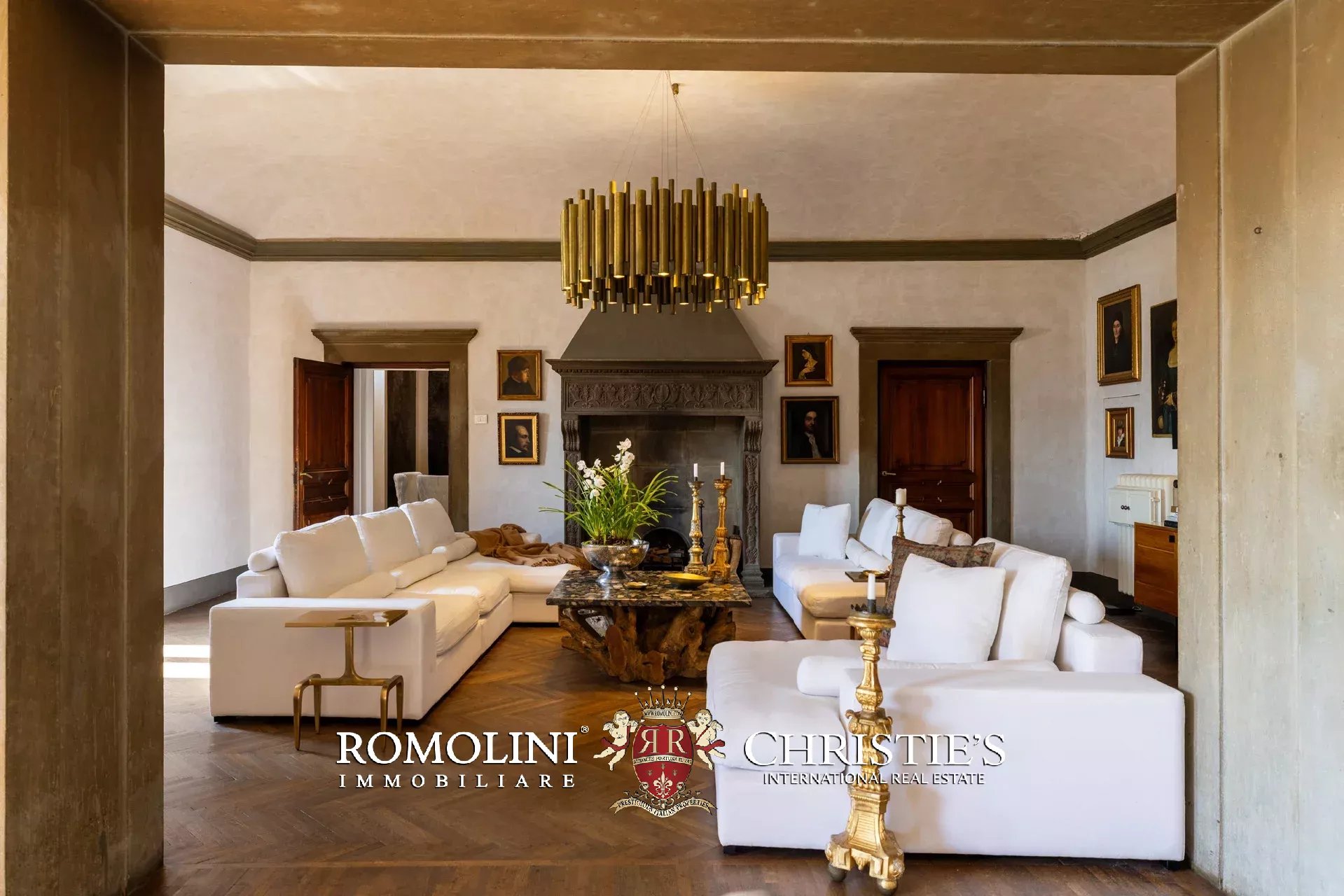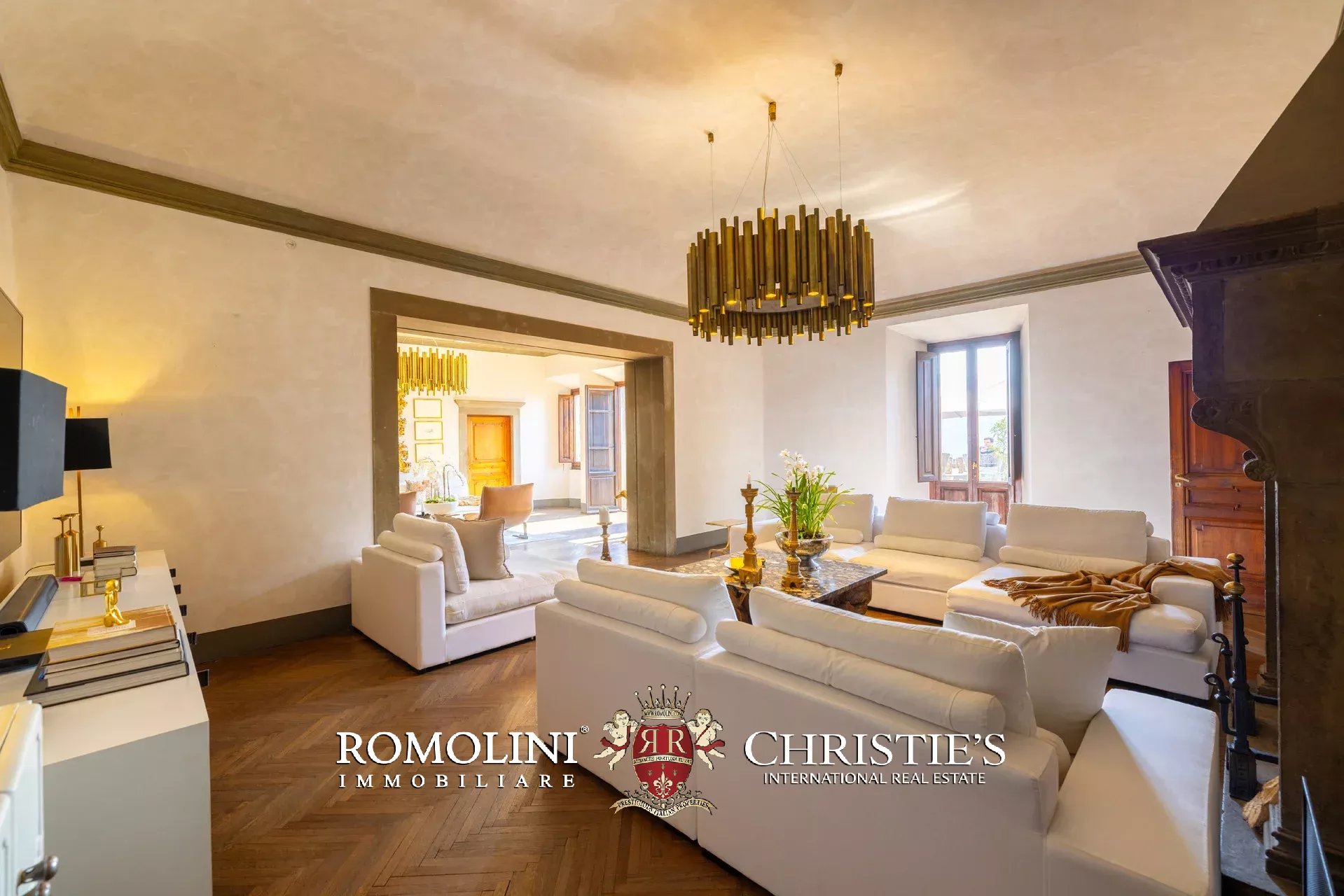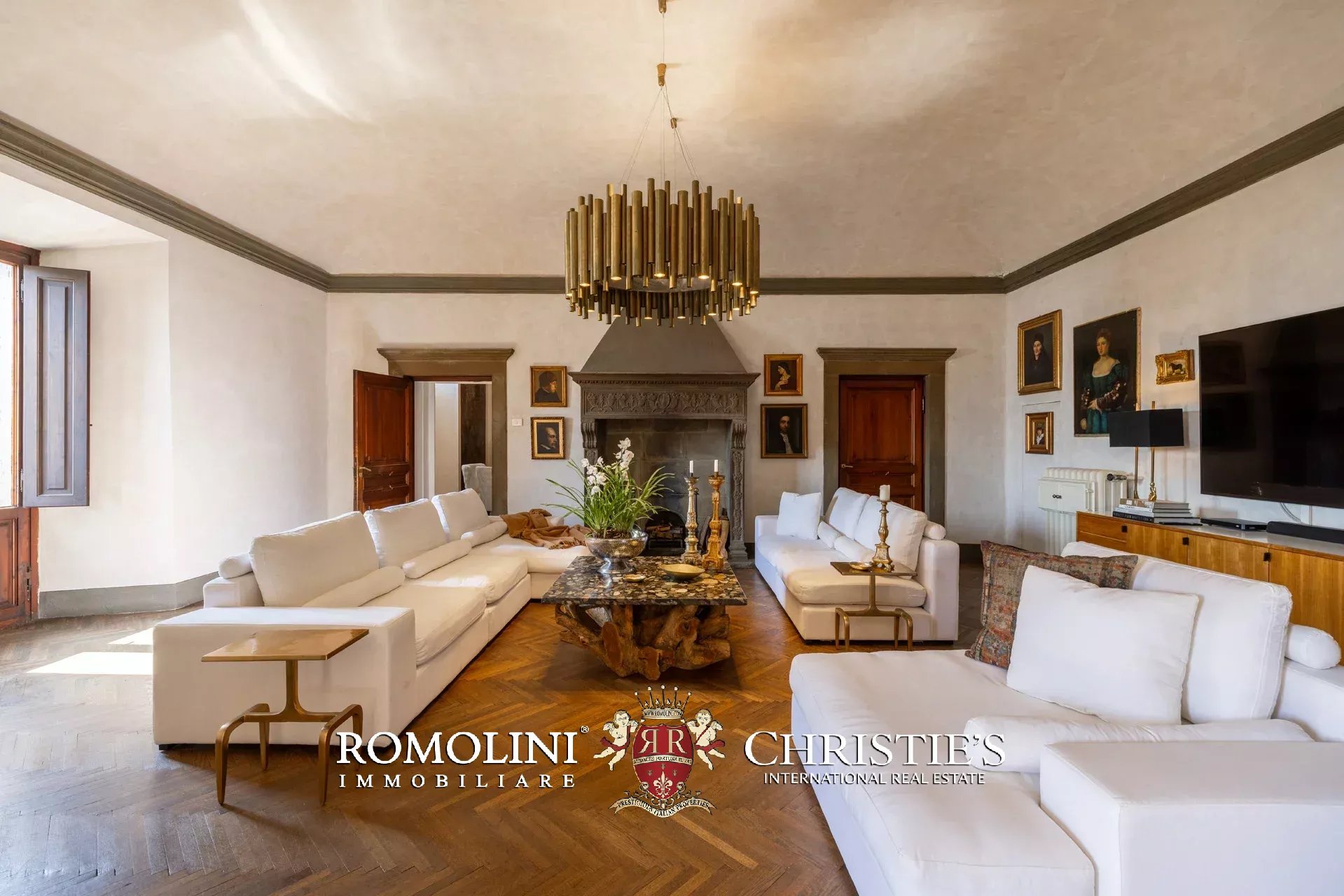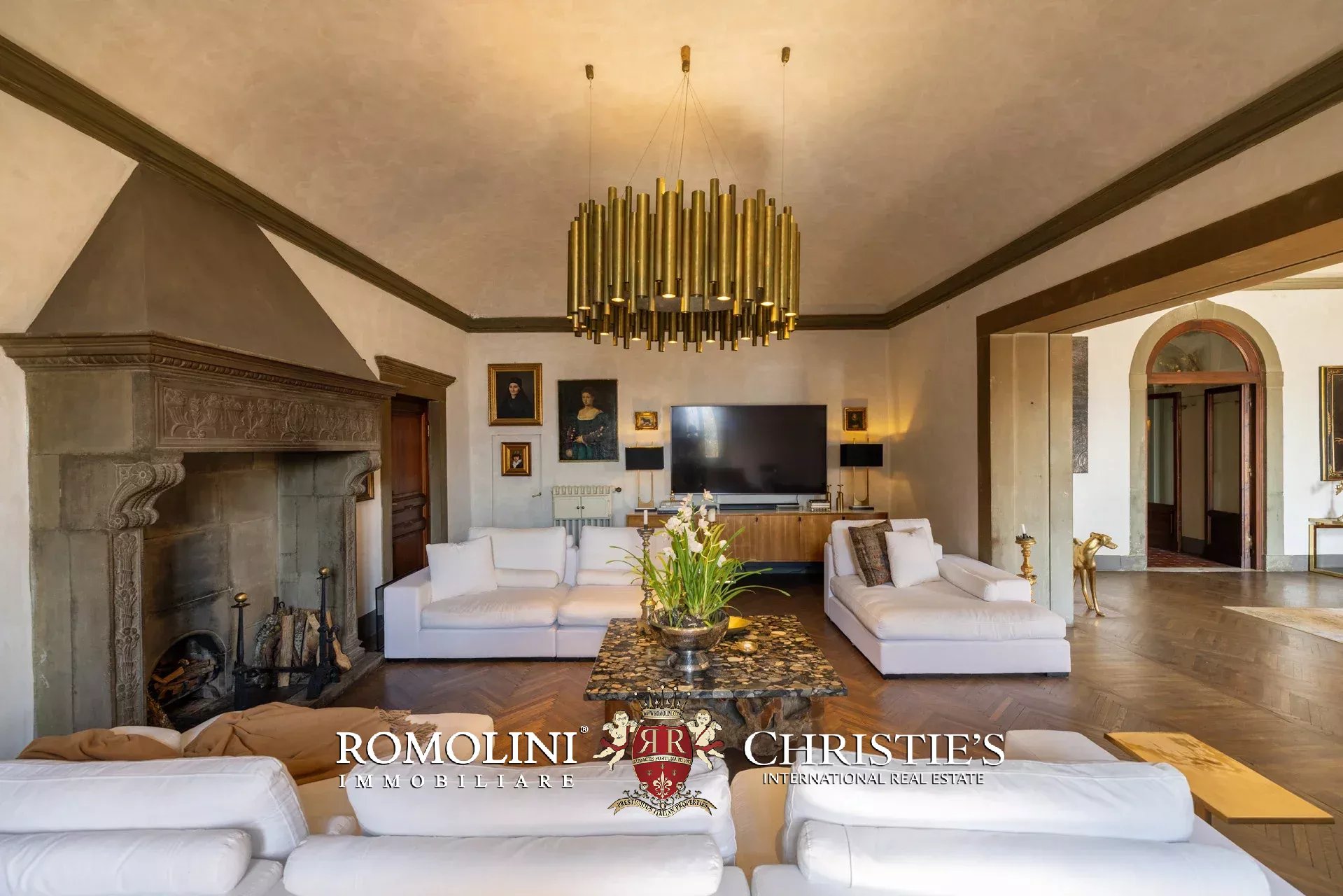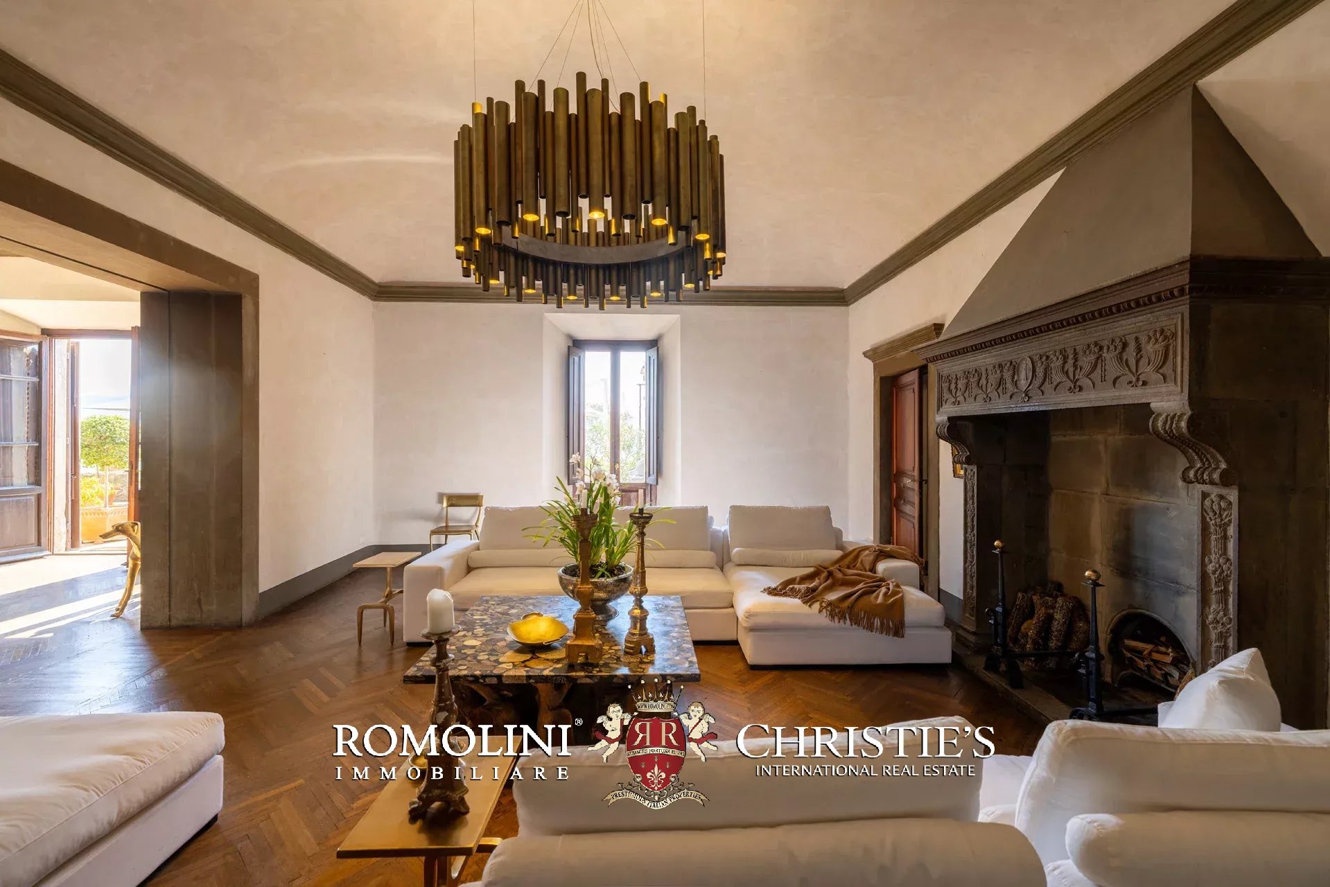 Das ca. 90 m² große Hauptwohnzimmer wird durch einen prächtigen antiken Steinkamin bereichert. Auf einigen Böden ist das ursprüngliche Parkett erhalten geblieben, und die Beleuchtung wurde mit besonderer Sorgfalt geplant. Durch die Fenstertüren des Wohnzimmers gelangen Sie direkt auf die Panoramaterrasse, das wahre Herzstück der Immobilie.