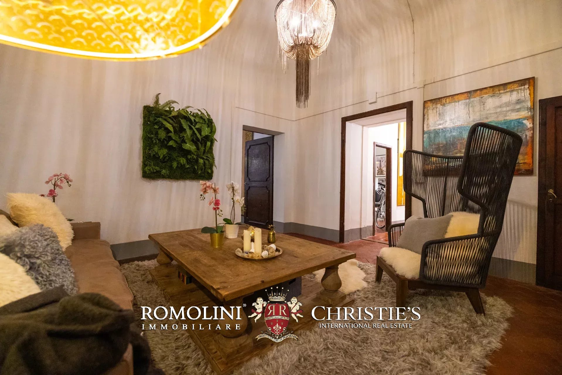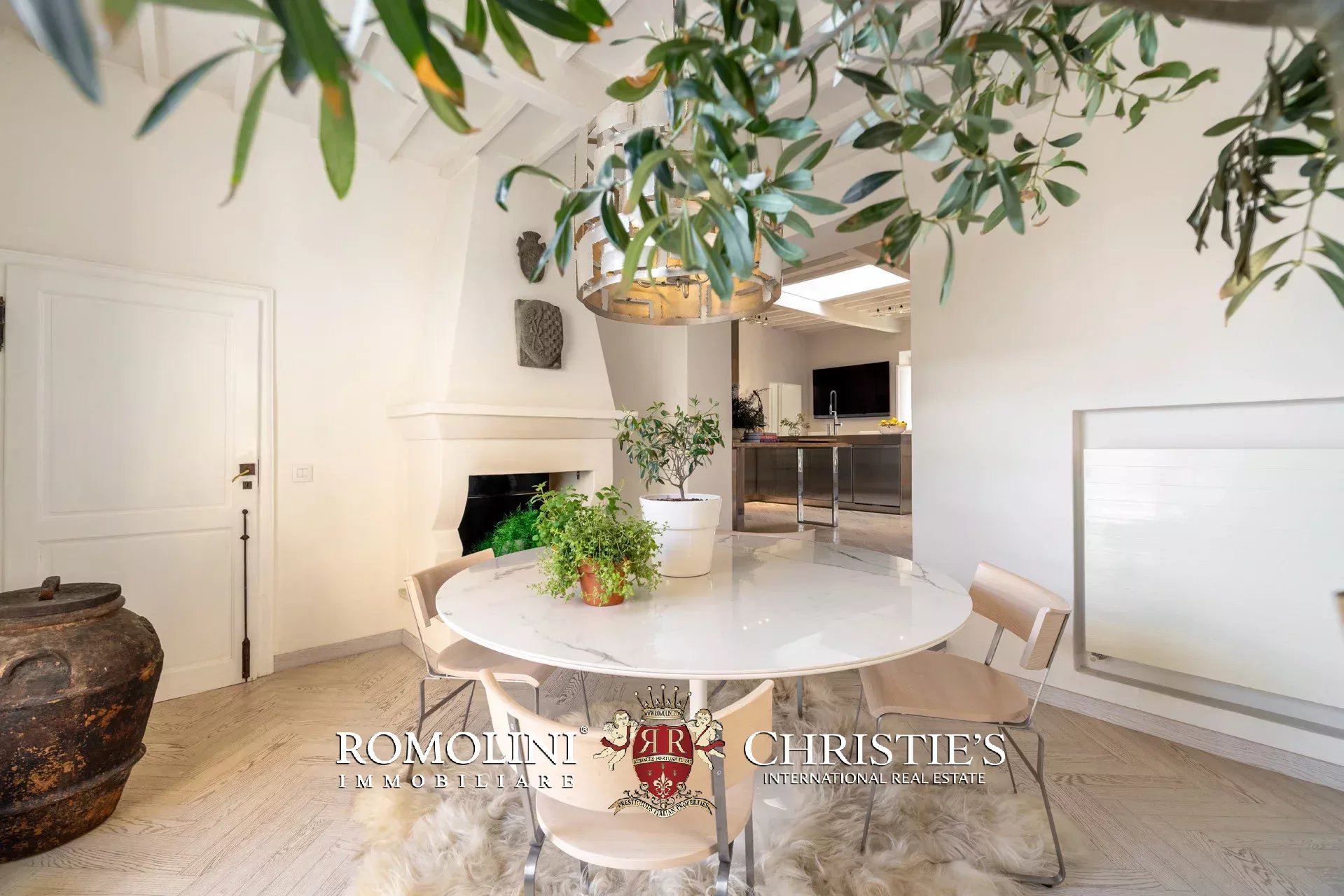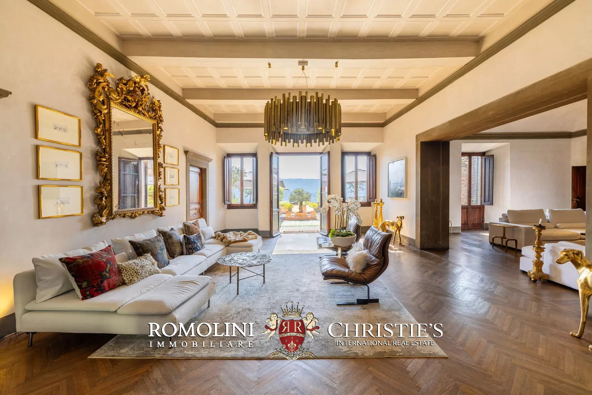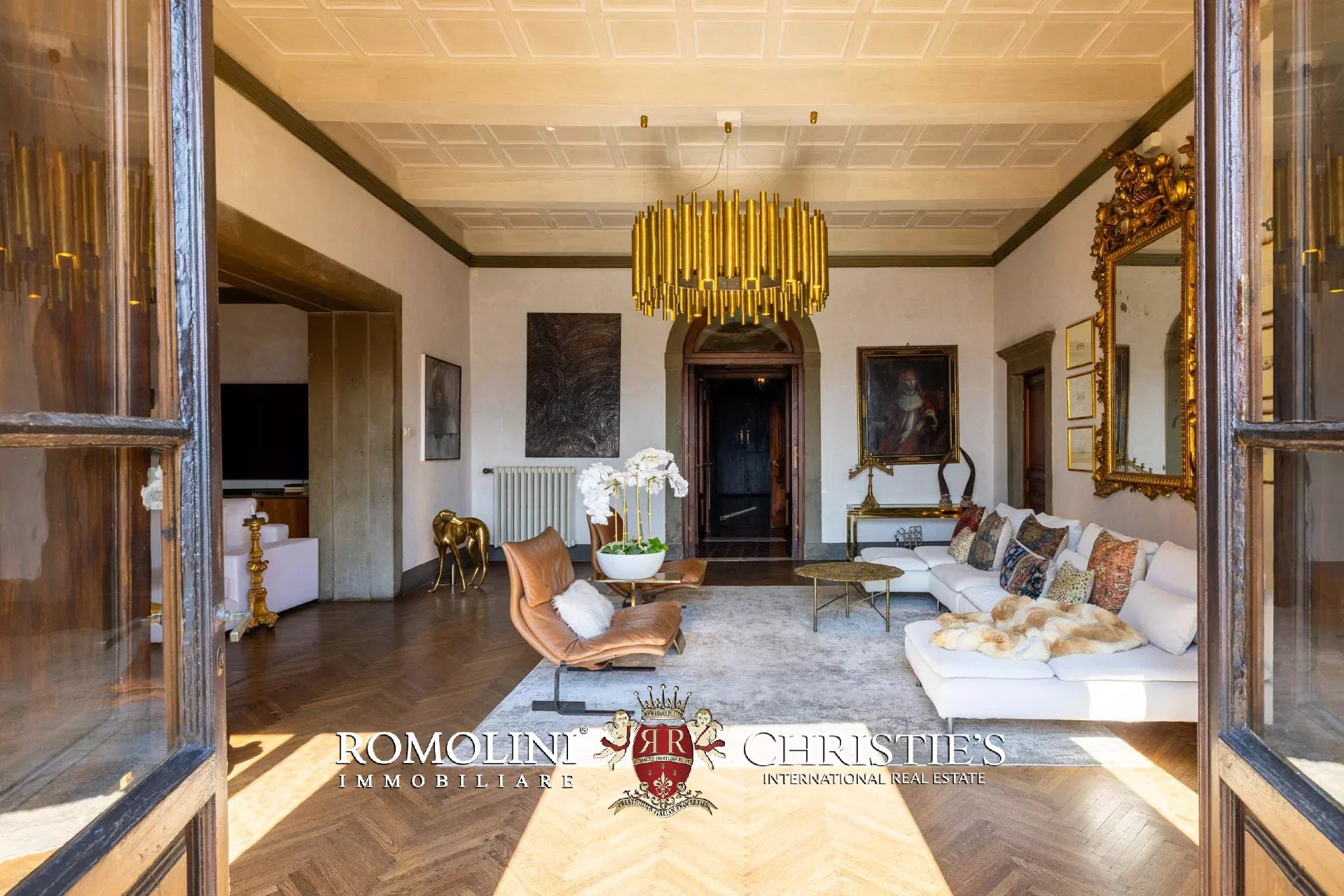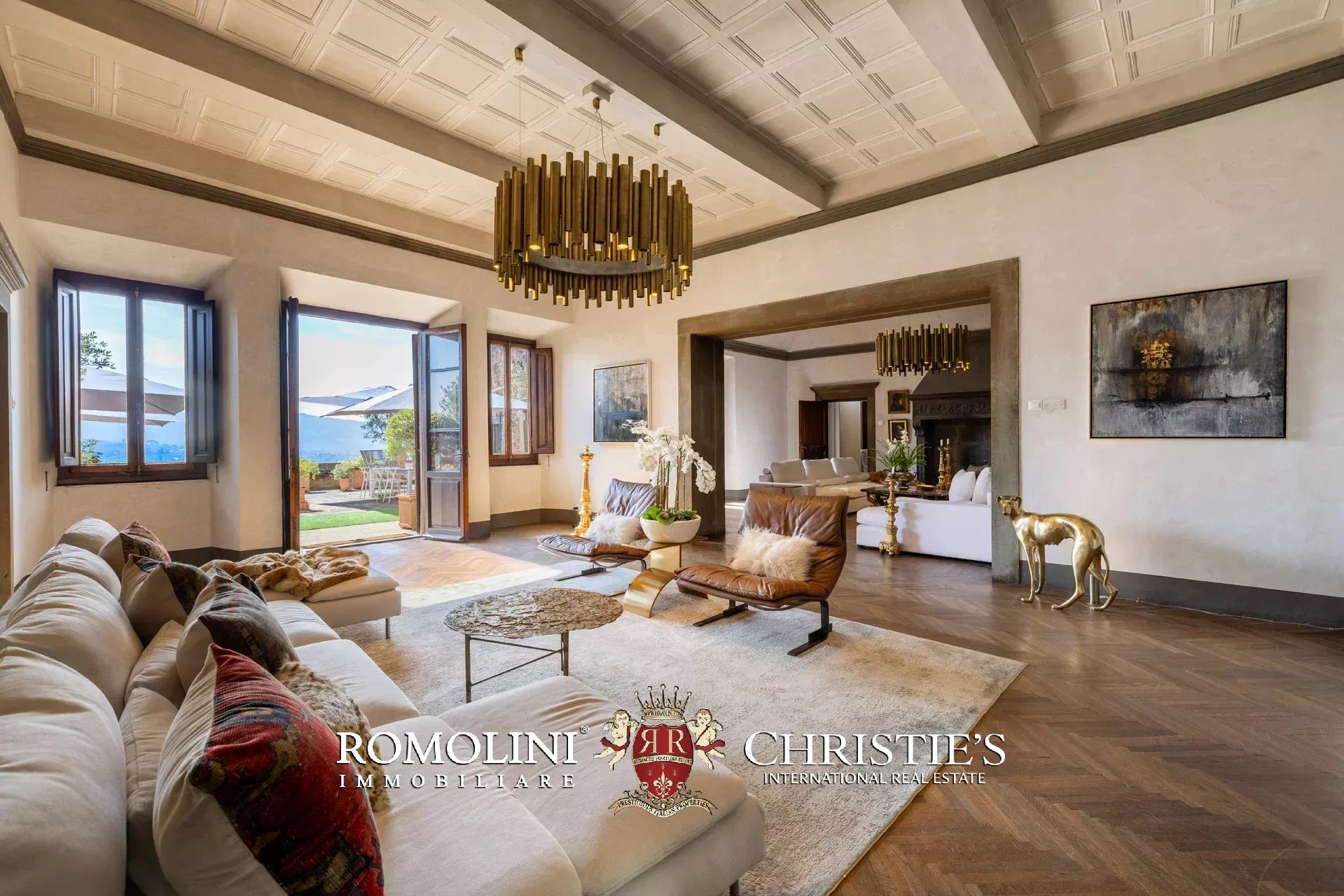 Das ca. 90 m² große Hauptwohnzimmer wird durch einen prächtigen antiken Steinkamin bereichert. Auf einigen Böden ist das ursprüngliche Parkett erhalten geblieben, und die Beleuchtung wurde mit besonderer Sorgfalt geplant. Durch die Fenstertüren des Wohnzimmers gelangen Sie direkt auf die Panoramaterrasse, das wahre Herzstück der Immobilie.