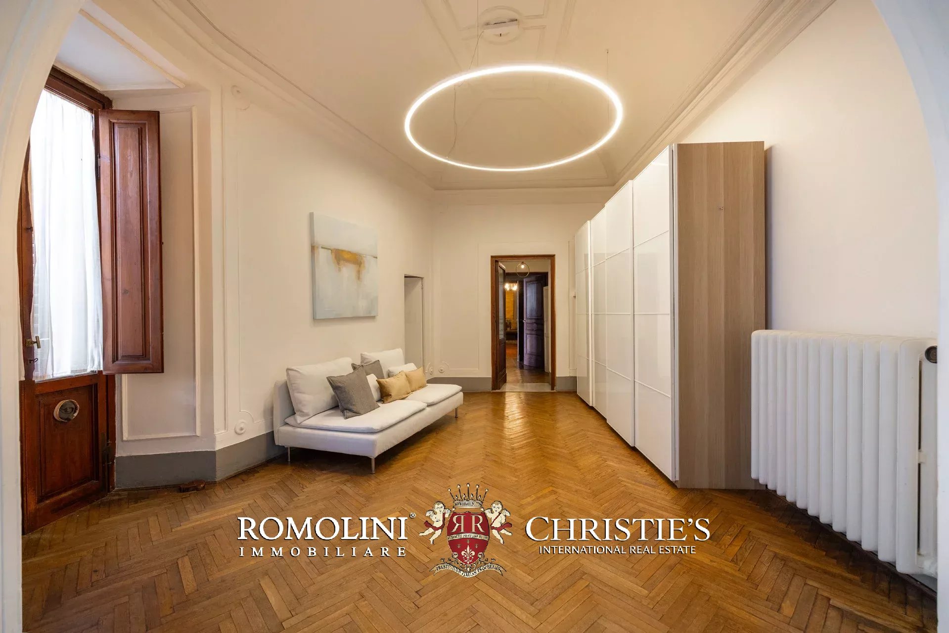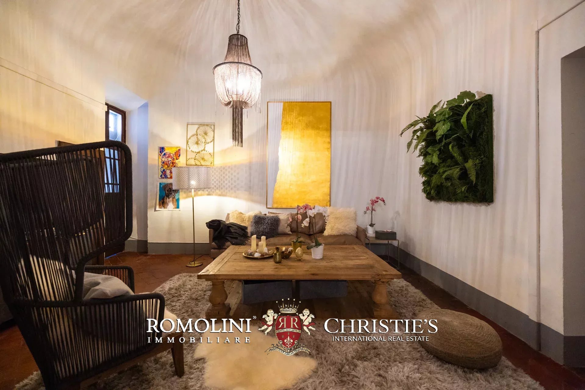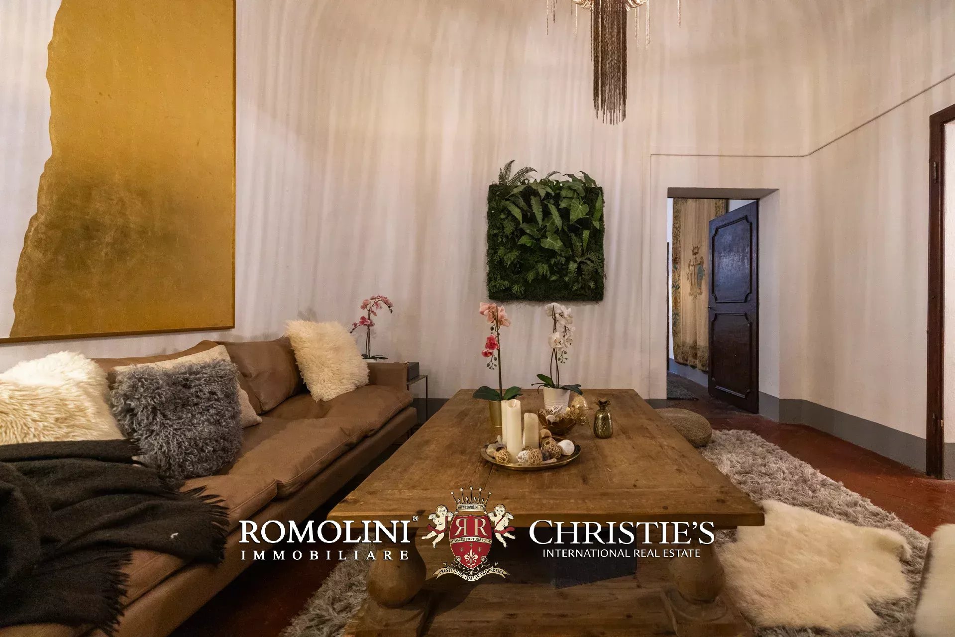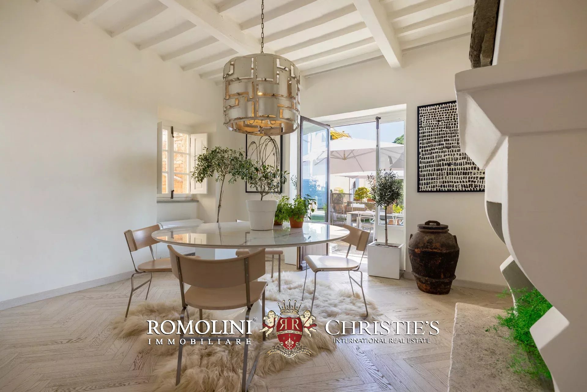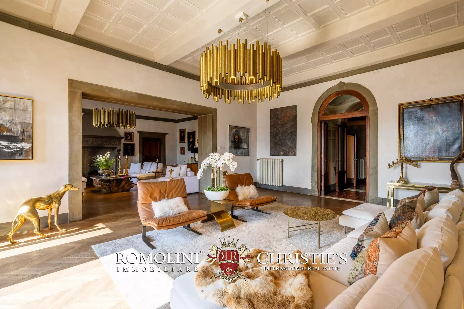 Das ca. 90 m² große Hauptwohnzimmer wird durch einen prächtigen antiken Steinkamin bereichert. Auf einigen Böden ist das ursprüngliche Parkett erhalten geblieben, und die Beleuchtung wurde mit besonderer Sorgfalt geplant. Durch die Fenstertüren des Wohnzimmers gelangen Sie direkt auf die Panoramaterrasse, das wahre Herzstück der Immobilie.