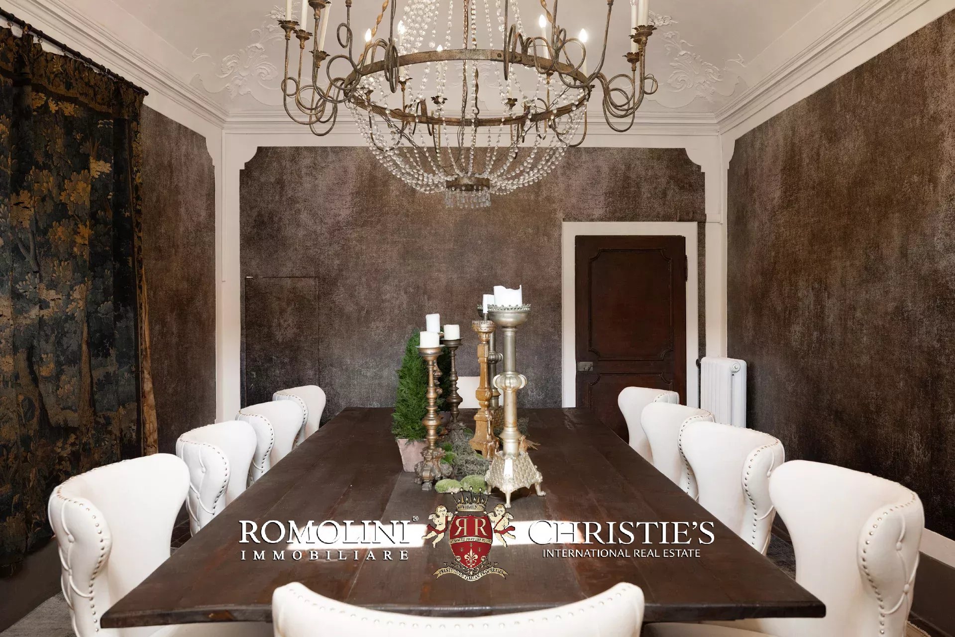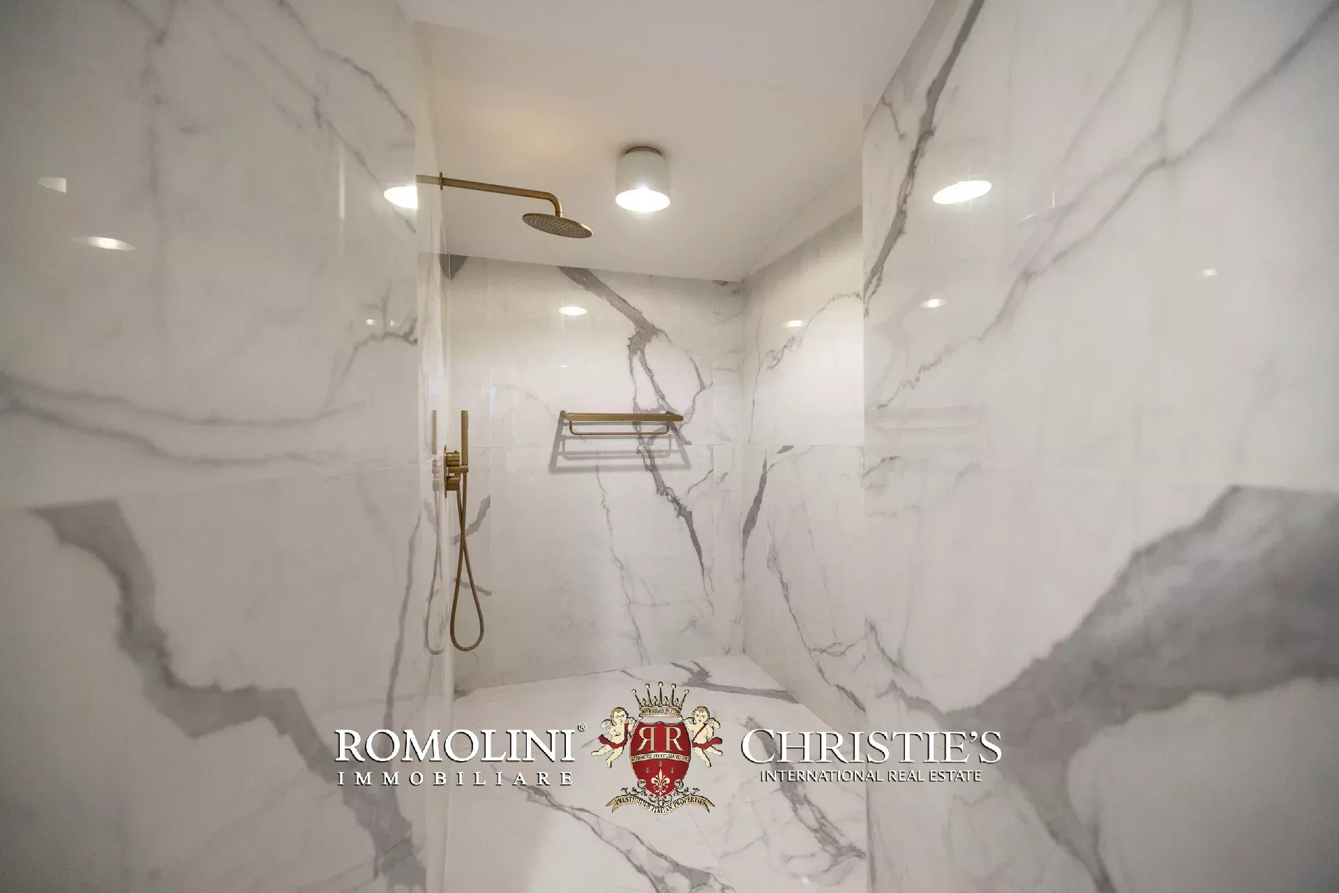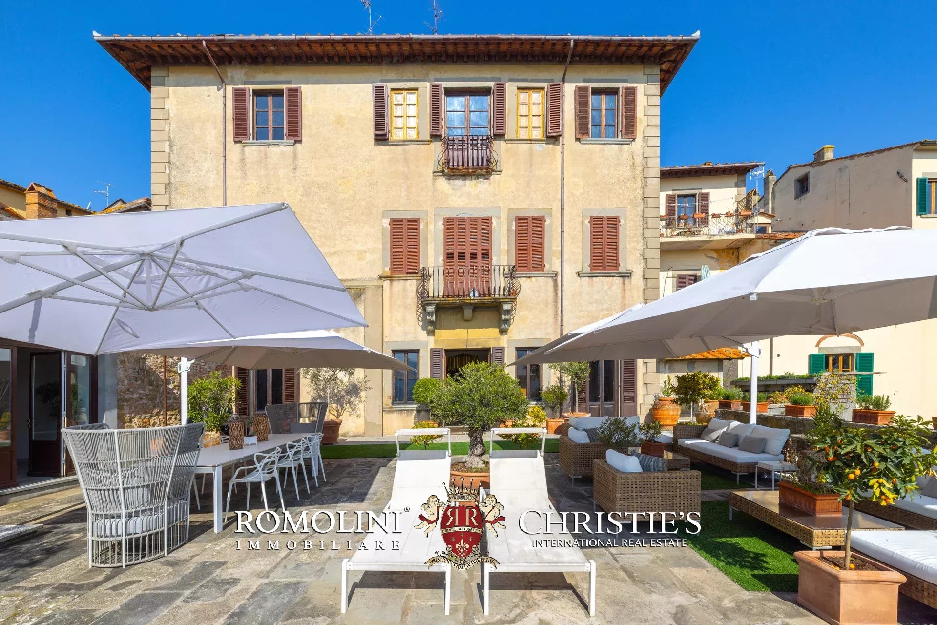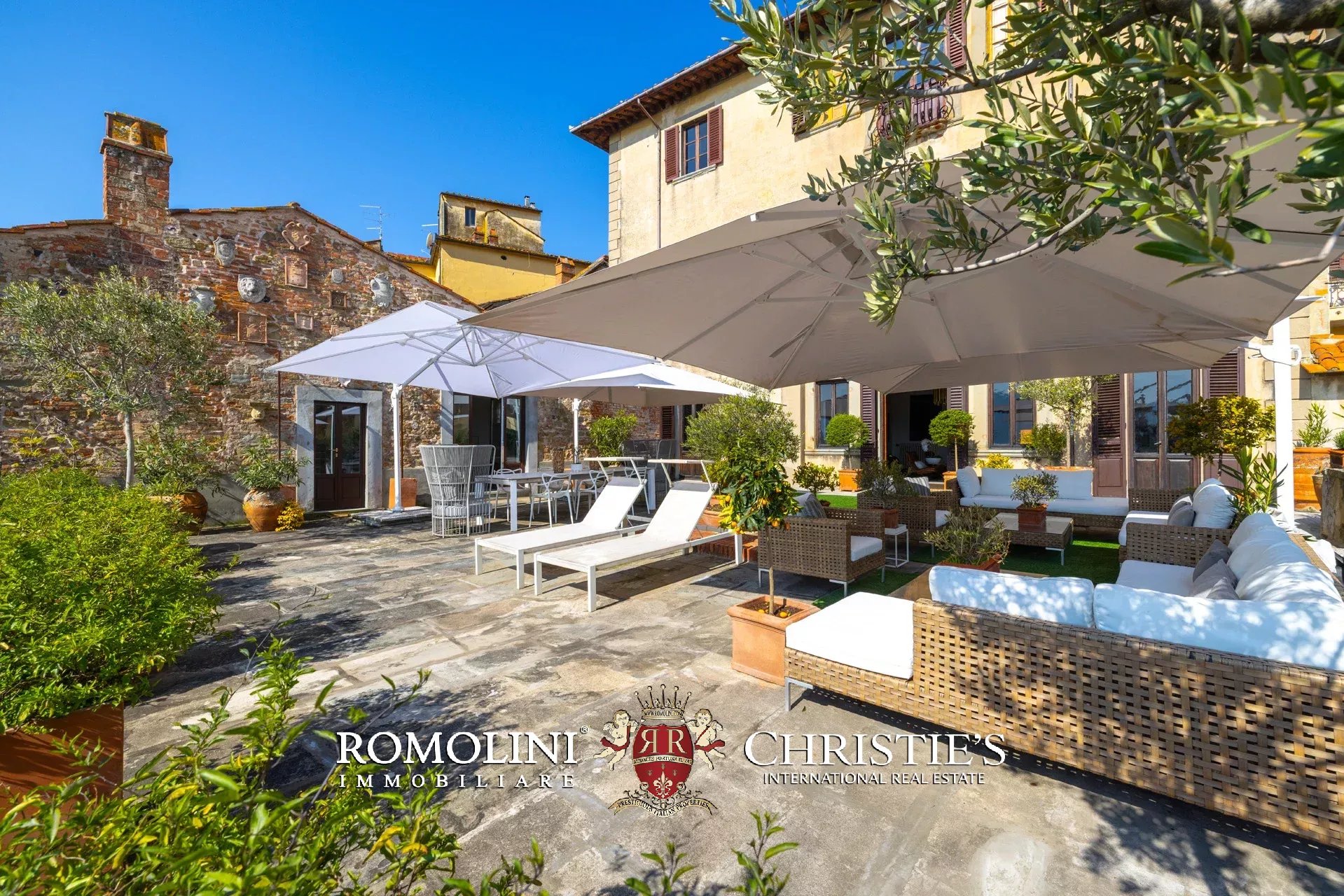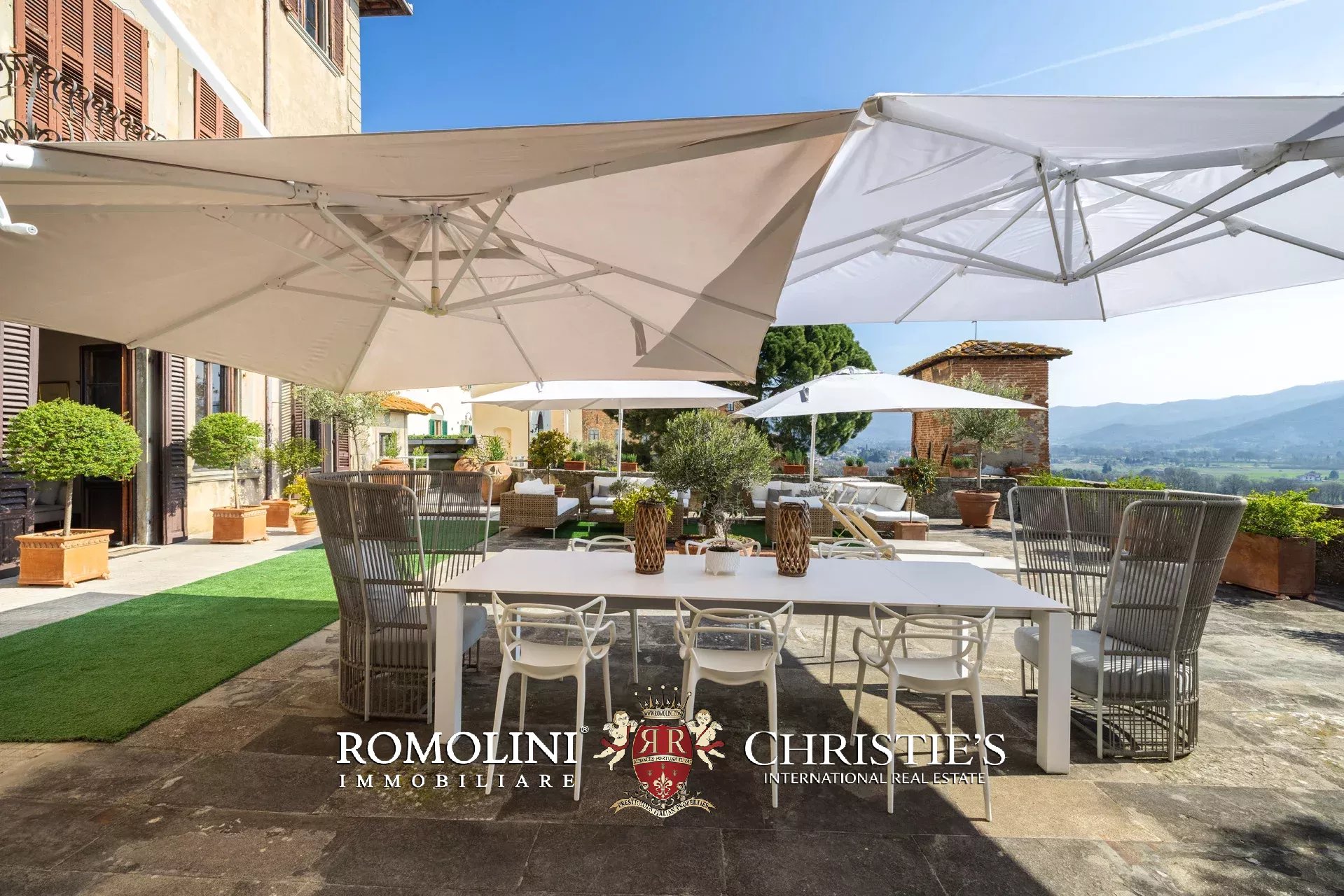 Das ca. 90 m² große Hauptwohnzimmer wird durch einen prächtigen antiken Steinkamin bereichert. Auf einigen Böden ist das ursprüngliche Parkett erhalten geblieben, und die Beleuchtung wurde mit besonderer Sorgfalt geplant. Durch die Fenstertüren des Wohnzimmers gelangen Sie direkt auf die Panoramaterrasse, das wahre Herzstück der Immobilie.