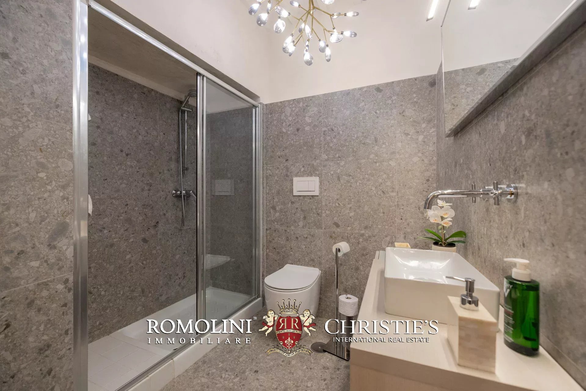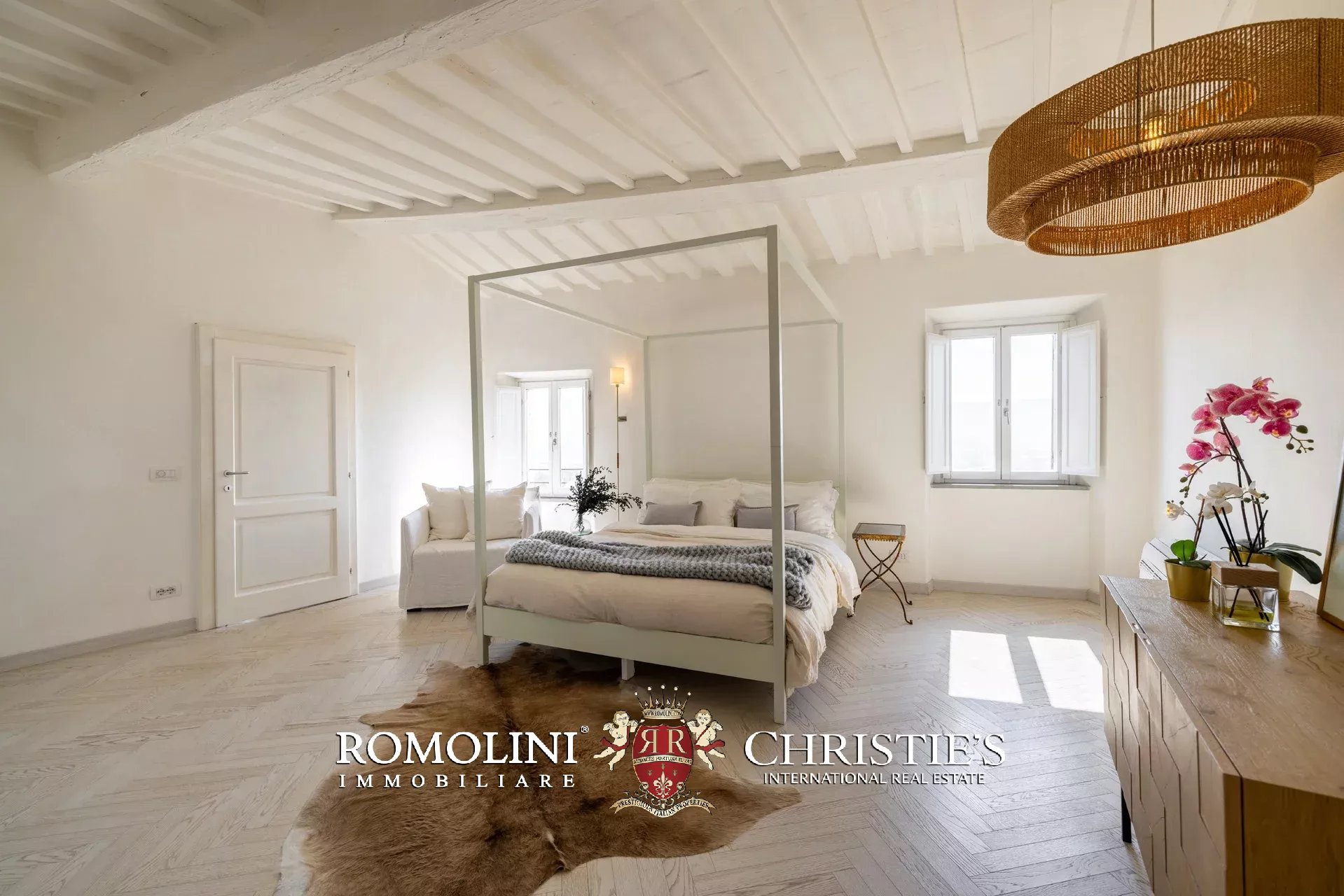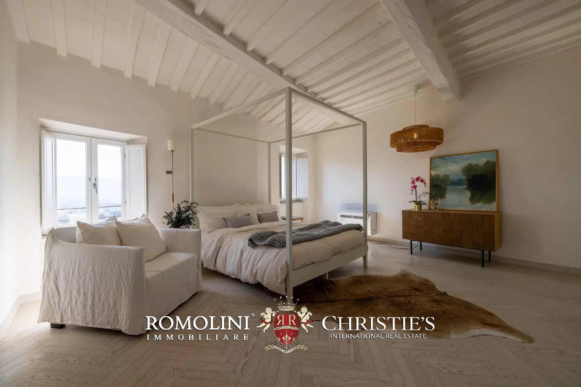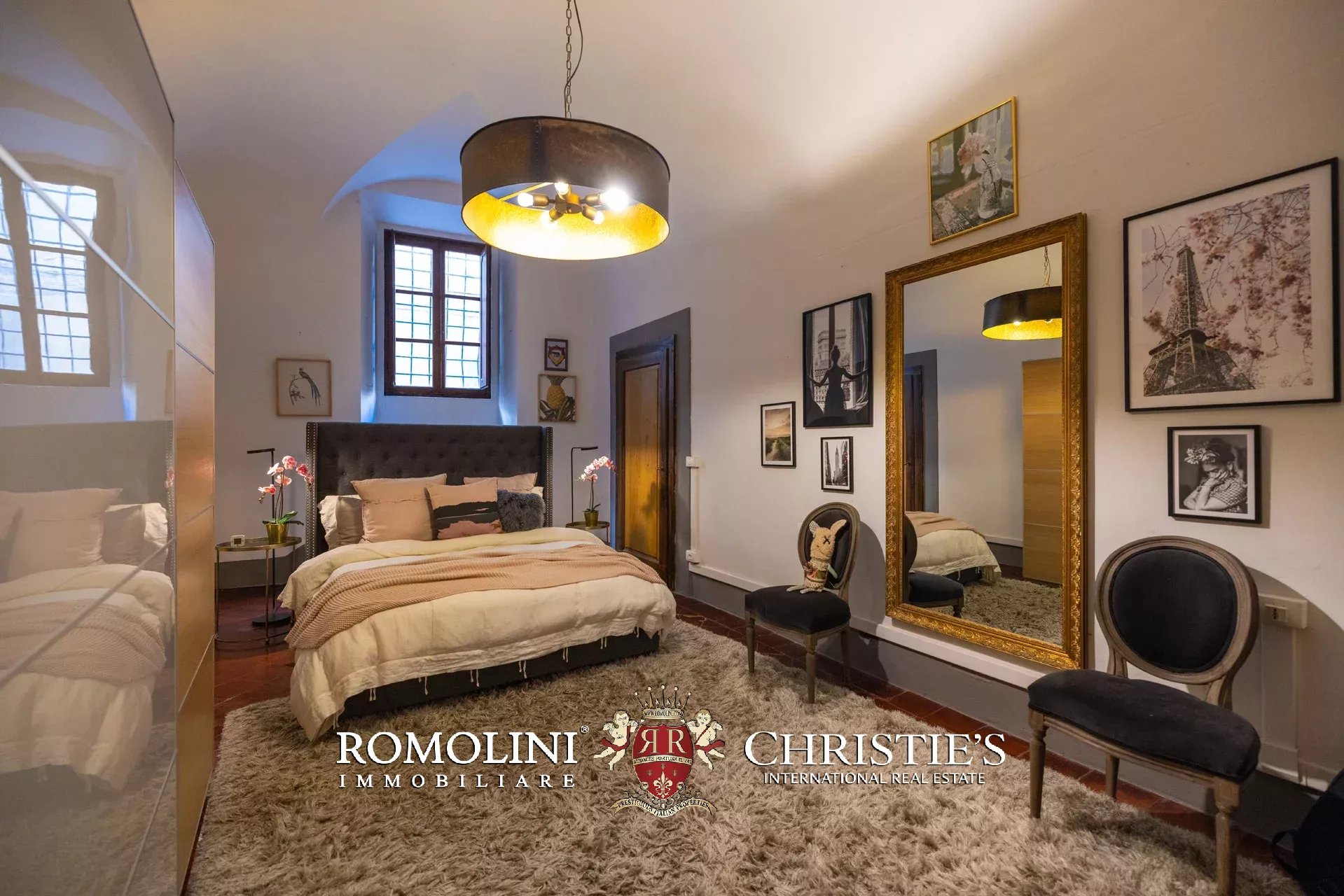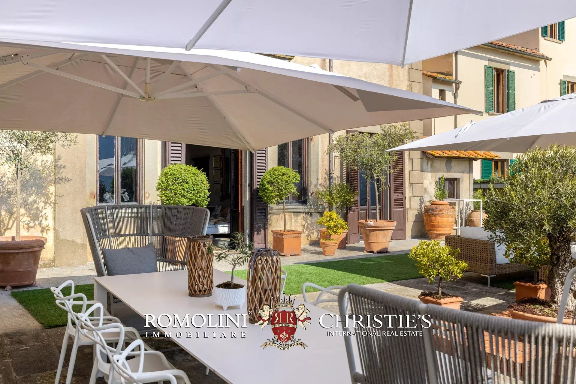 Das ca. 90 m² große Hauptwohnzimmer wird durch einen prächtigen antiken Steinkamin bereichert. Auf einigen Böden ist das ursprüngliche Parkett erhalten geblieben, und die Beleuchtung wurde mit besonderer Sorgfalt geplant. Durch die Fenstertüren des Wohnzimmers gelangen Sie direkt auf die Panoramaterrasse, das wahre Herzstück der Immobilie.