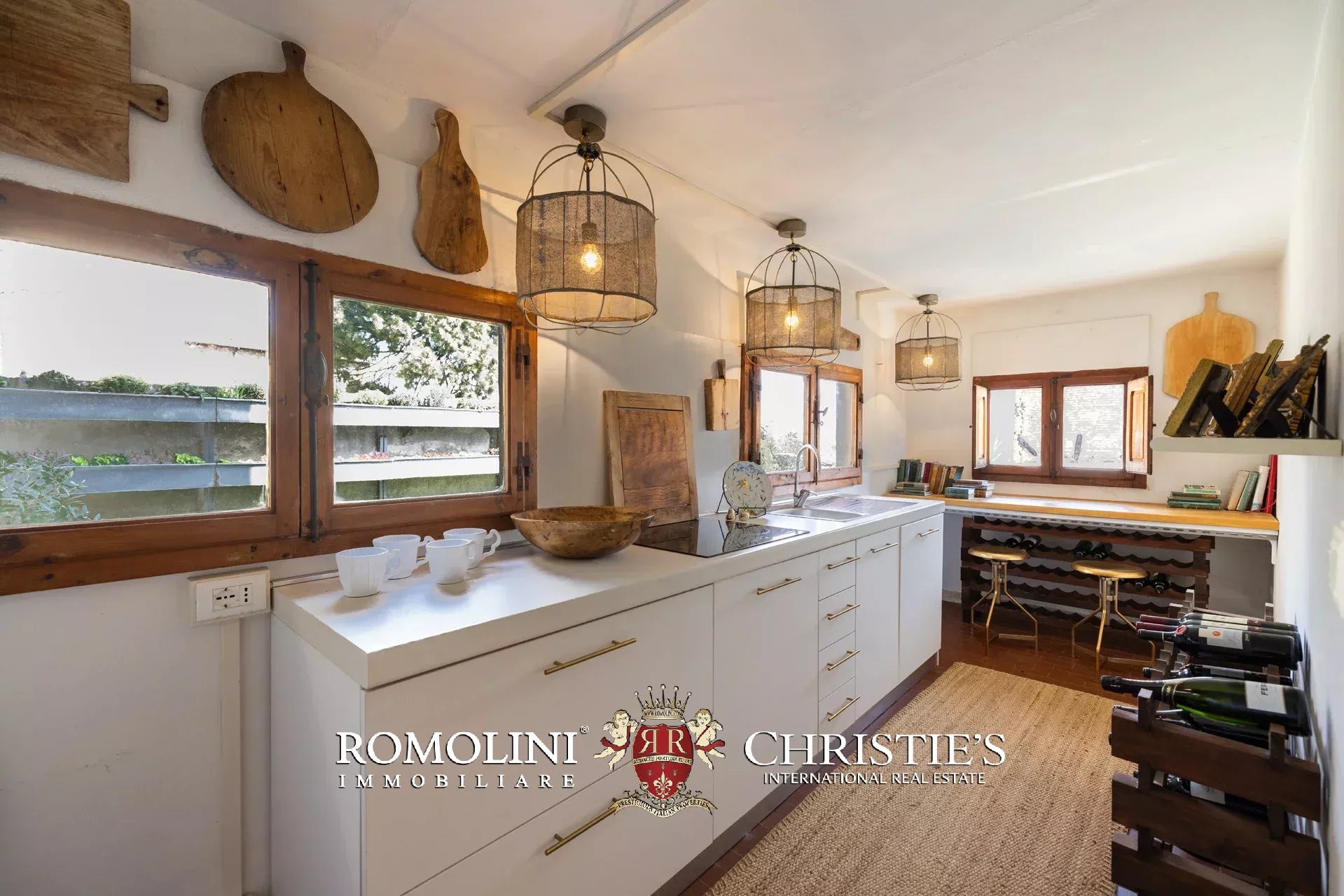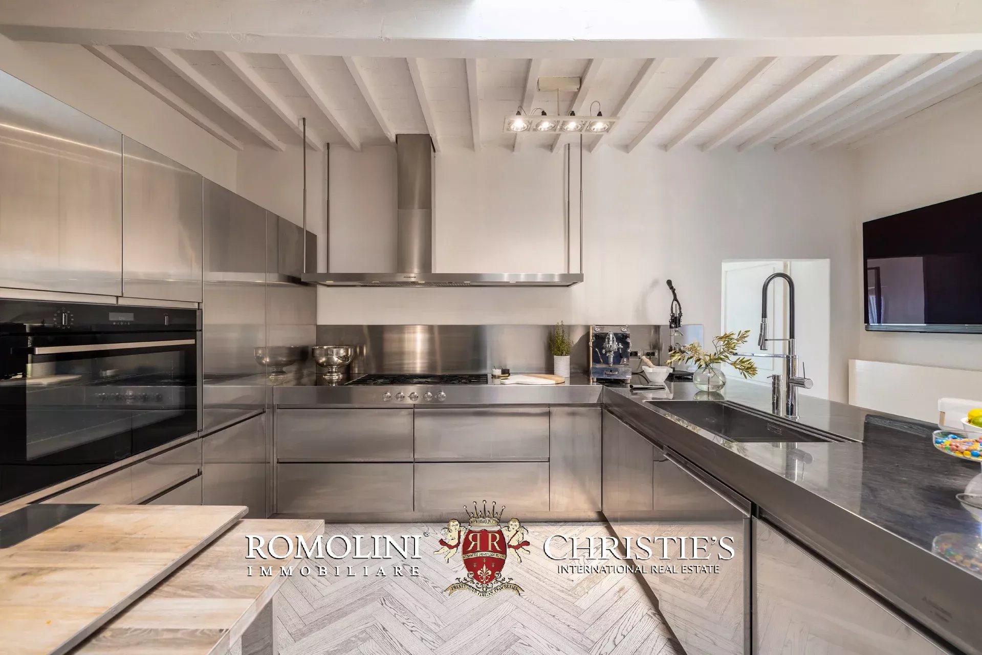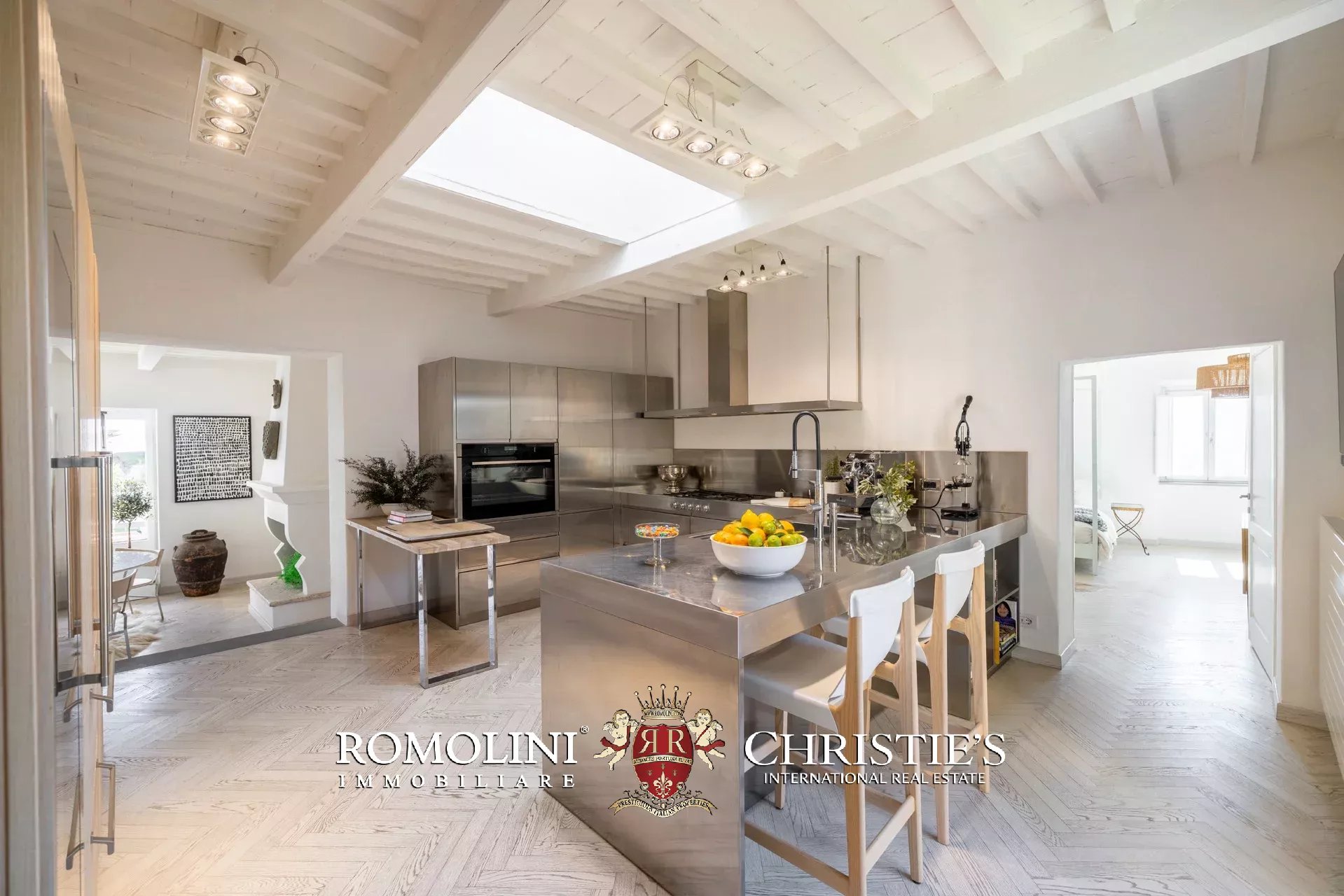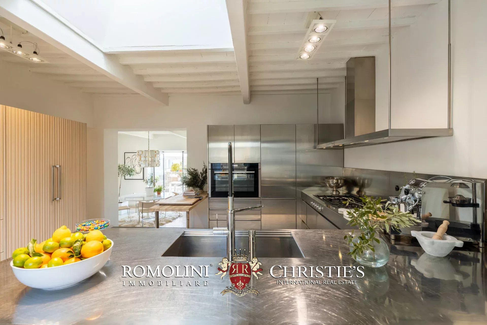Die von Arclinea maßgefertigte Hauptküche ist mit hochwertigen Geräten, einem Weinkeller für 80 Flaschen und einem Frühstücksbereich mit Kamin ausgestattet. Auch von hier aus gelangen Sie direkt auf die Terrasse.