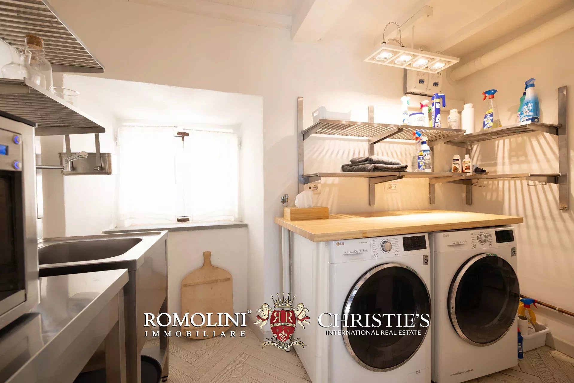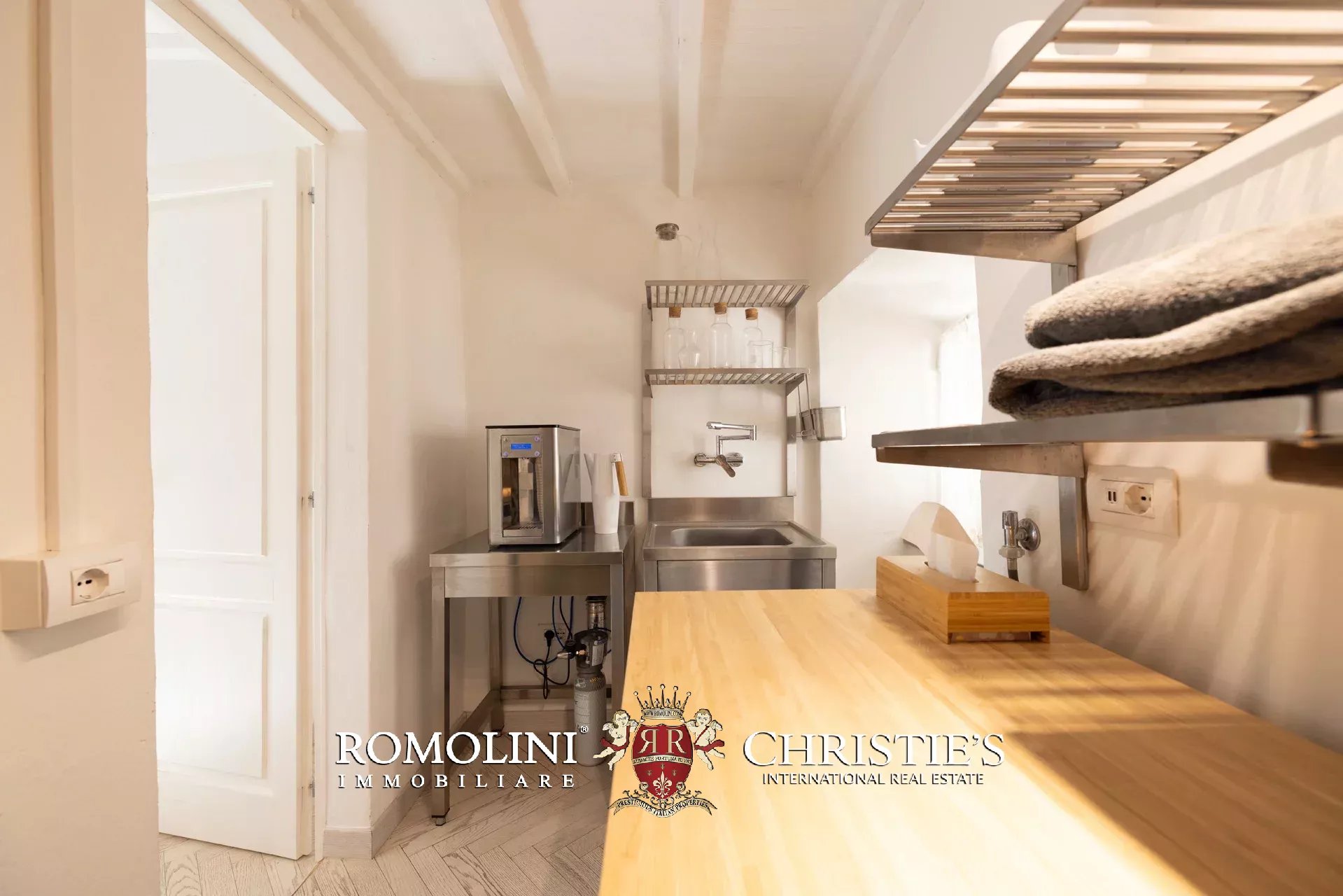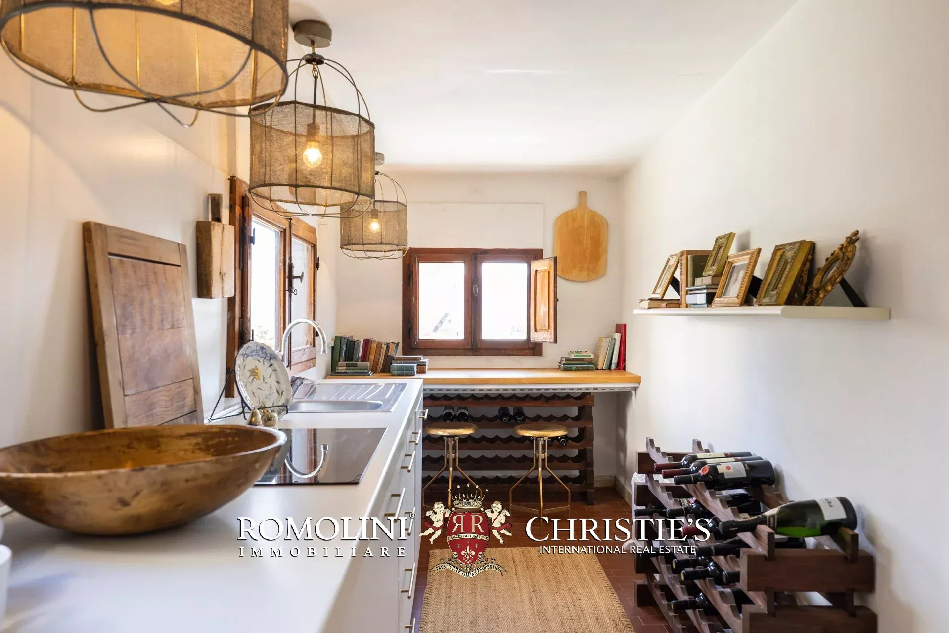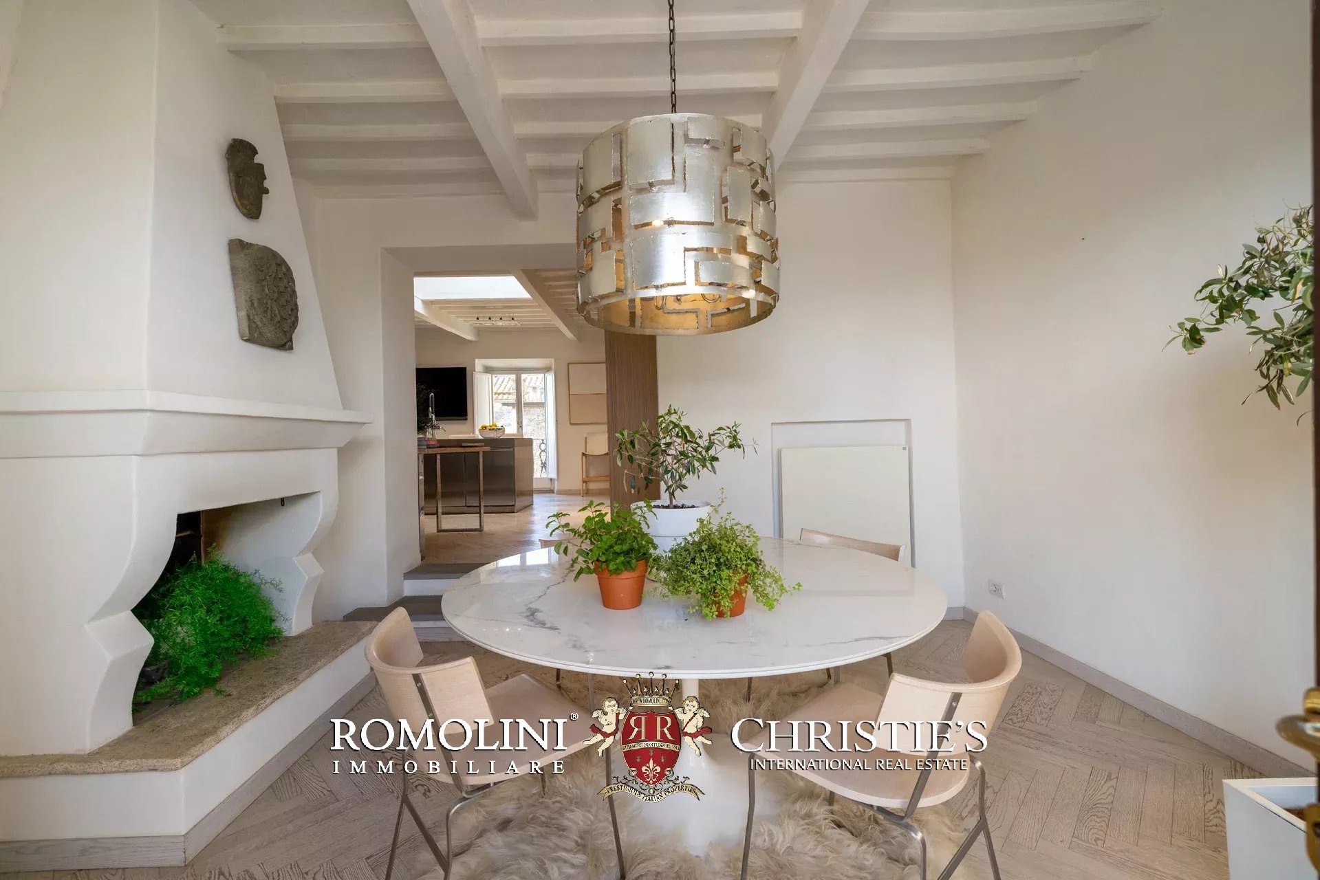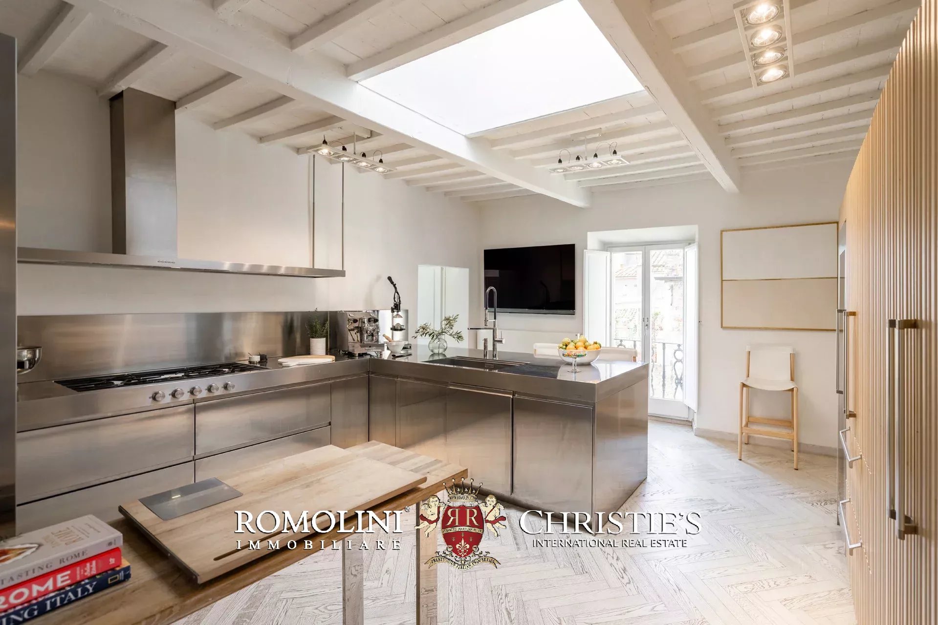 Die von Arclinea maßgefertigte Hauptküche ist mit hochwertigen Geräten, einem Weinkeller für 80 Flaschen und einem Frühstücksbereich mit Kamin ausgestattet. Auch von hier aus gelangen Sie direkt auf die Terrasse.