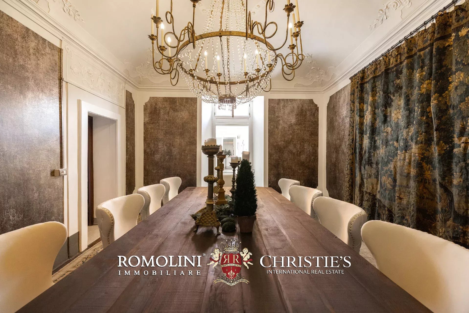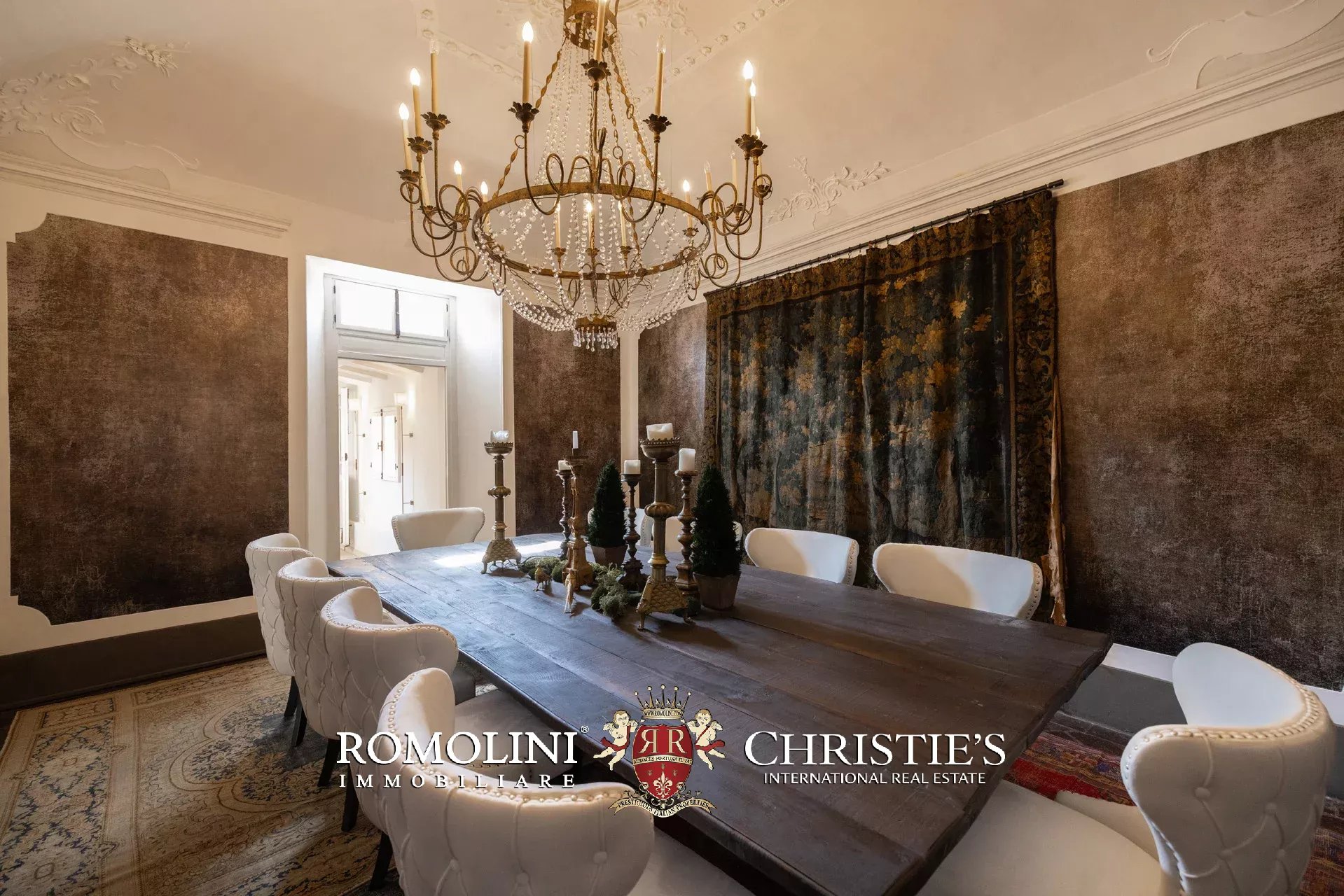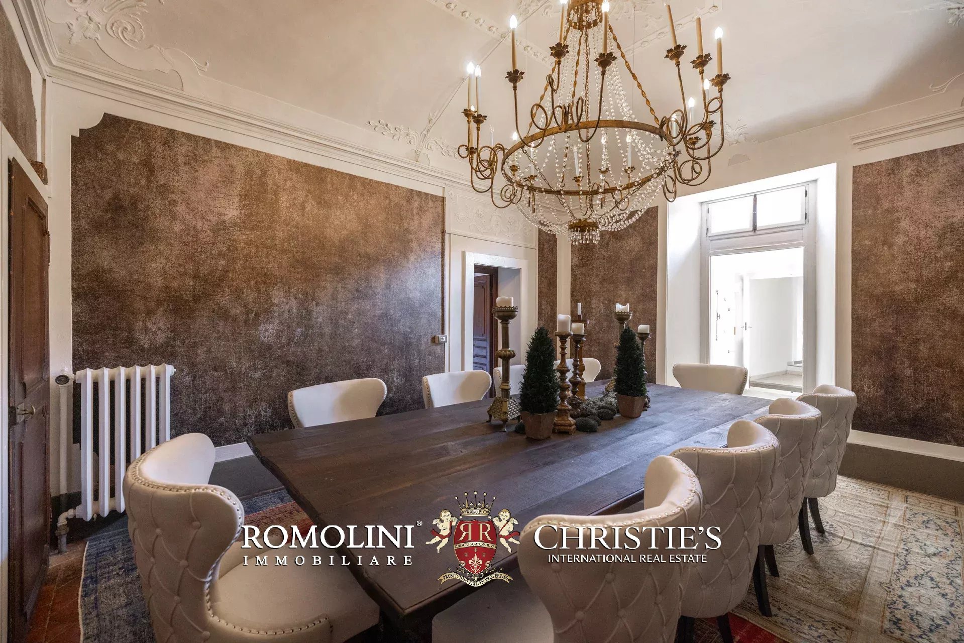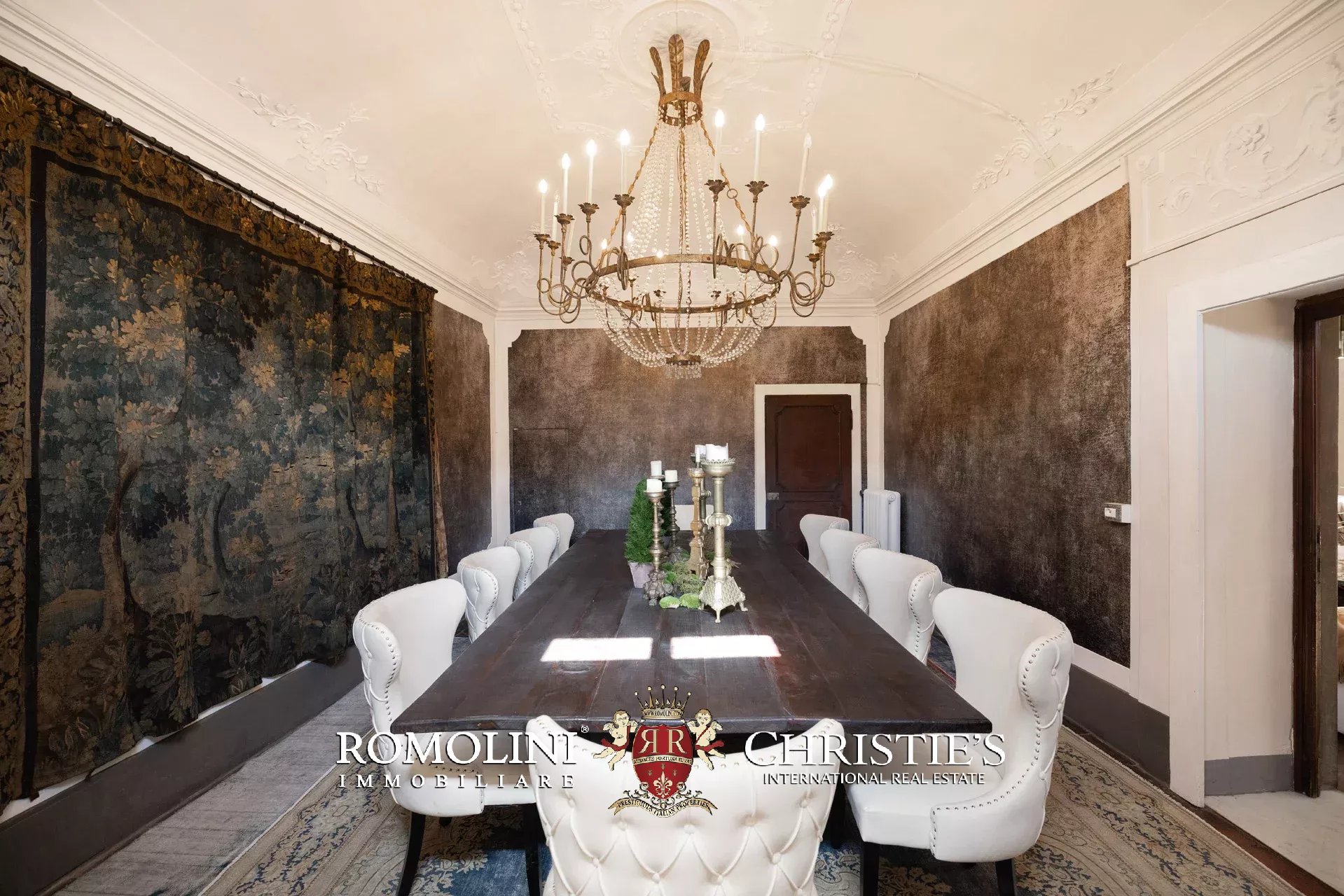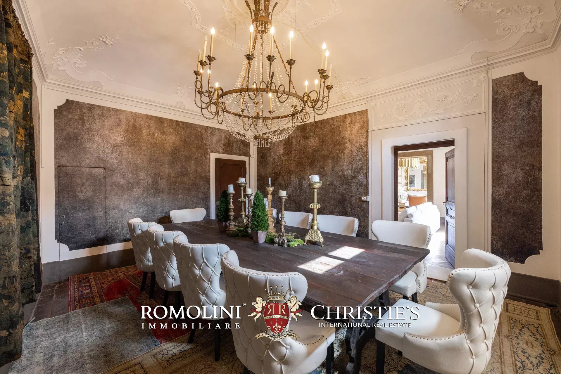 Das elegante und raffinierte Esszimmer verfügt über eine eindrucksvolle verzierte Decke und bietet bequem Platz für bis zu zehn Personen am großen Tisch.