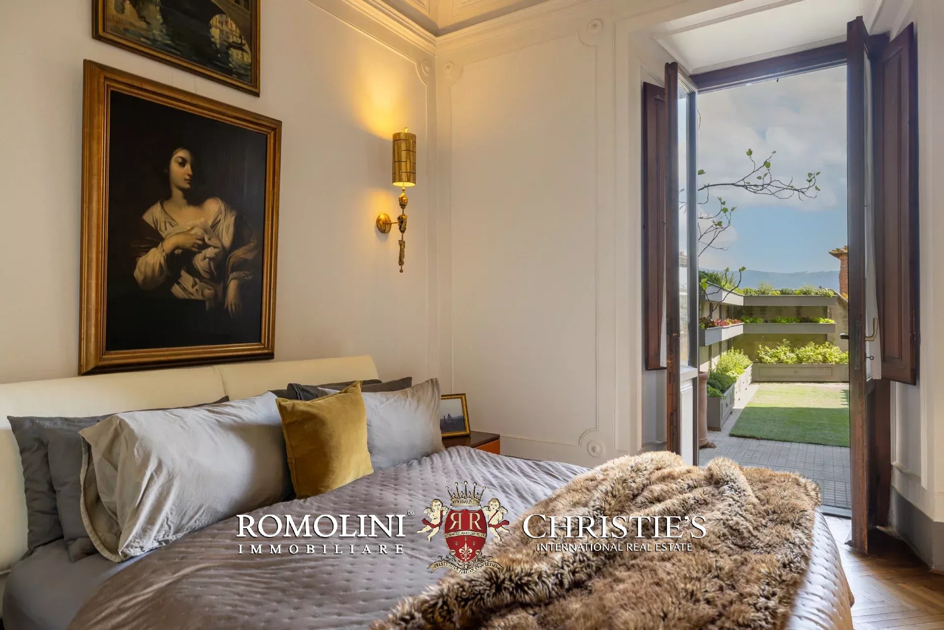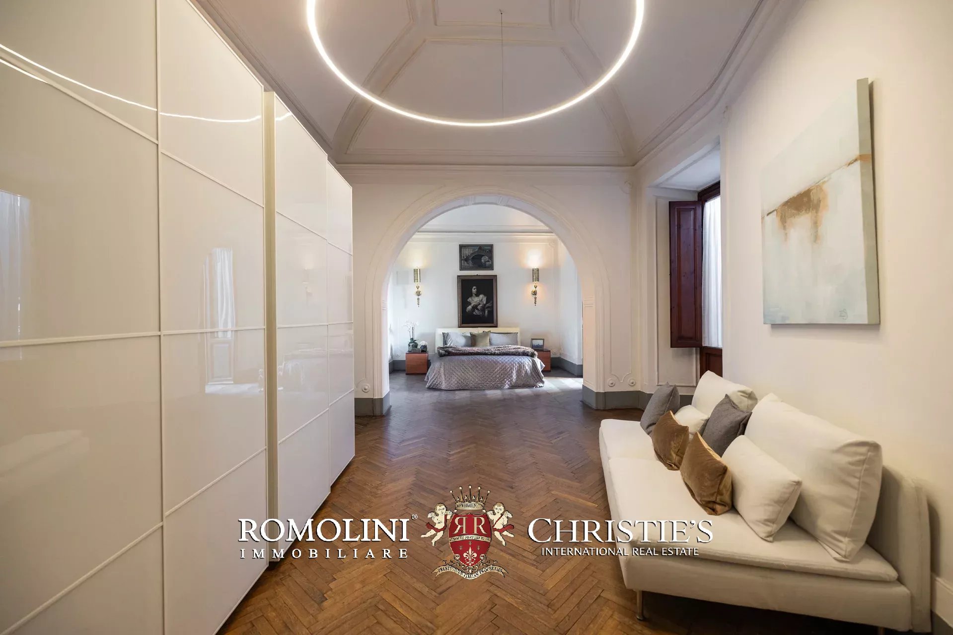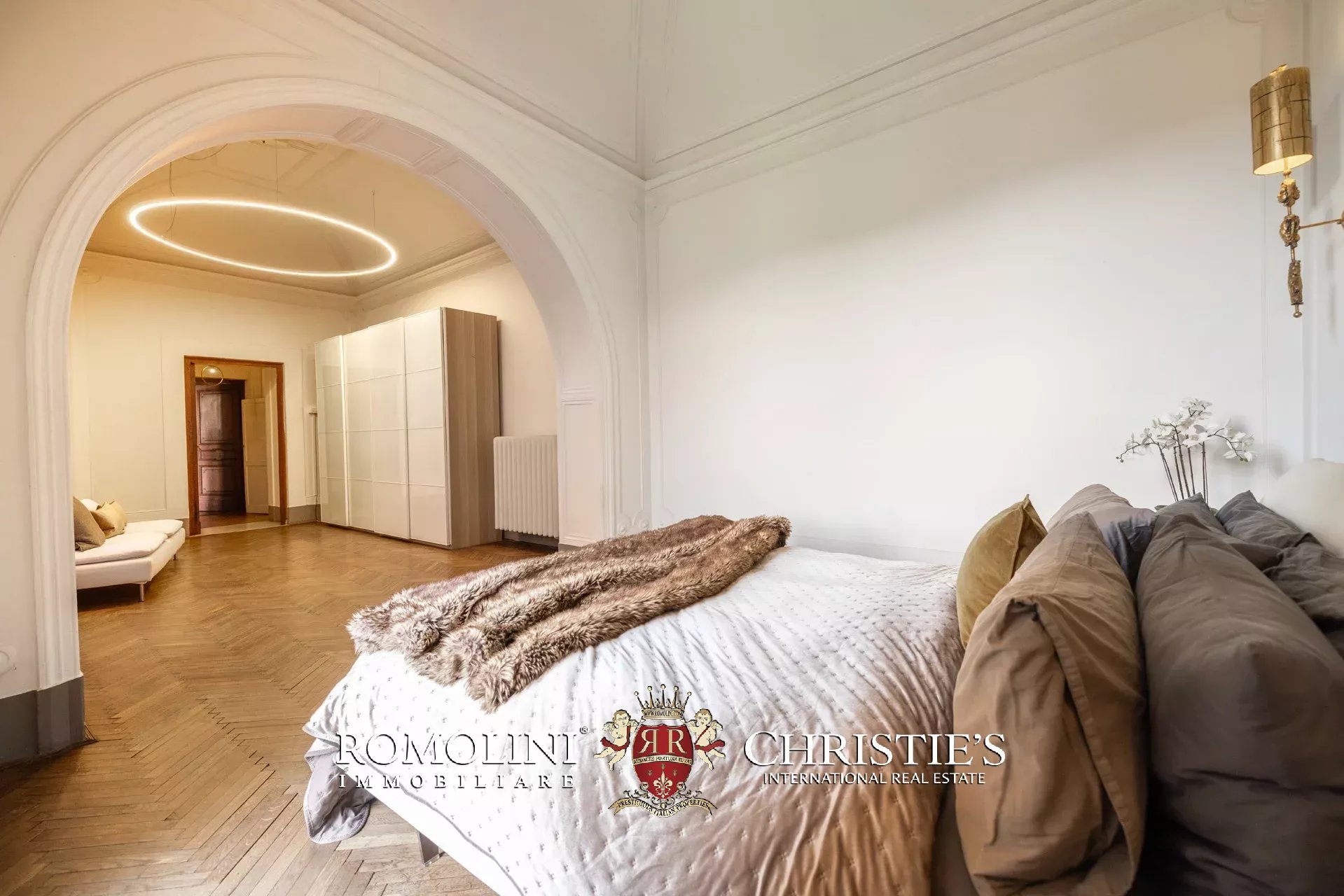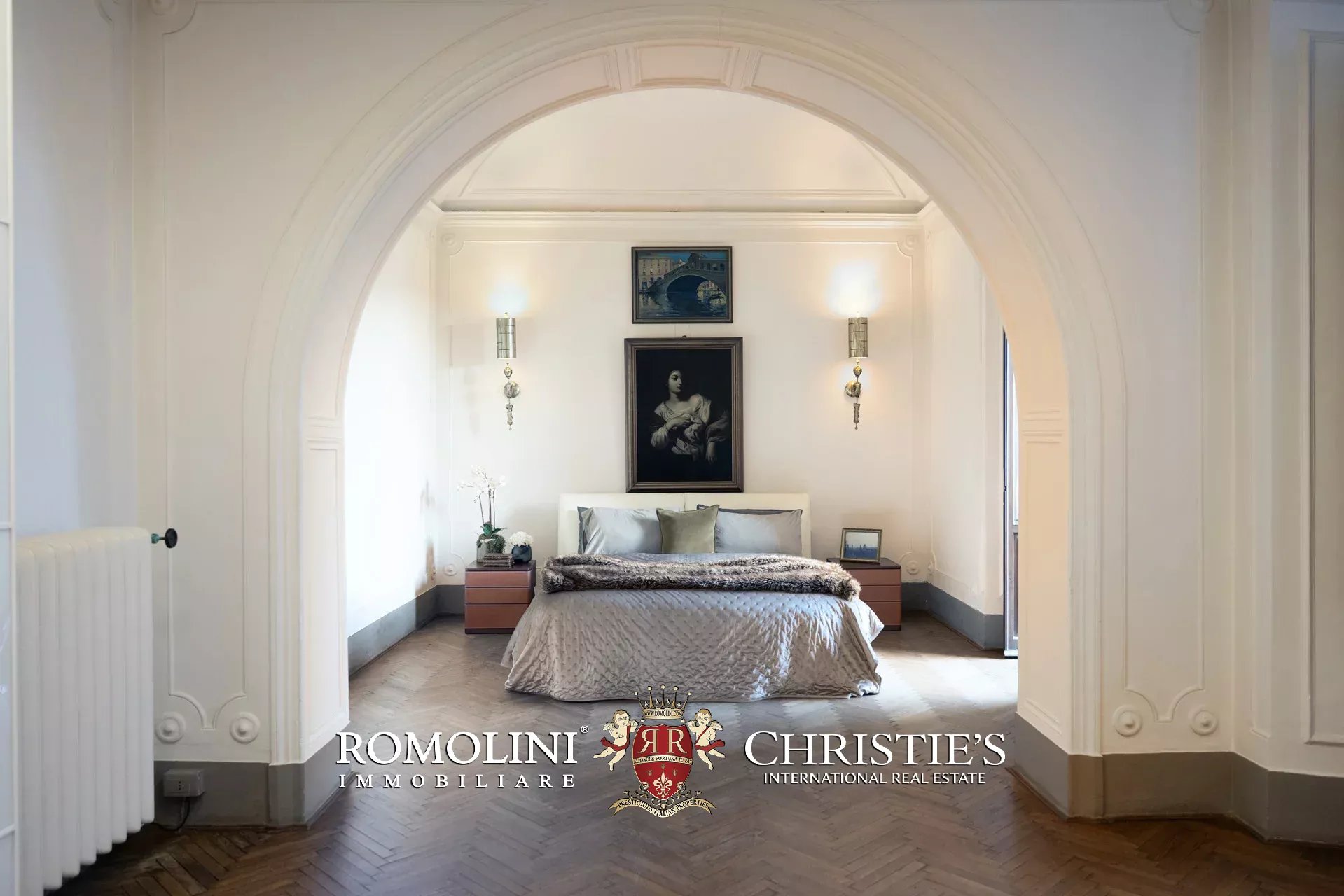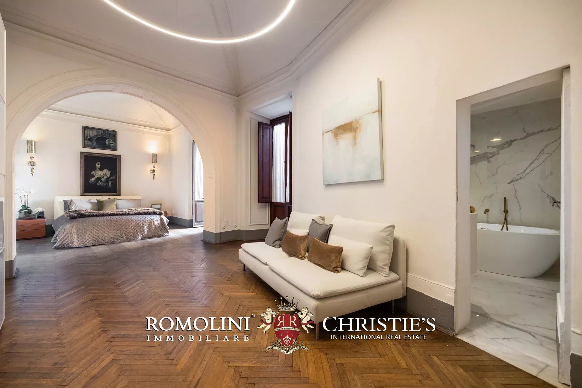 Die Master-Suite nimmt einen ganzen Flügel der Wohnung ein und umfasst ein geräumiges Schlafzimmer mit Stuckdecken, direkten Zugang zur Terrasse und ein luxuriöses, mit Calacatta-Marmor veredeltes Bad en suite, das mit eine freistehender Badewanne und einer großen begehbaren Dusche ausgestattet ist.