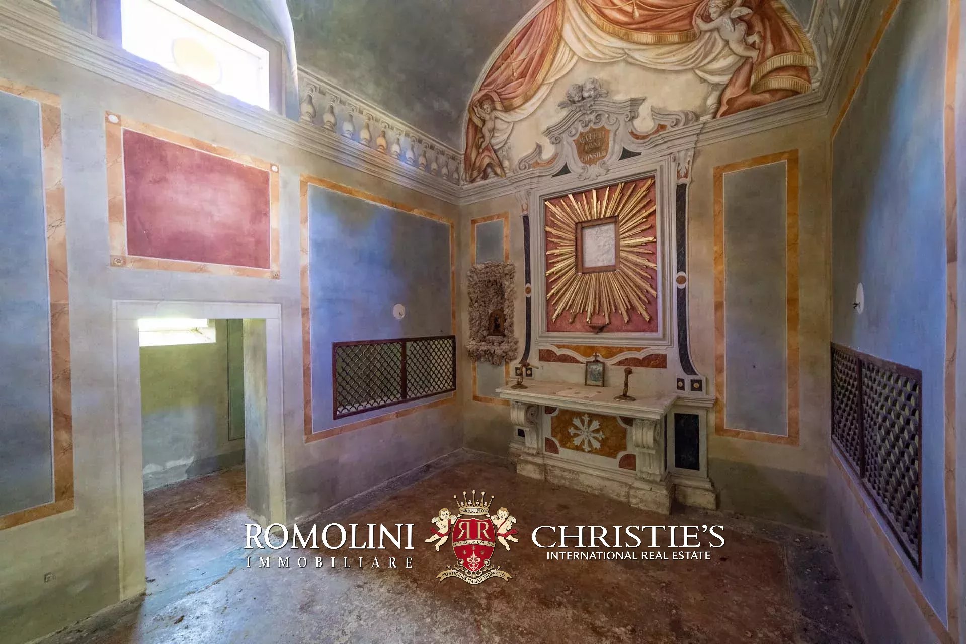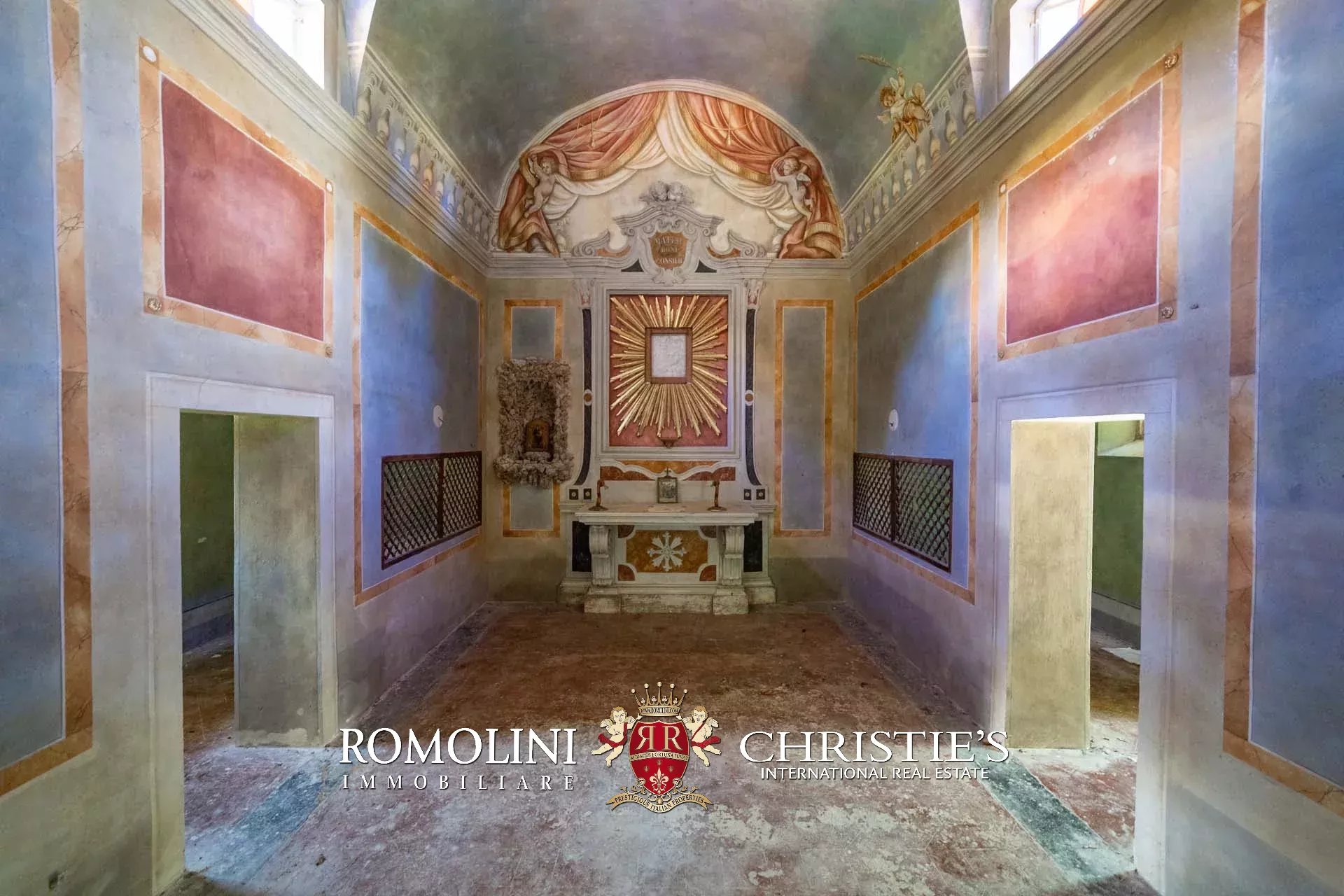 Finally, at the far end of the complex, attached to the guesthouse, is the aristocratic chapel (50 m² – 538 ft²) divided into three rooms: in the center is the main nave, finely frescoed with trompe-l’œil architecture that frames the altar and gives depth to the rooms, while two secondary chapels have been created on the sides. The building is in good condition but needs some conservation and maintenance work.