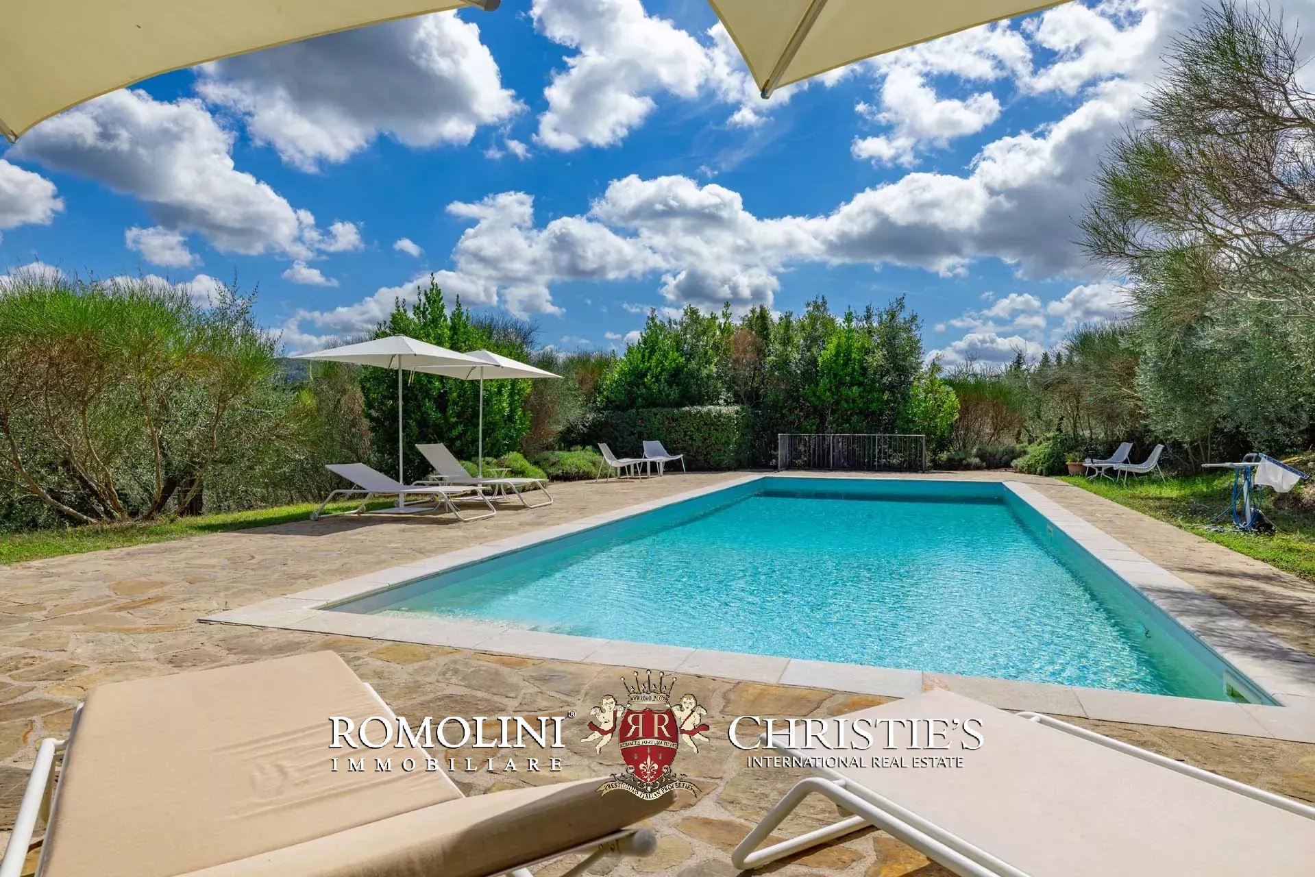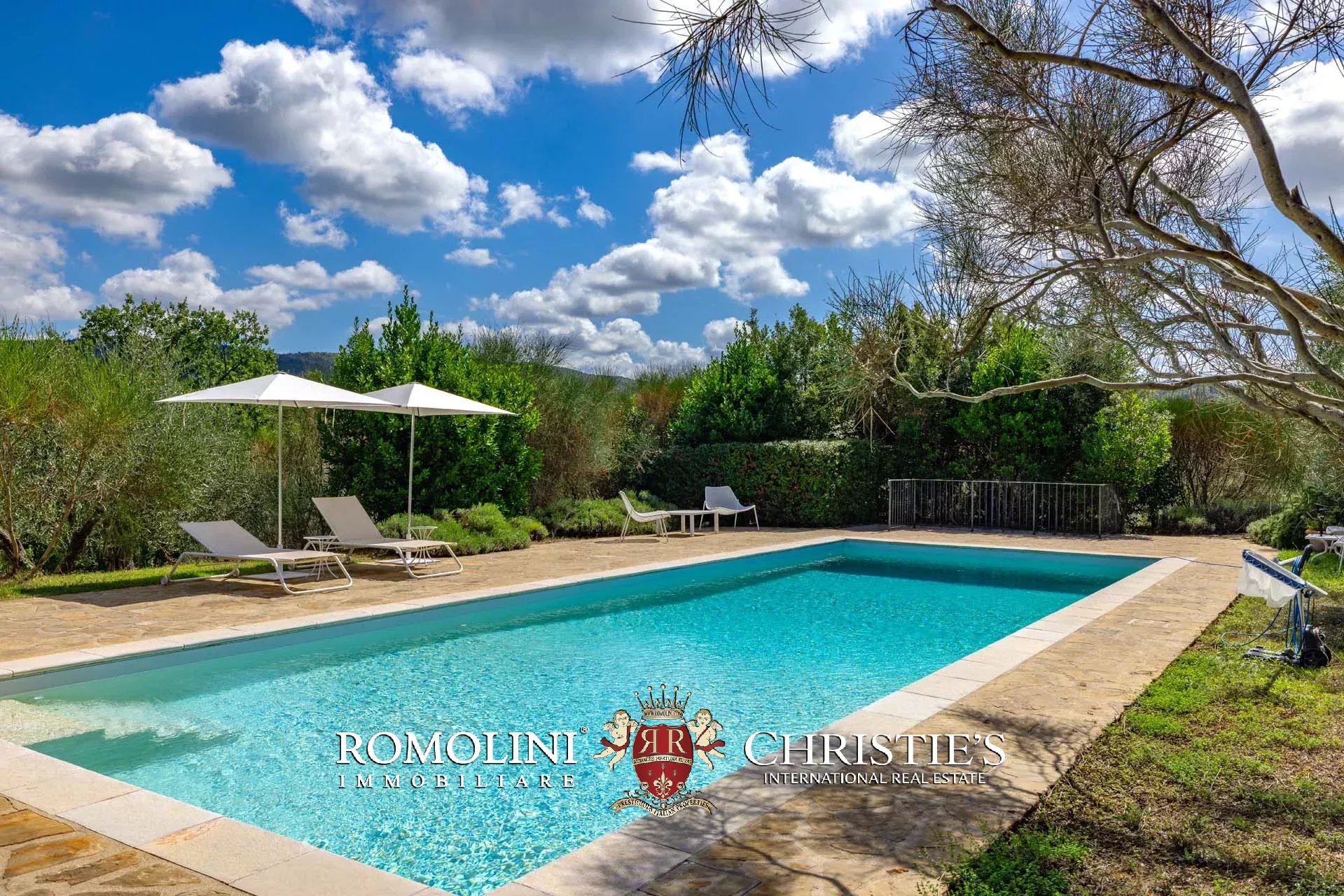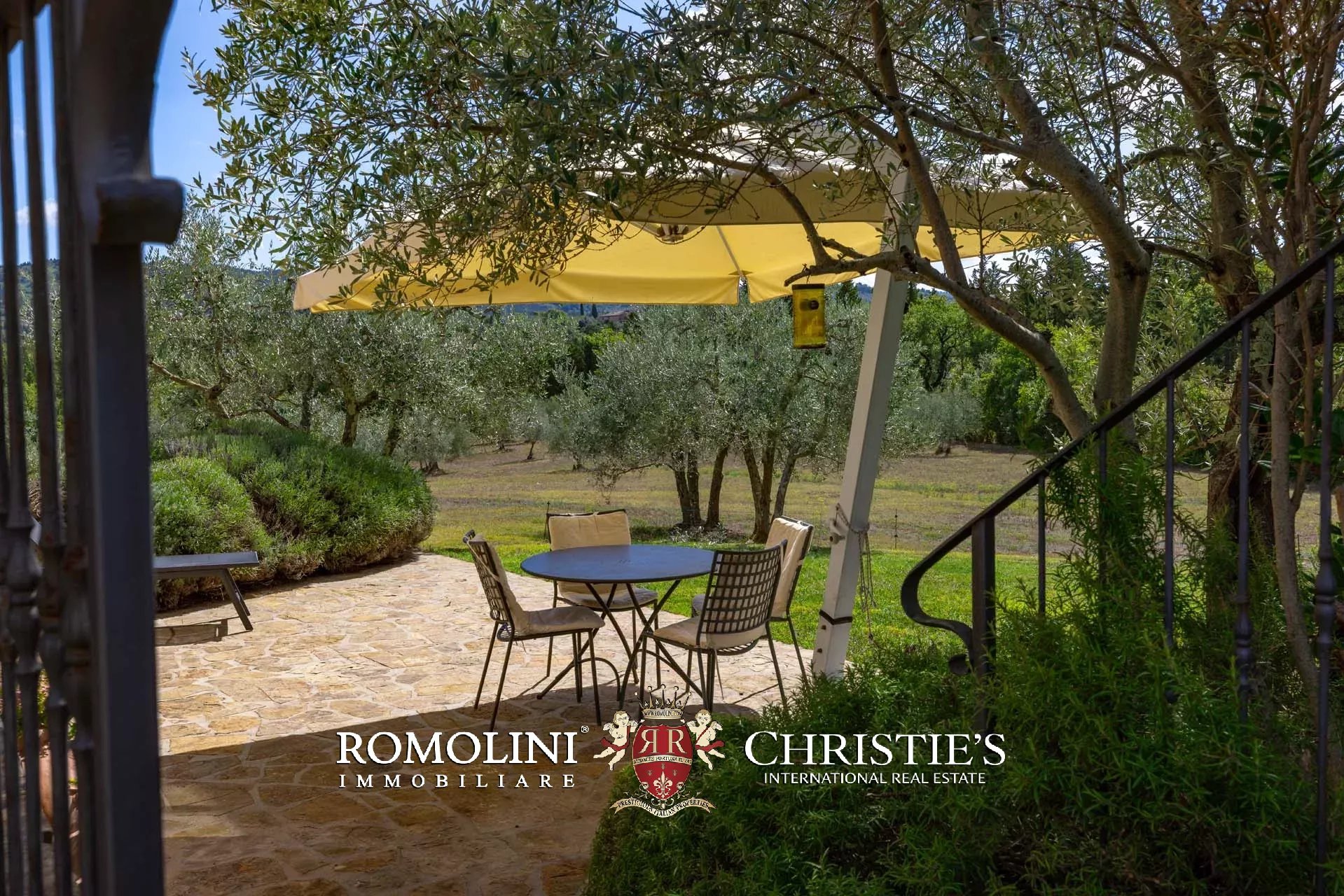 Die Gebäude liegen eingebettet in einen 39.730 m² großen, größtenteils ebenen Garten, der mit Olivenbäumen bewachsen ist, die ein hervorragendes natives Olivenöl extra liefern. Nur wenige Schritte vom Haus entfernt befindet sich der 14 x 5 m große Swimmingpool mit Steinterrasse und Gäste-WC, umgeben von Pflanzen und Sträuchern.