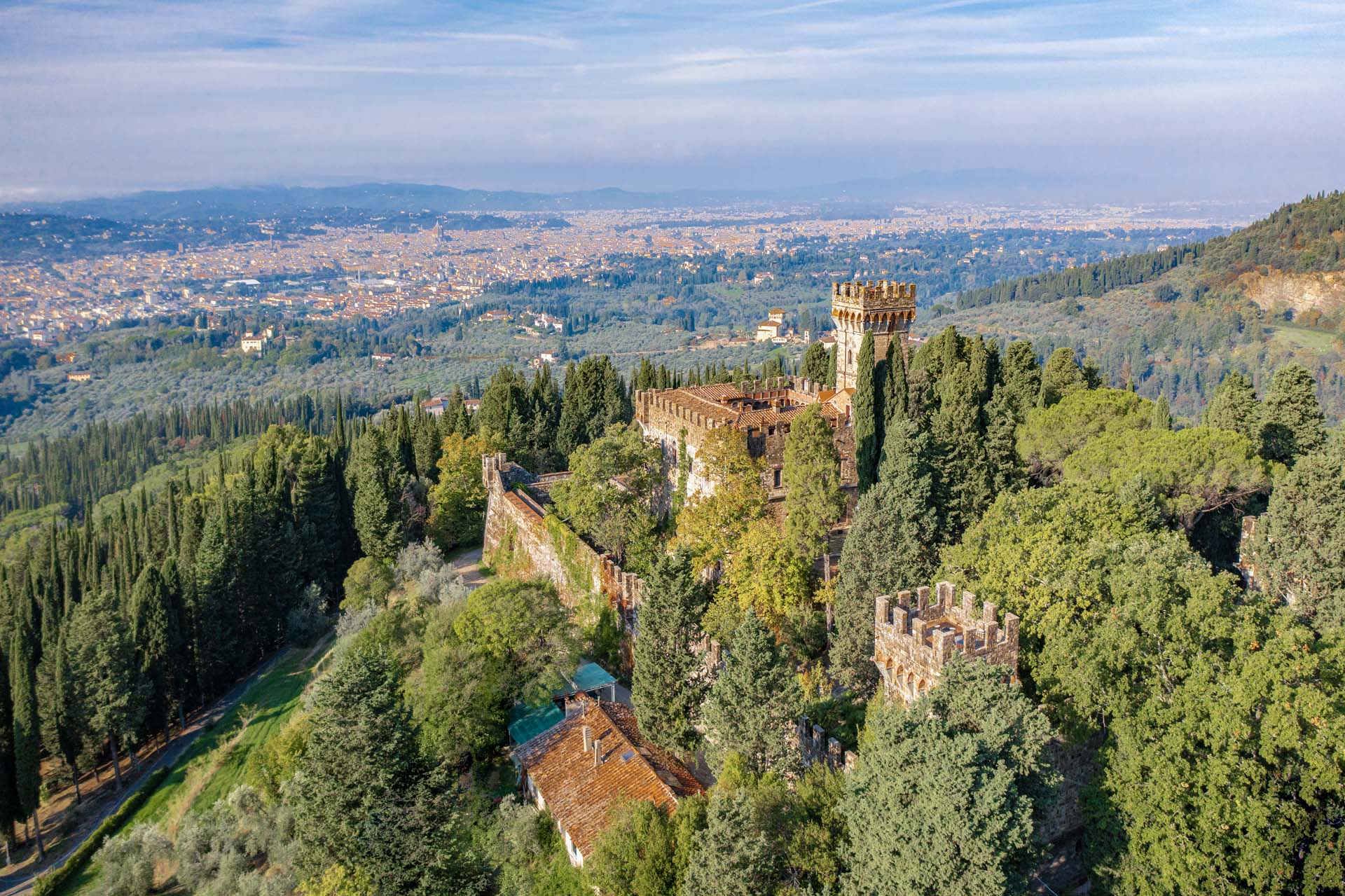 Just a short drive from Florence, this majestic castle was masterfully restored at the end of the 19th century and has a rich history dating back to 1031. The impressive primary building extends across 10,598 sqft (985 sqm) and can be configured with up to 8 bedrooms and 12 bathrooms. Beautiful halls with vaulted ceilings, marble floors, and wooden fixtures encompass numerous spaces for hosting and entertaining, while breathtaking views can be enjoyed from the vast terraces and a chemin de ronde—a walkway that runs around the entire top floor.