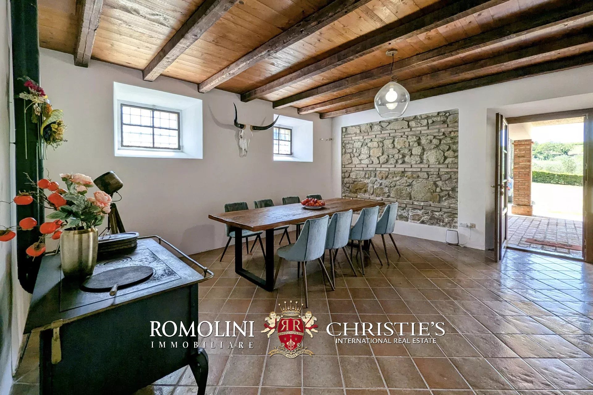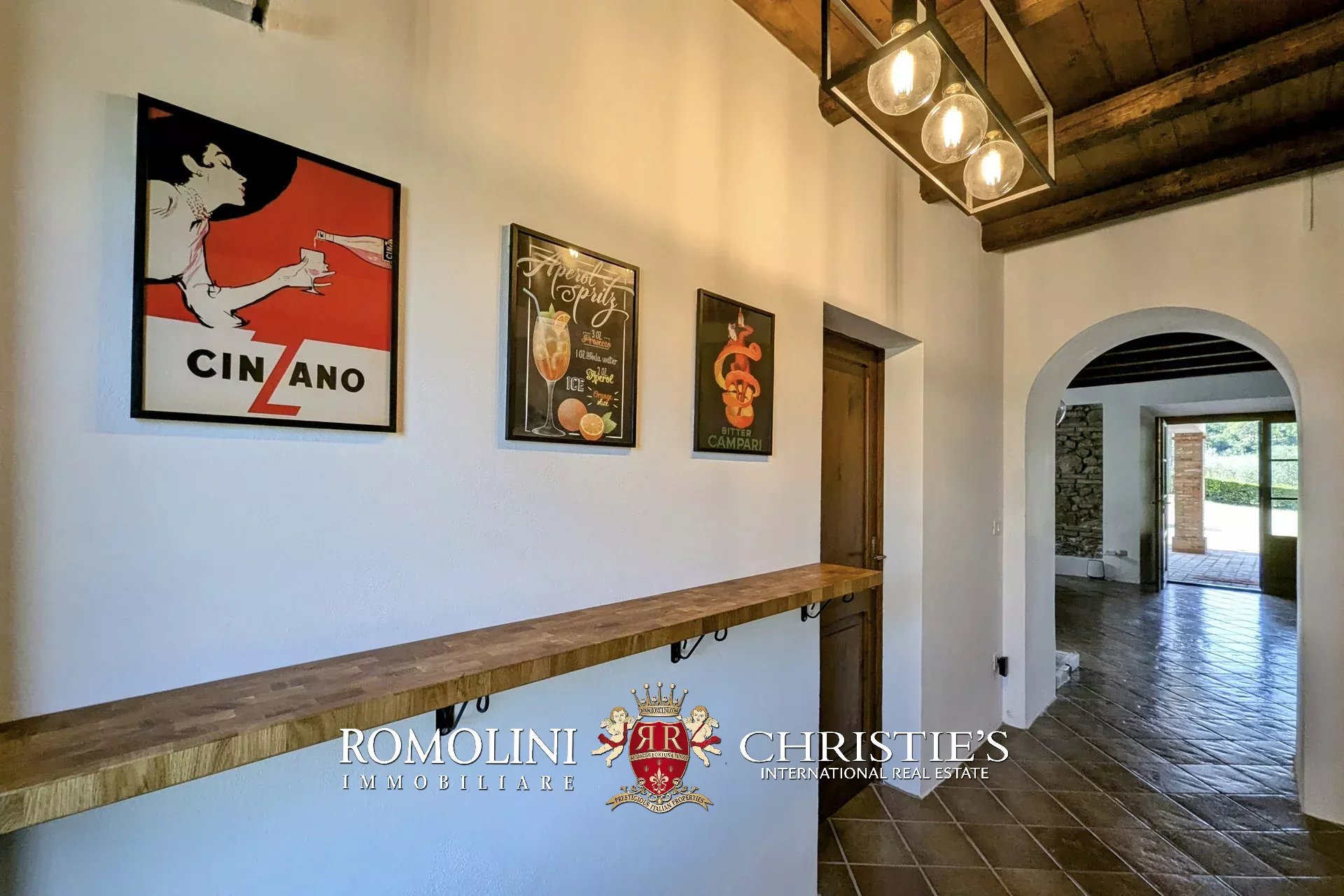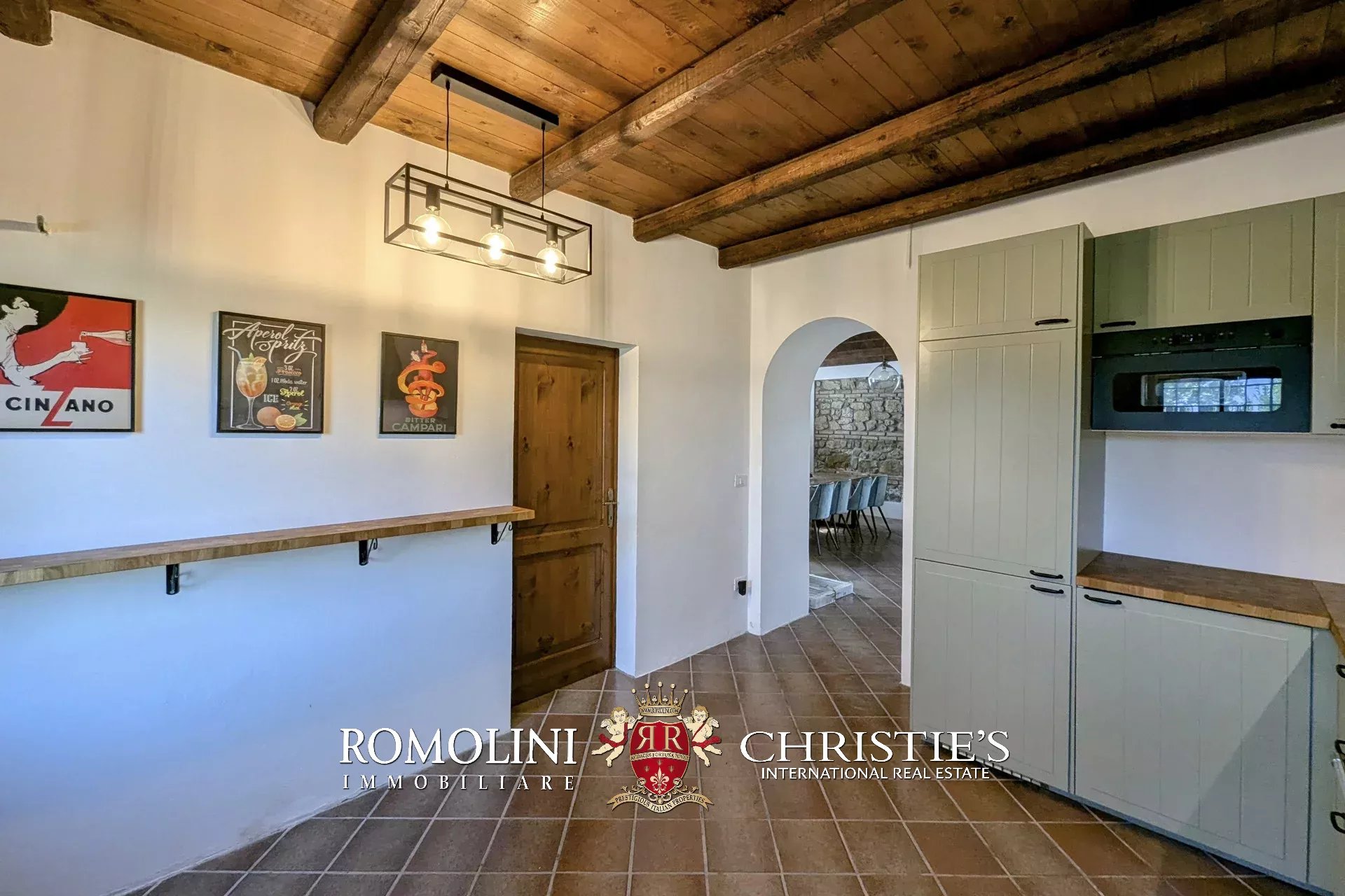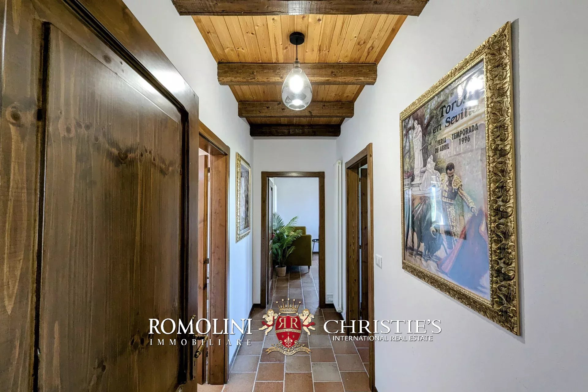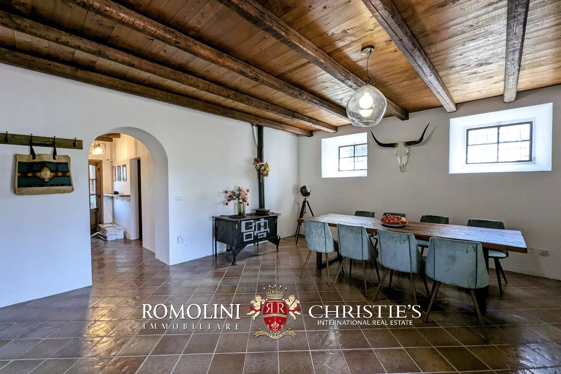 - Erdgeschoss: Wohnzimmer, Küche, Badezimmer, großer, antiker Stall – der zurzeit als Lagerraum genutzt wird, aber in unterschiedlicher Weisen genutzt werden kann – und ein 38 m² großer Portikus.