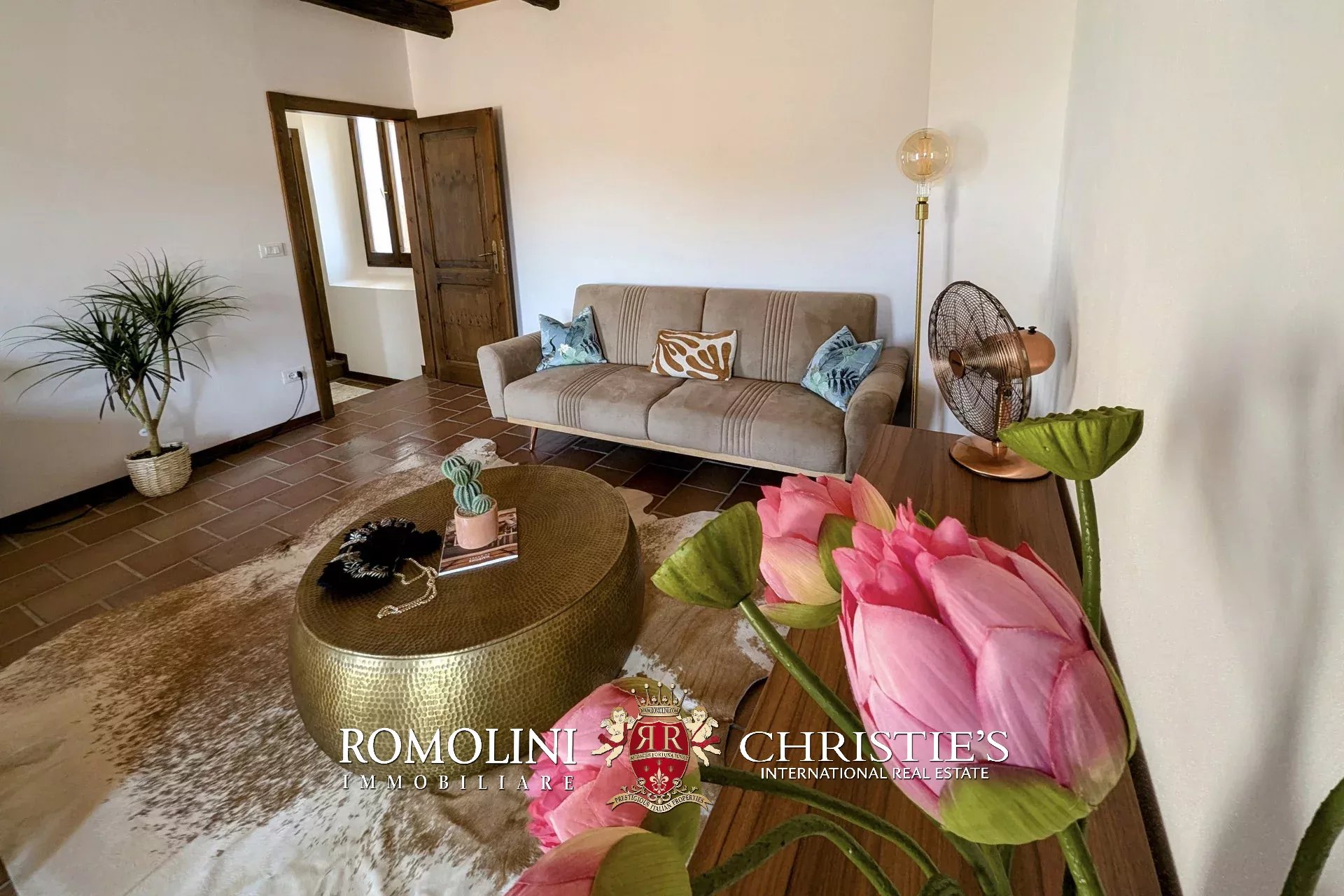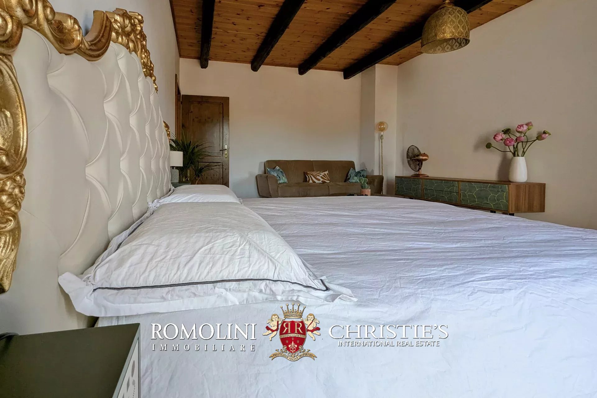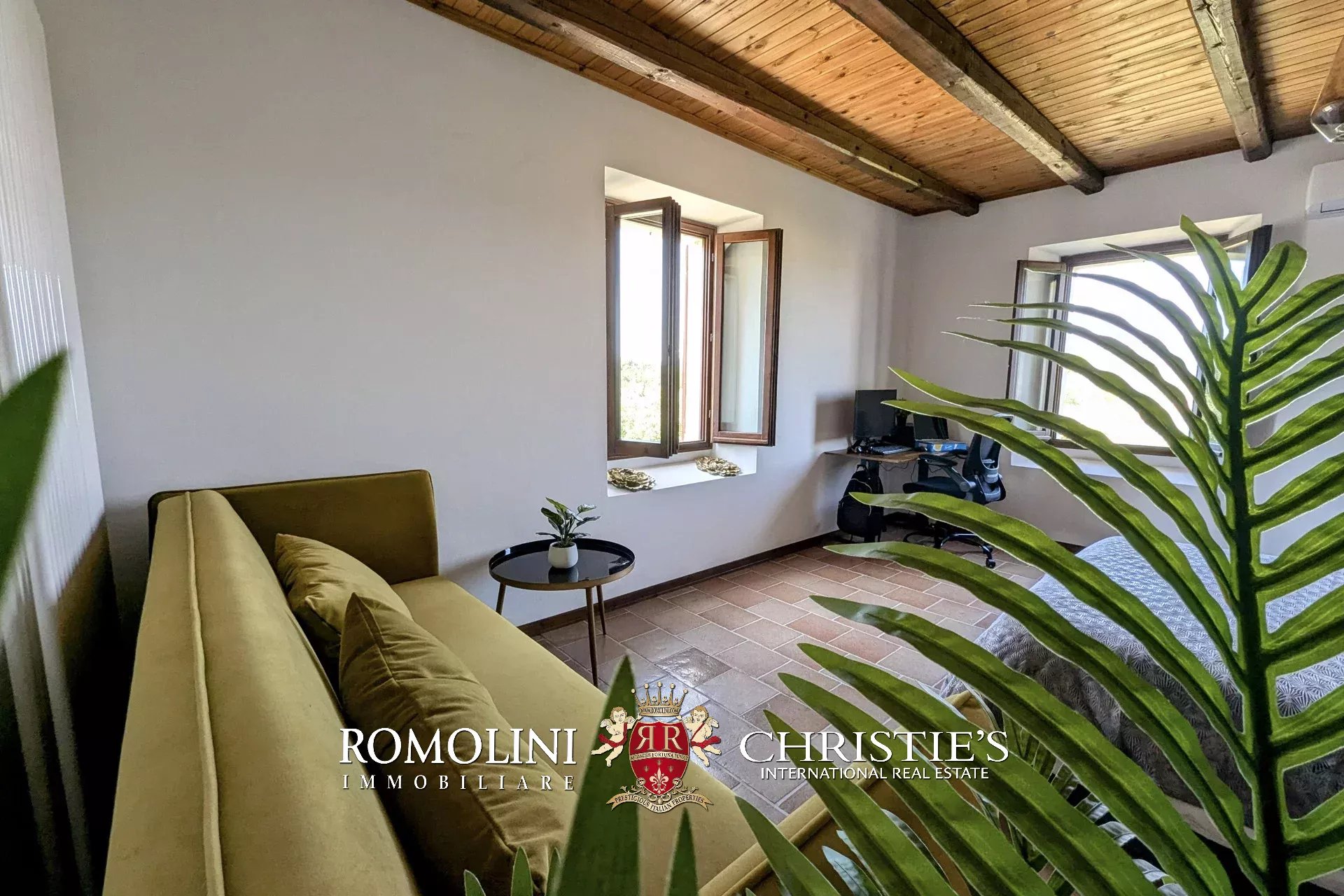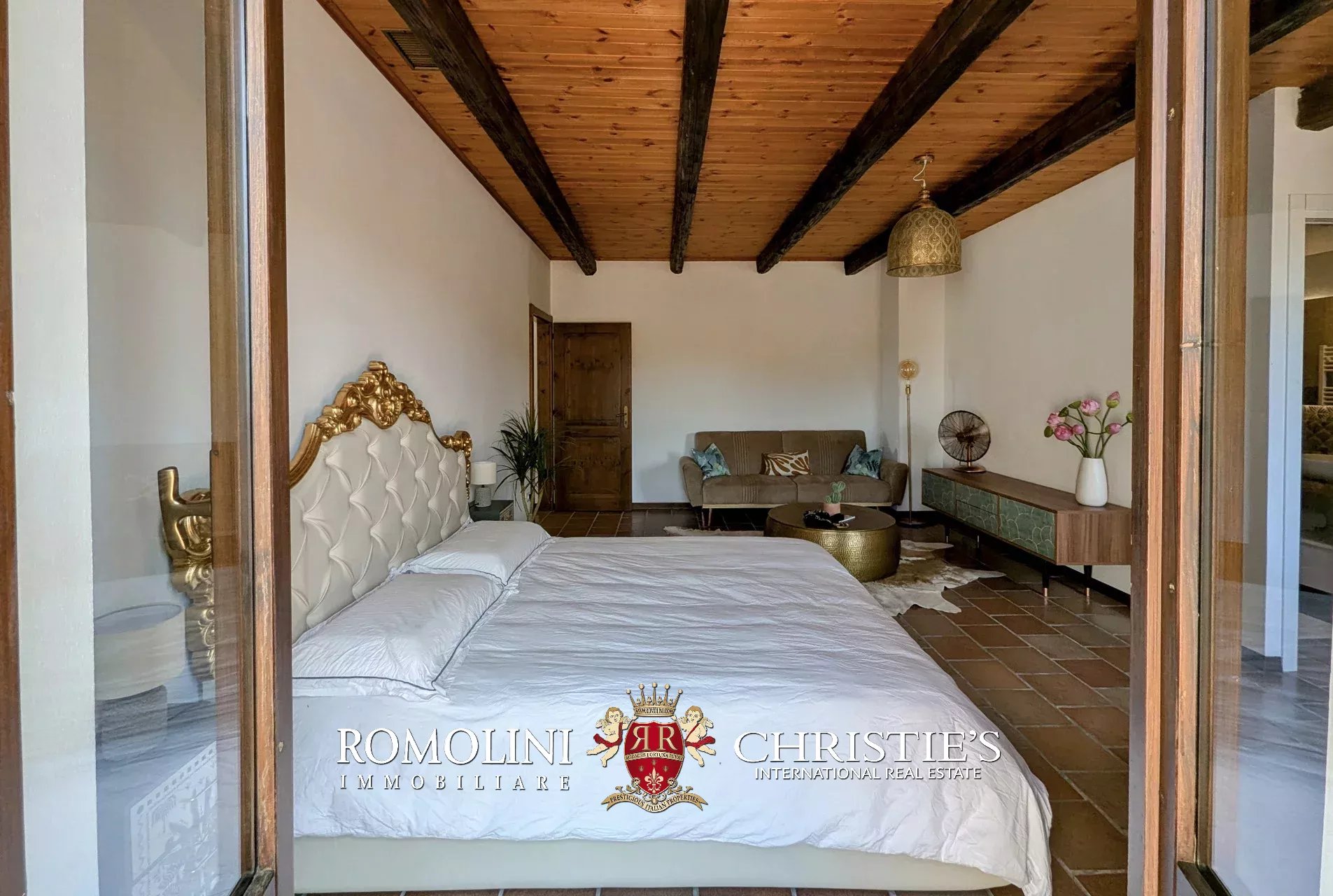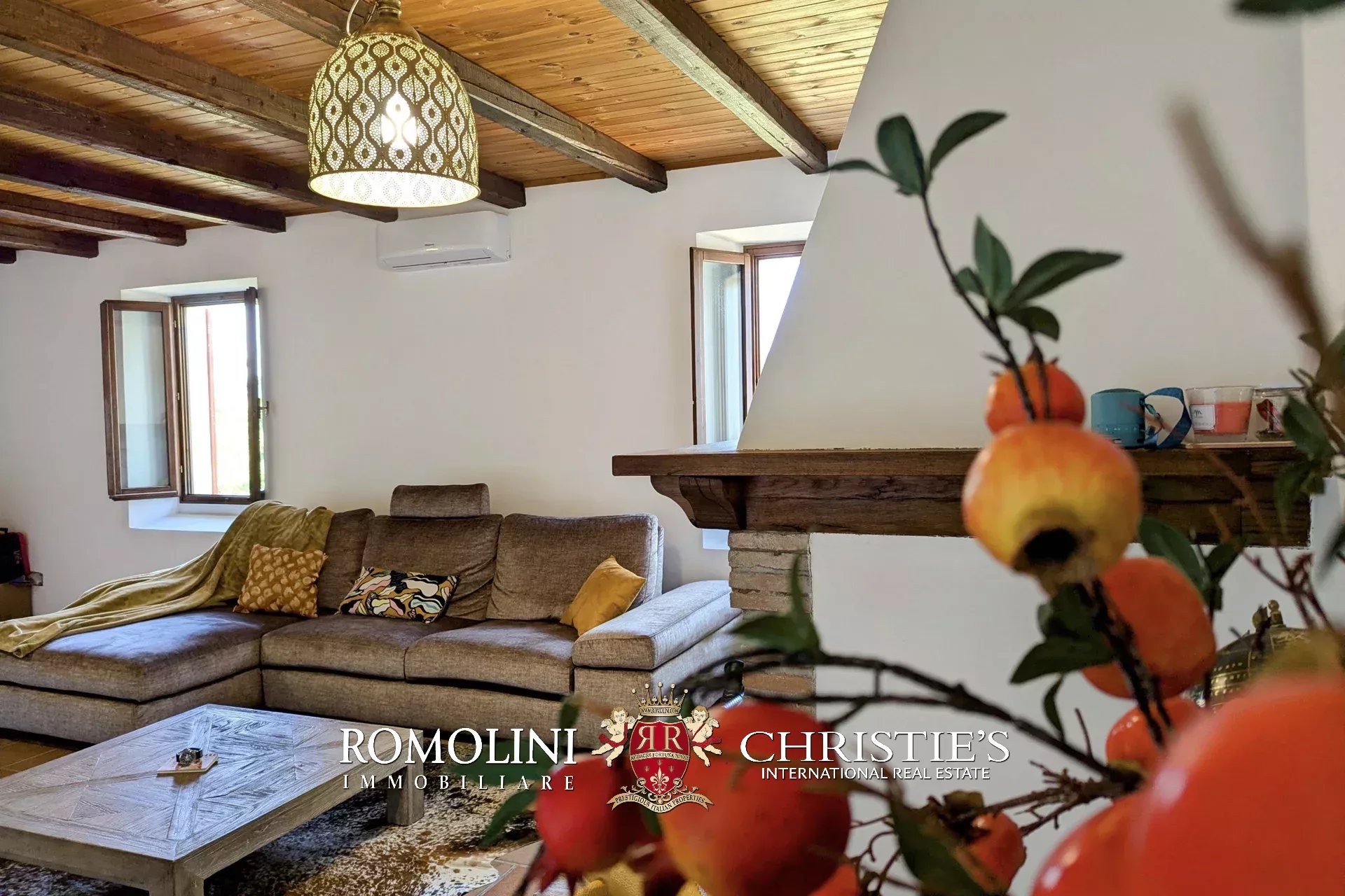 - Erdgeschoss: Wohnzimmer, Küche, Badezimmer, großer, antiker Stall – der zurzeit als Lagerraum genutzt wird, aber in unterschiedlicher Weisen genutzt werden kann – und ein 38 m² großer Portikus.