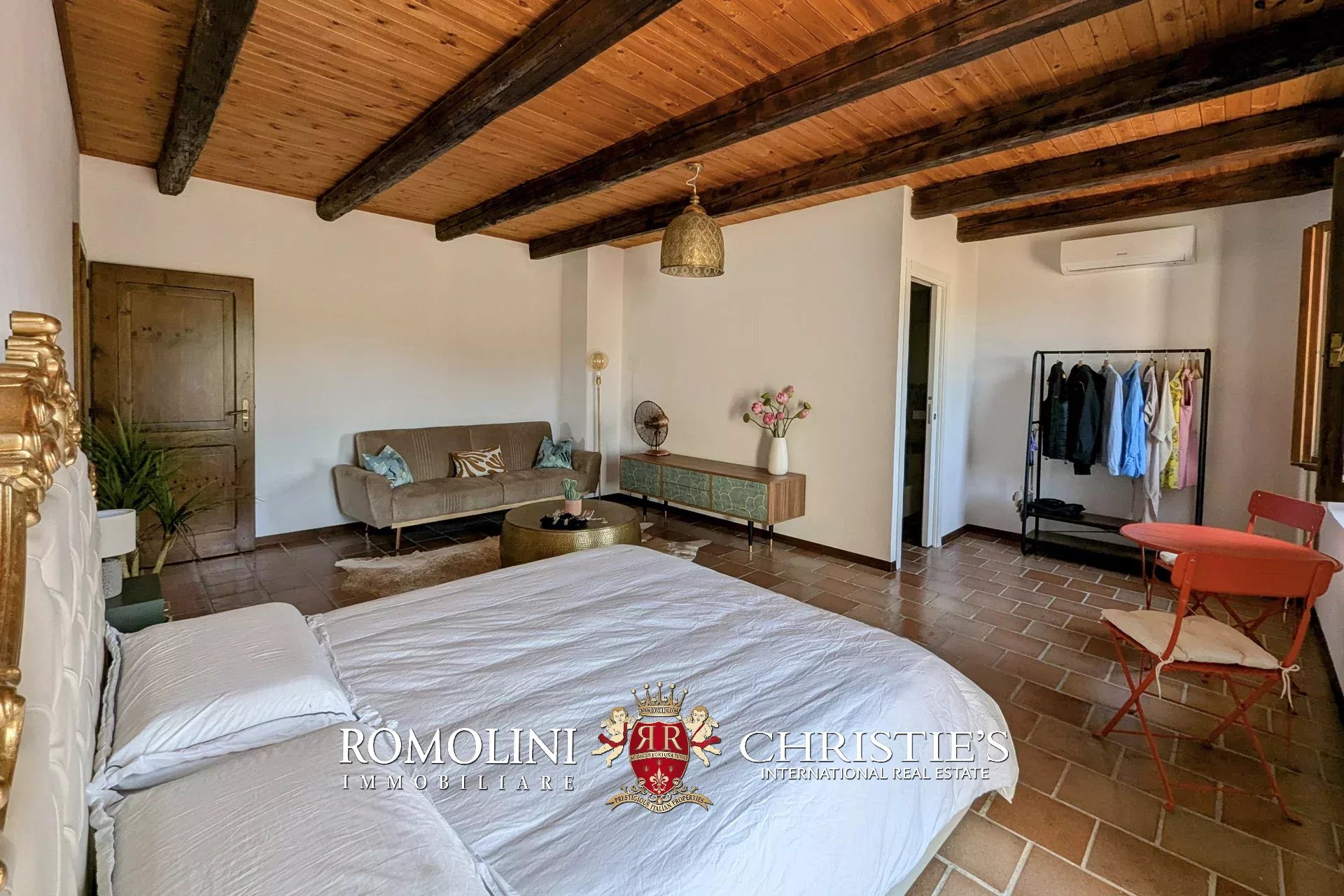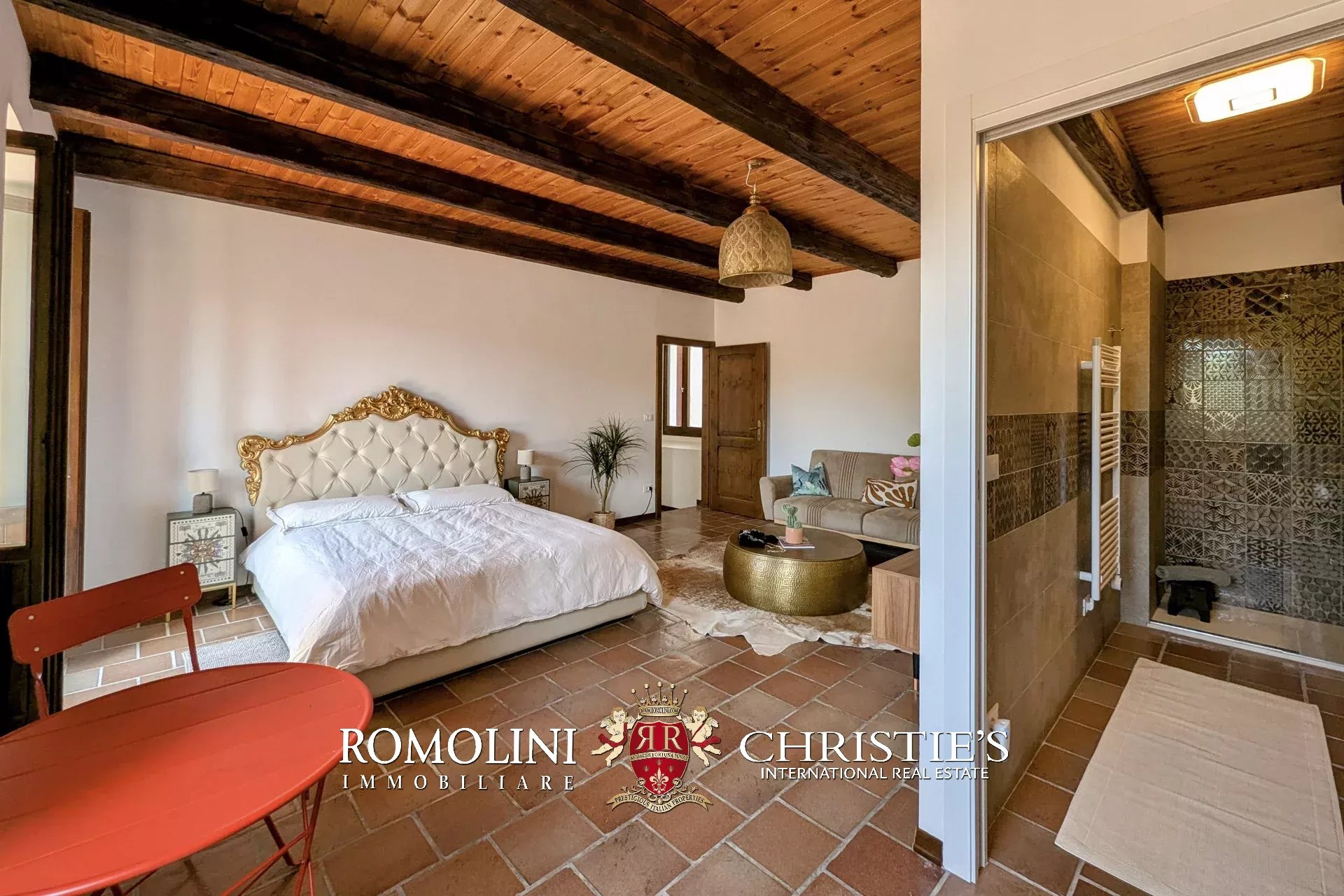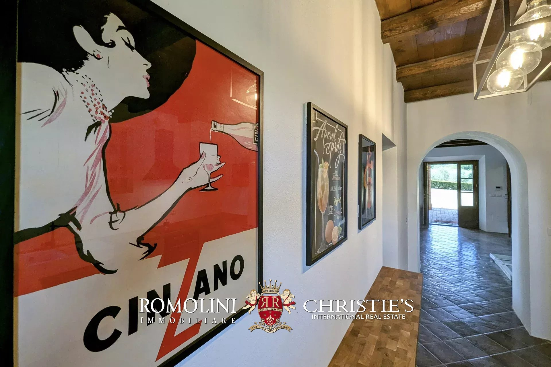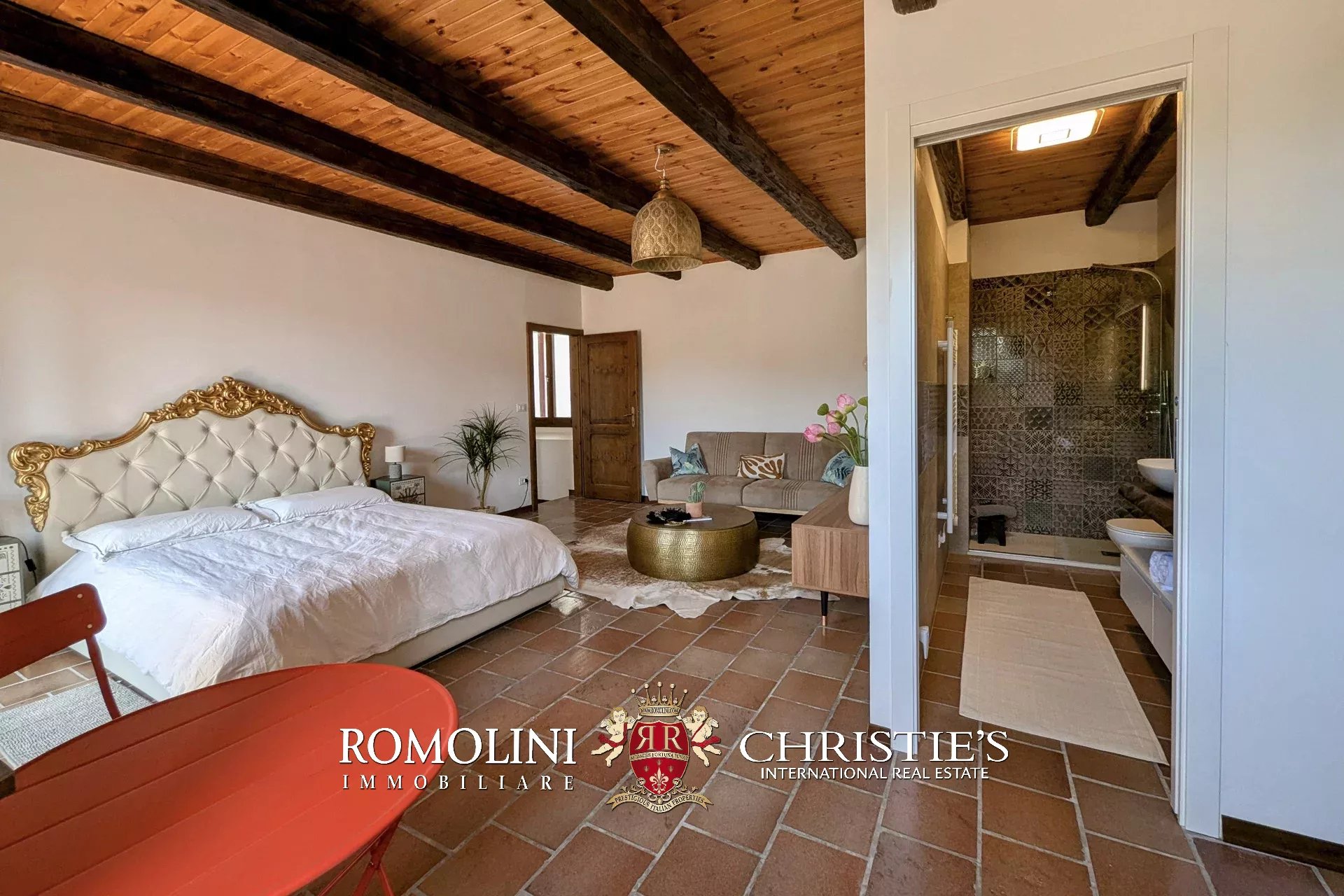 - Erdgeschoss: Wohnzimmer, Küche, Badezimmer, großer, antiker Stall – der zurzeit als Lagerraum genutzt wird, aber in unterschiedlicher Weisen genutzt werden kann – und ein 38 m² großer Portikus.