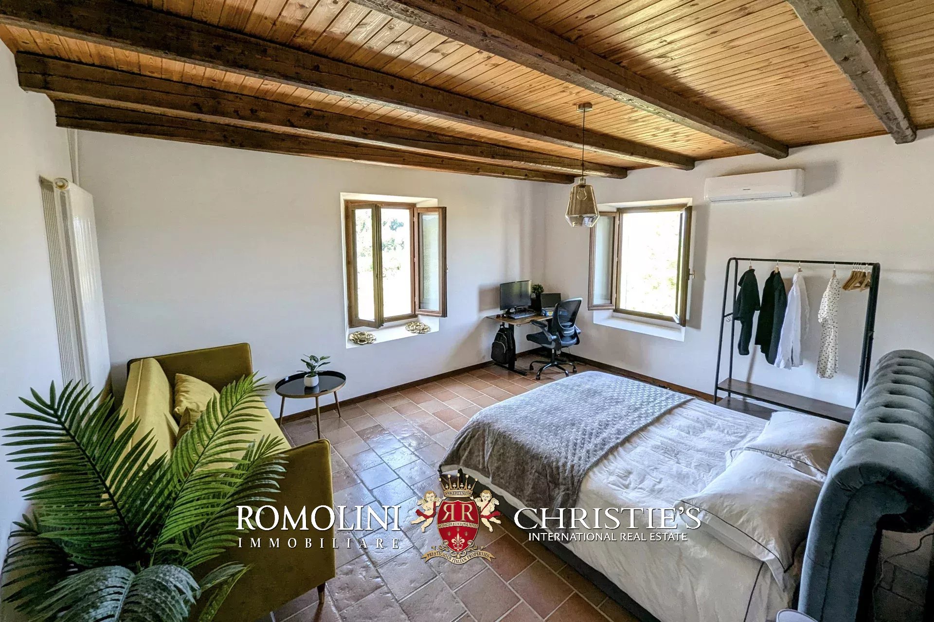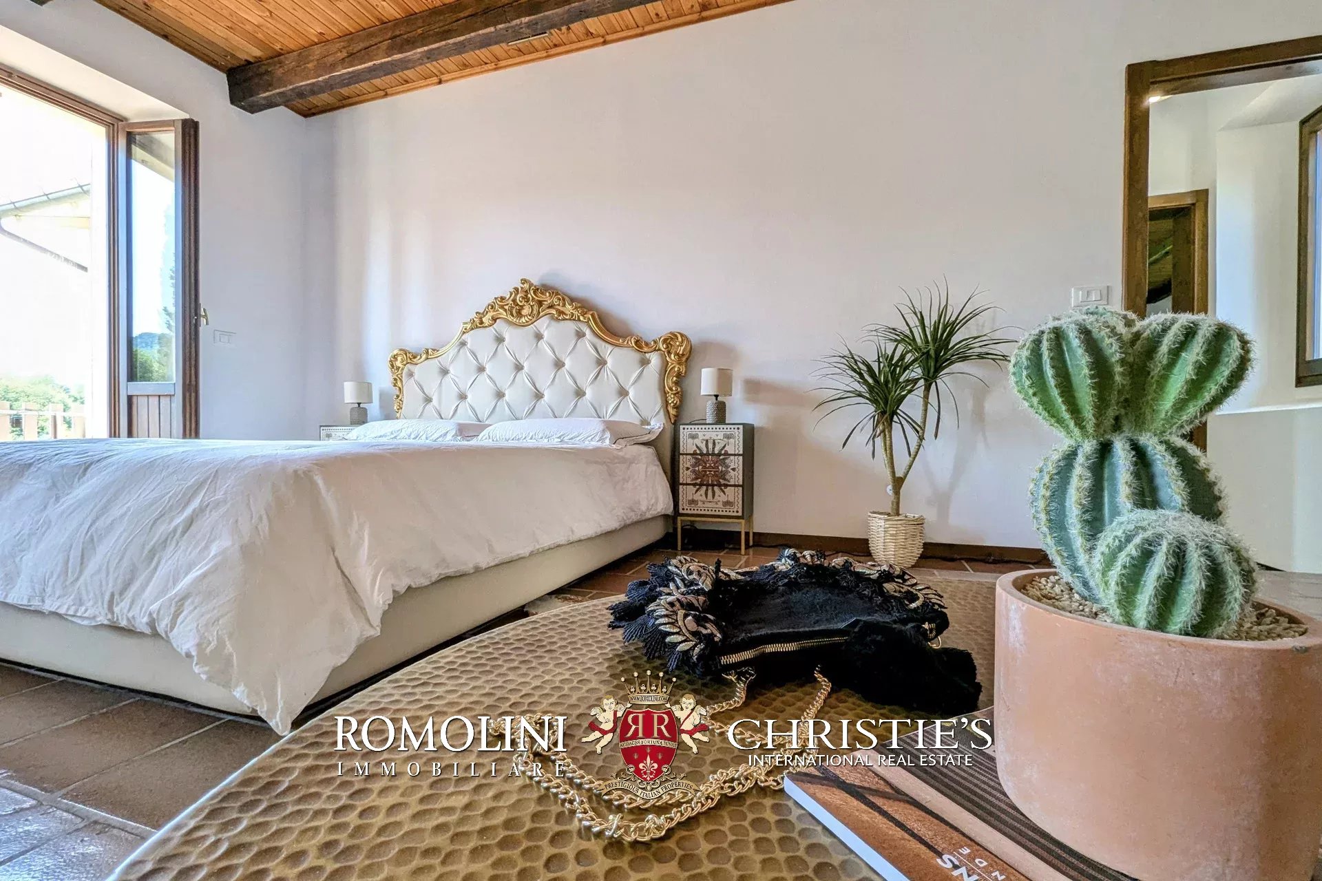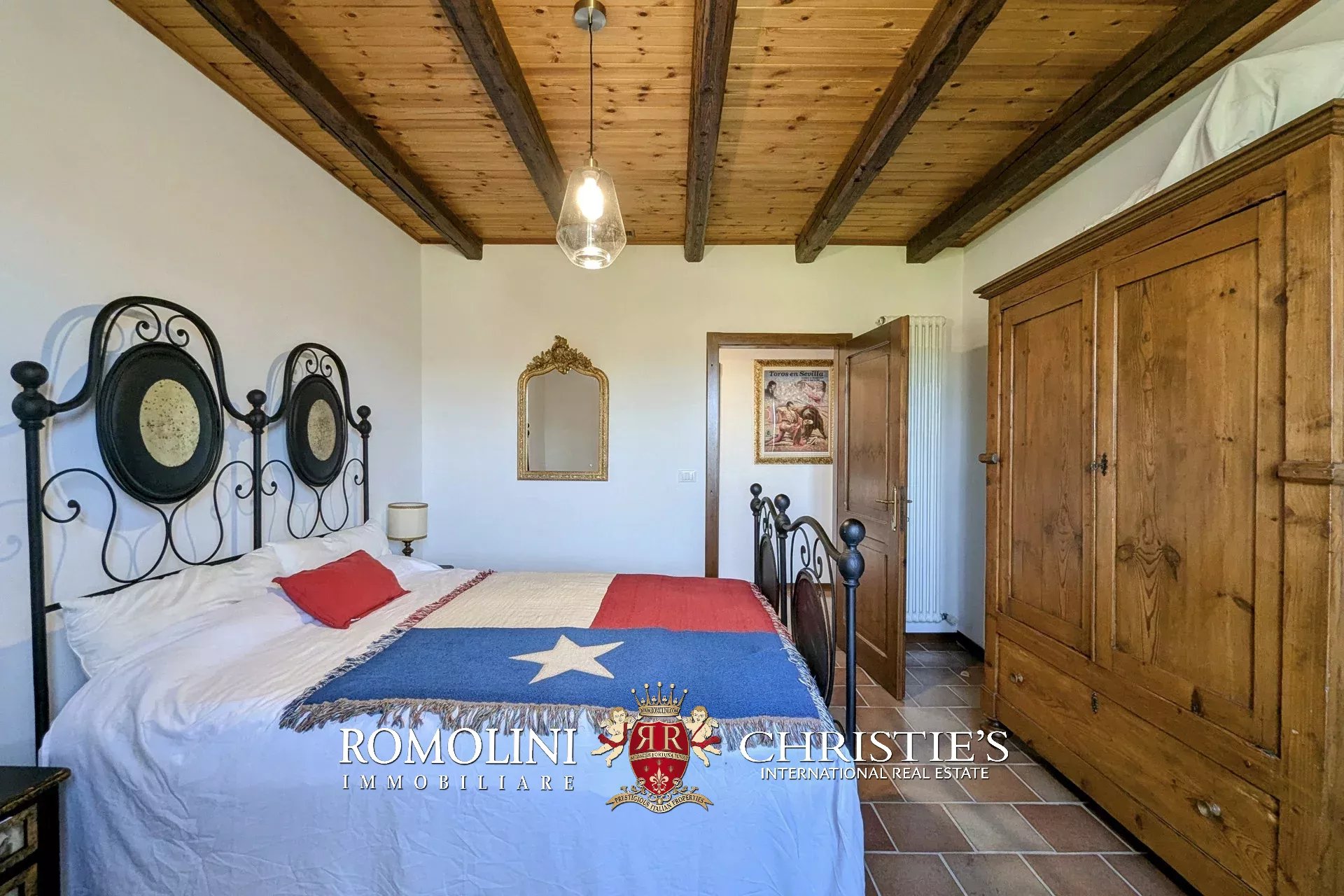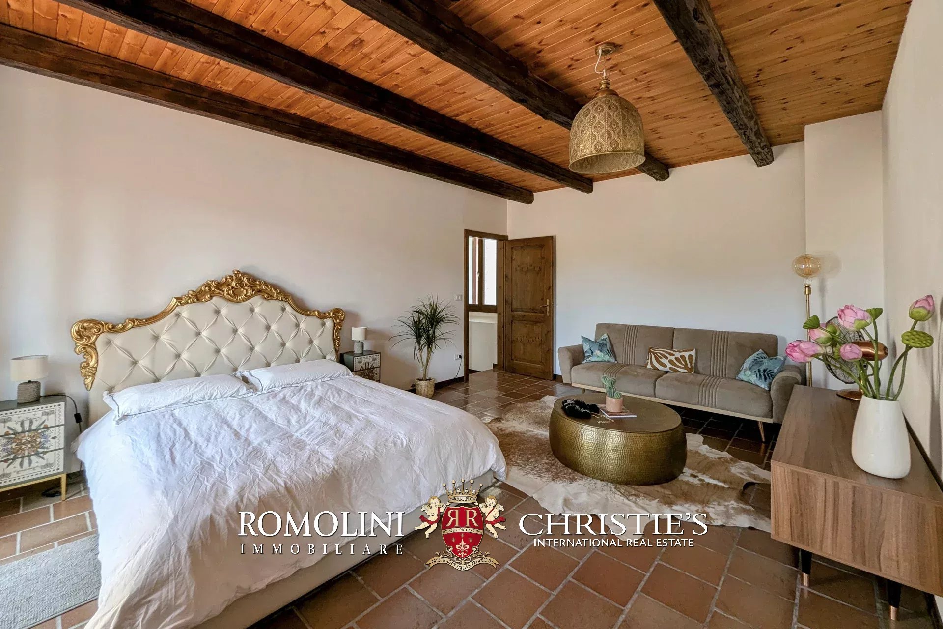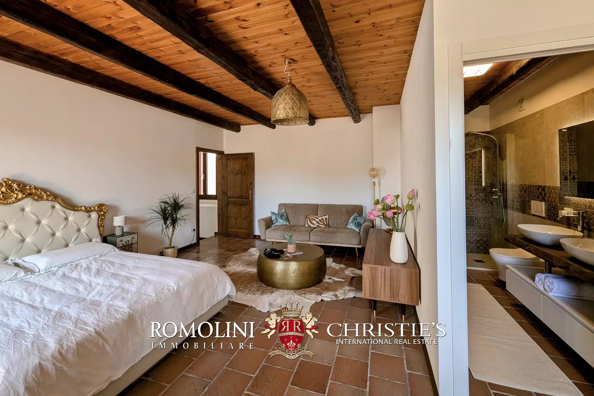 - Erdgeschoss: Wohnzimmer, Küche, Badezimmer, großer, antiker Stall – der zurzeit als Lagerraum genutzt wird, aber in unterschiedlicher Weisen genutzt werden kann – und ein 38 m² großer Portikus.