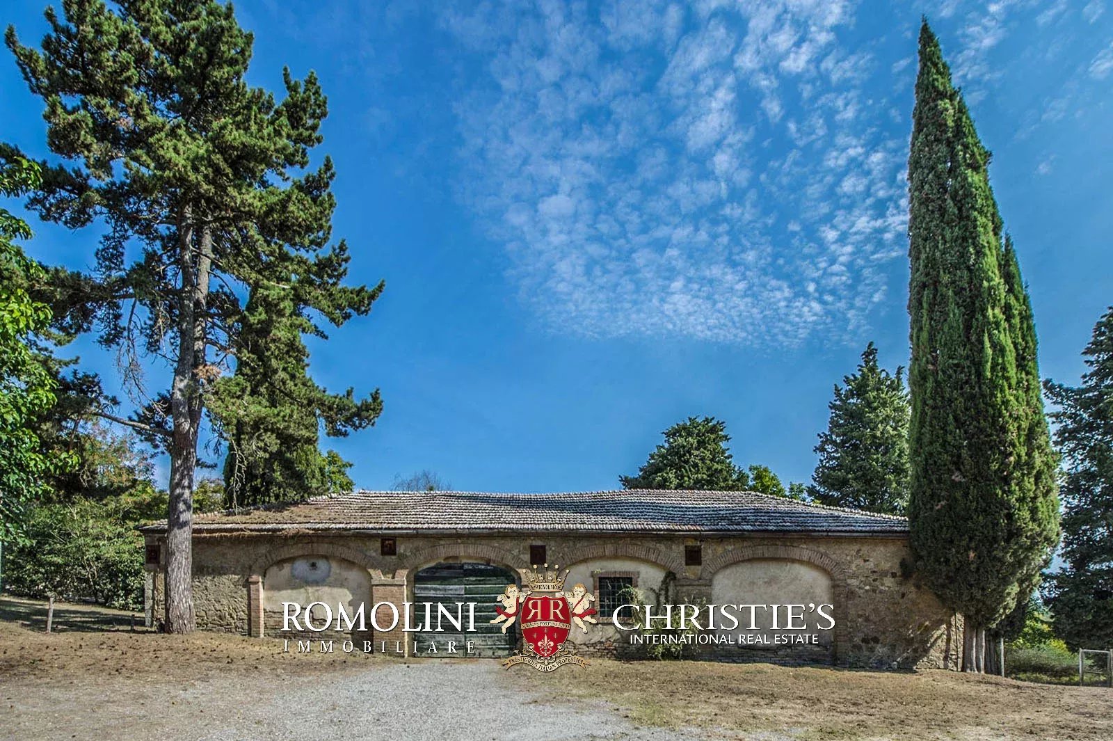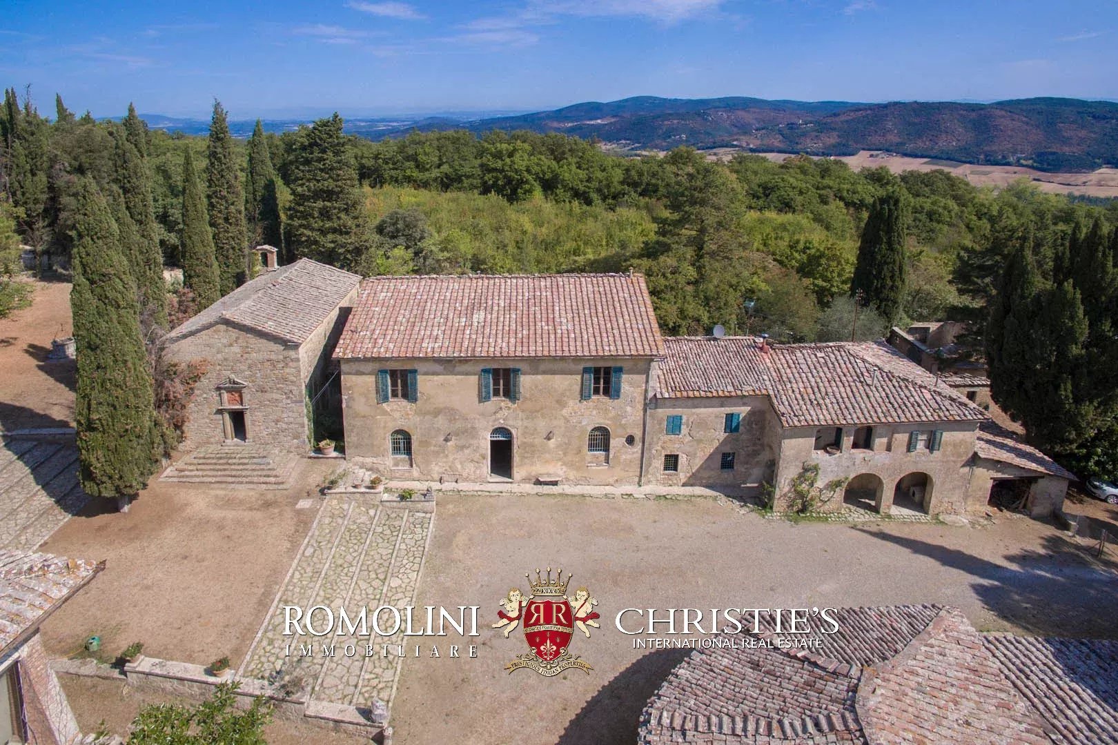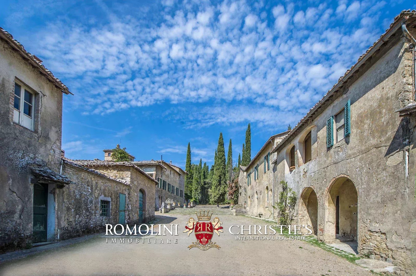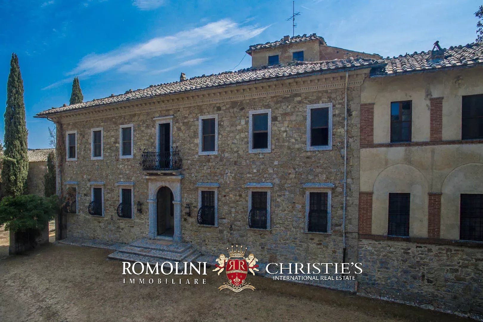 In the Sienese countryside, heart of Tuscany, 160 hectares estate with manor house, church and farmhouses. Easily accessed via a private unpaved road, the property is built among the hills and is made up of several farms to be restored.