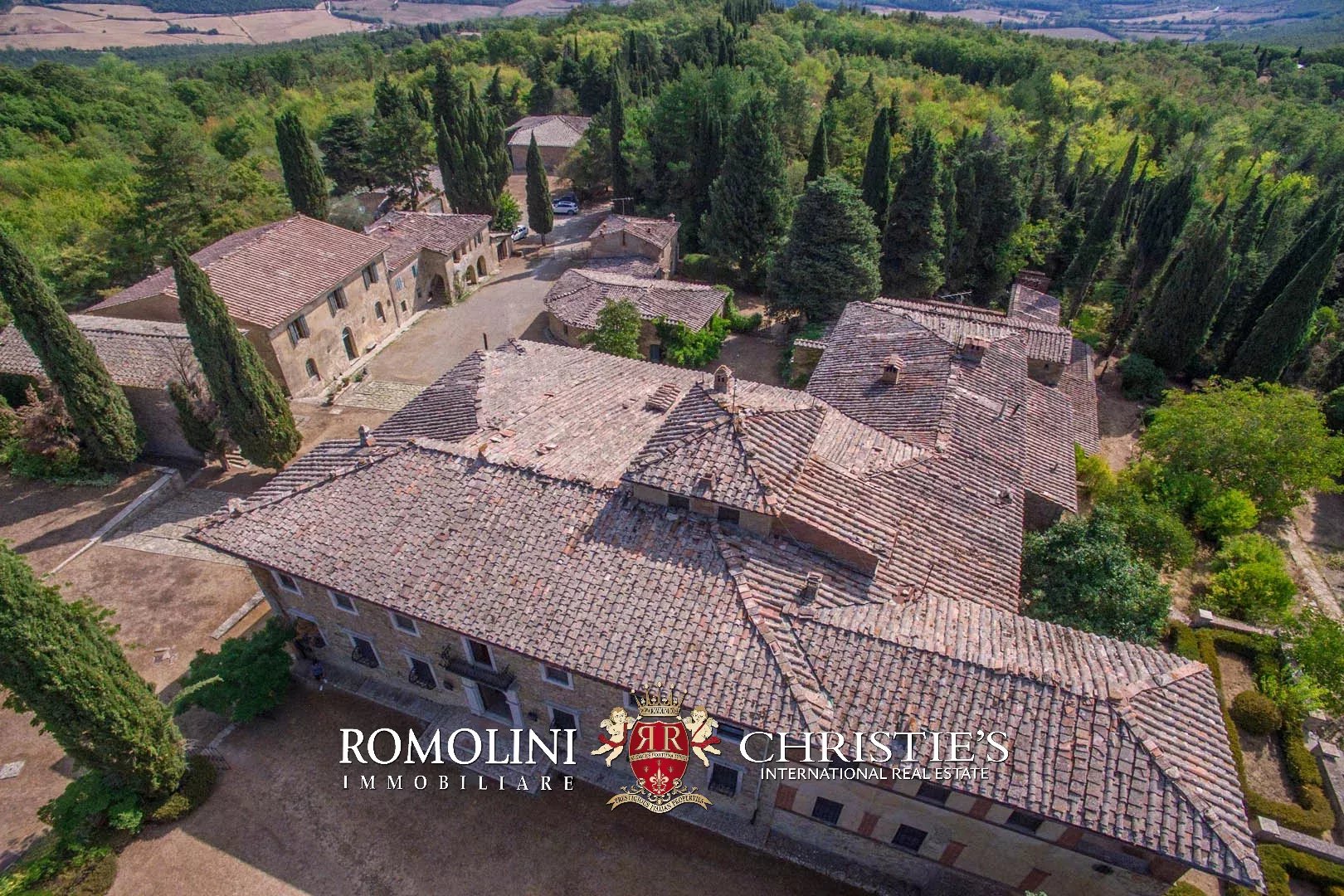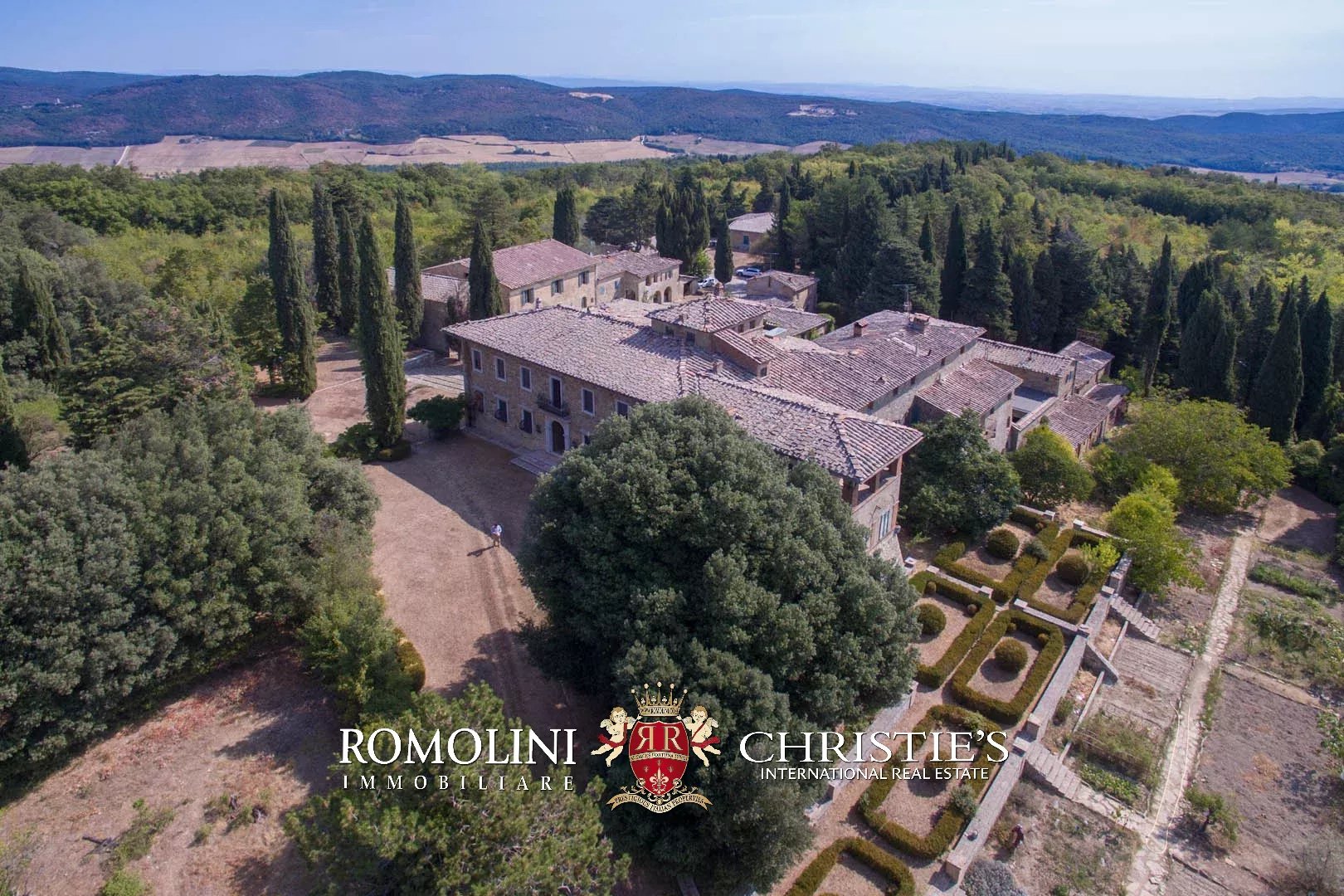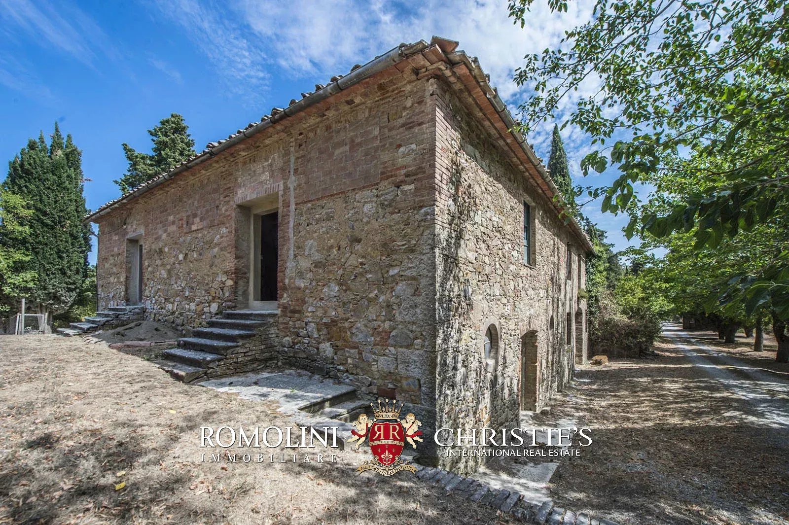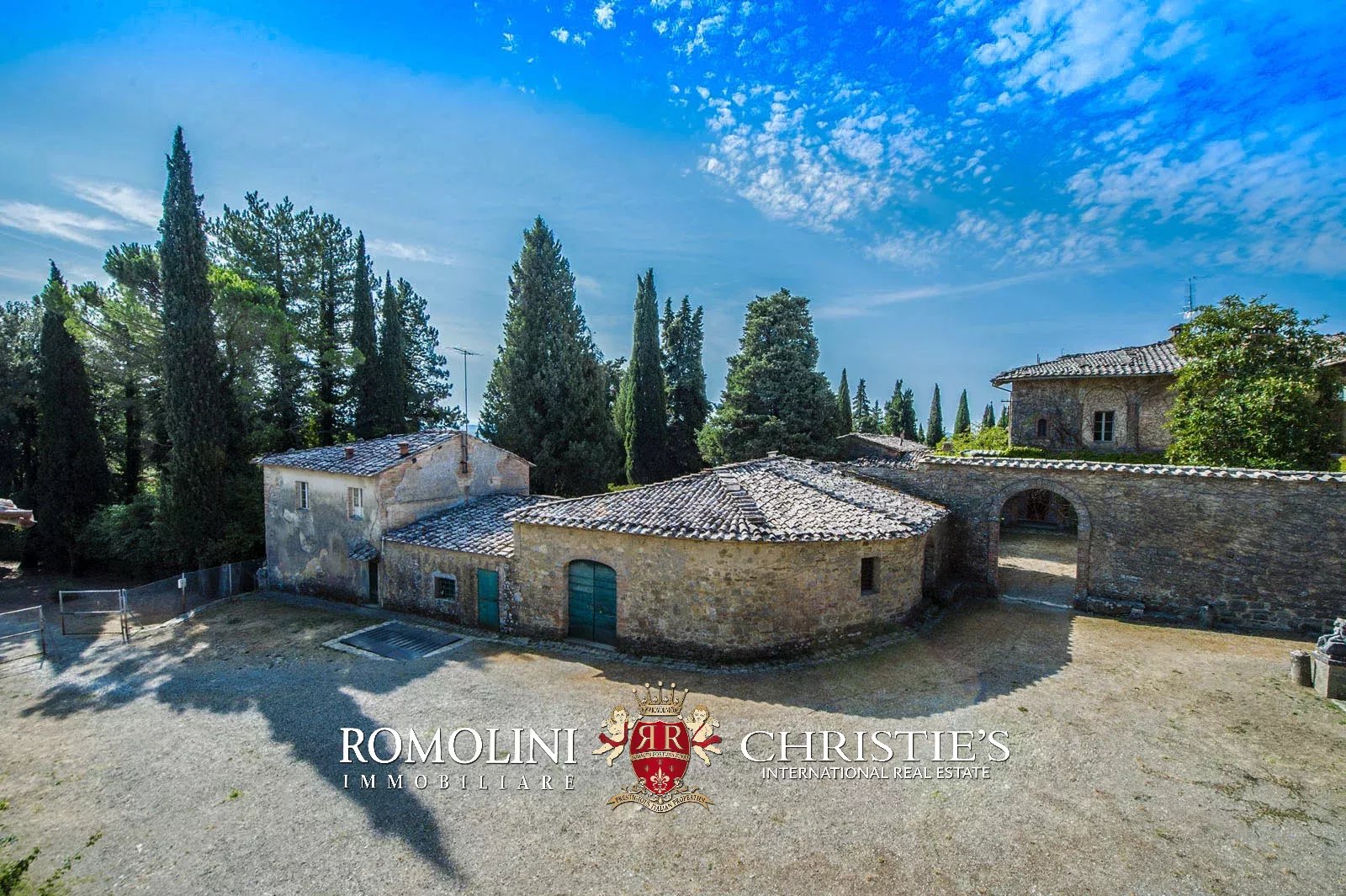 In the Sienese countryside, heart of Tuscany, 160 hectares estate with manor house, church and farmhouses. Easily accessed via a private unpaved road, the property is built among the hills and is made up of several farms to be restored.