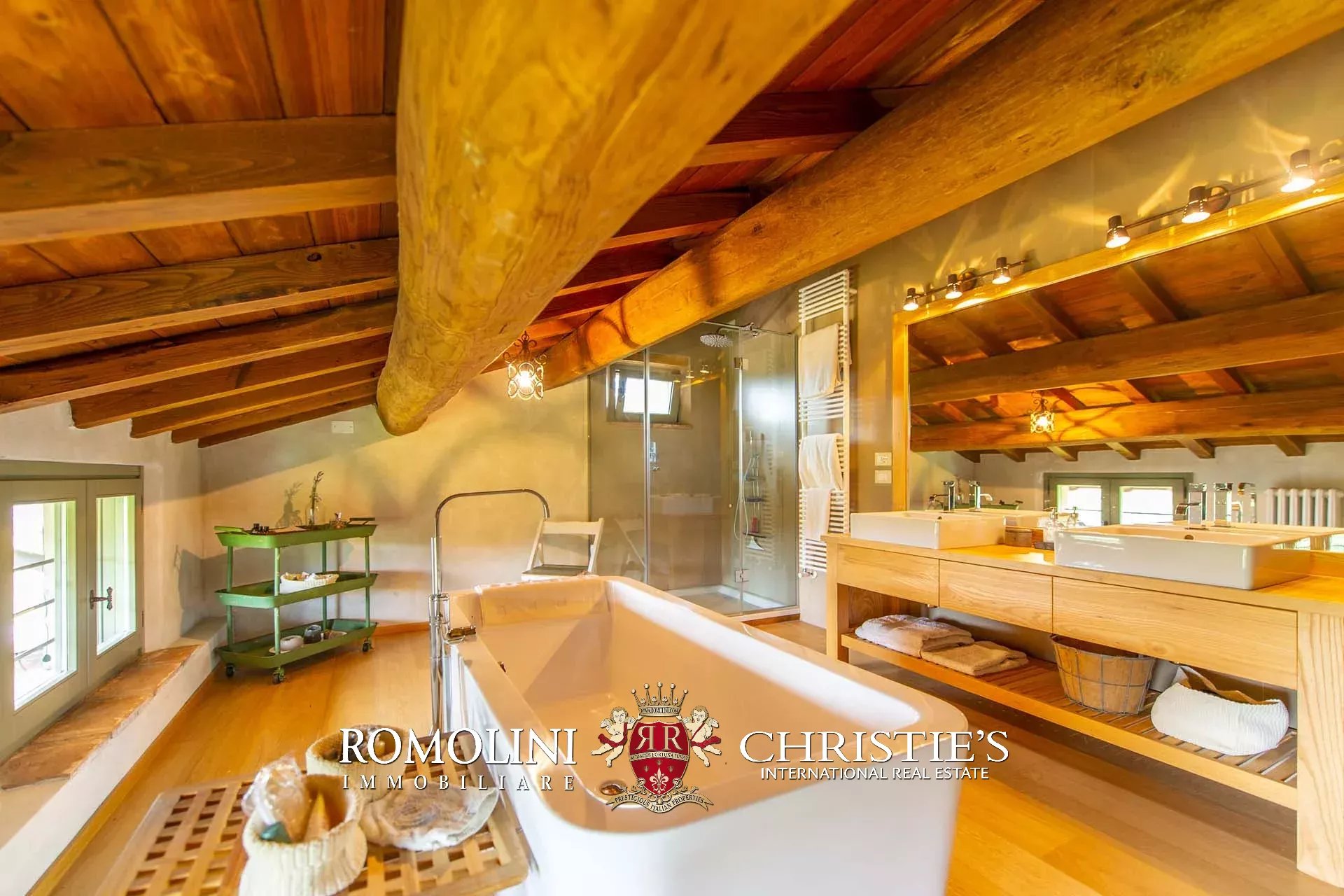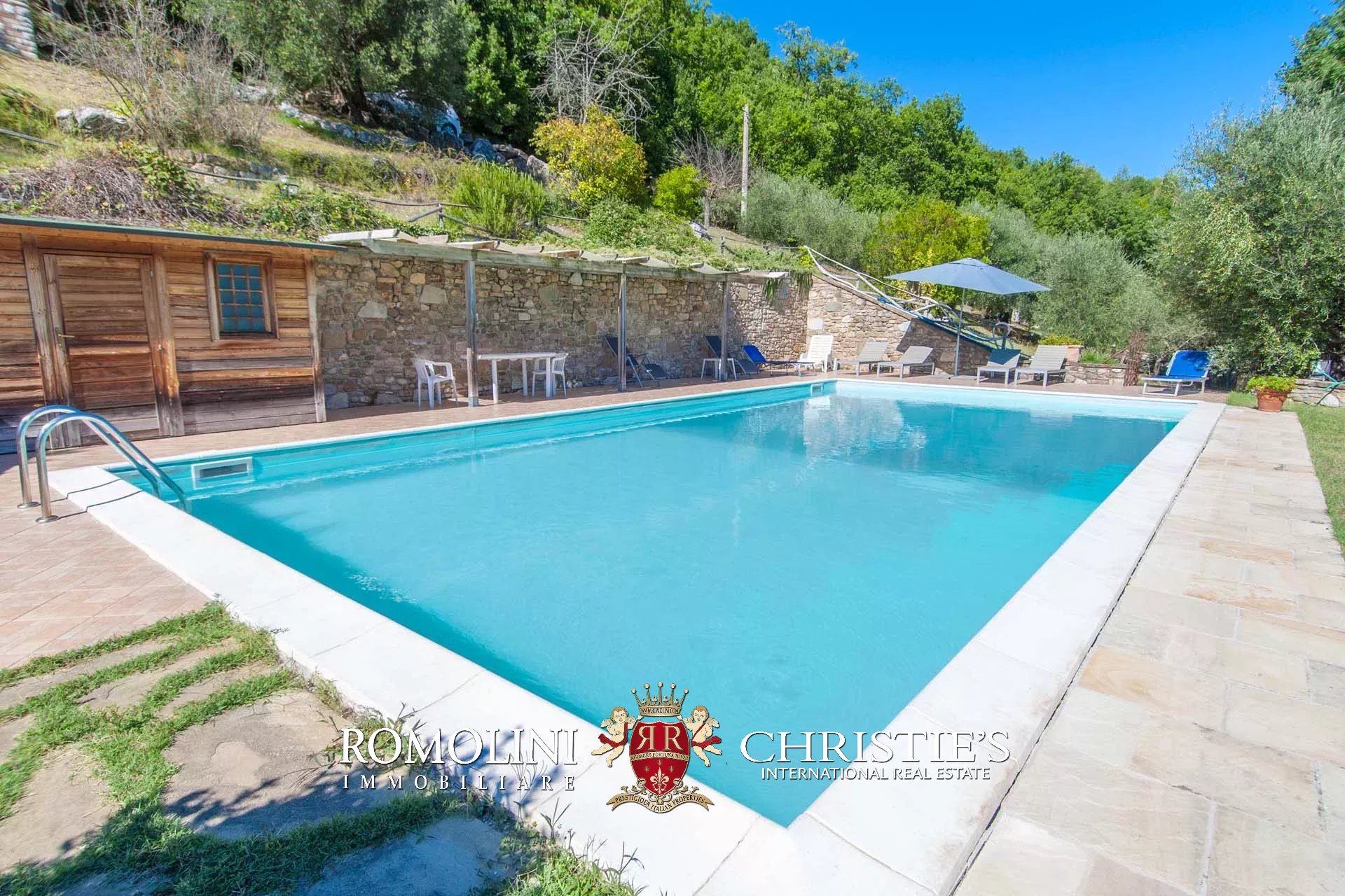 The farmhouse, next to the ample paved terrace on the rear, boasts a stone oven and a 2,000-sqm terraced garden. Just below the farmhouse, there is the 12 × 7 m swimming pool with terracotta-paved sun bed area and 40-feet custom-made pergola for shade: this spot is ideal for a dip with cocktails after a day of touring the surroundings.