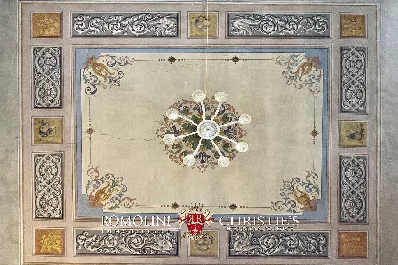 Particularly interesting is the ceiling of the bedroom on the lower floor, painted with geometric and floral patterns that recall the grotesque motives from the late Renaissance.