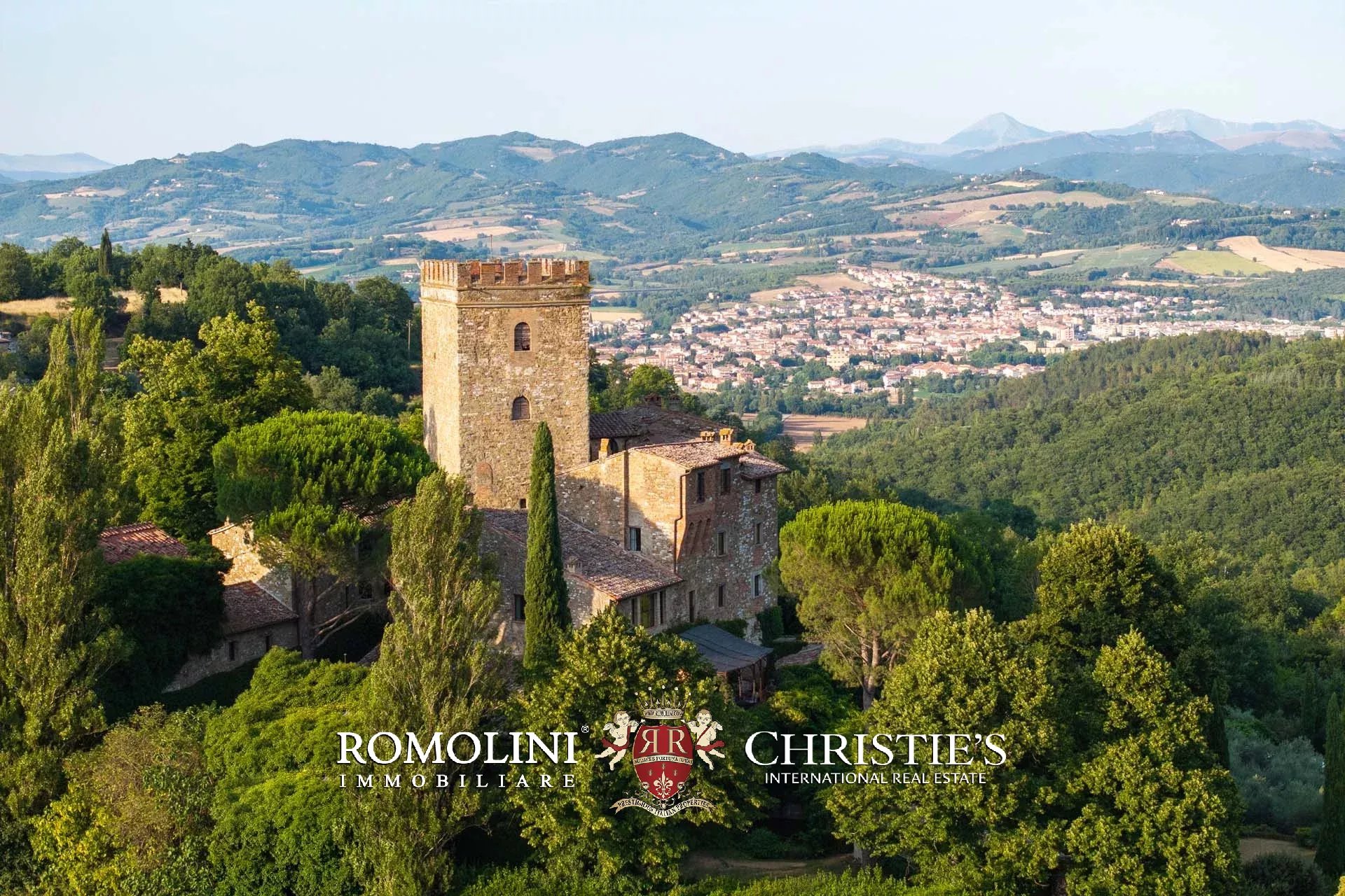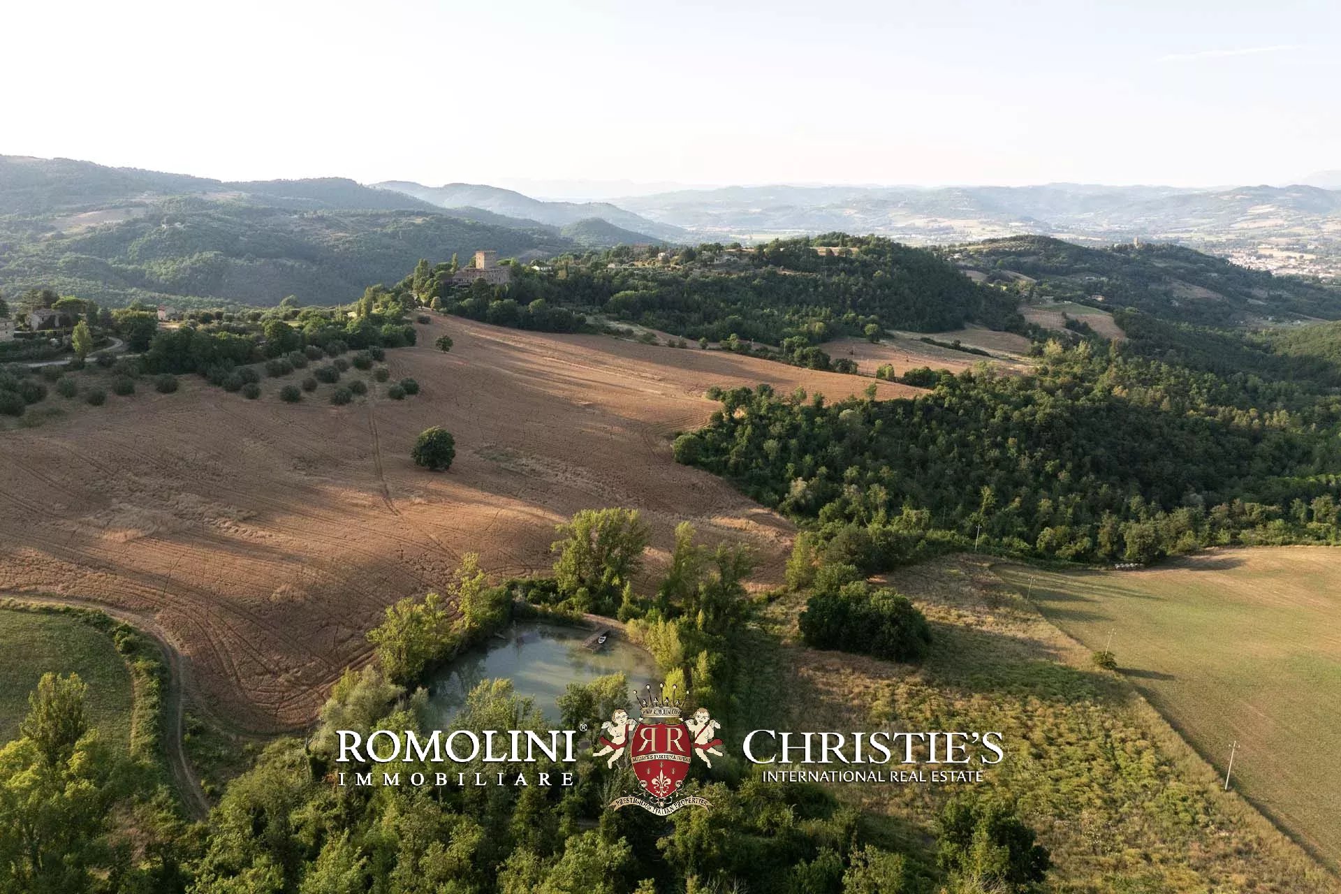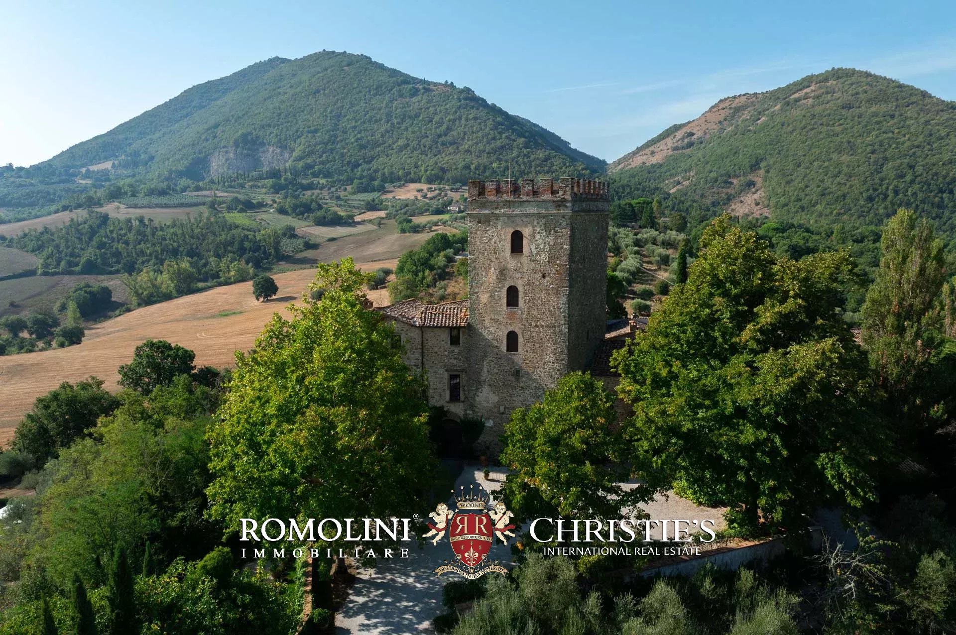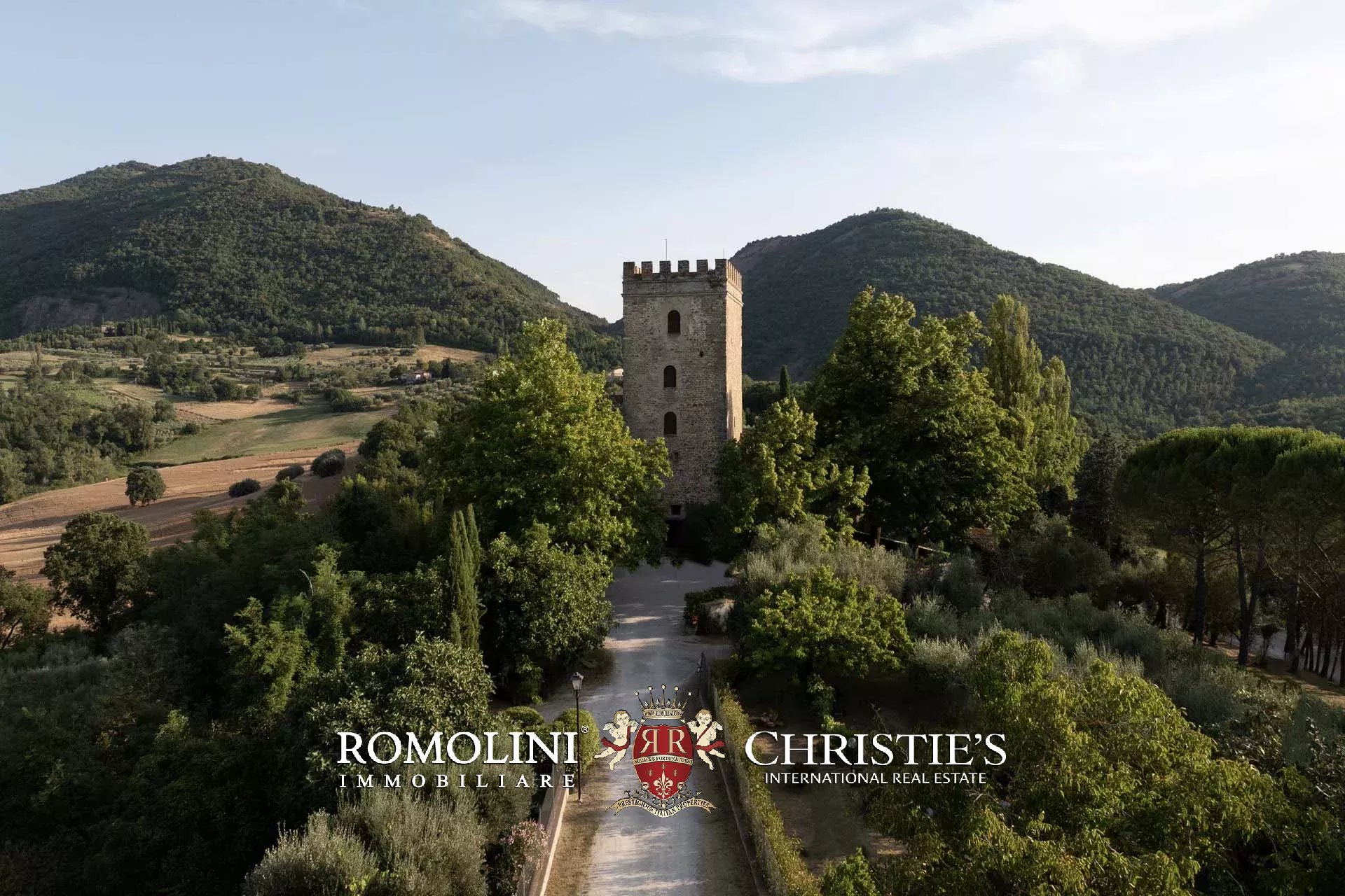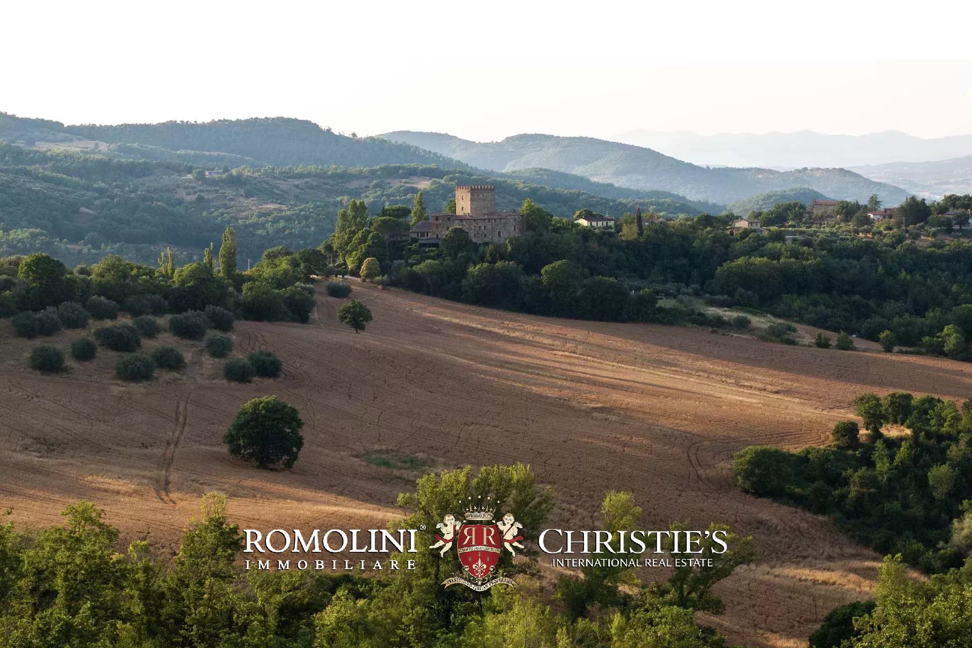 In a very panoramic position in the hills of Umbria, a few kilometers from Perugia, restored medieval castle for sale. The building (over 2,600 m²) boasts a history dating back almost a thousand years and has been finely restored by the current owners, who have turned it into a luxury residence with 21 guest bedrooms. Over 55.0 ha of land surrounds the building and includes a tennis court, infinity pool, and olive trees.