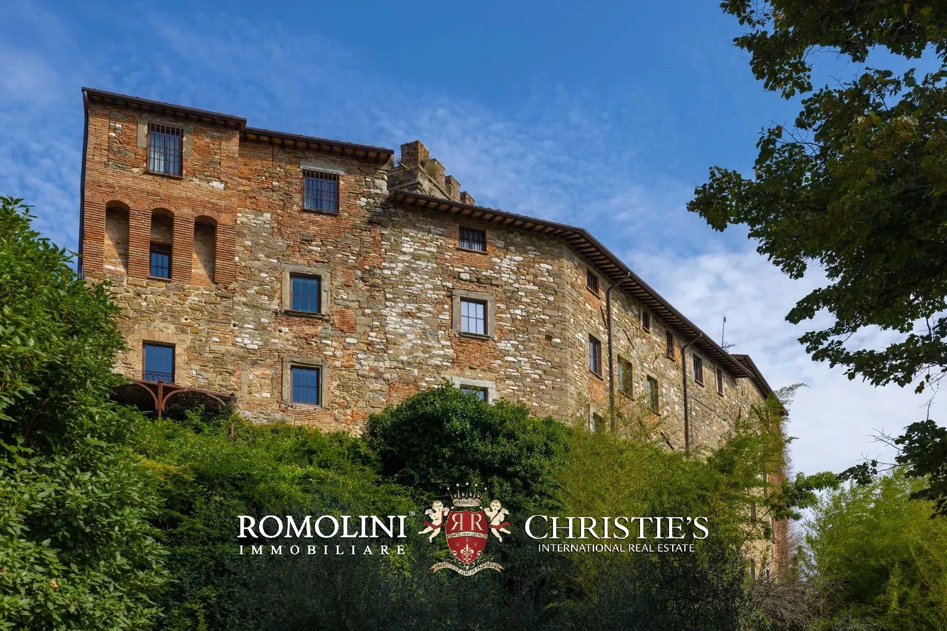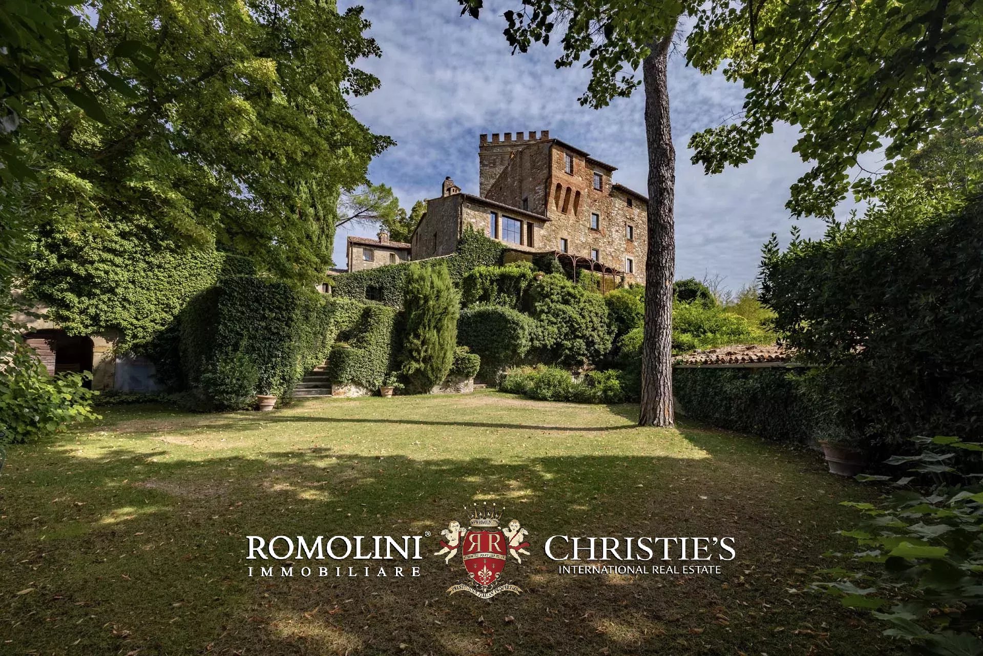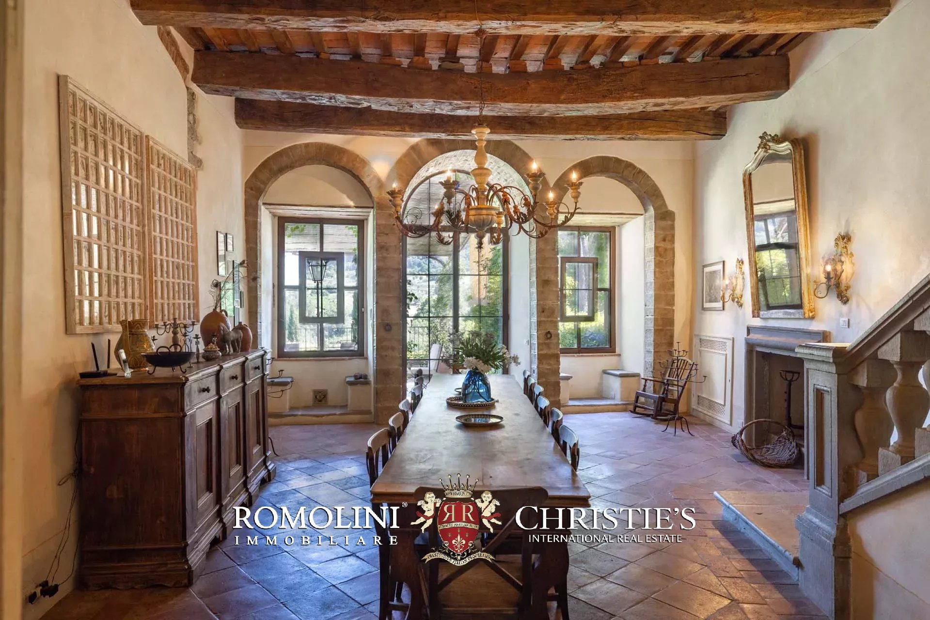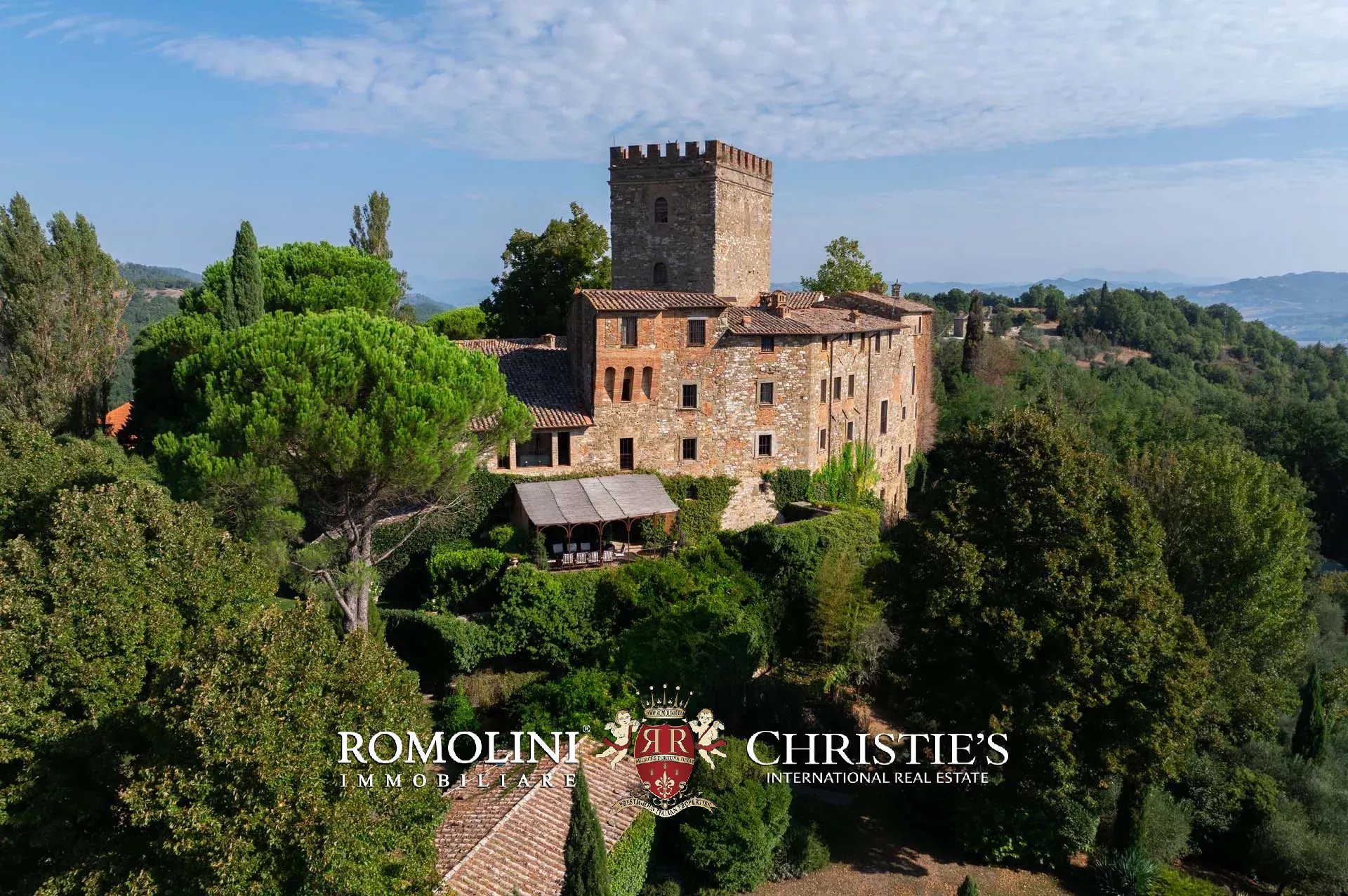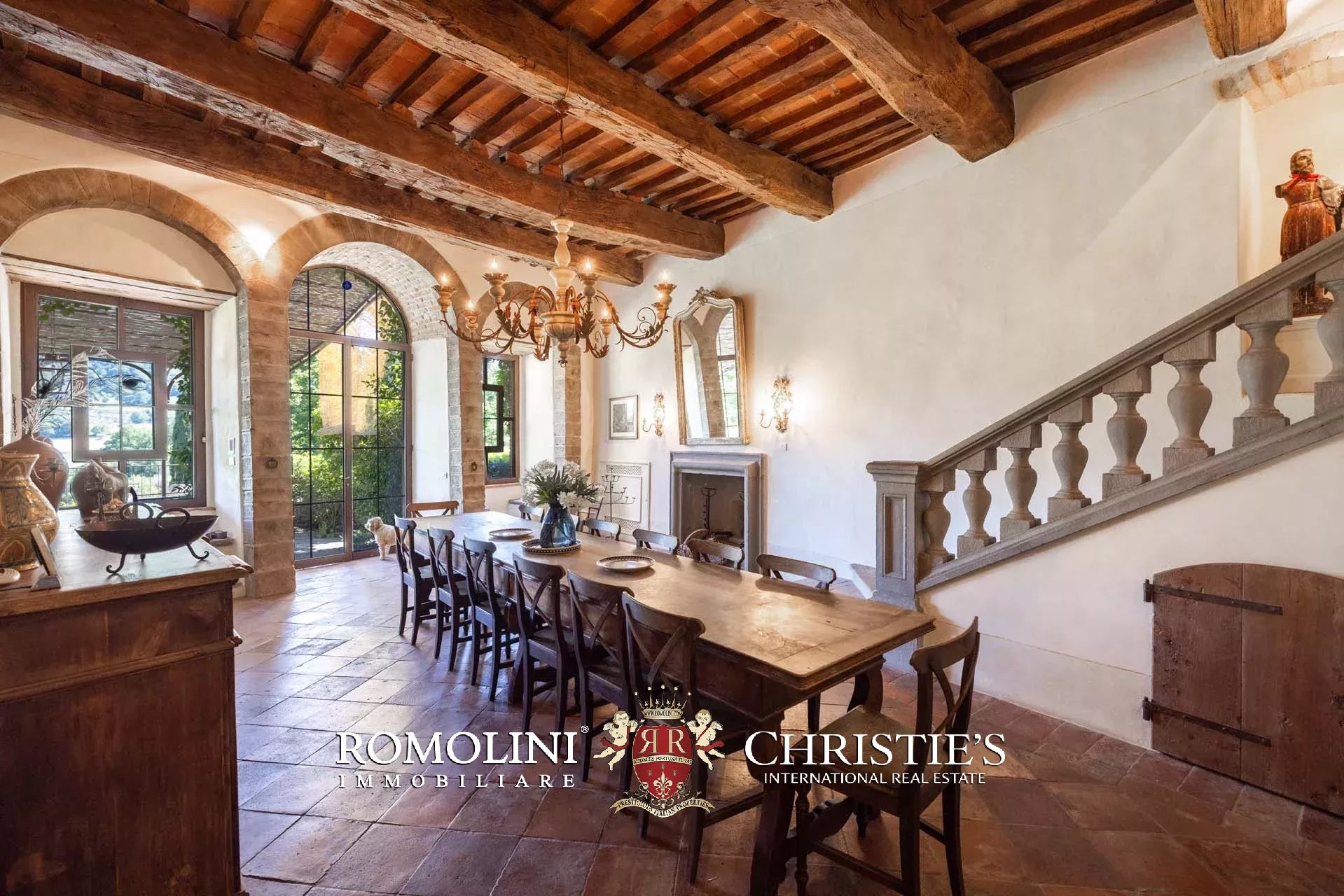 In a very panoramic position in the hills of Umbria, a few kilometers from Perugia, restored medieval castle for sale. The building (over 2,600 m²) boasts a history dating back almost a thousand years and has been finely restored by the current owners, who have turned it into a luxury residence with 21 guest bedrooms. Over 55.0 ha of land surrounds the building and includes a tennis court, infinity pool, and olive trees.