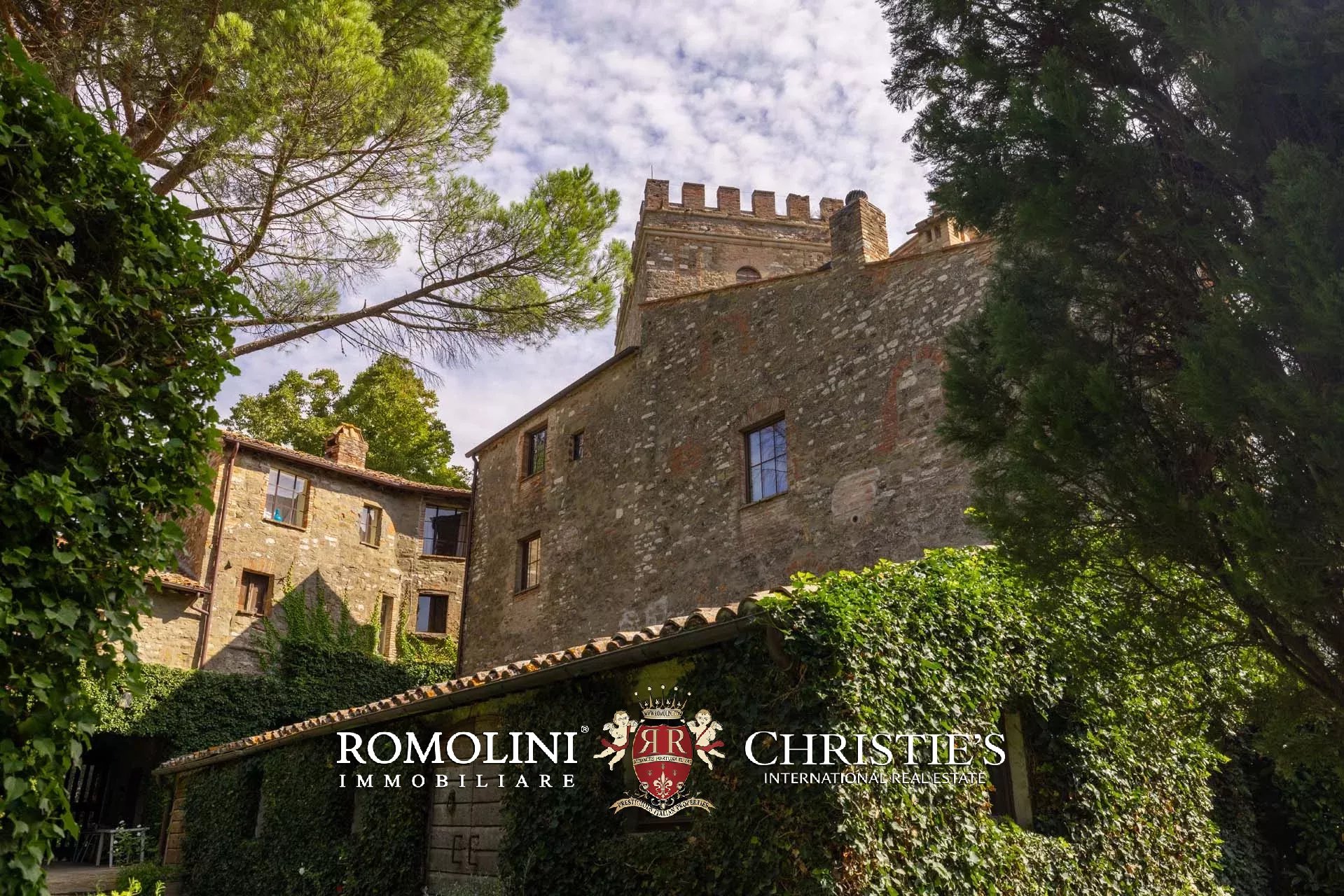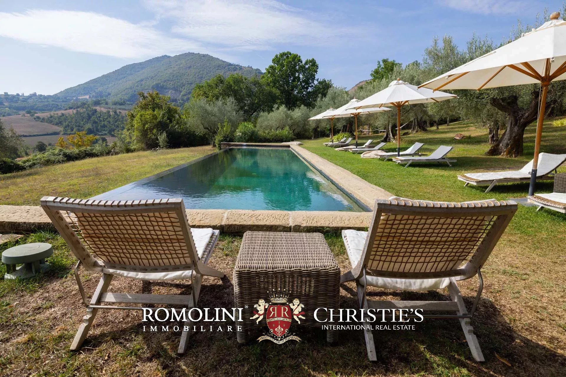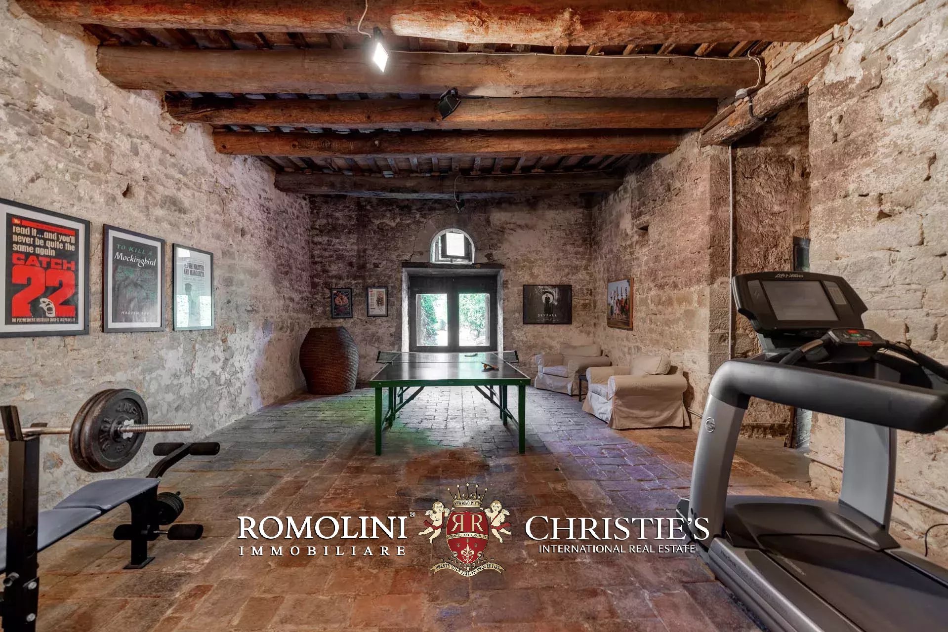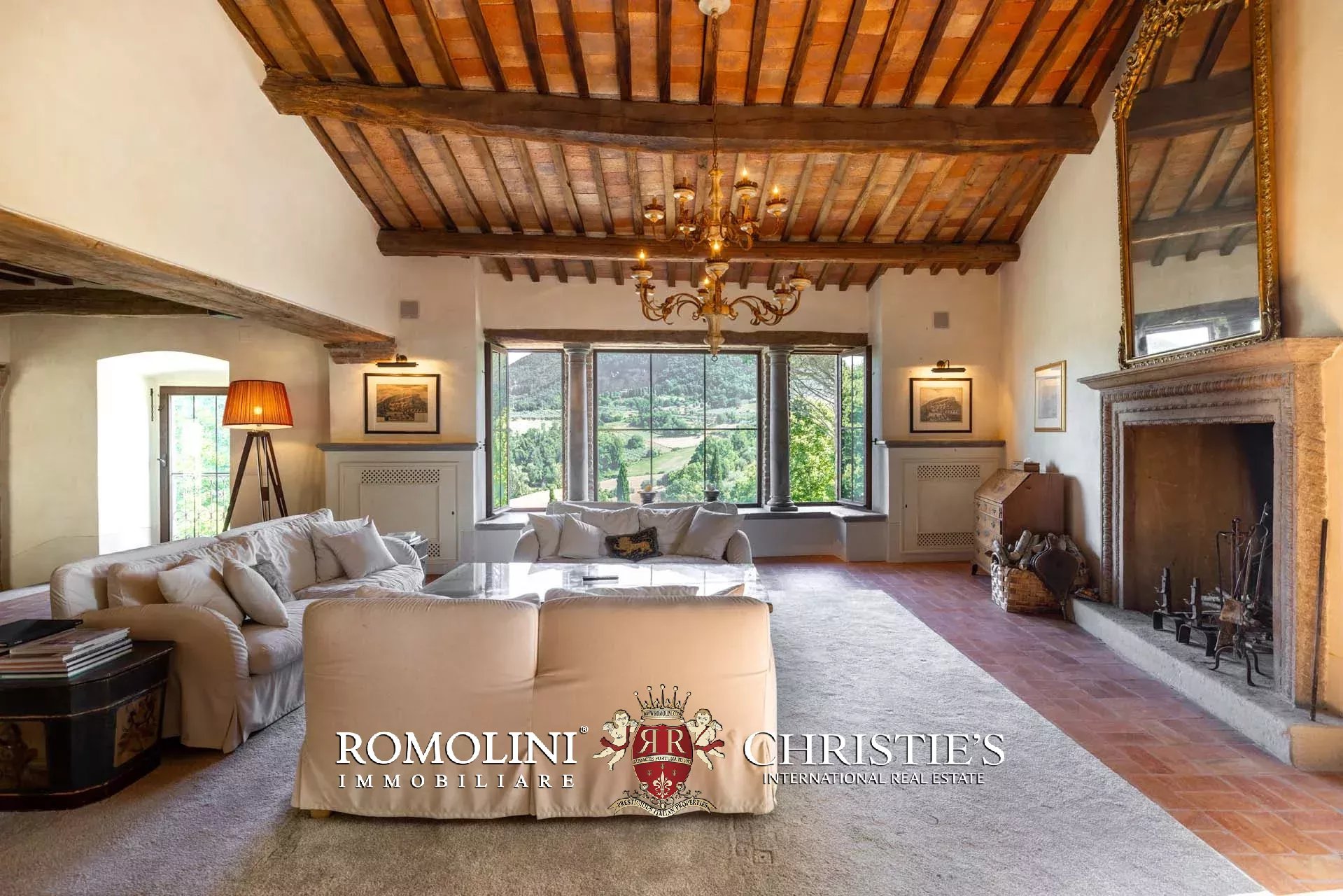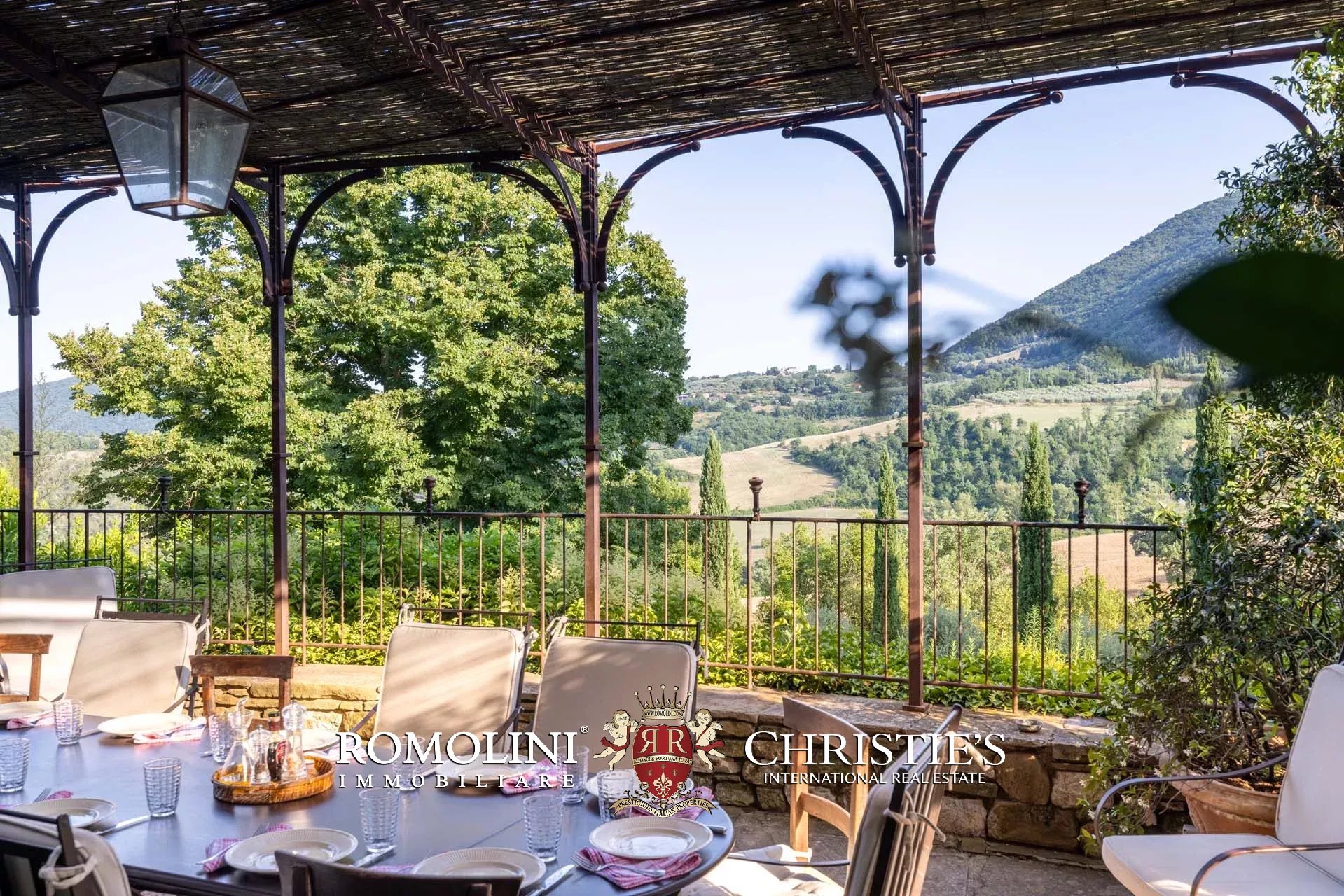 In a very panoramic position in the hills of Umbria, a few kilometers from Perugia, restored medieval castle for sale. The building (over 2,600 m²) boasts a history dating back almost a thousand years and has been finely restored by the current owners, who have turned it into a luxury residence with 21 guest bedrooms. Over 55.0 ha of land surrounds the building and includes a tennis court, infinity pool, and olive trees.