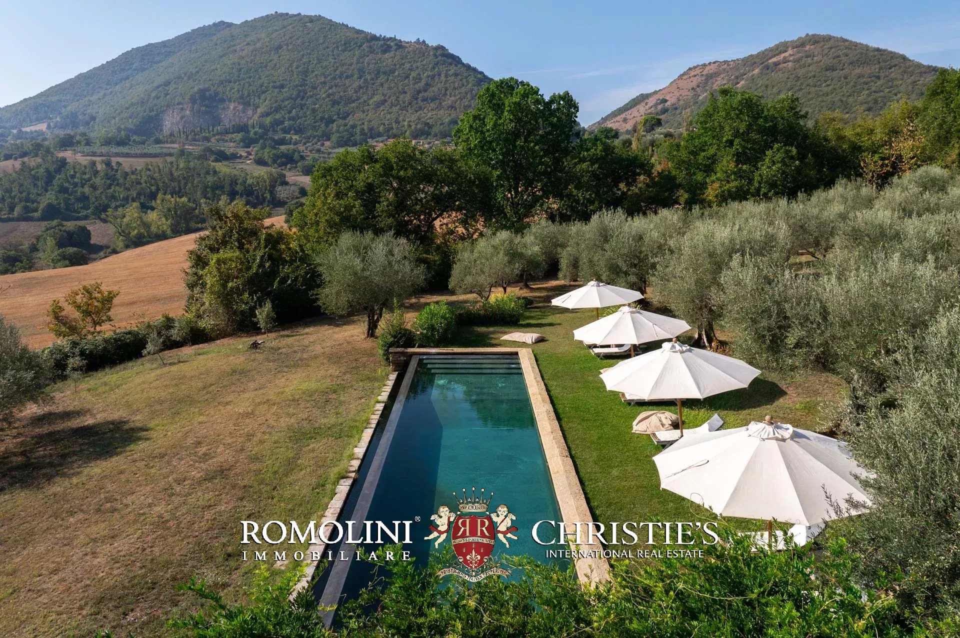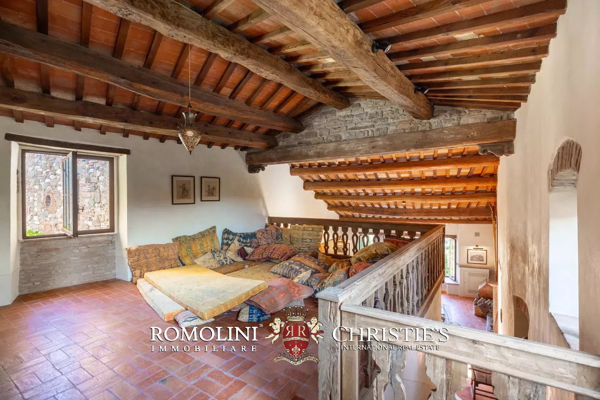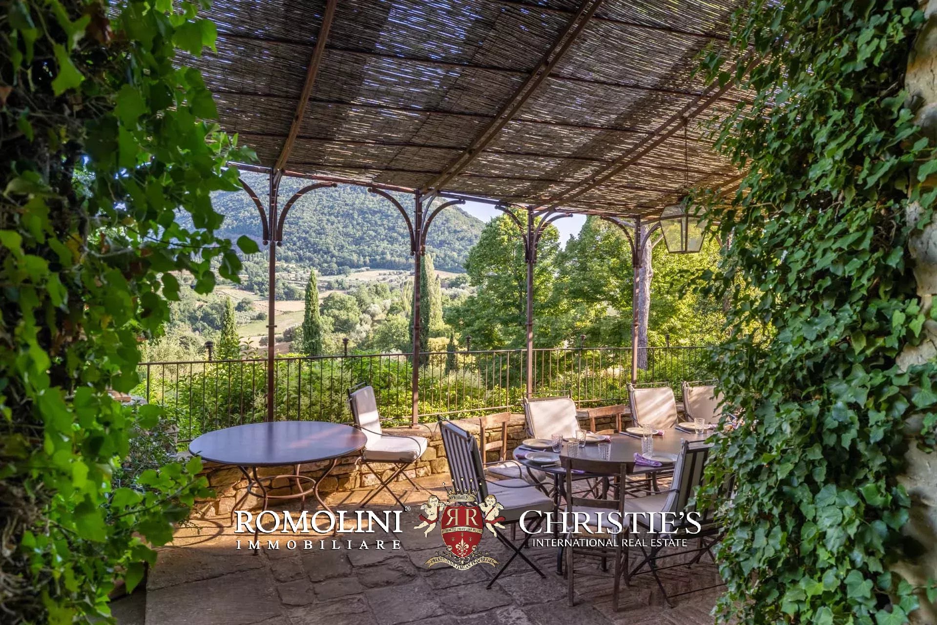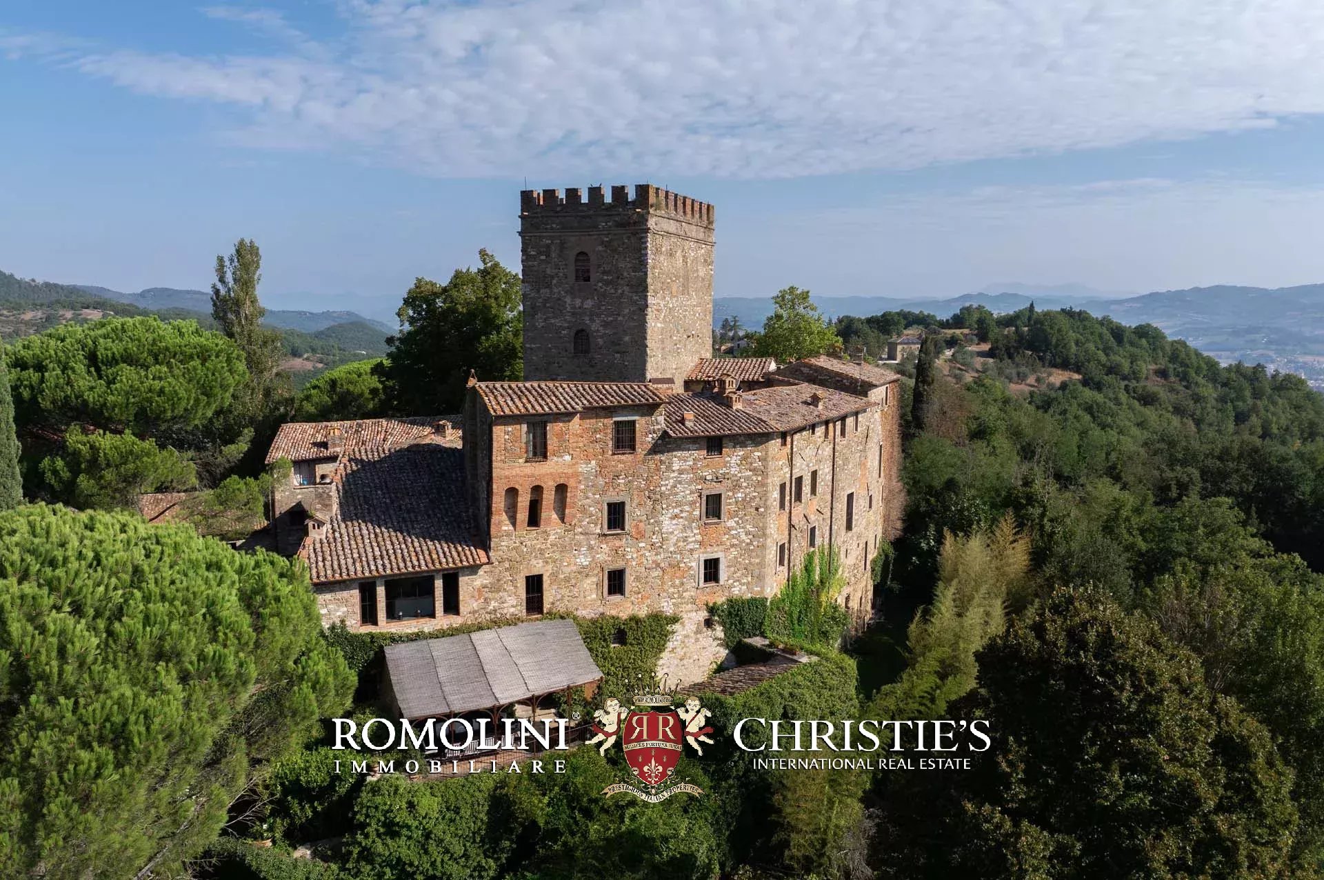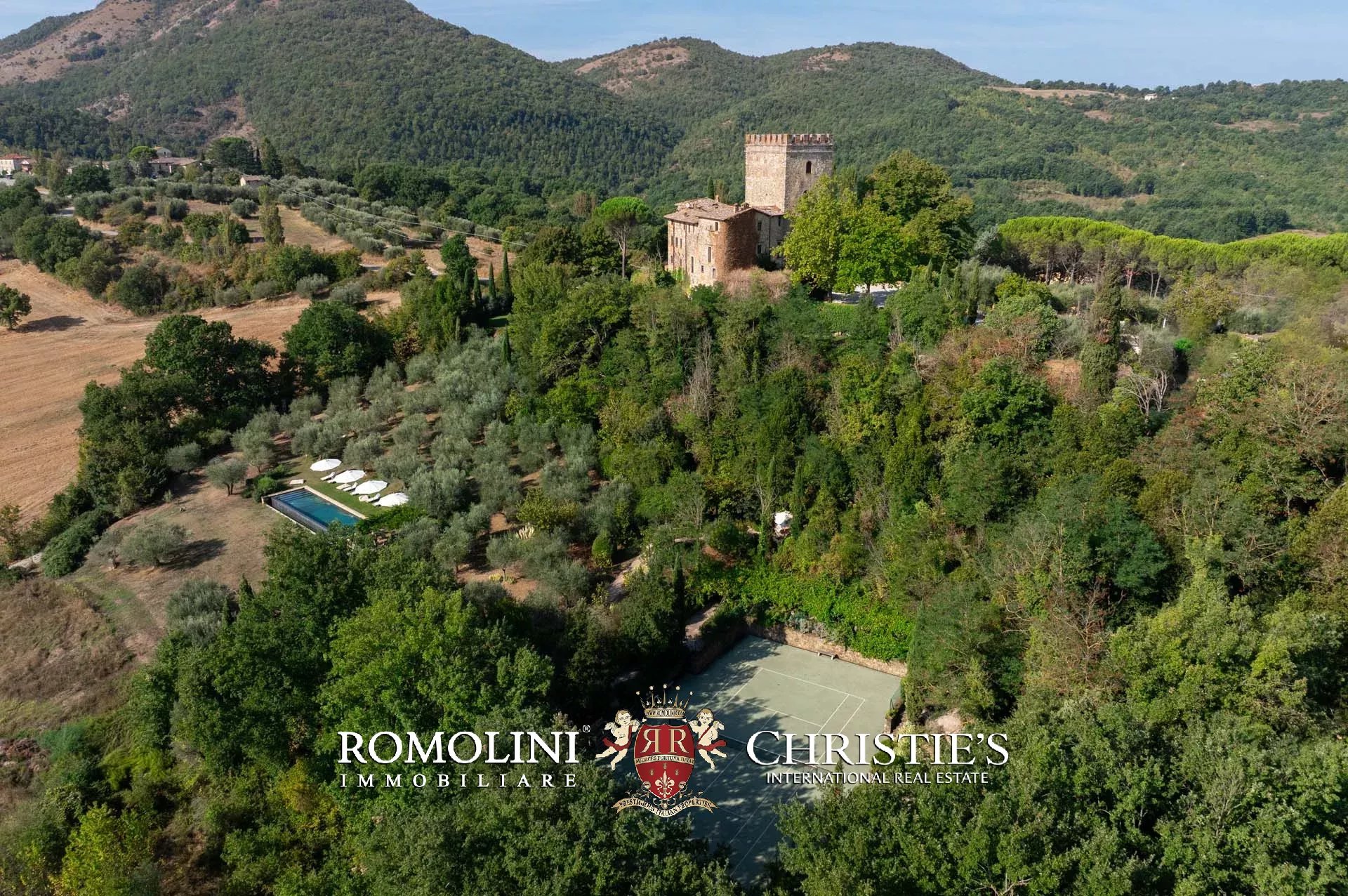 In a very panoramic position in the hills of Umbria, a few kilometers from Perugia, restored medieval castle for sale. The building (over 2,600 m²) boasts a history dating back almost a thousand years and has been finely restored by the current owners, who have turned it into a luxury residence with 21 guest bedrooms. Over 55.0 ha of land surrounds the building and includes a tennis court, infinity pool, and olive trees.